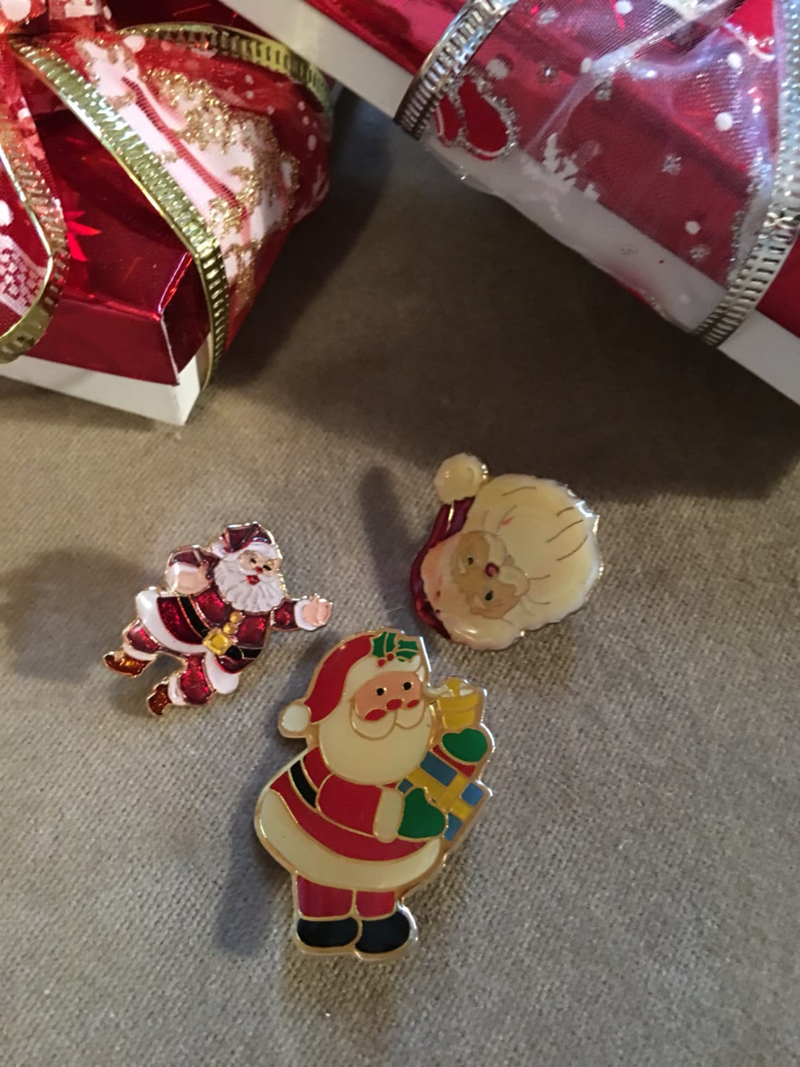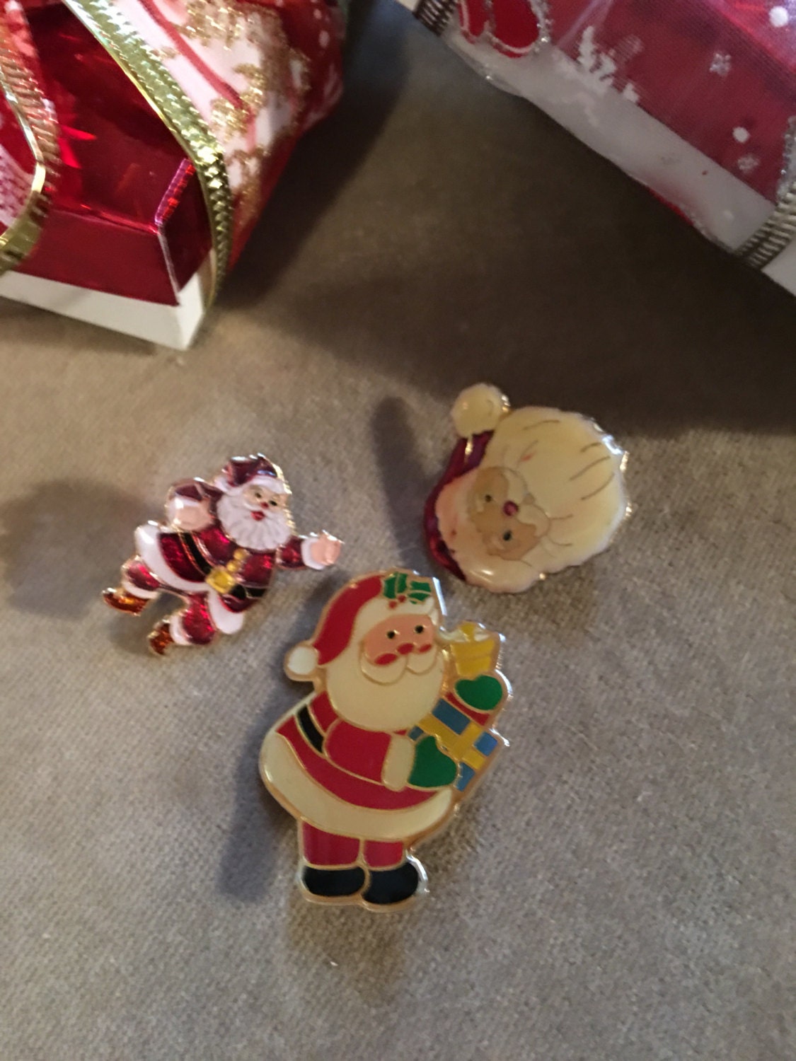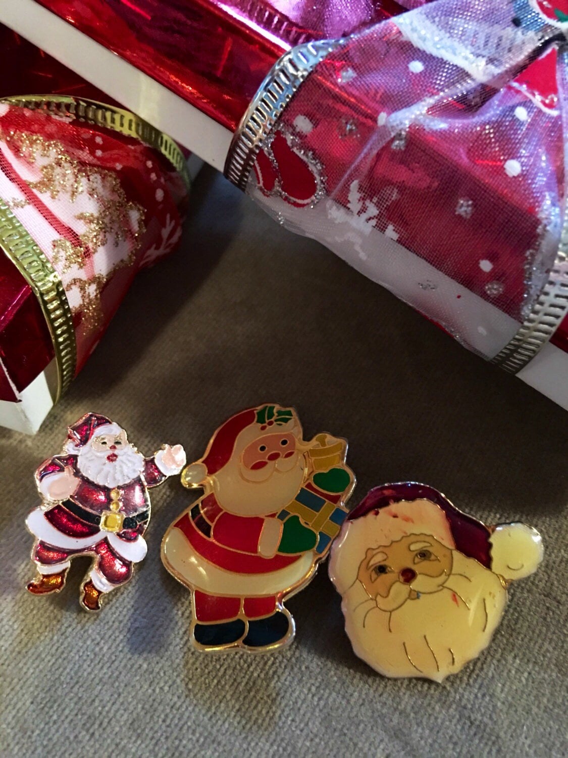 Three vintage enamel finished Christmas Santa pins wear them togther or festively apart