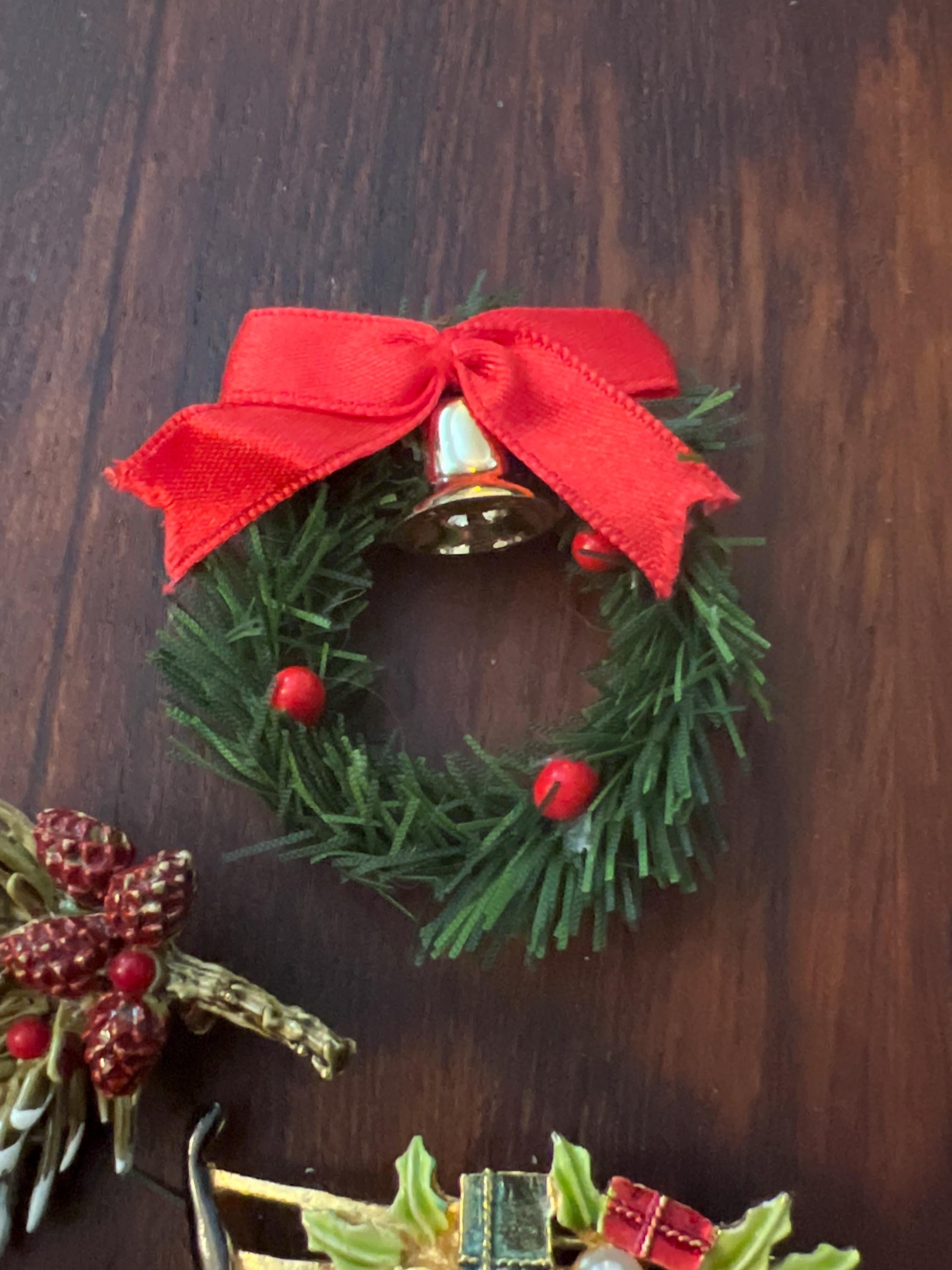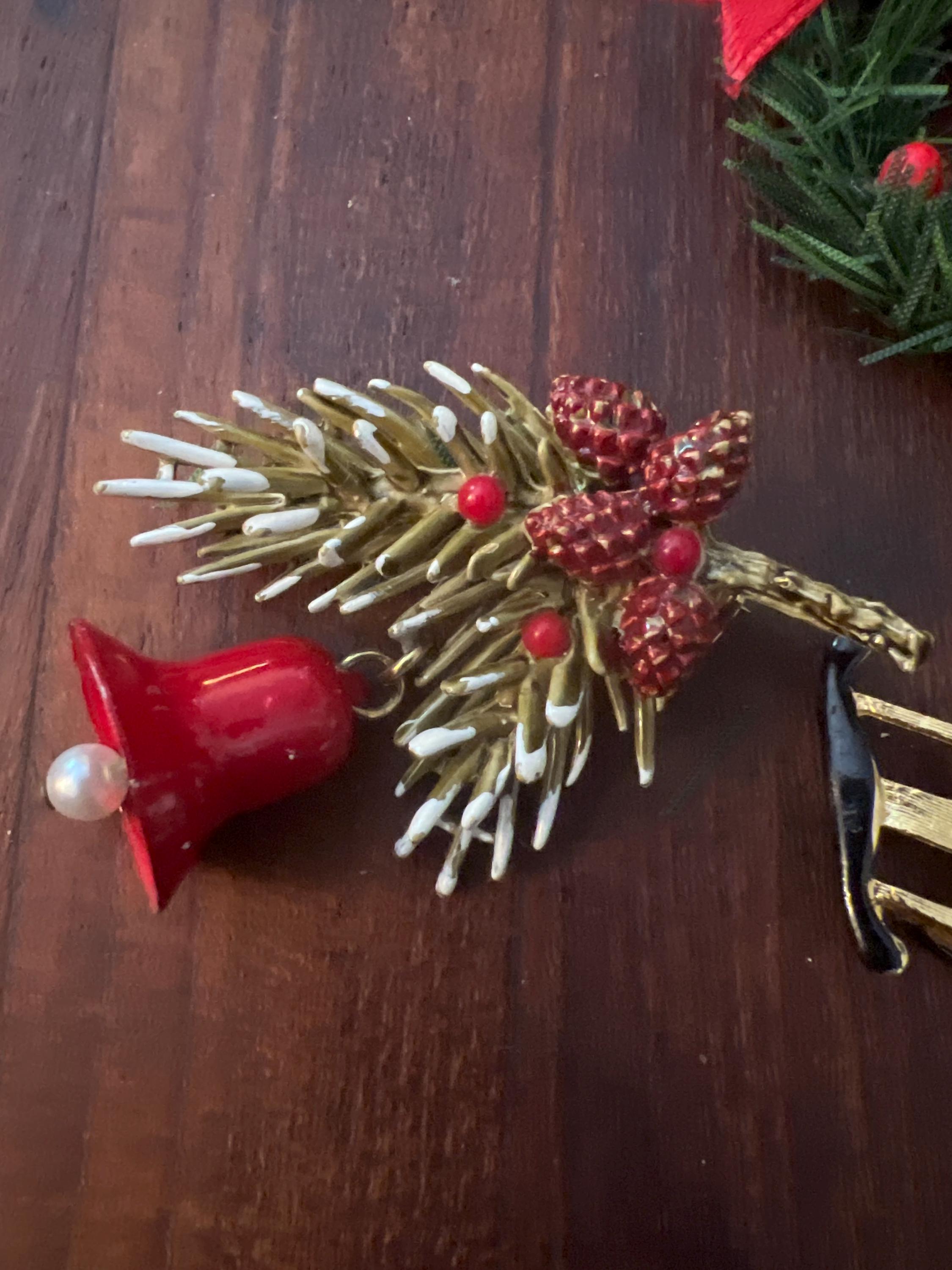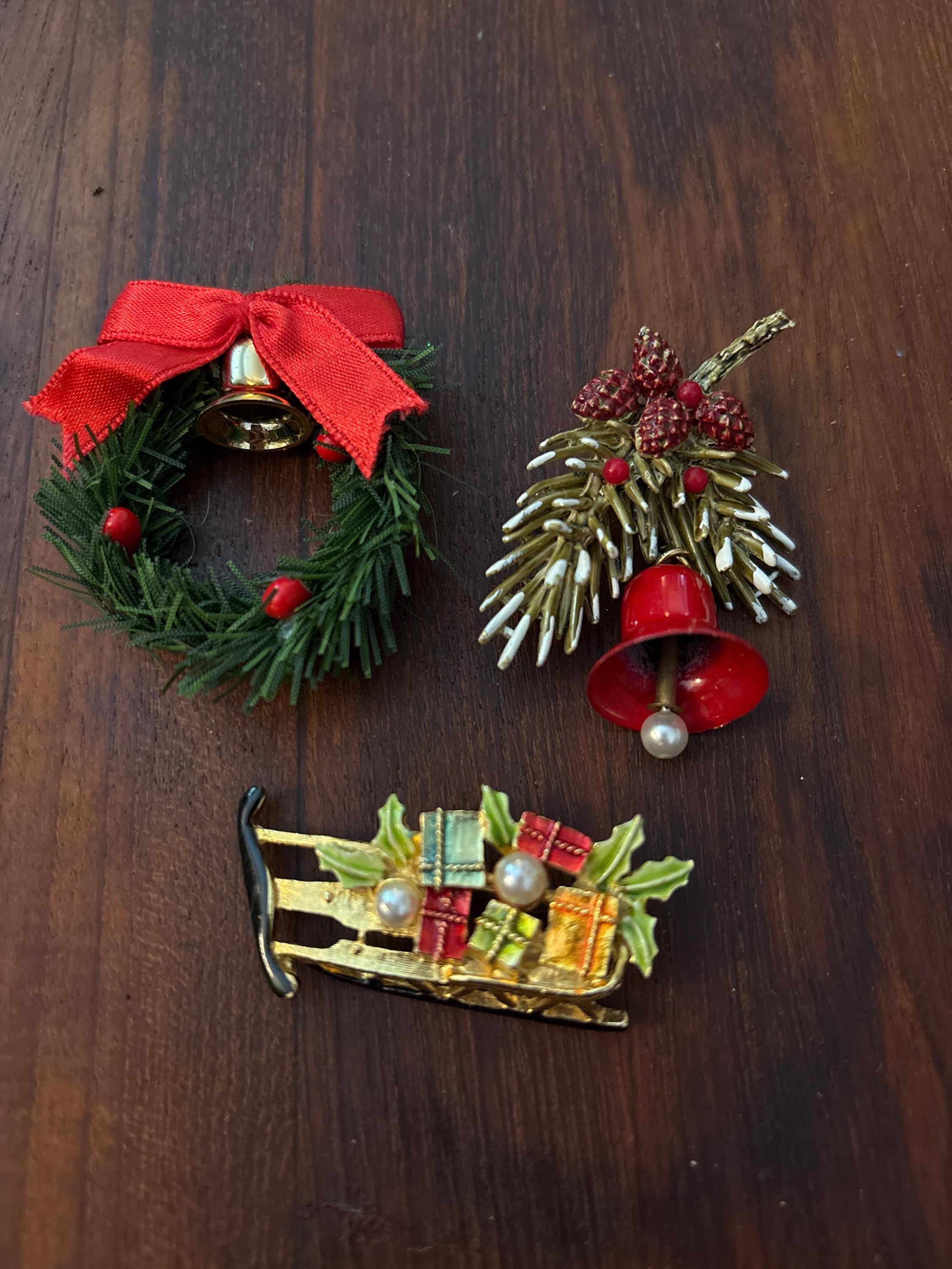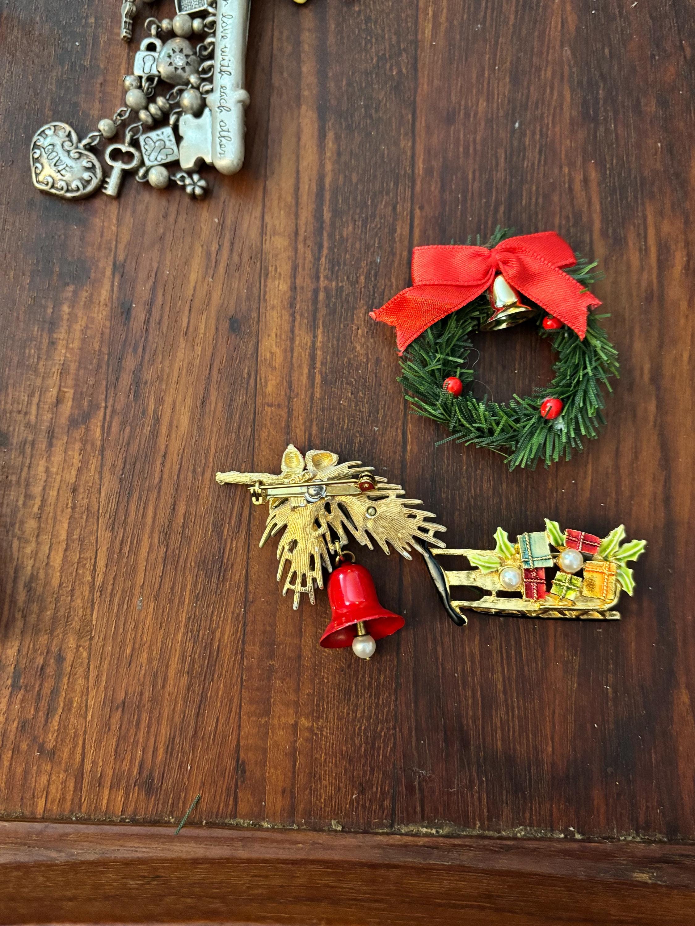 Festive vintage holiday brooches wreath sleigh & red bell, mid century Christmas pins, The one with the Red Bell is signed ART- curation of 3