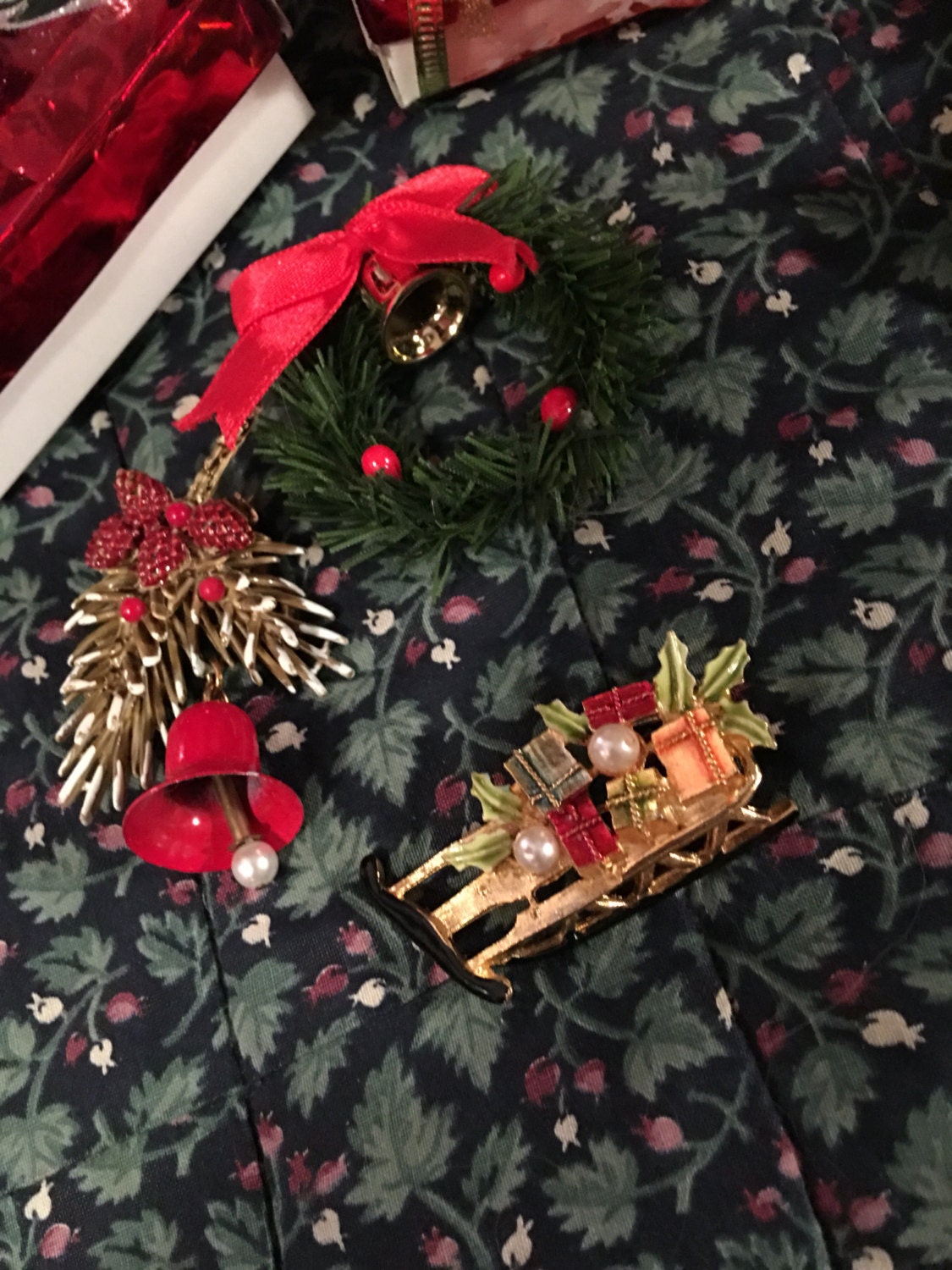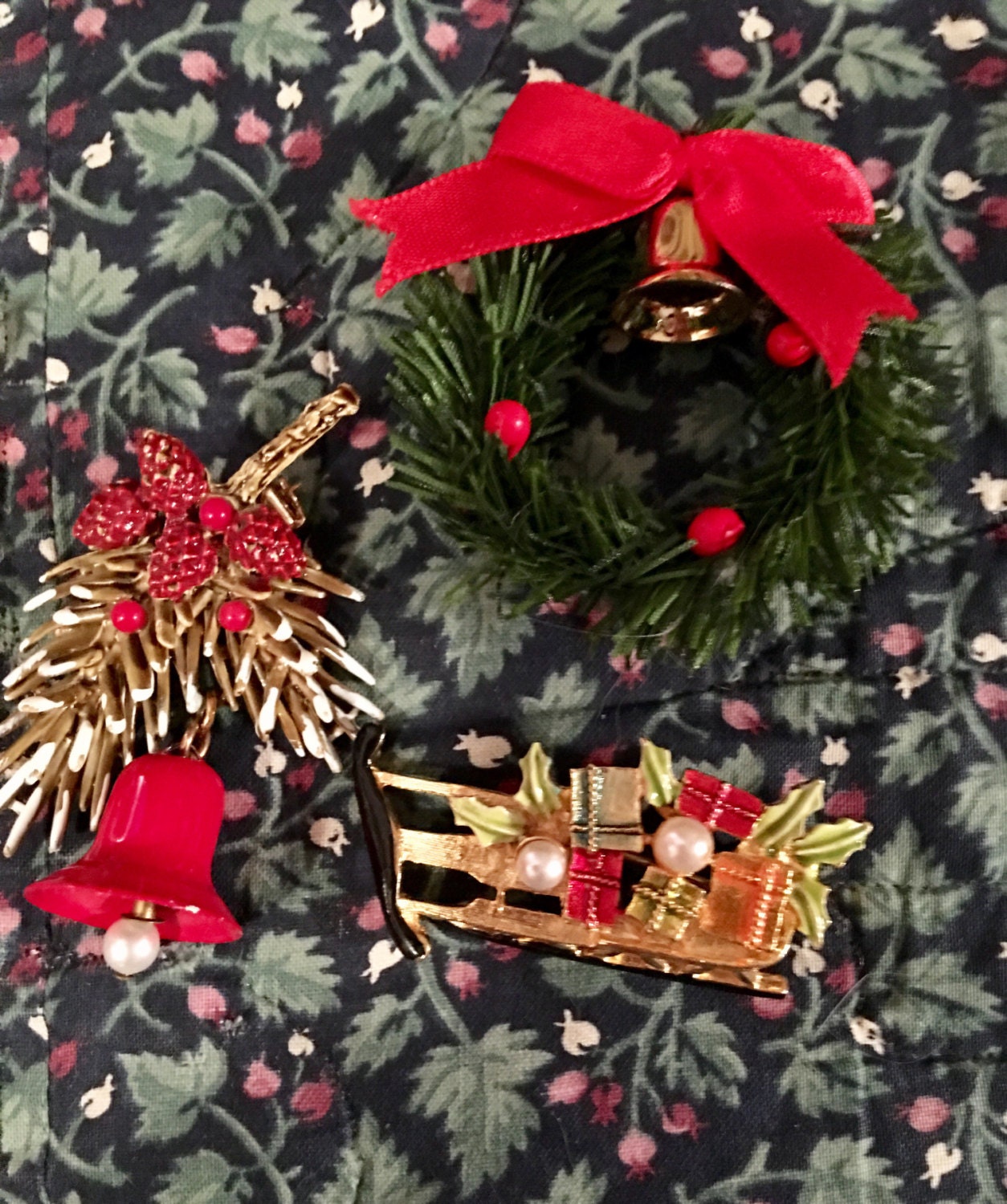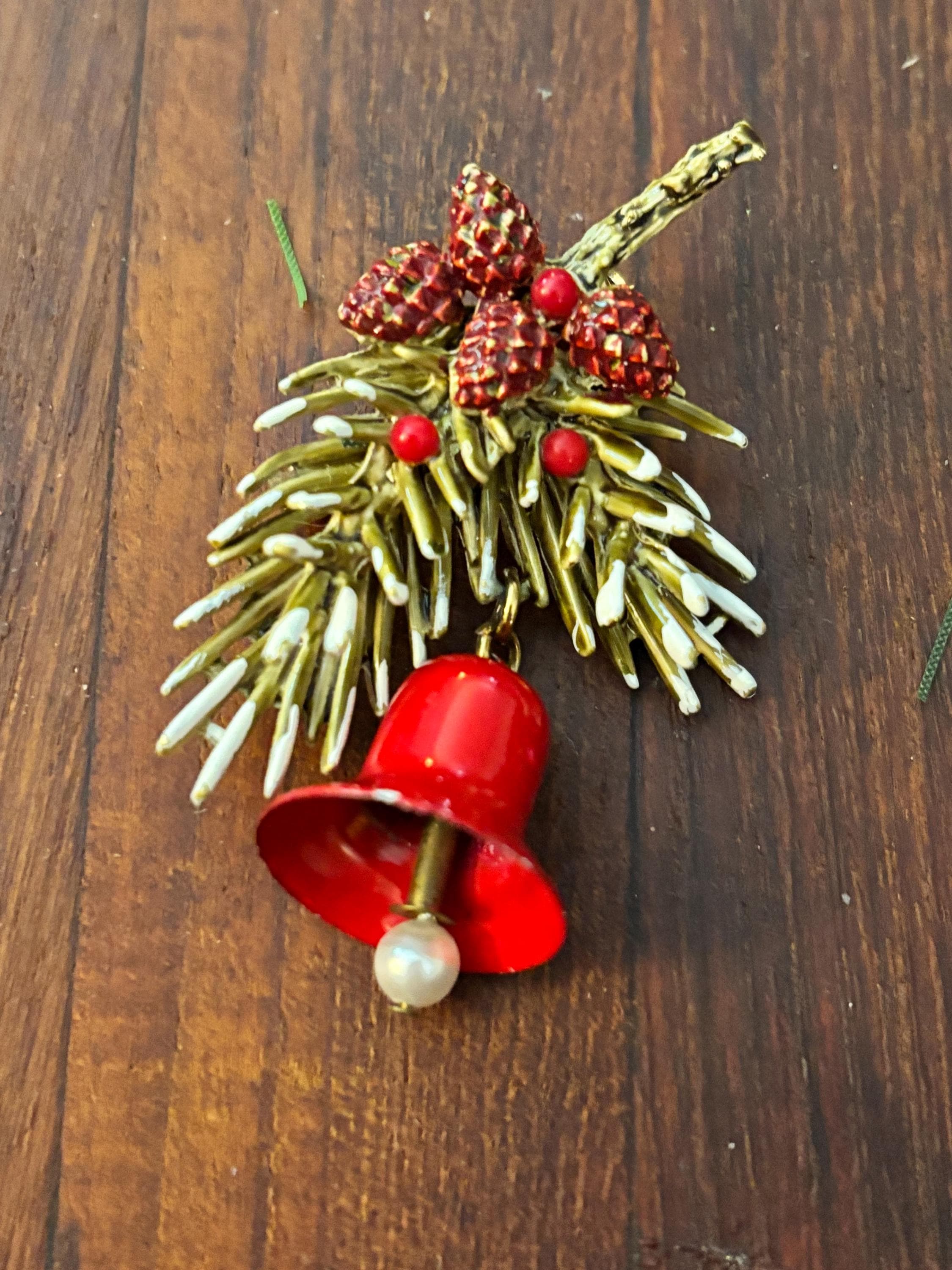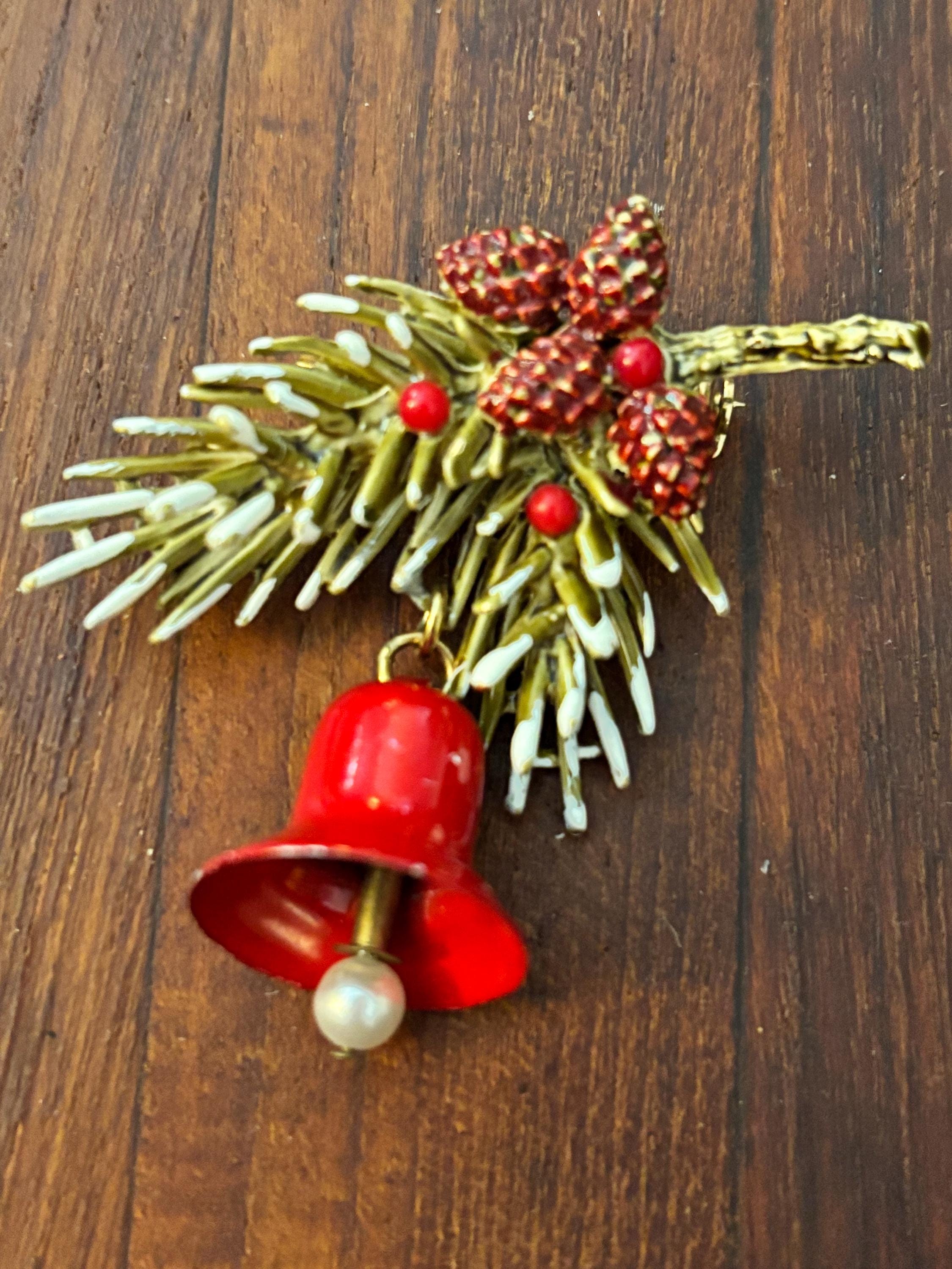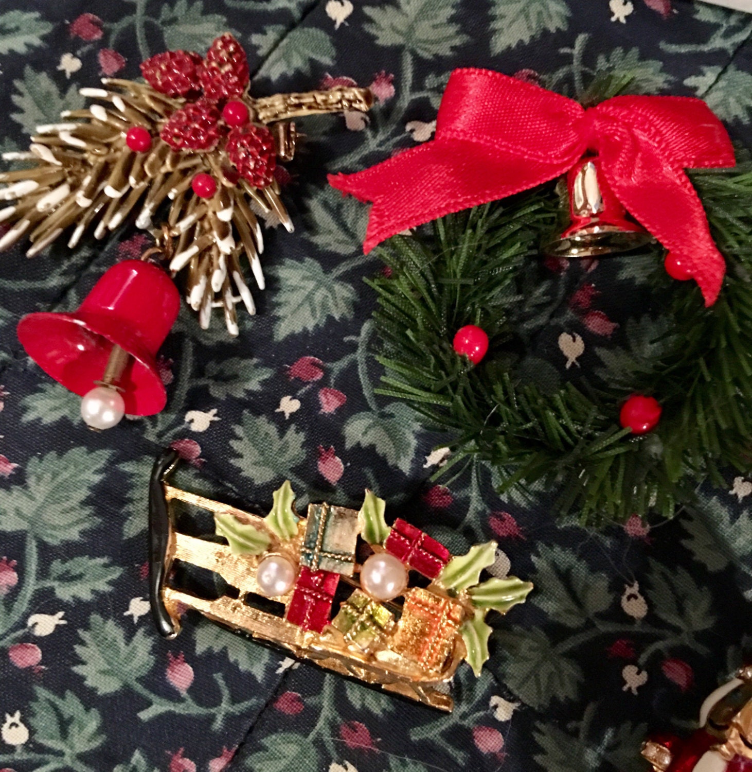 Festive vintage holiday brooches wreath sleigh & red bell, mid century Christmas pins, The one with the Red Bell is signed ART- curation of 3
