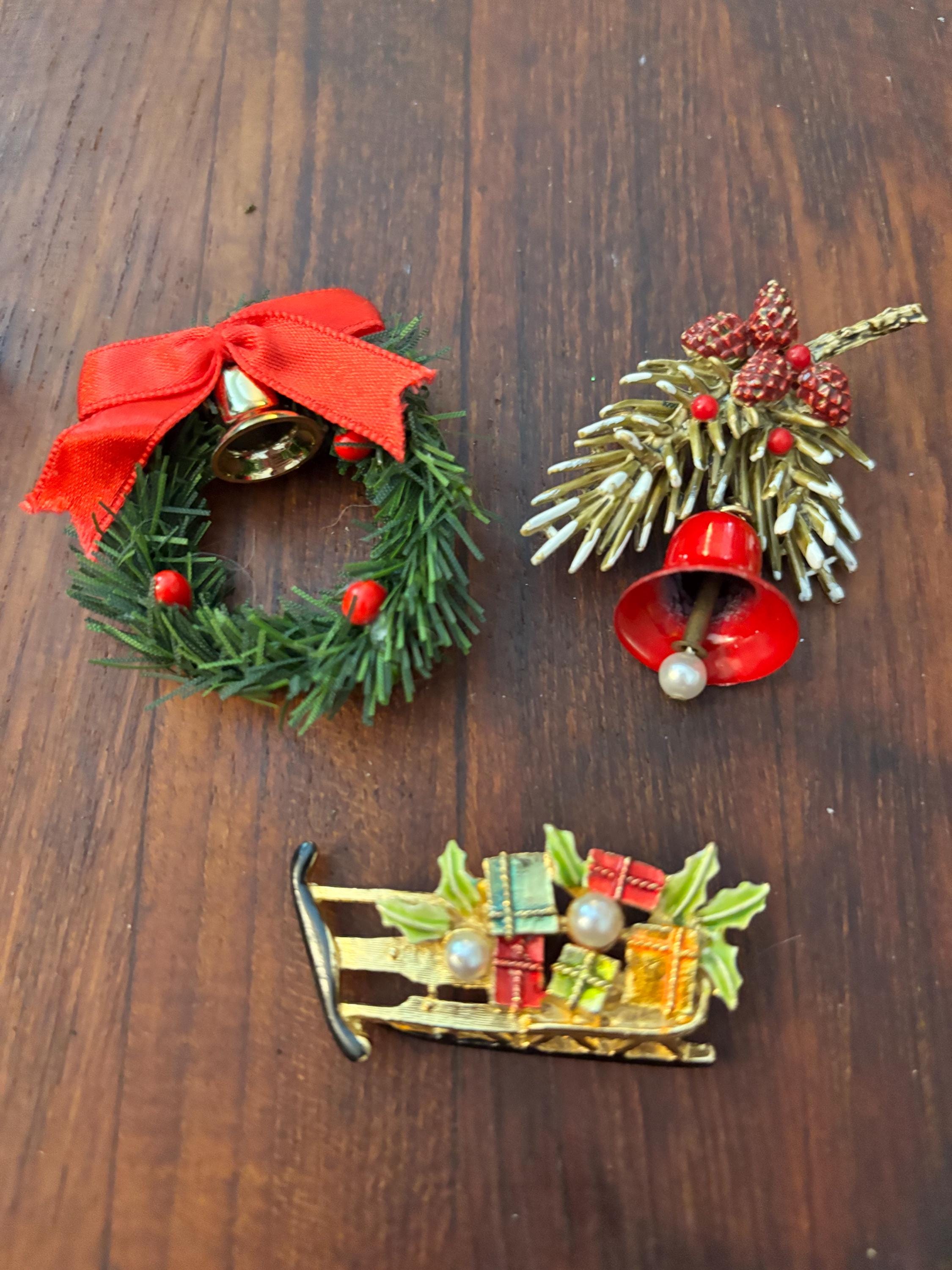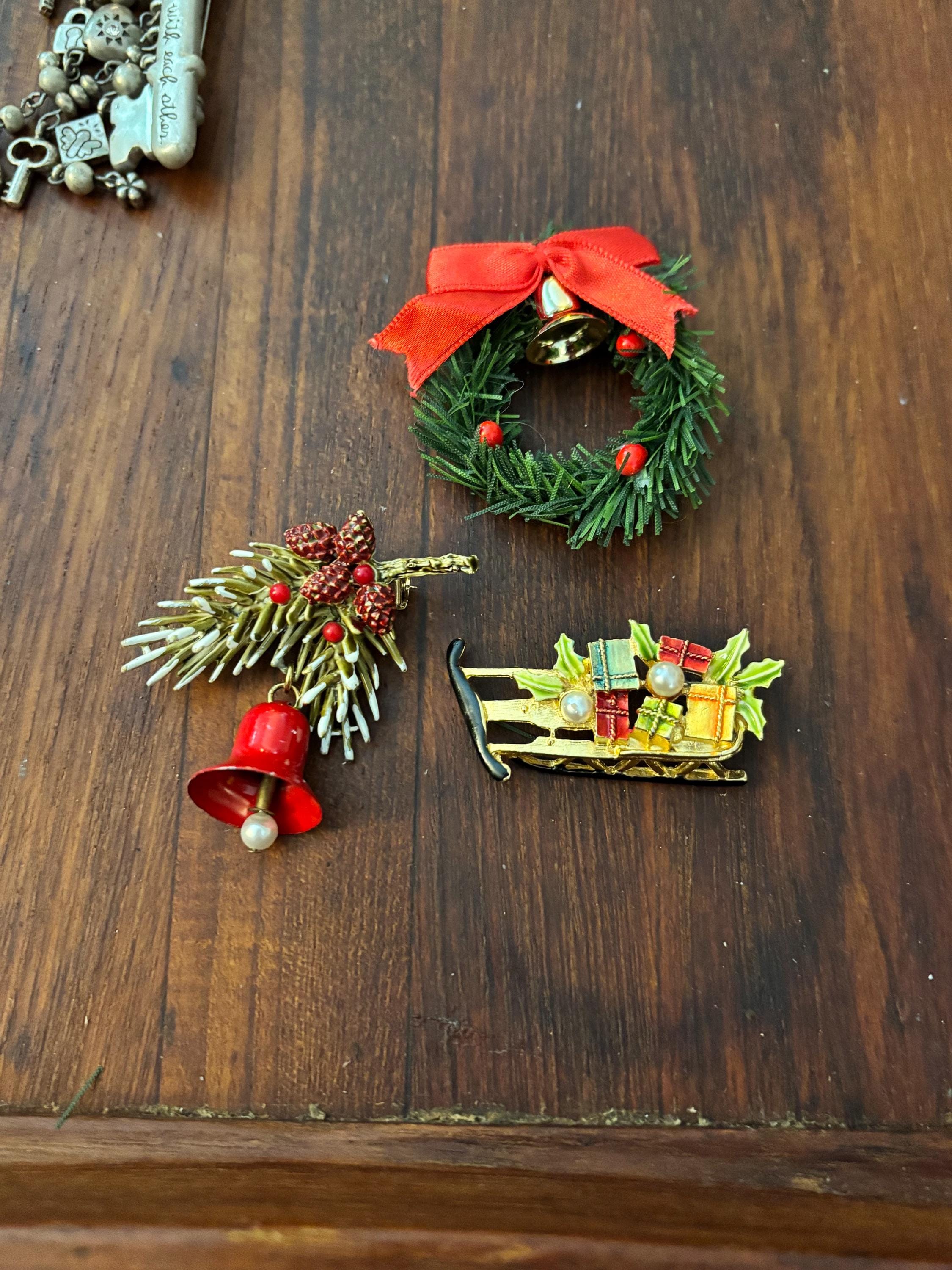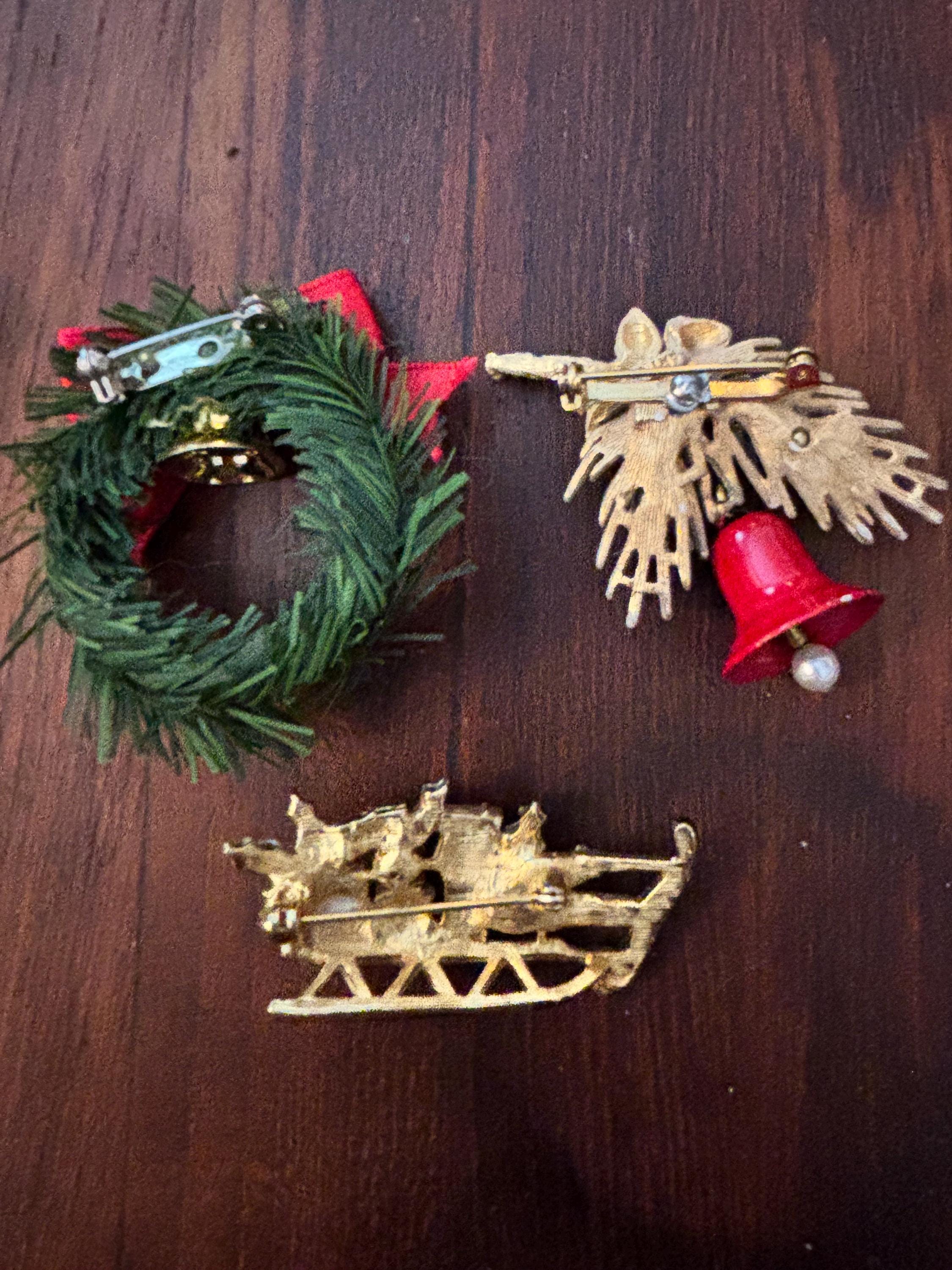 Festive Trio vintage holiday brooches- wreath sleigh & red bell, mid century Christmas pins, one signed ART