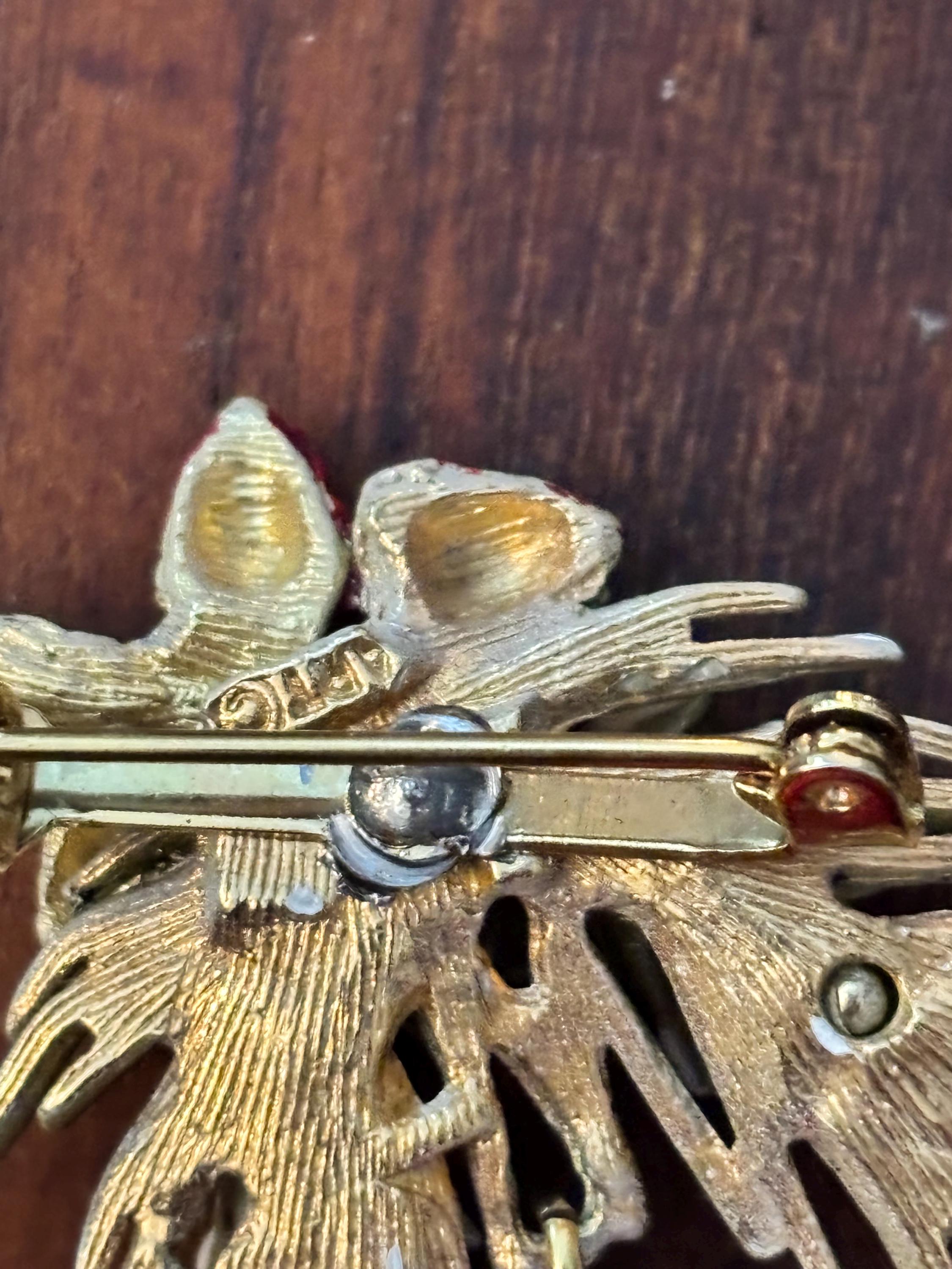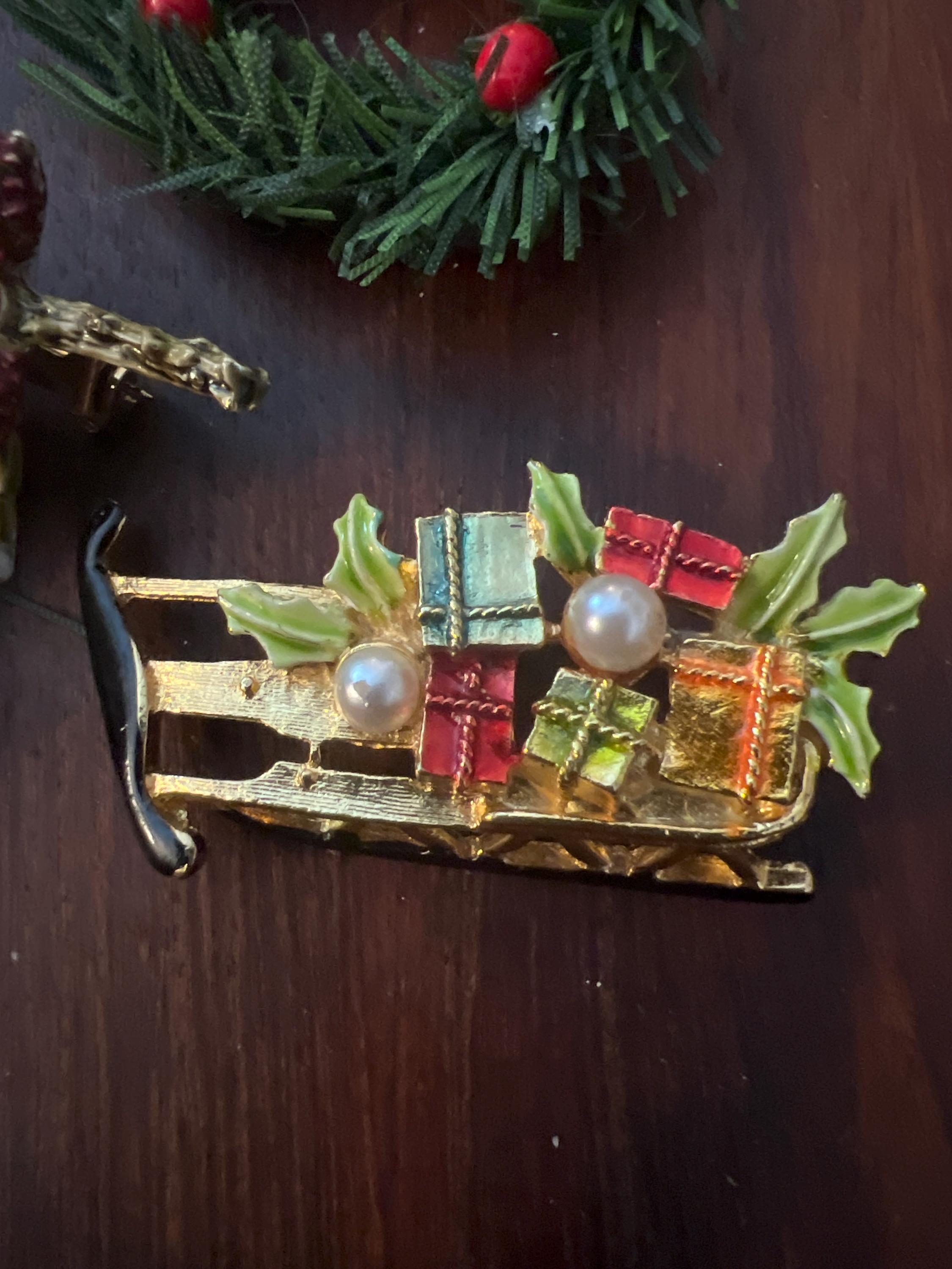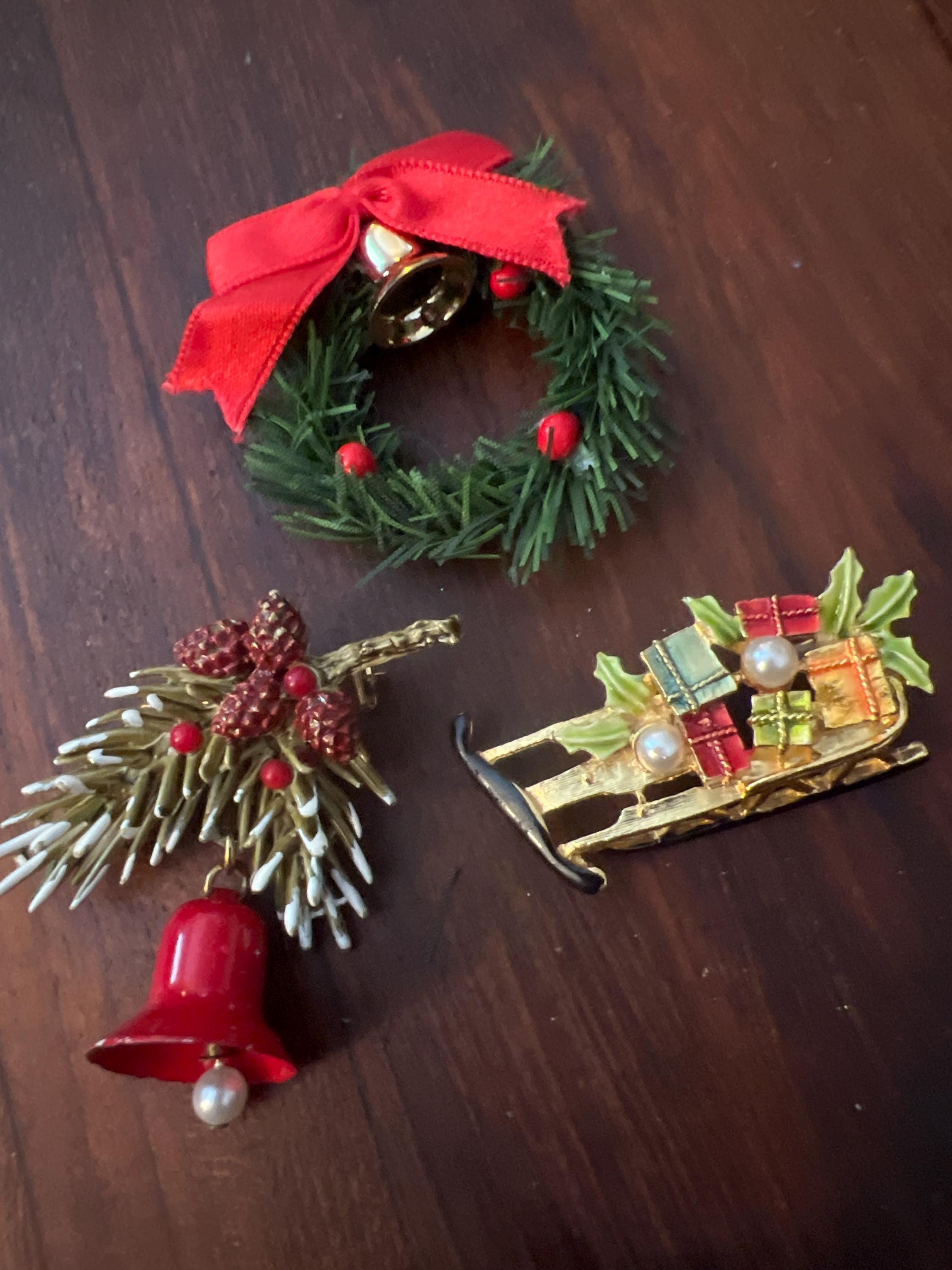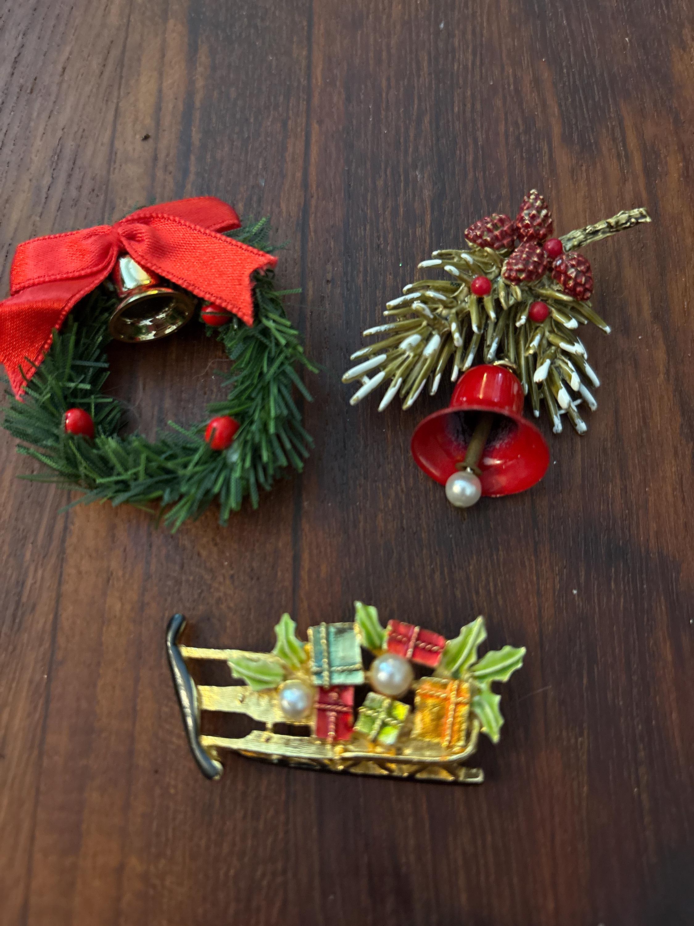 Festive Trio vintage holiday brooches- wreath sleigh & red bell, mid century Christmas pins, one signed ART