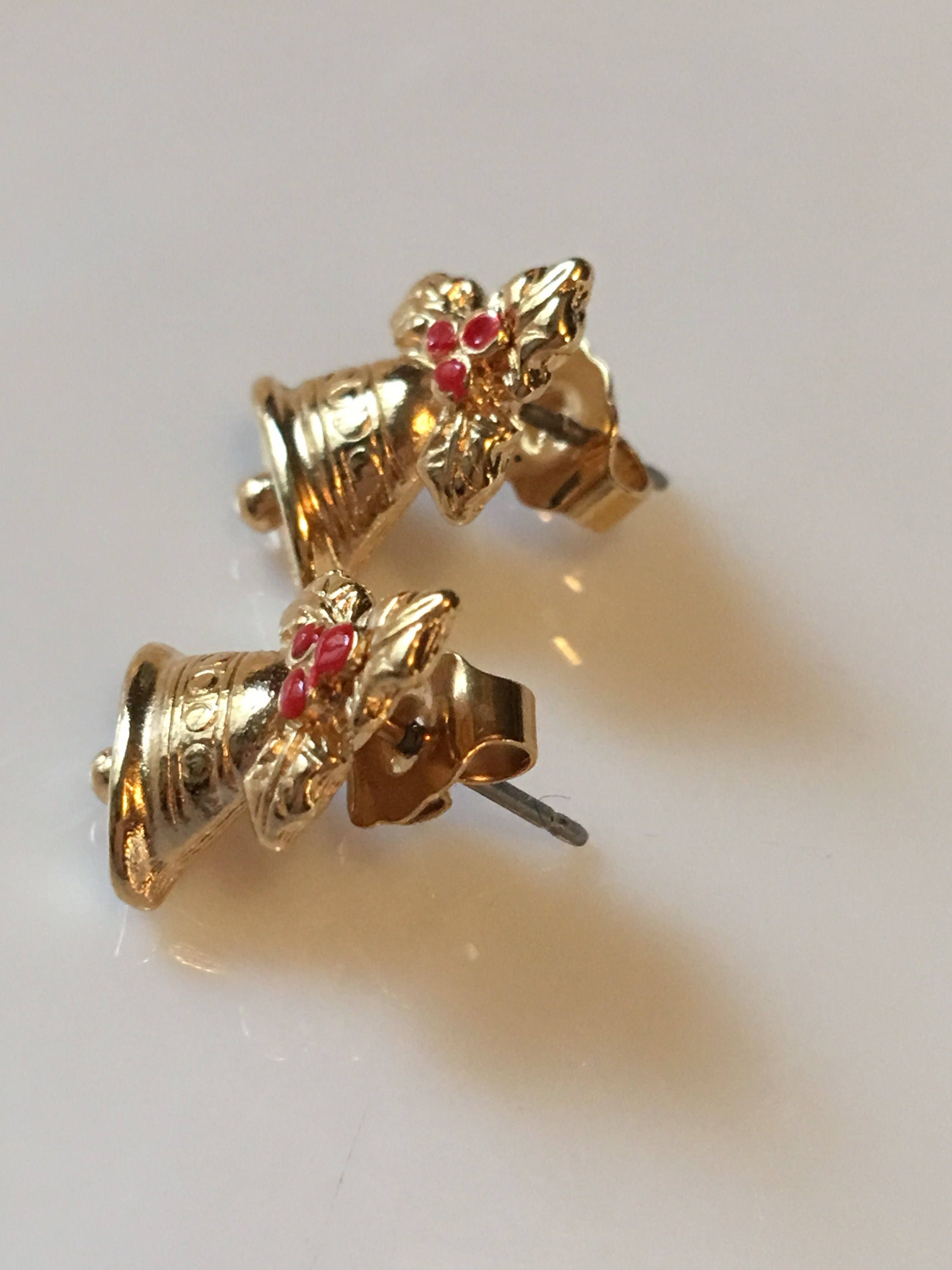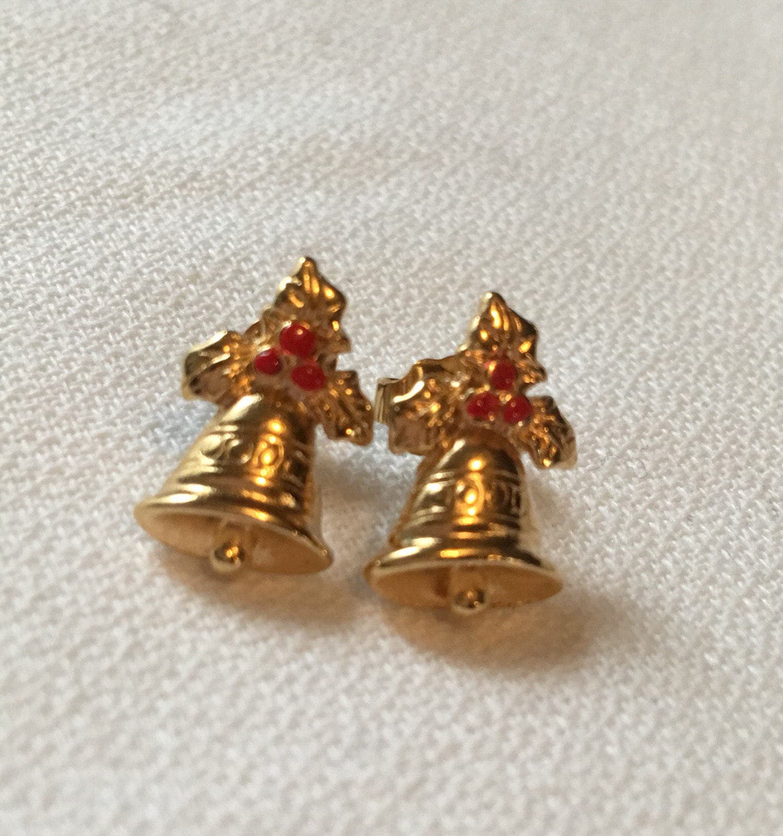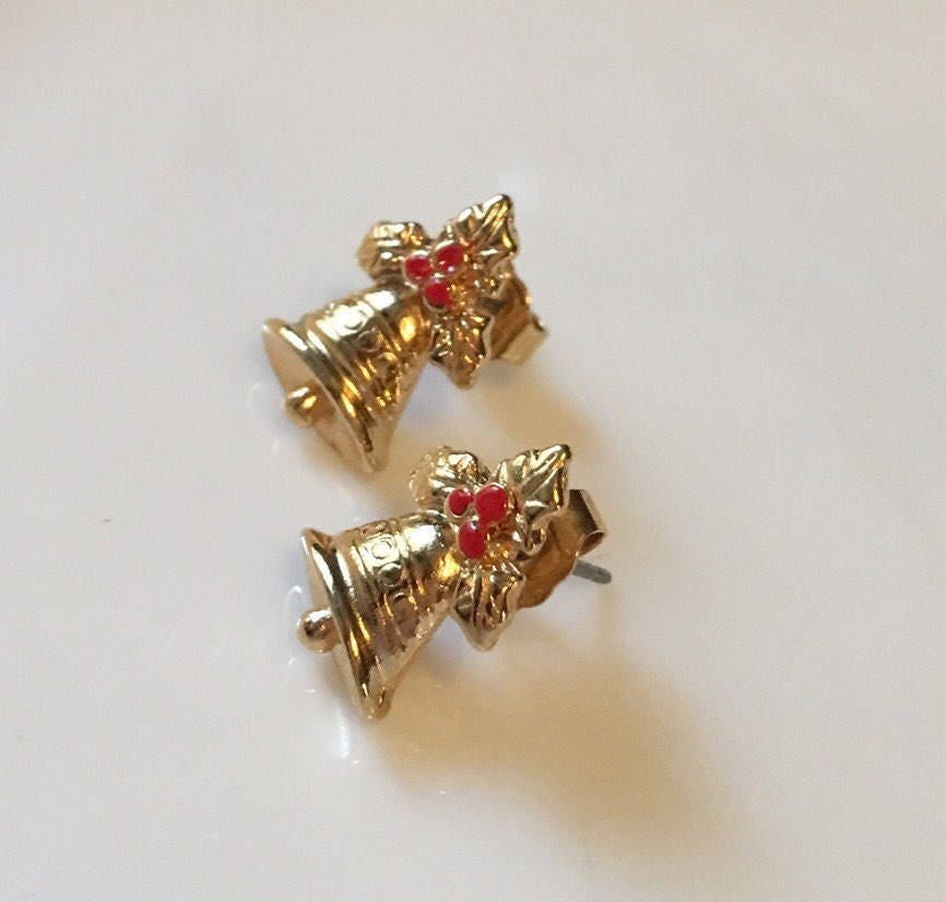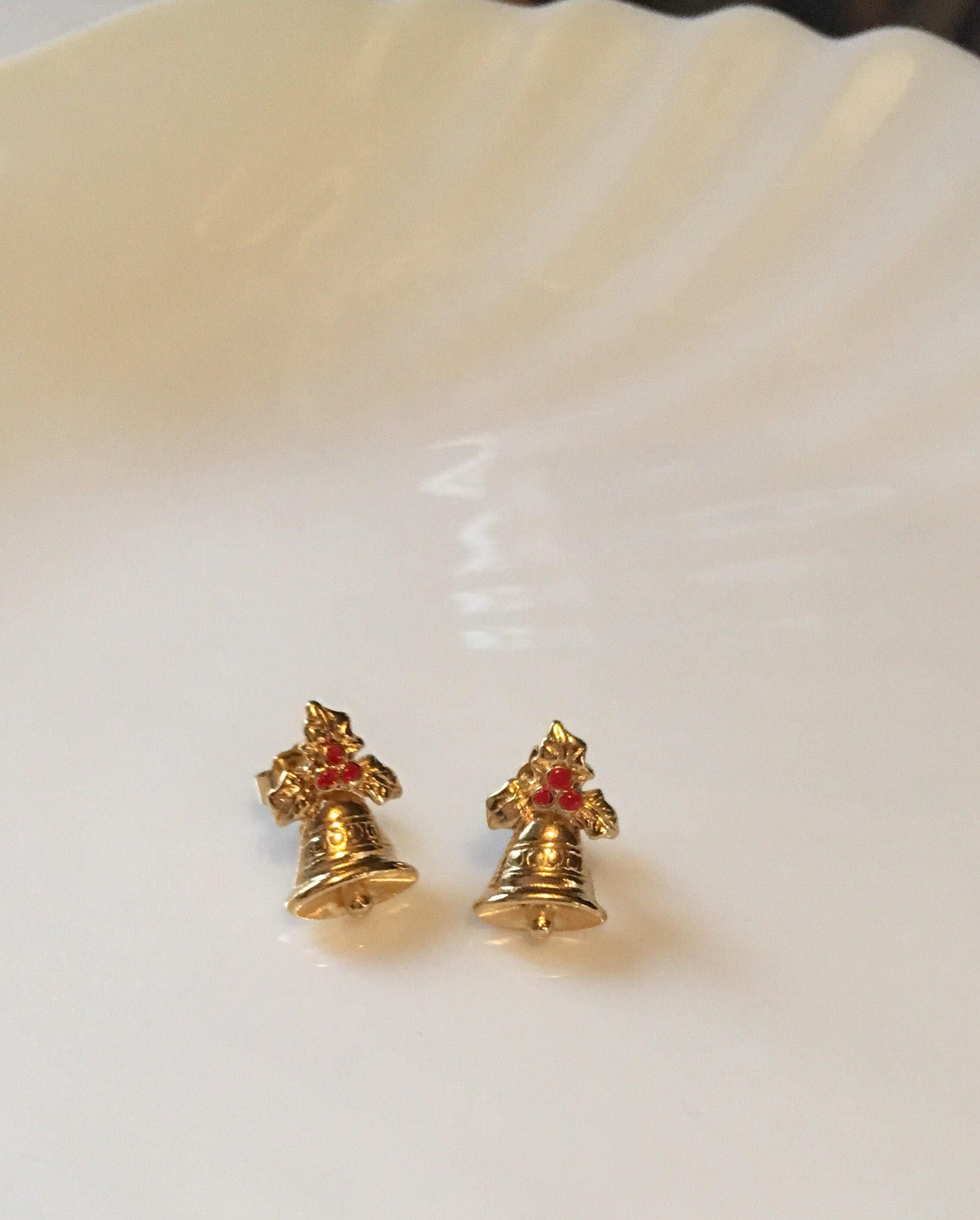 Christmas Holiday Bell Stud Earrings with red Holly Berries, Secret Santa Gift, Office Holiday Party Bling