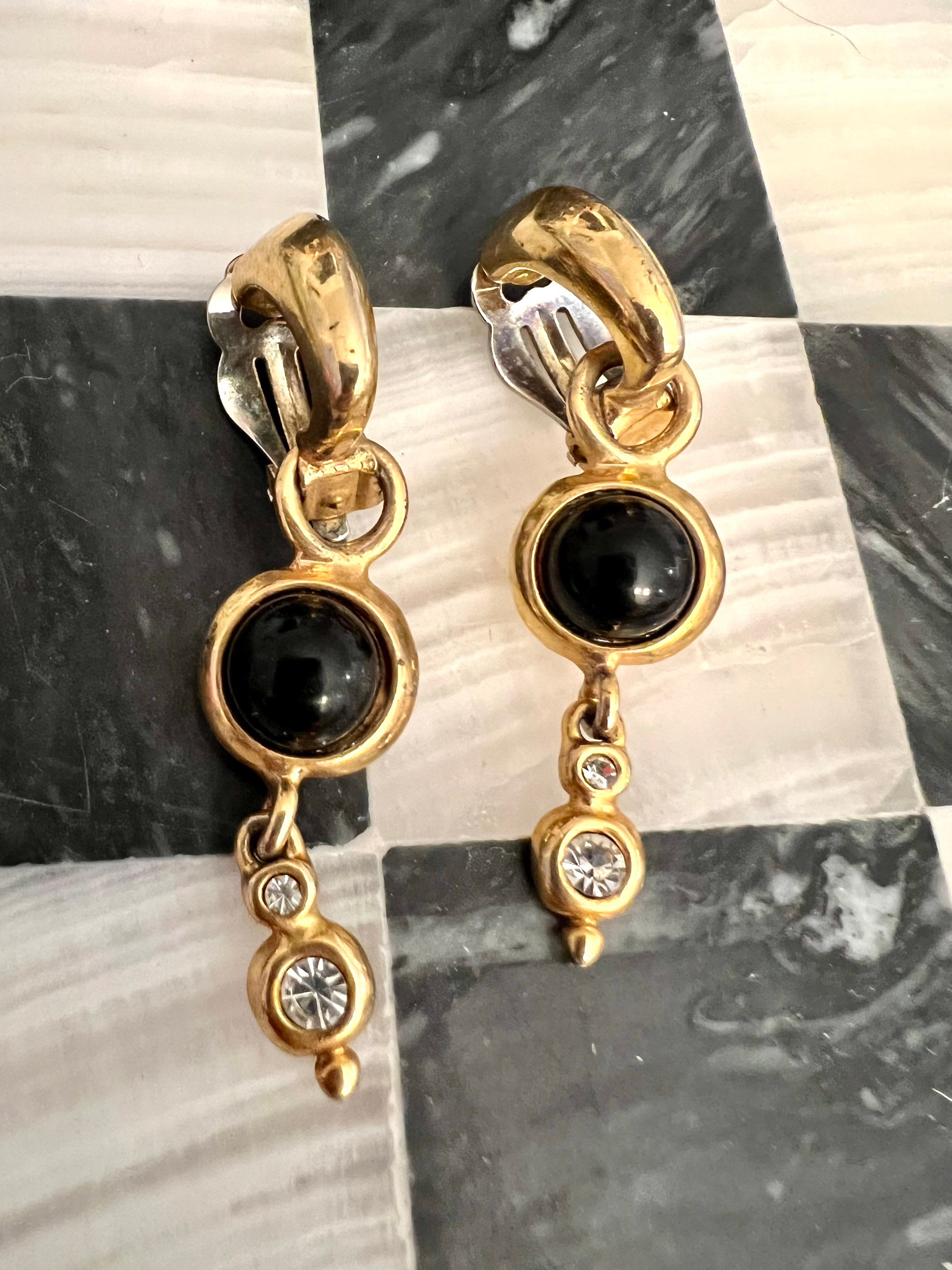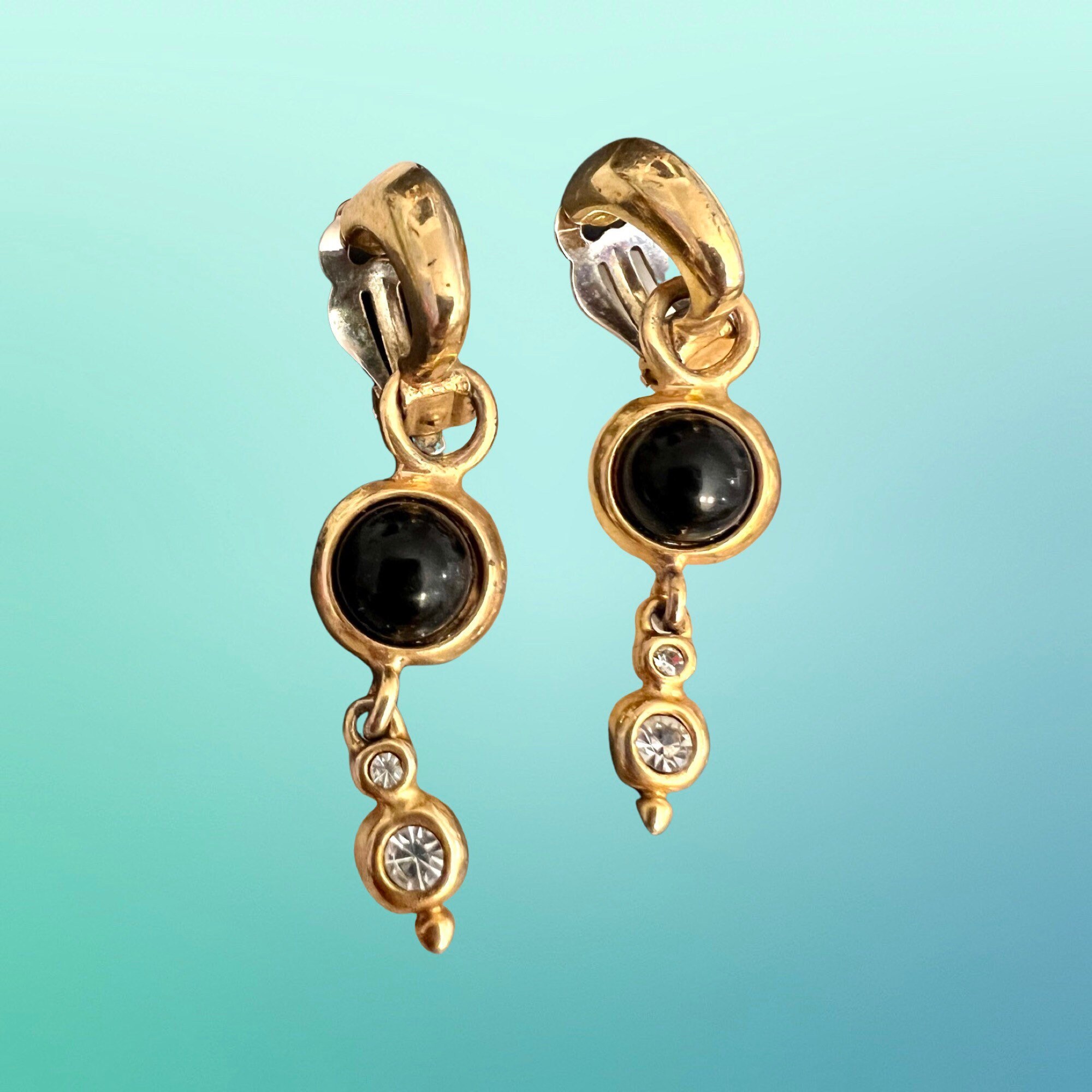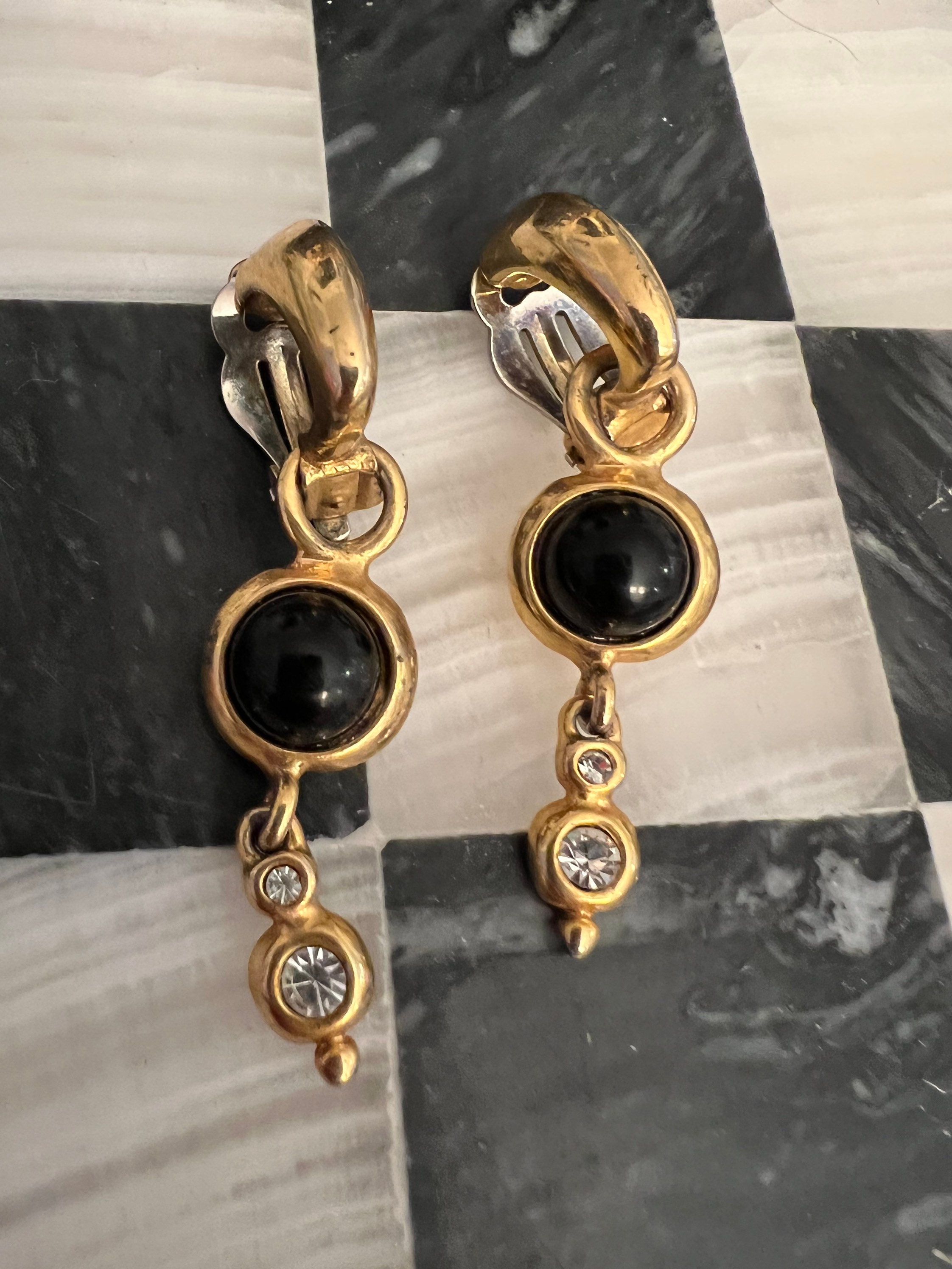 90s Glam black and gold dangles with crystal rhinestones, elegant statement earrings, perfect for the holidays