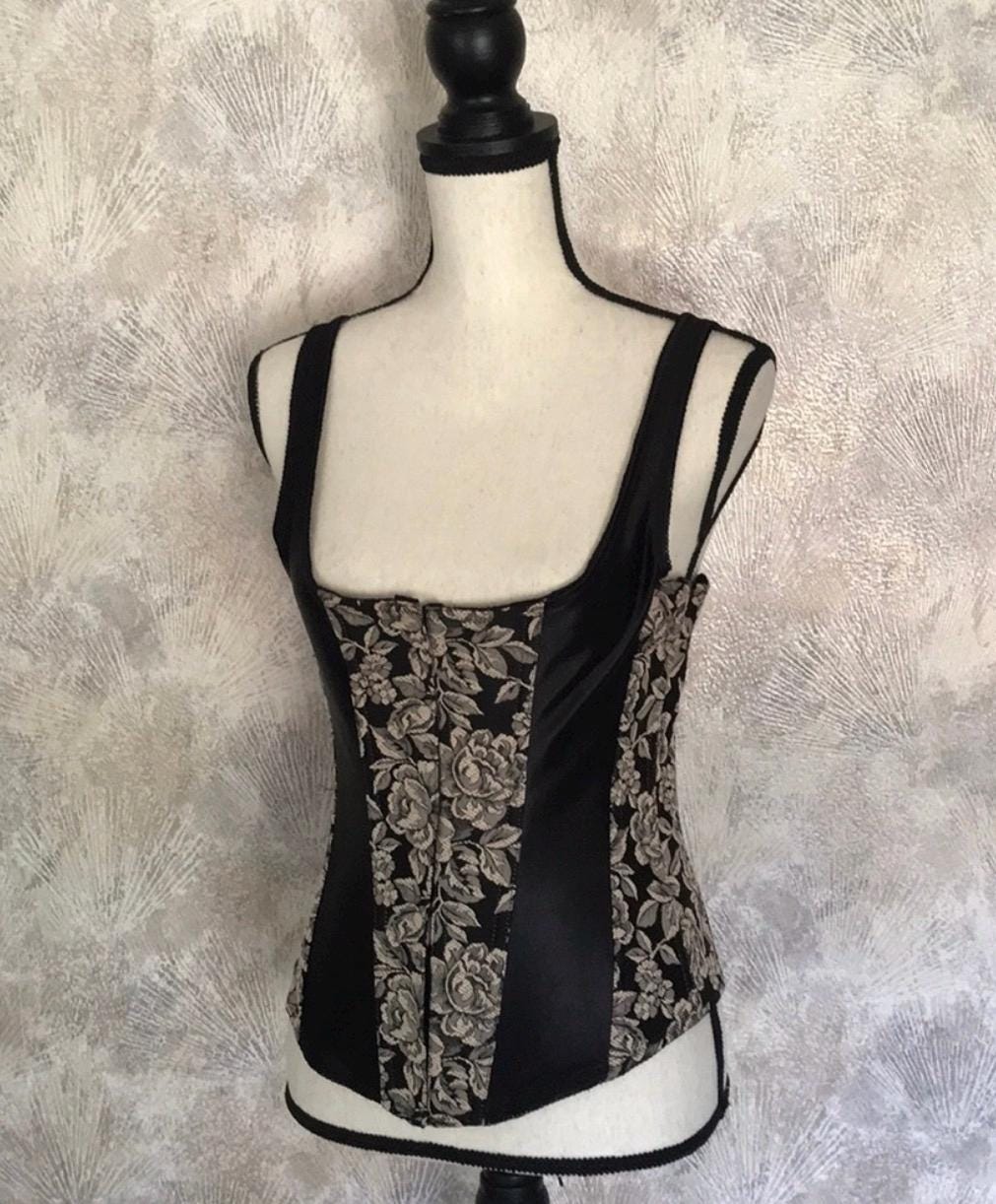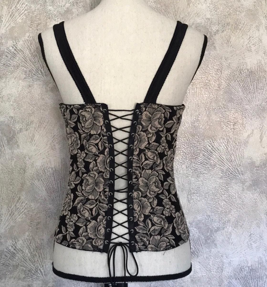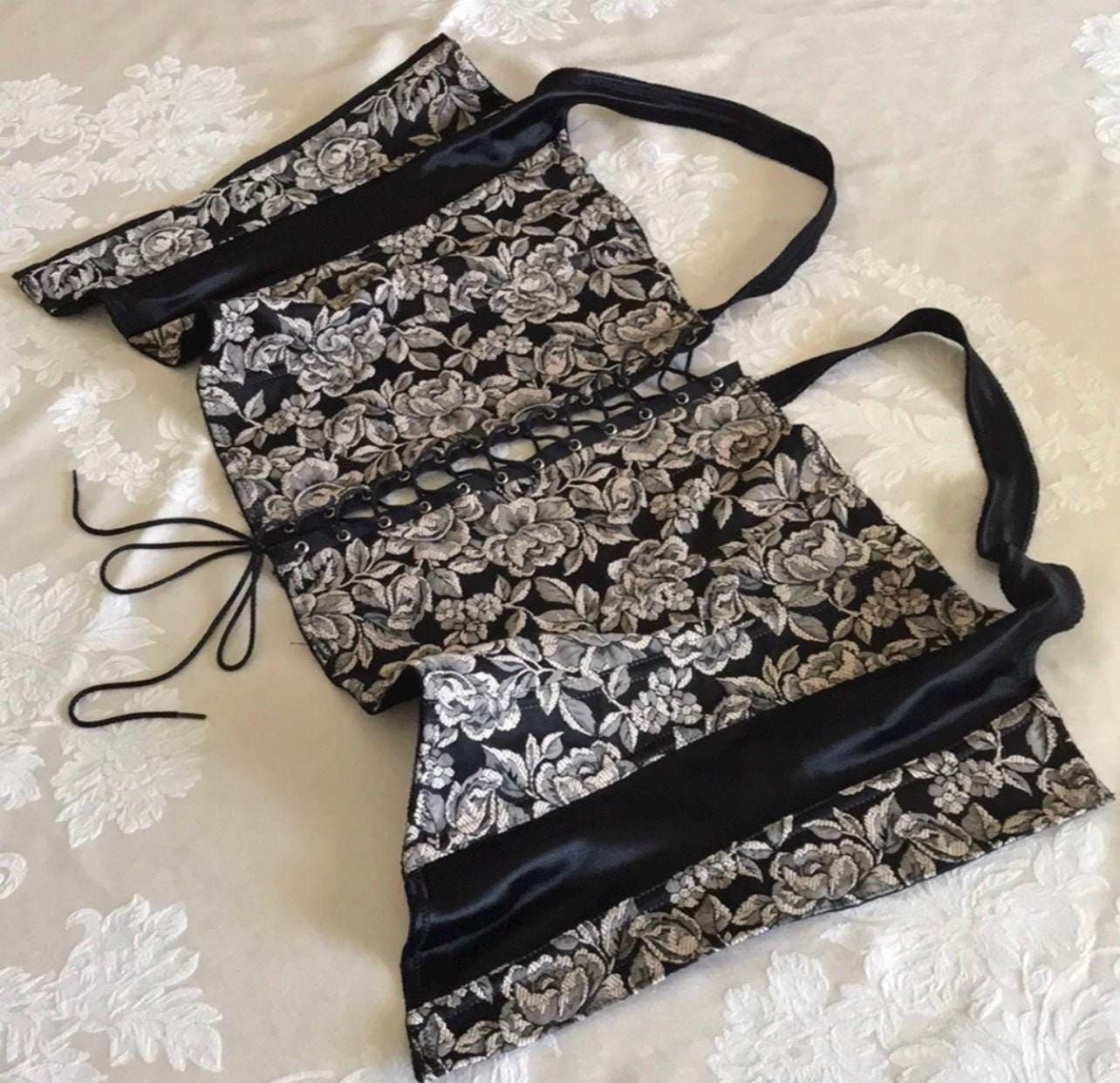 Vintage Brocade Lace-Up Corset, Black Satin Lingerie Set