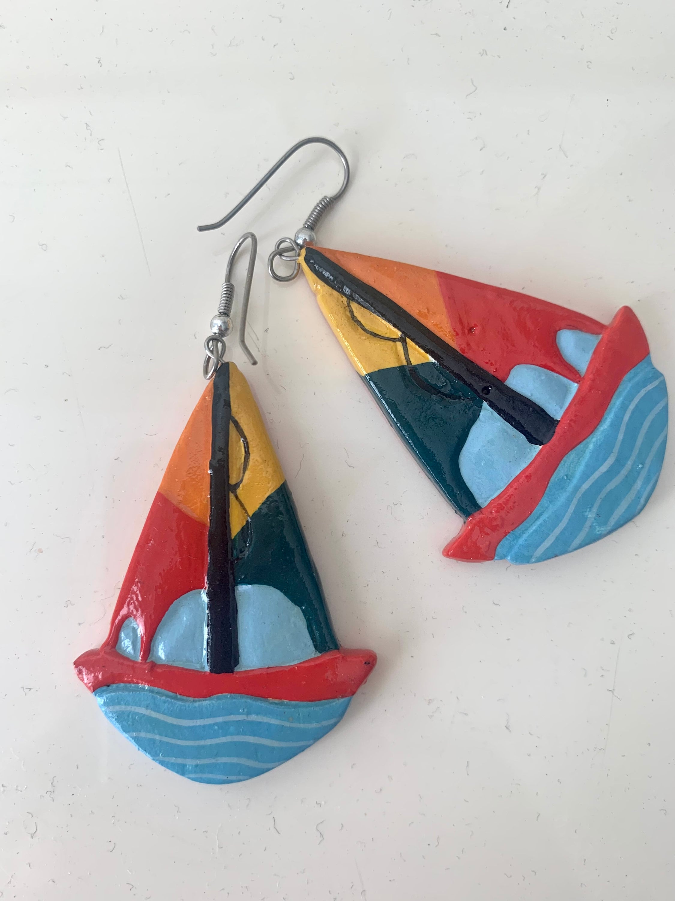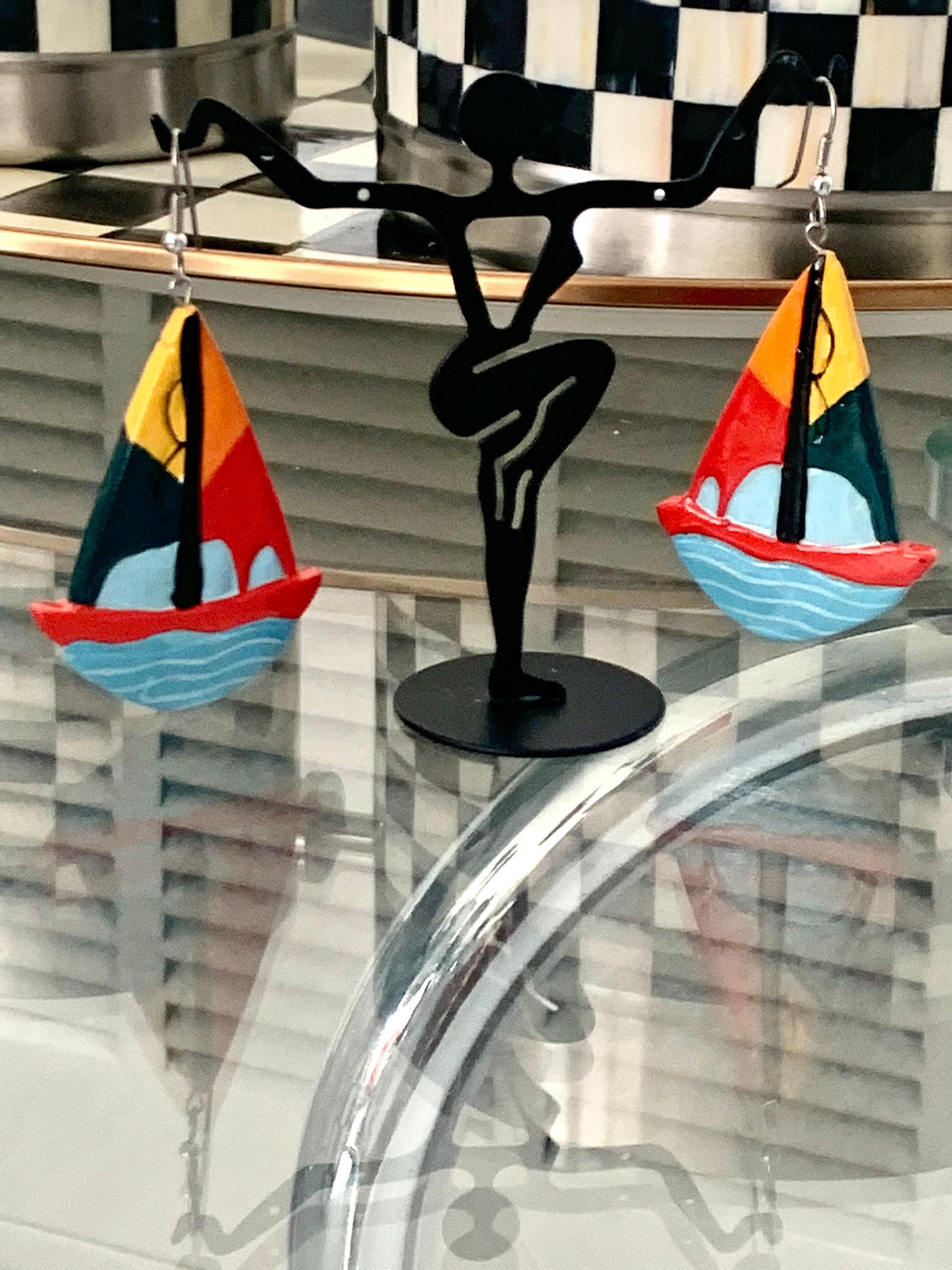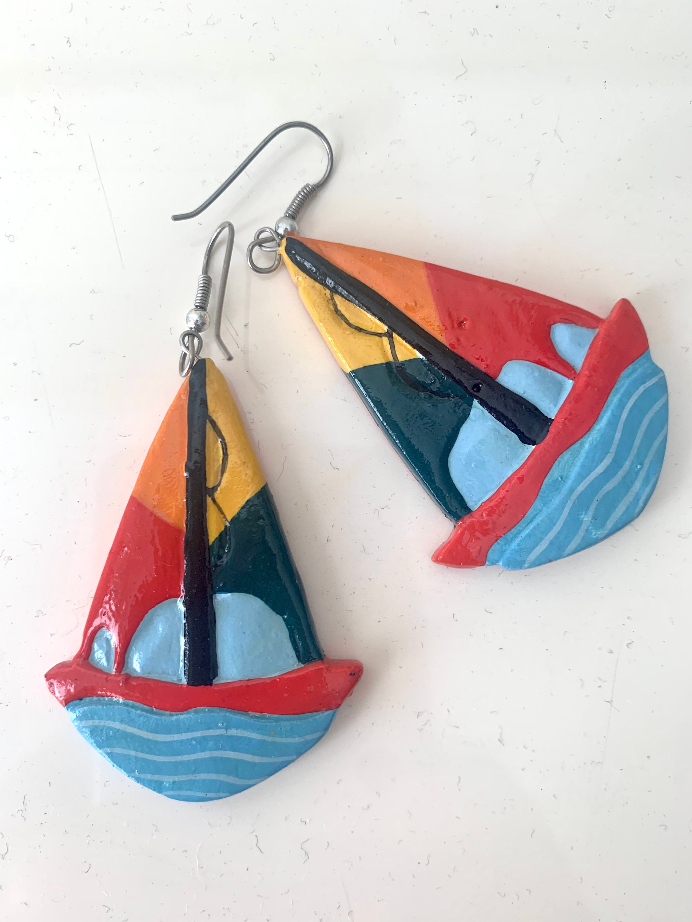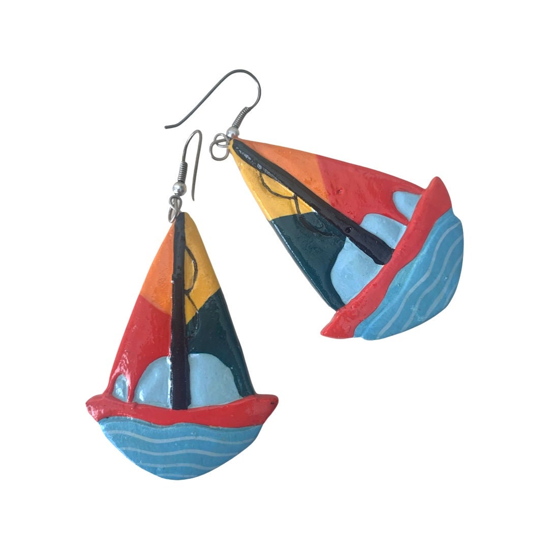 Vintage Hand Painted Sailboat Earrings, Colorful Color Block Enamel Painted Wooden Dangles, Nautical Jewelry, Sailing, Boating Beach Lovers