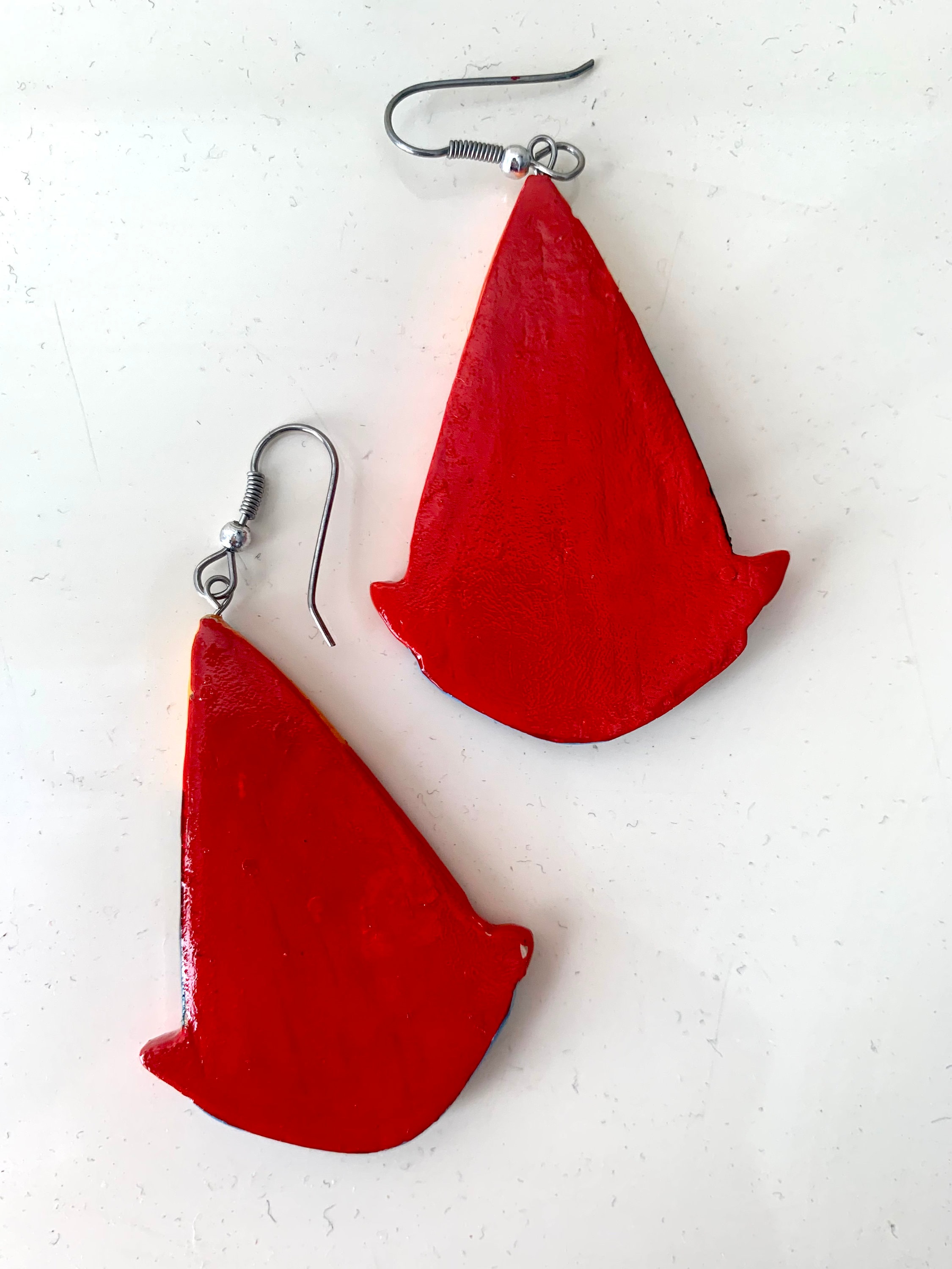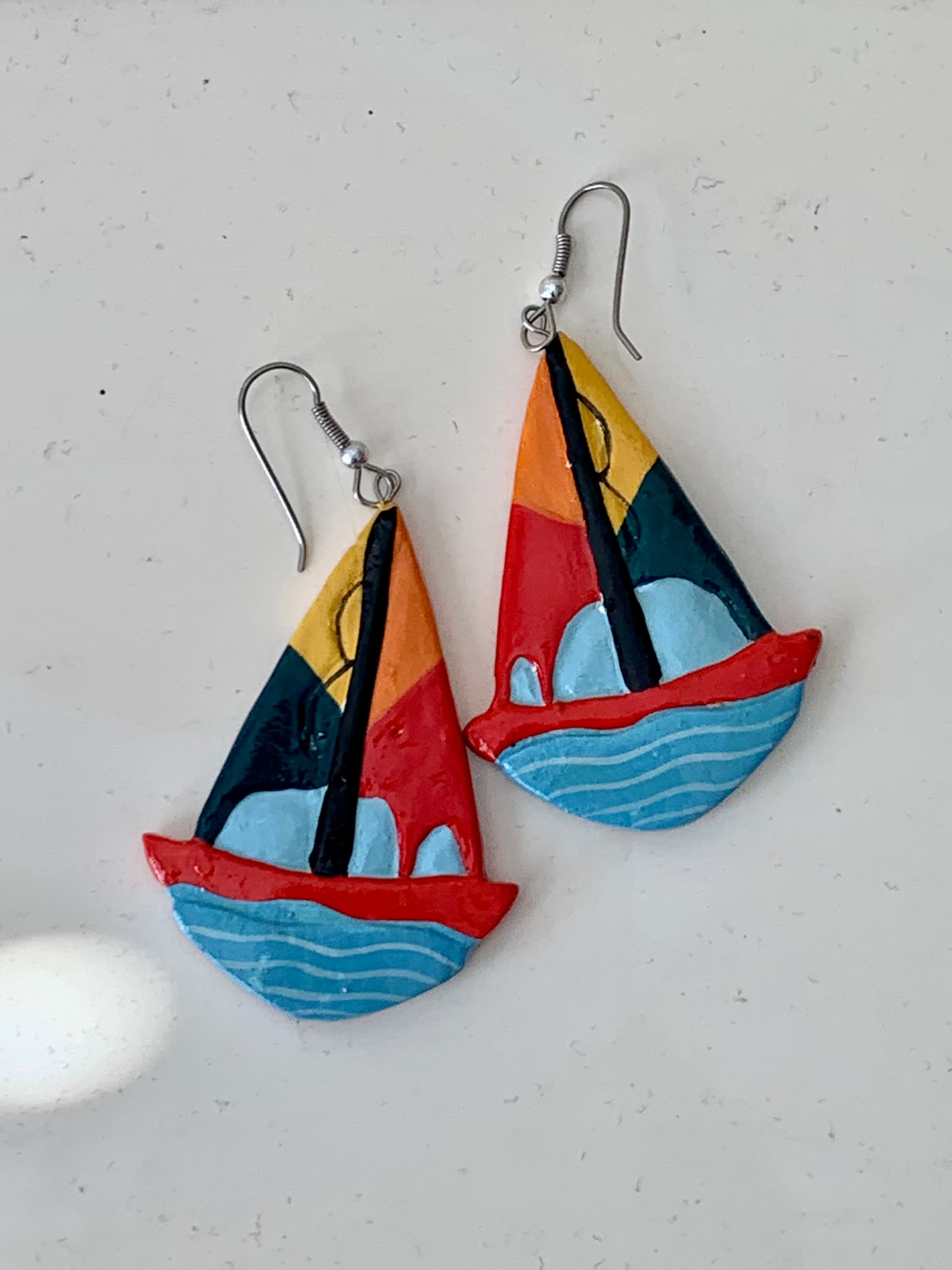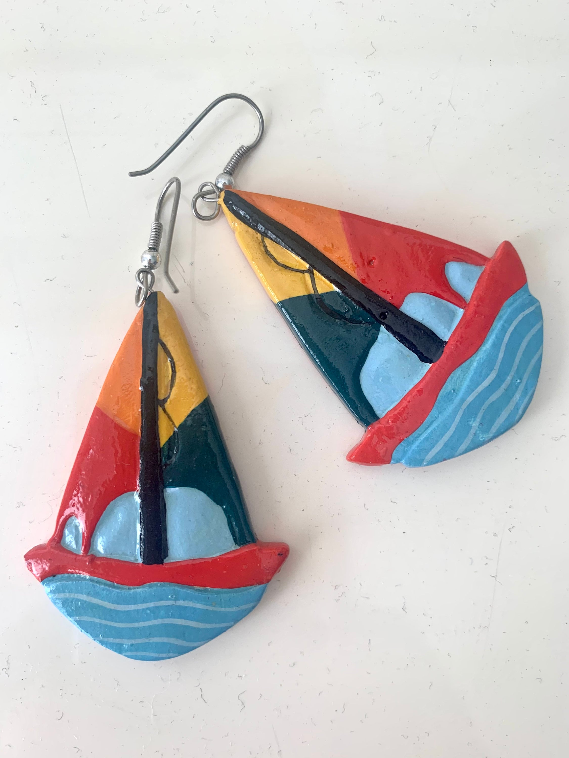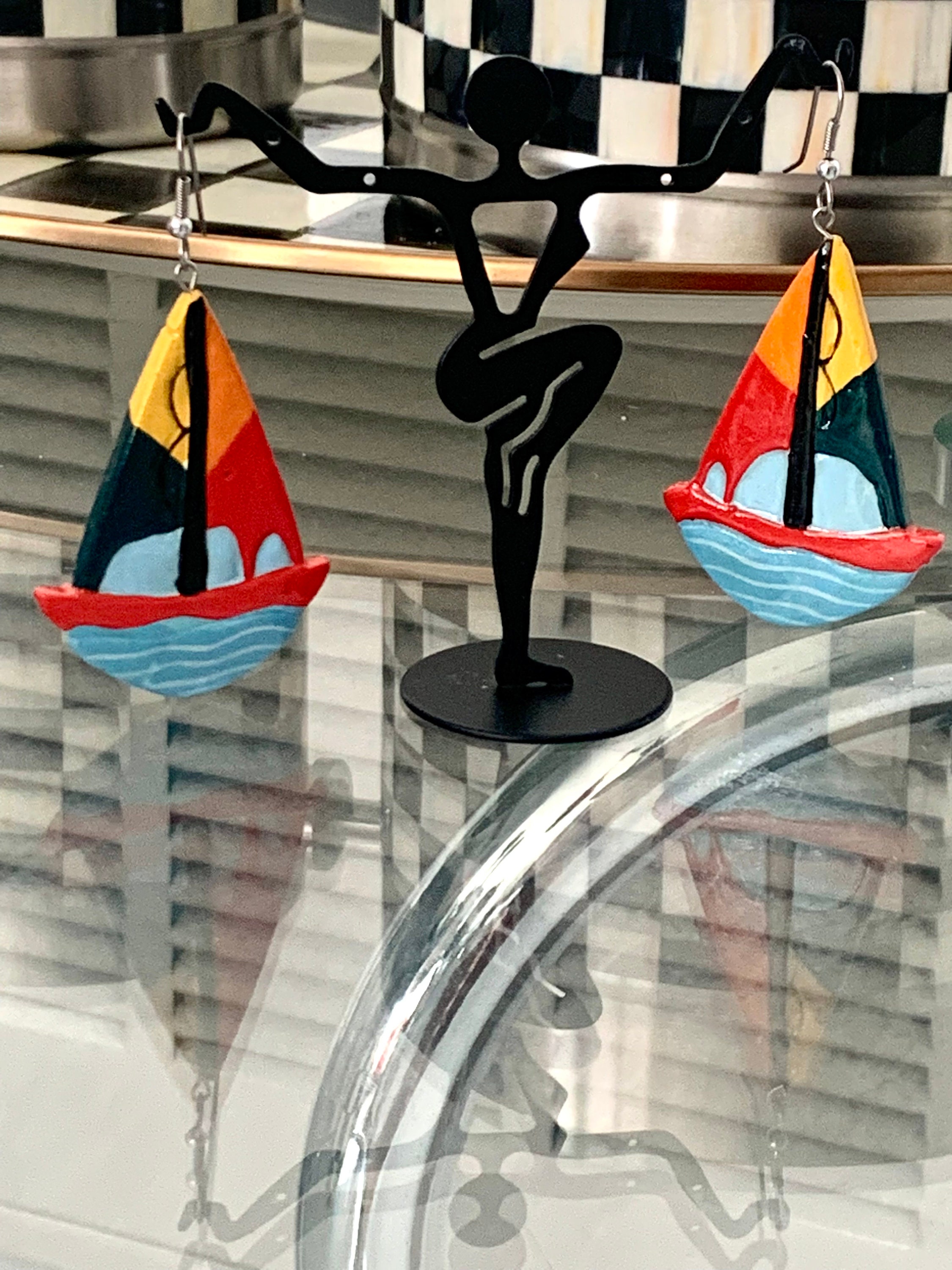Vintage Hand Painted Sailboat Earrings, Colorful Color Block Enamel Painted Wooden Dangles, Nautical Jewelry, Sailing, Boating Beach Lovers