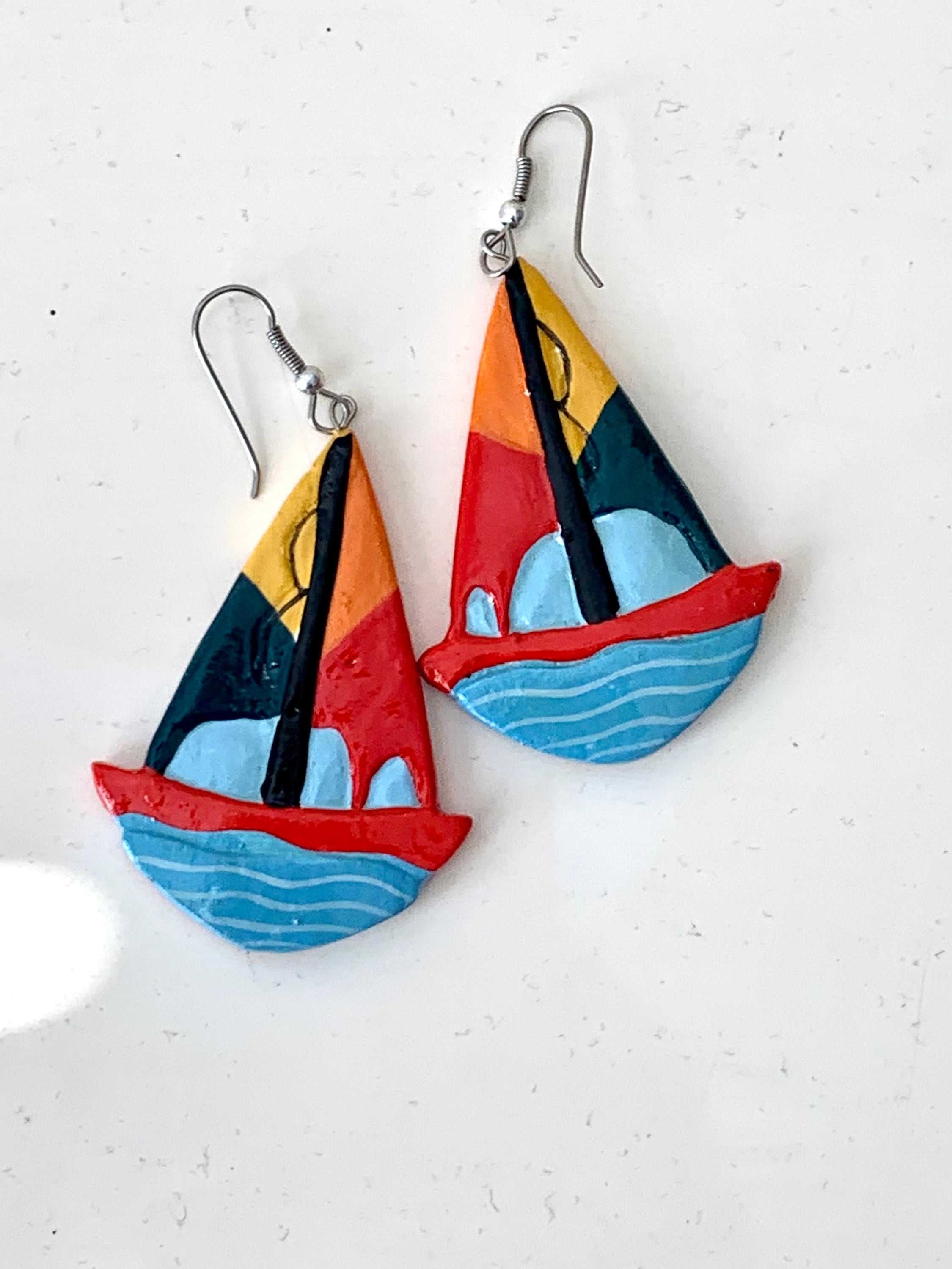 Vintage Hand Painted Sailboat Earrings: Nautical Wooden Dangles