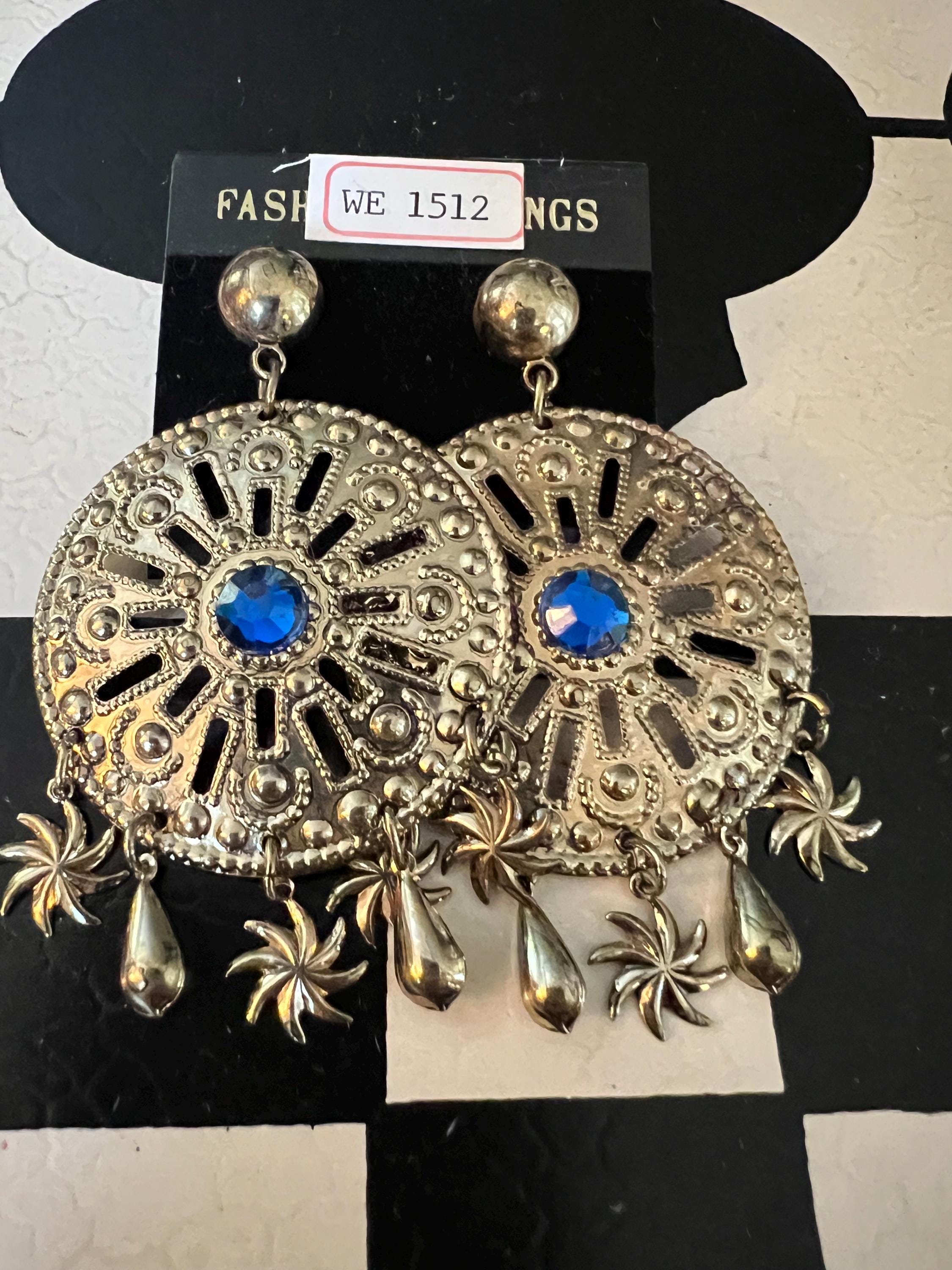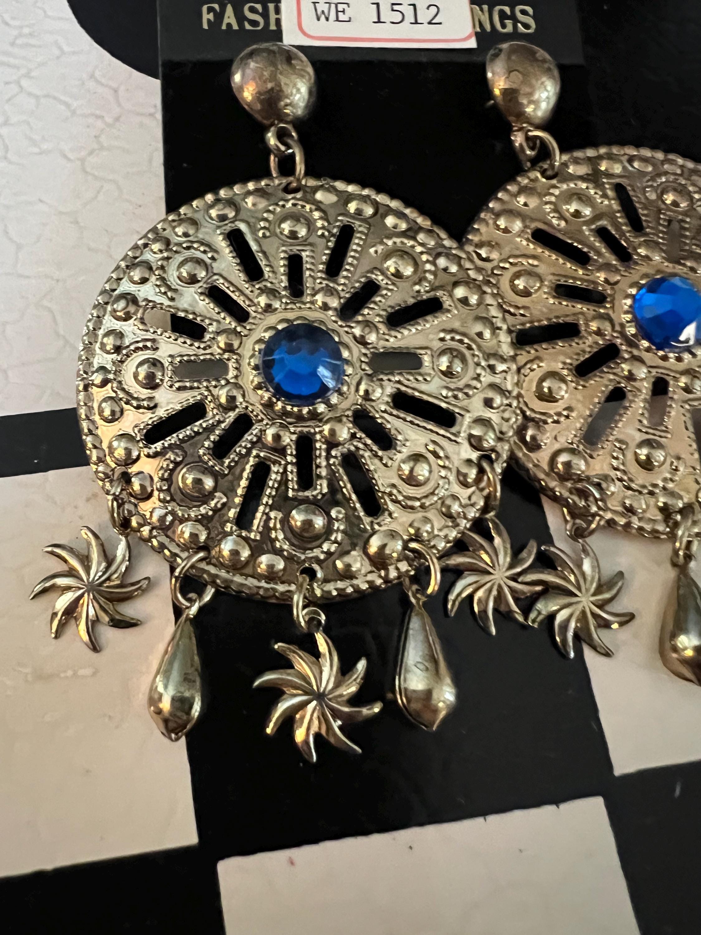 Vintage Deadstock 90s Glam Bohemian Celestial Chandelier Earrings, Big Light Weight Estruscan Egyptian Tribal Golden Costume GlamourJewelry with faux acrylic blue gems