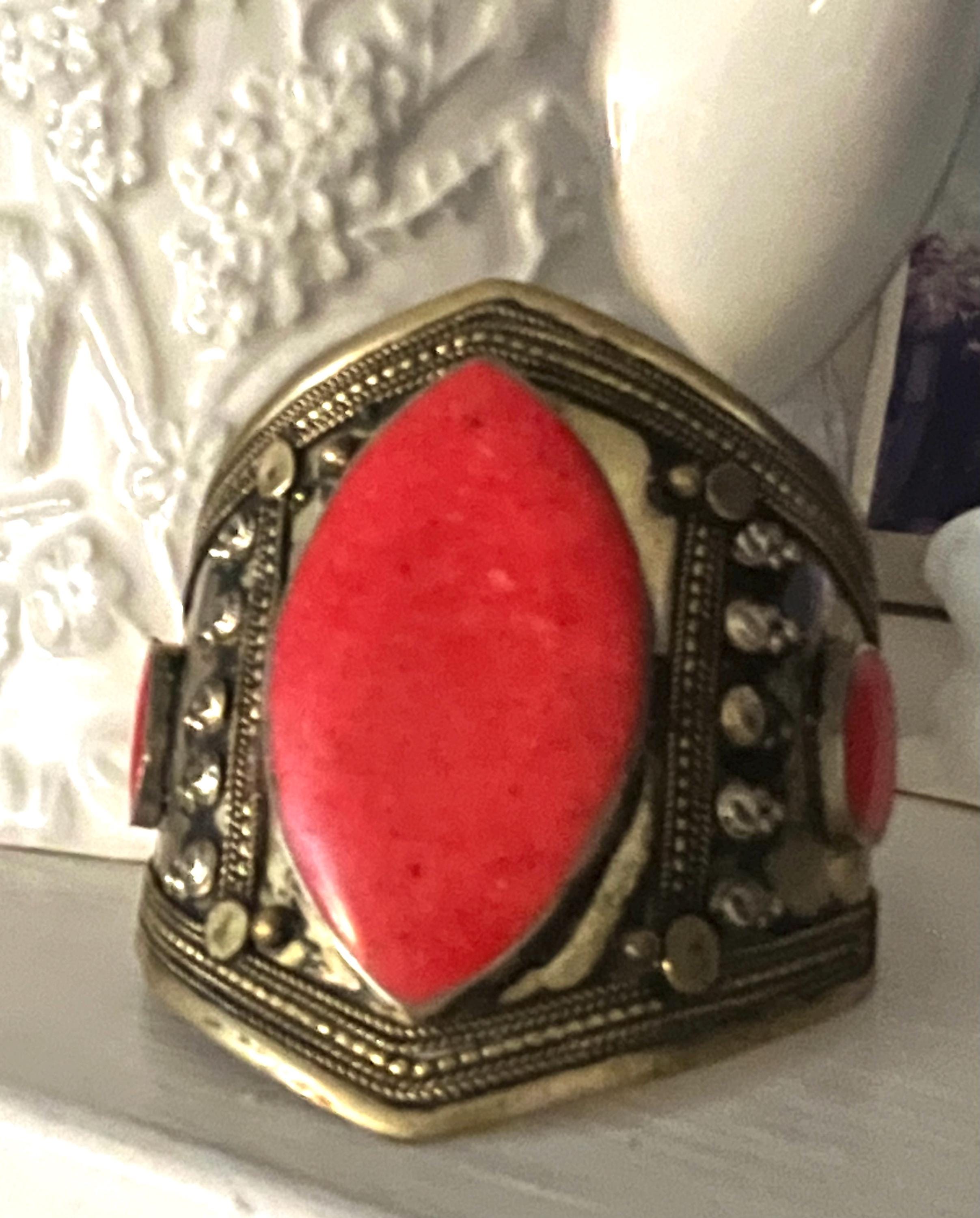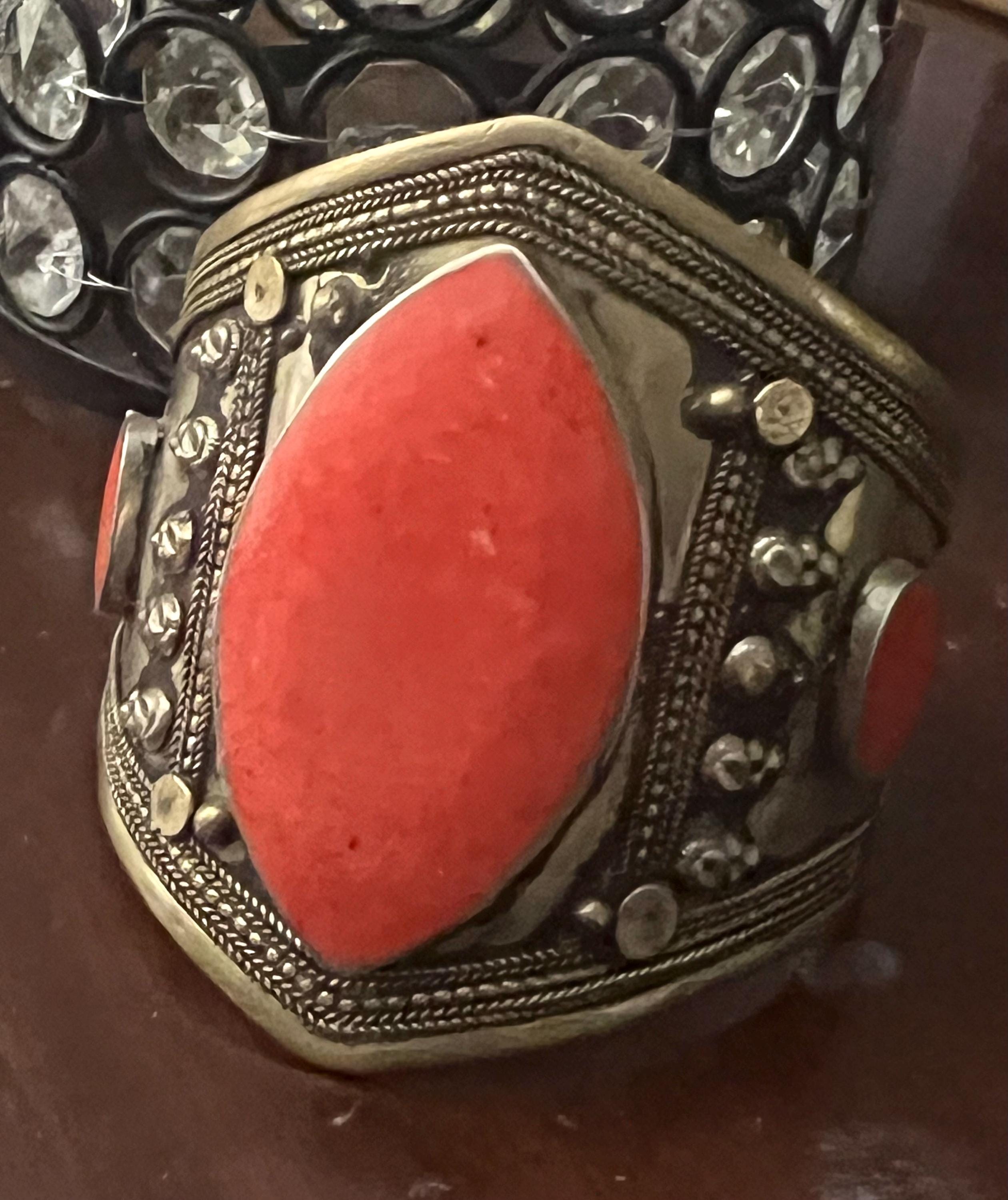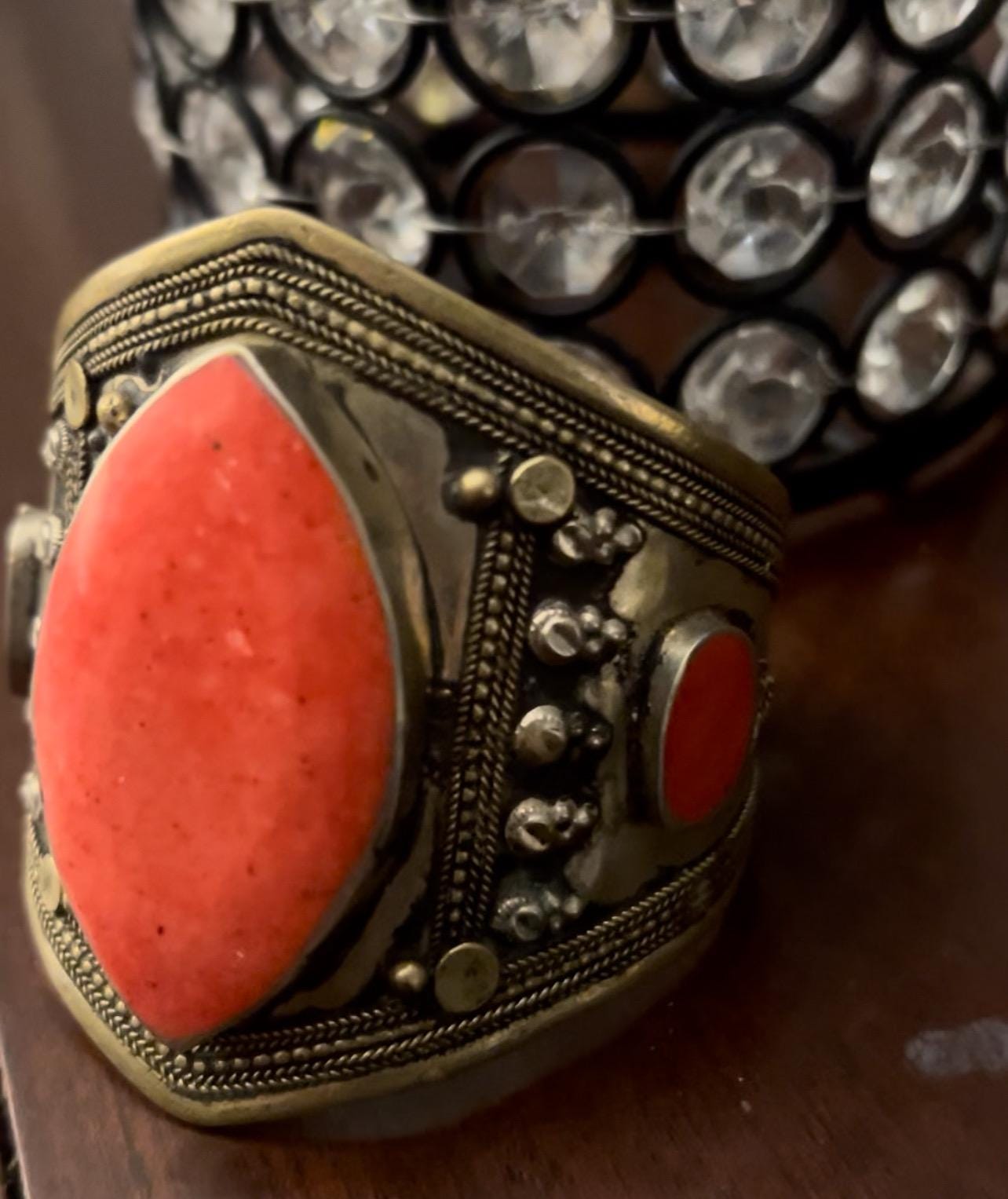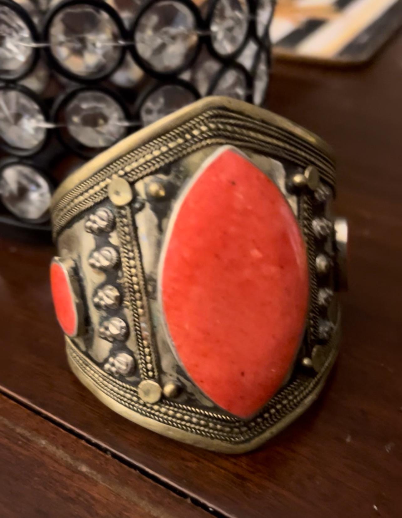 This large cuff is a really unique deep rose pink colored stone and is large enough to fit most wrists. The metal can carefully bend, as well.