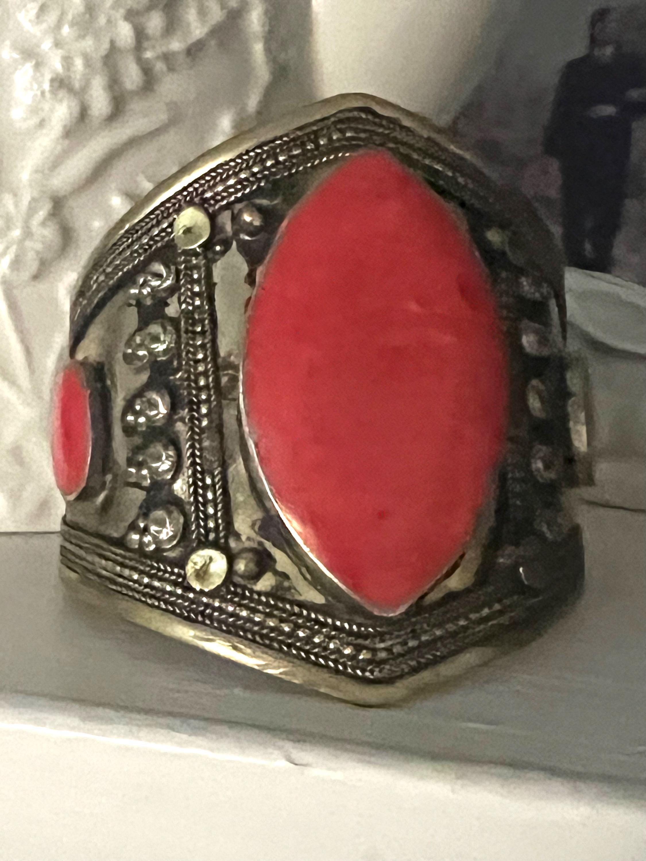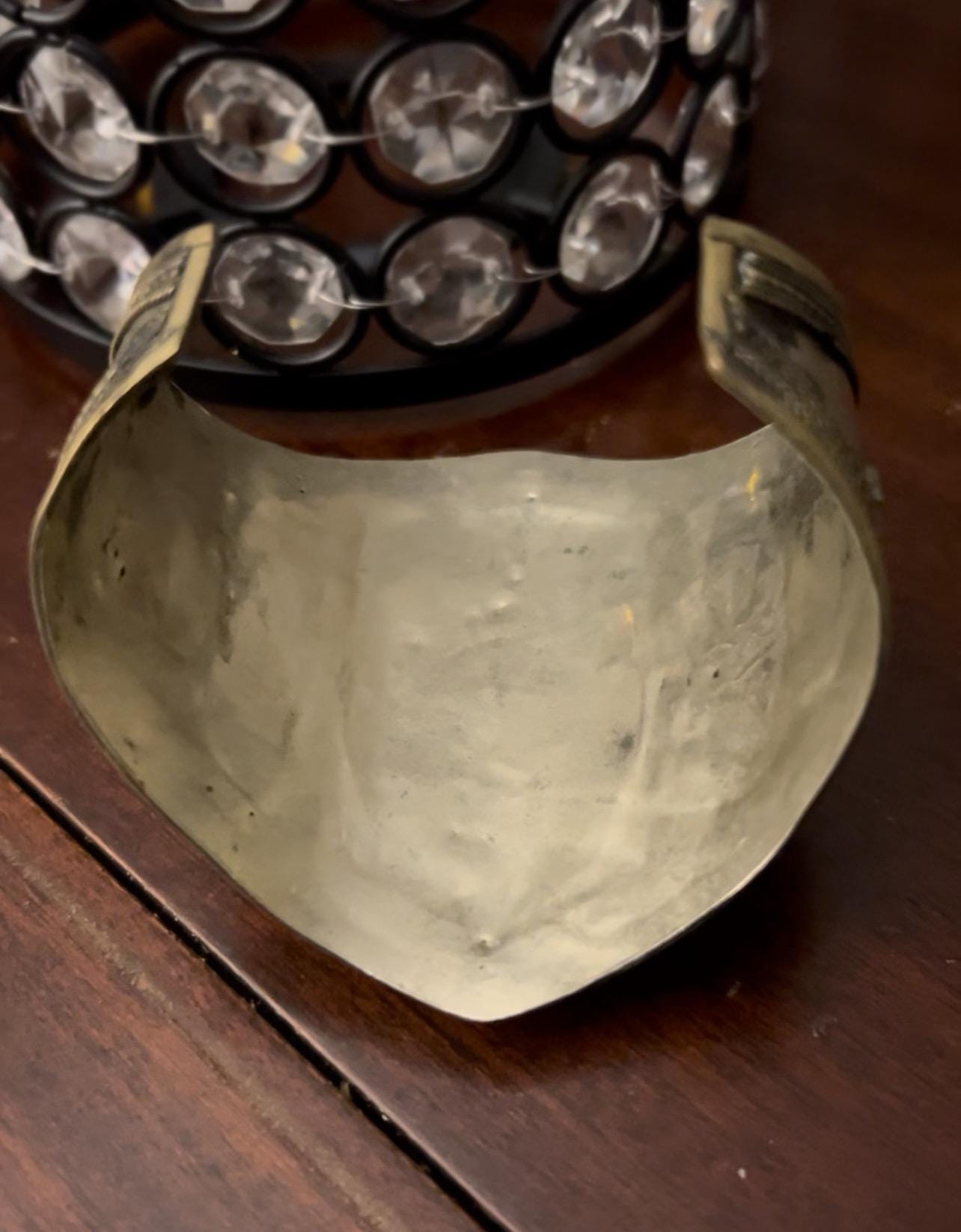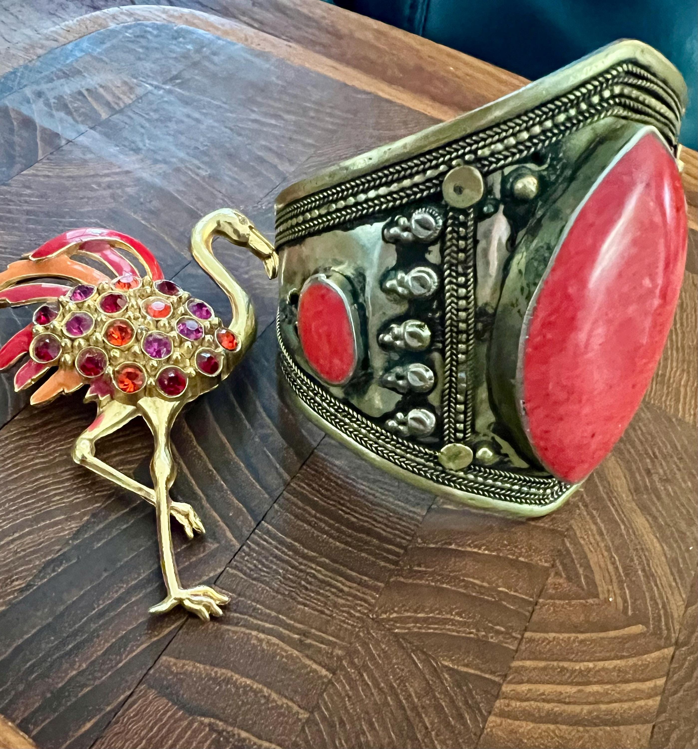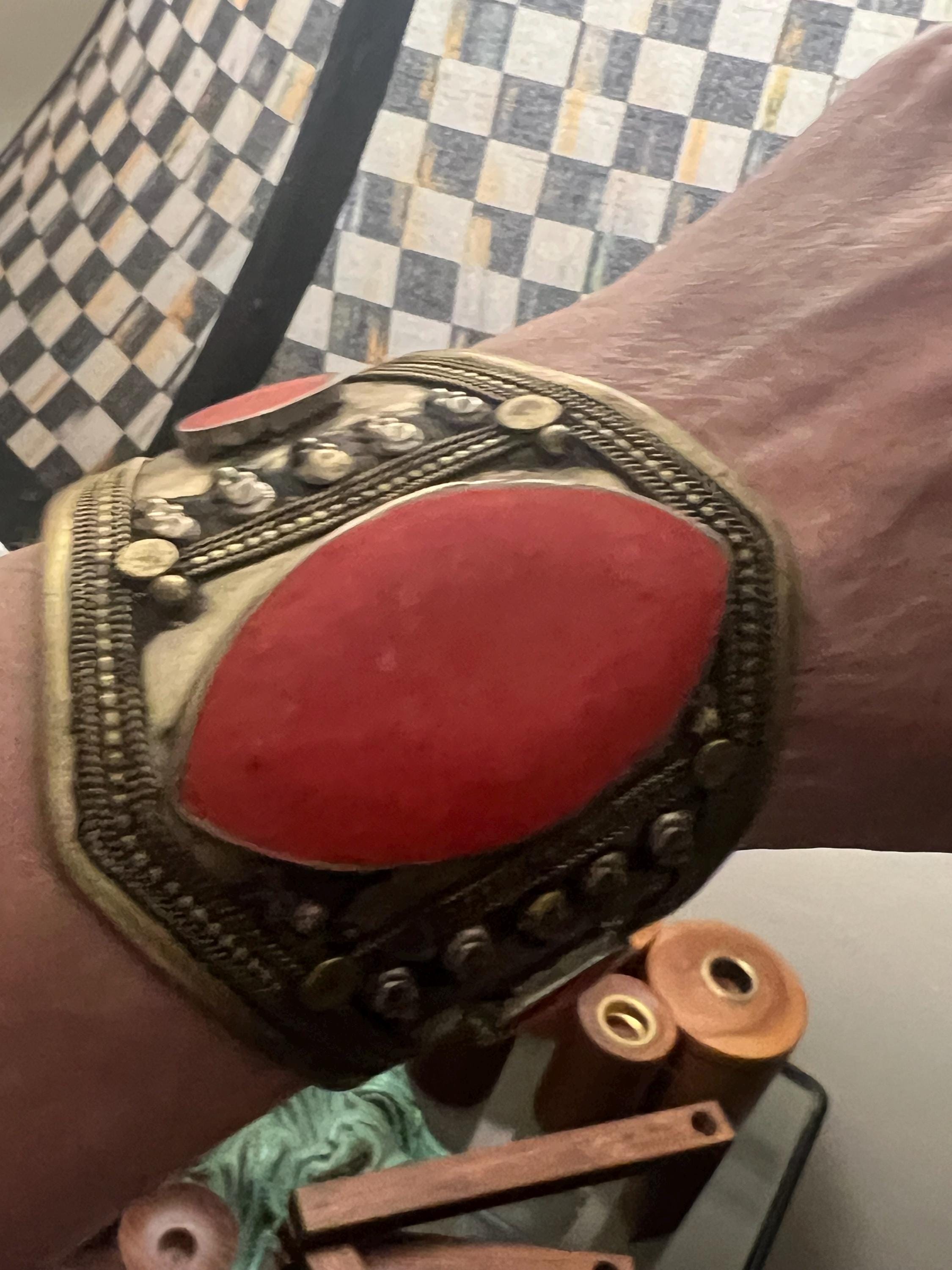 This large cuff is a really unique deep rose pink colored stone and is large enough to fit most wrists. The metal can carefully bend, as well.