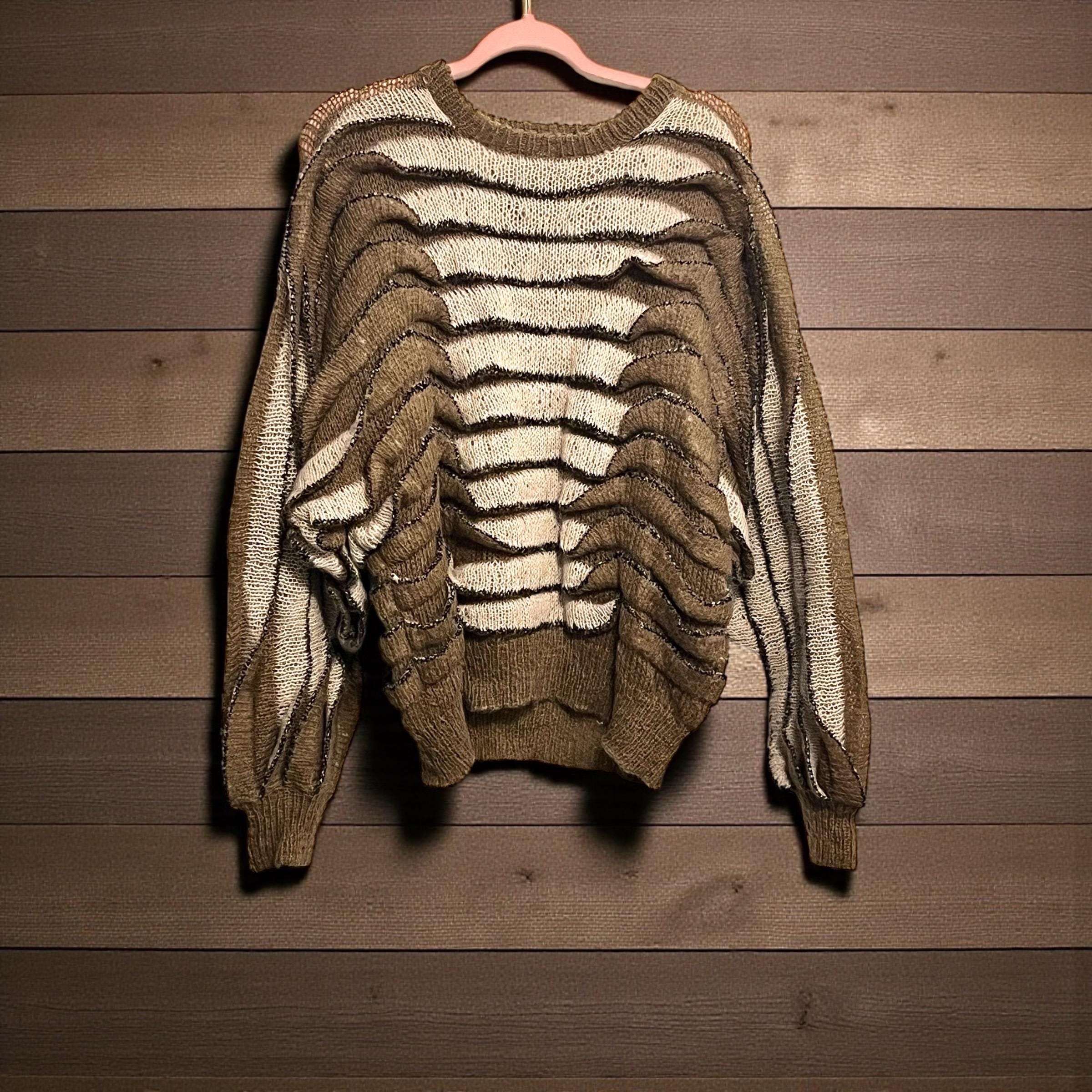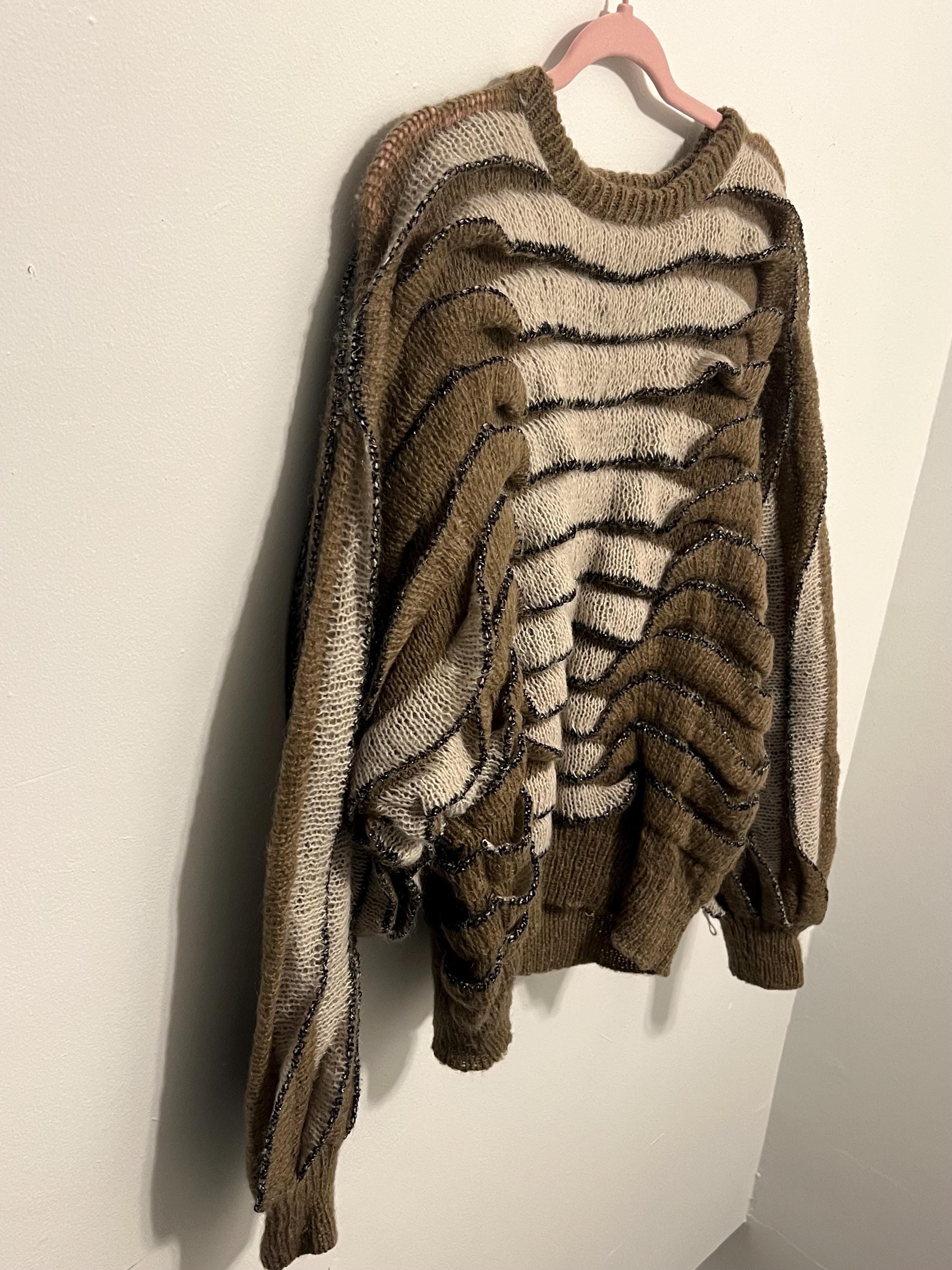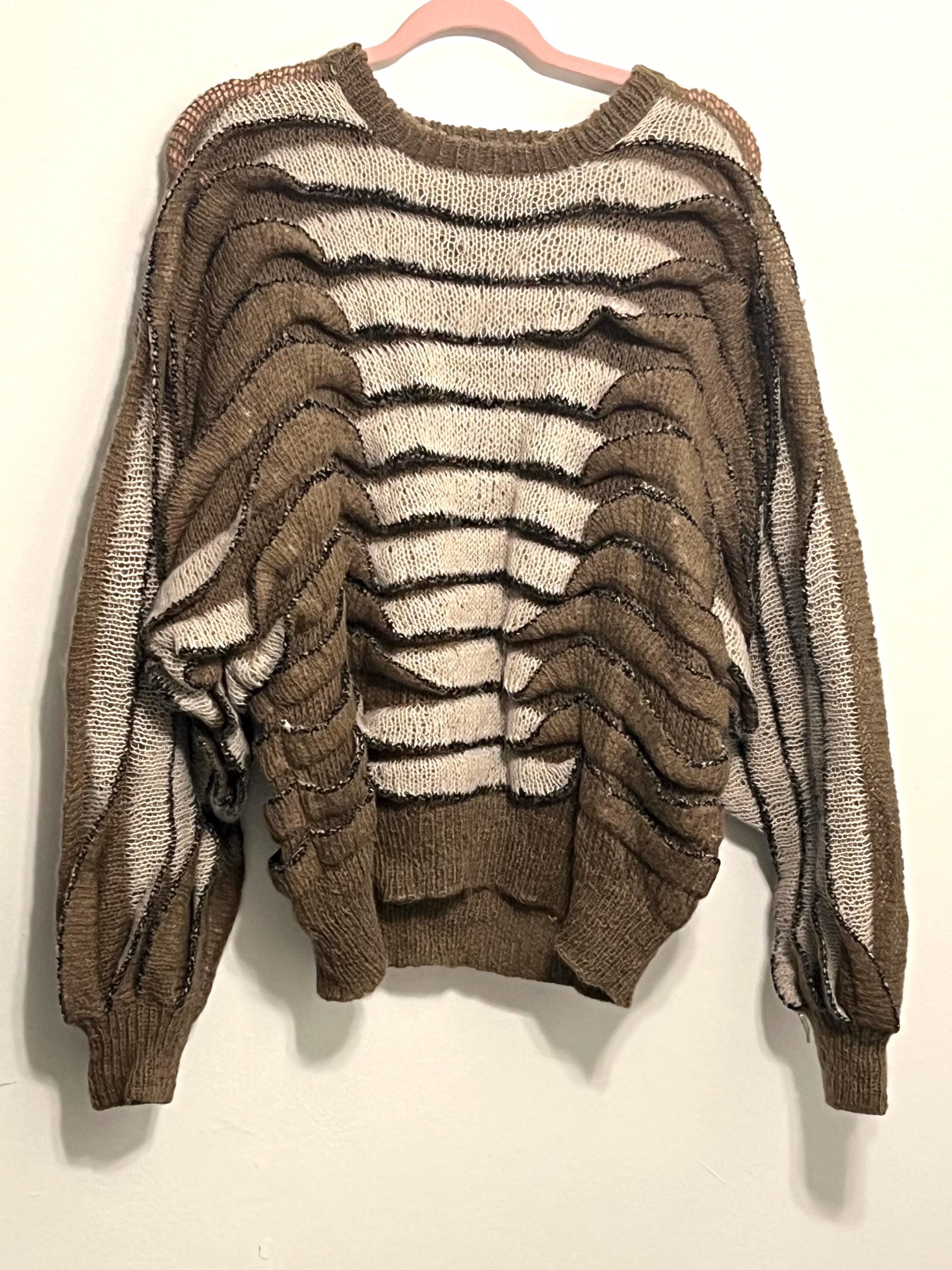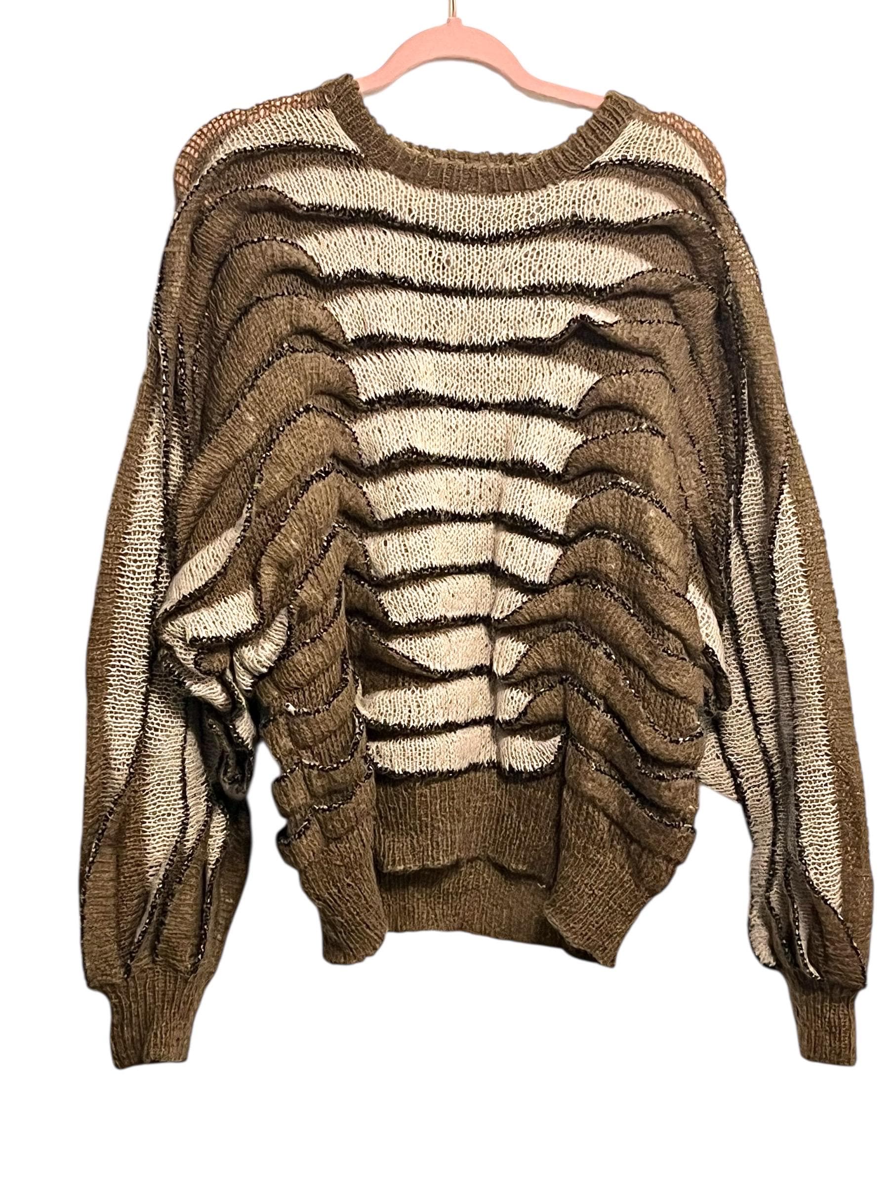 Vintage 50’s/60s Mohair Sweater, Sligjt Dolman Sleeves, Ripples of Tan Taupe Cream colors and Golden threads to accent. genuine. oversized.