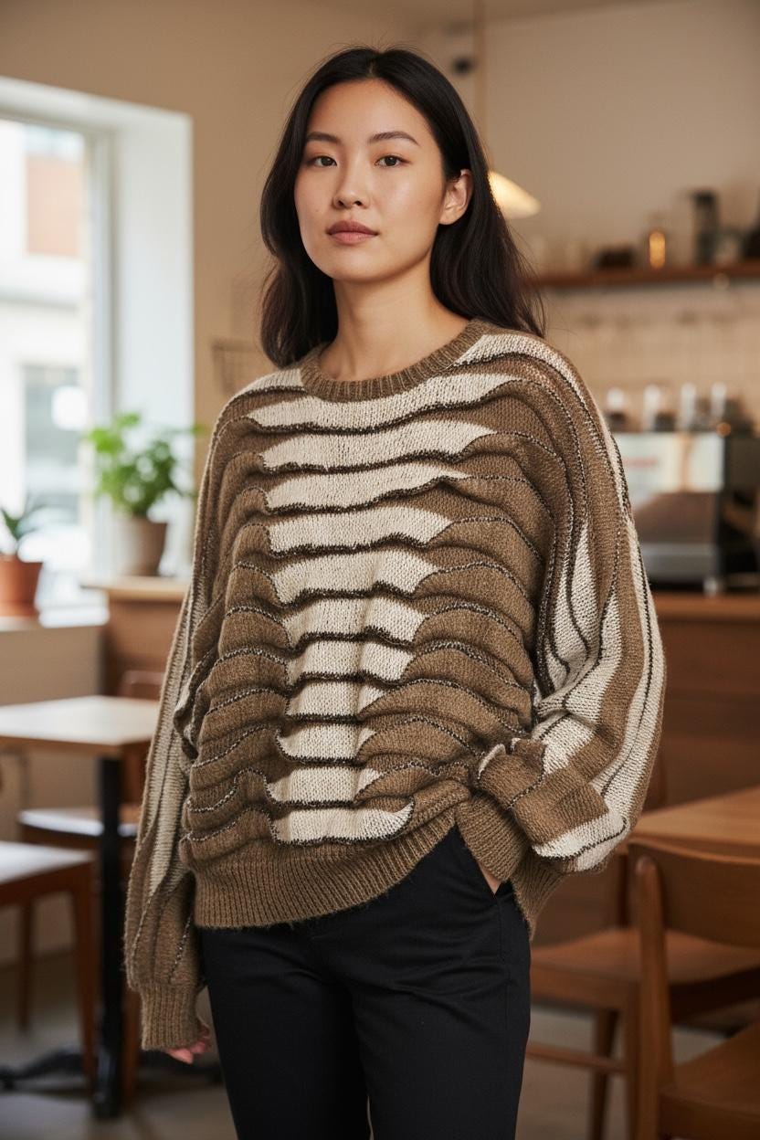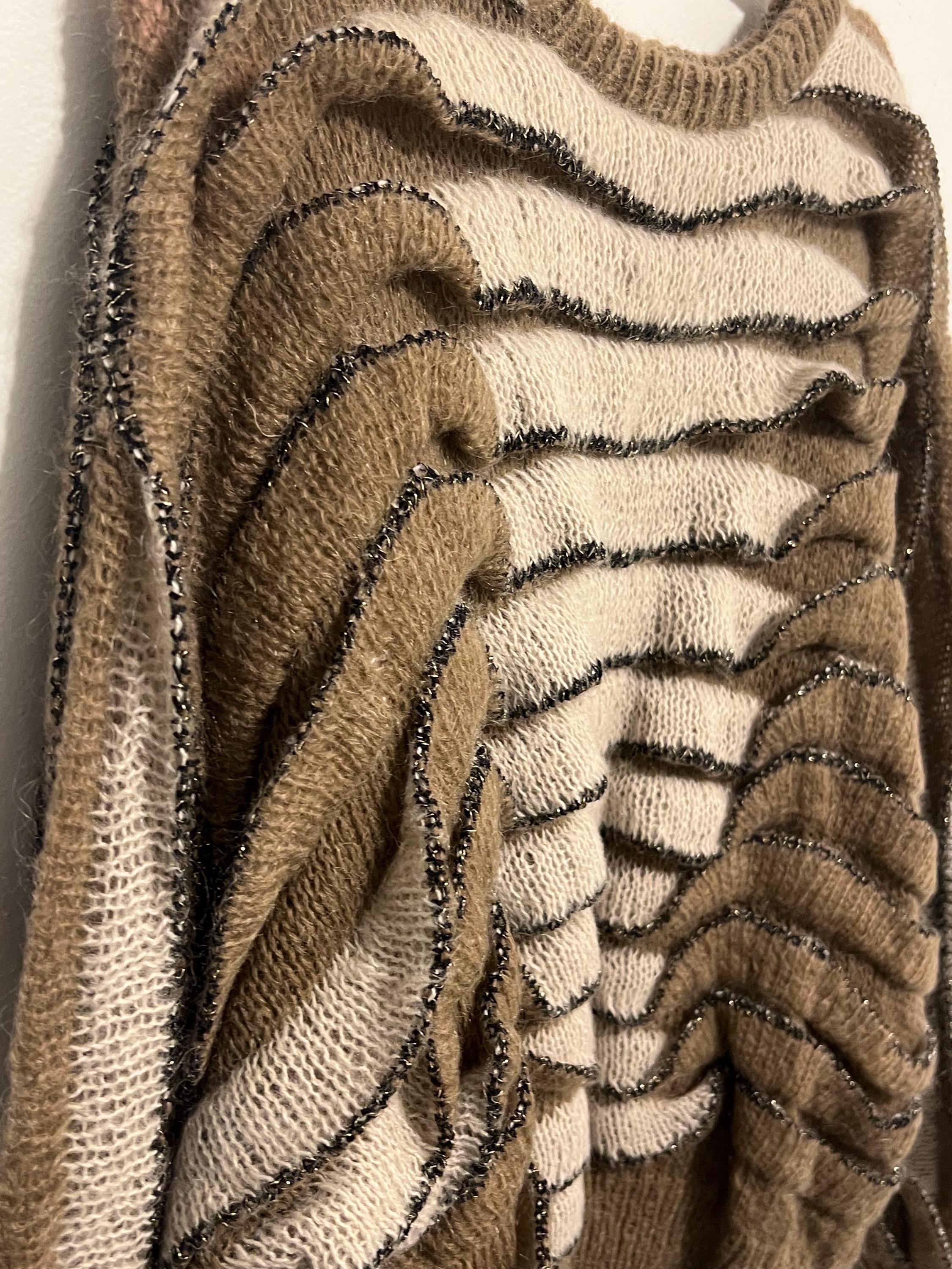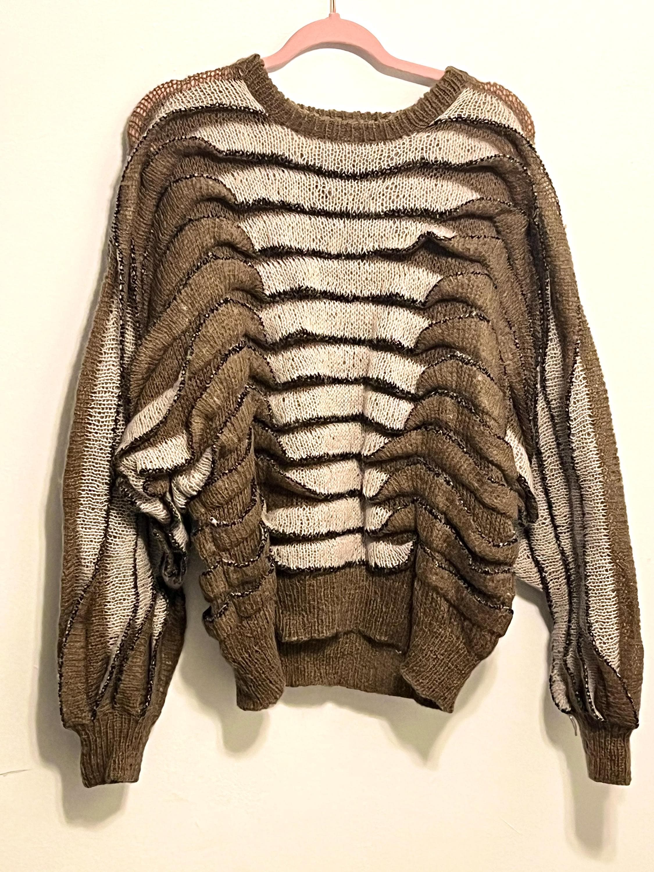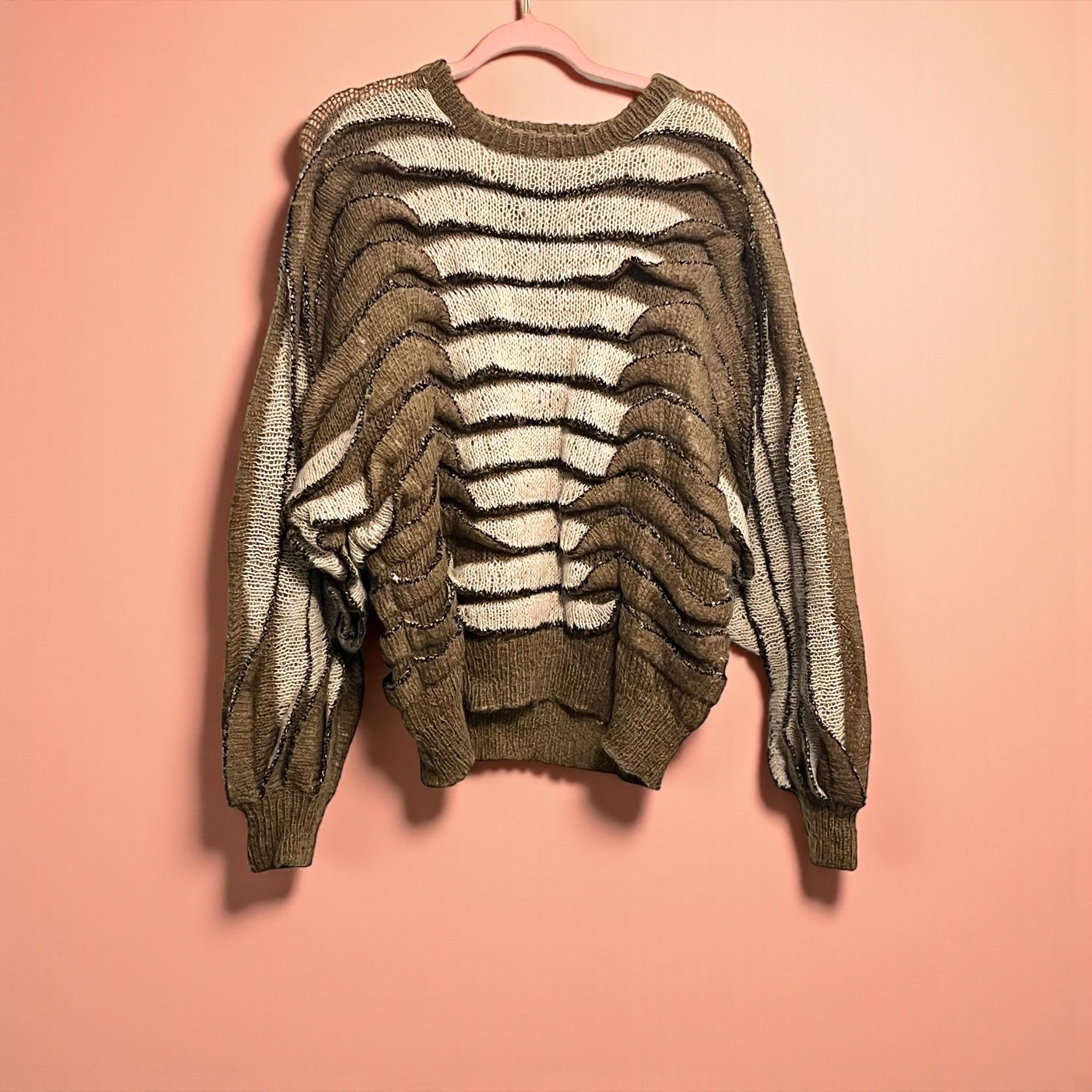 Vintage 50’s/60s Mohair Sweater, Sligjt Dolman Sleeves, Ripples of Tan Taupe Cream colors and Golden threads to accent. genuine. oversized.
