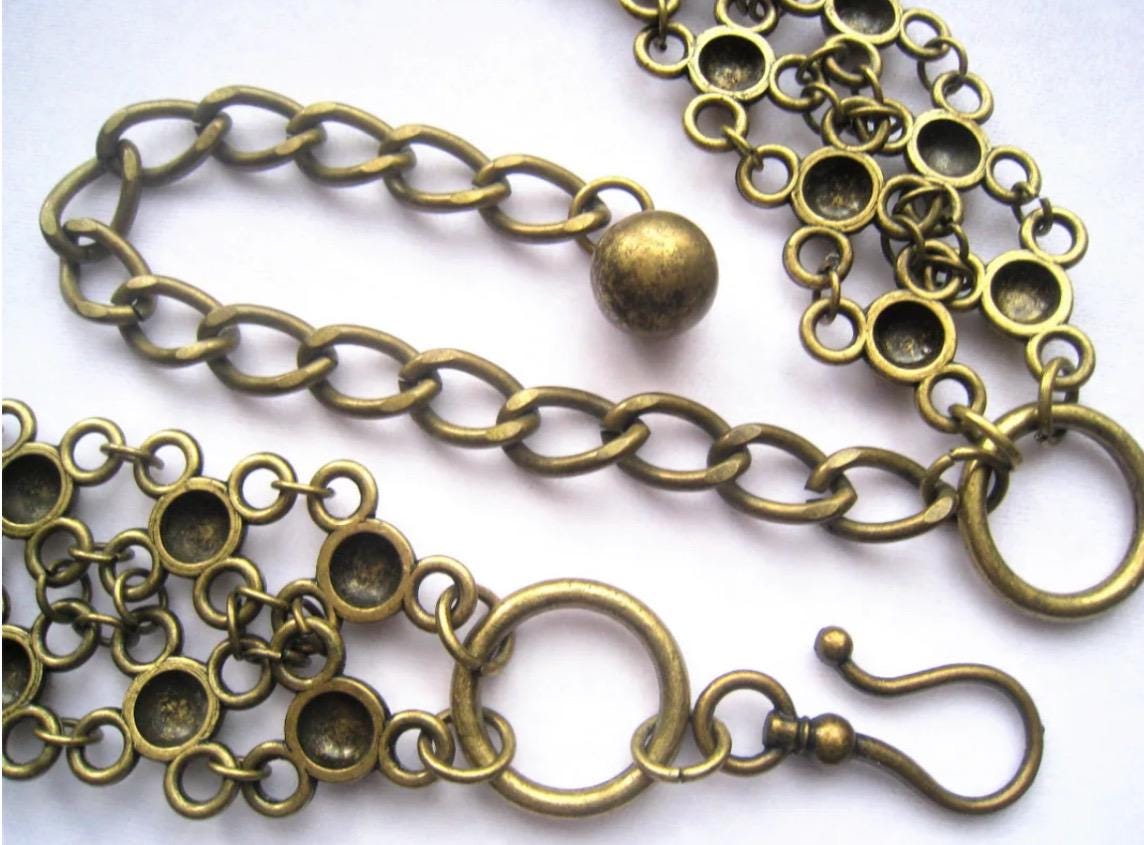 This belt is a brass tone antique gold color. The main body of the belt is made up of 2 strands of custom links which have been attached with links to join the 2 strands for a double wide chainmail look. The base link consists of 4 rings forming a square shape around the base of a low half sphere, much like the rounded head of an upholstery tack. At the bottom of this description area I have listed measurements.