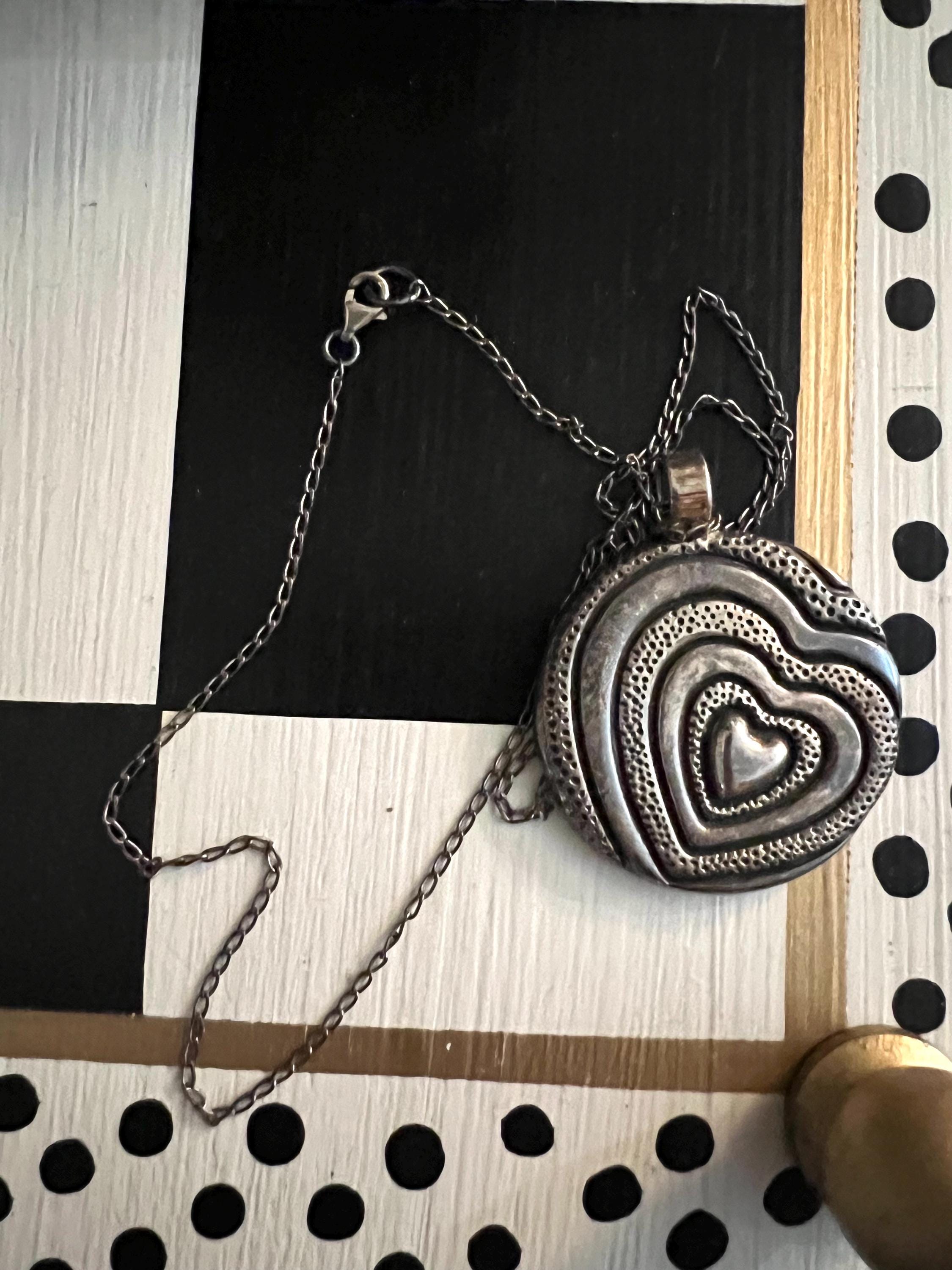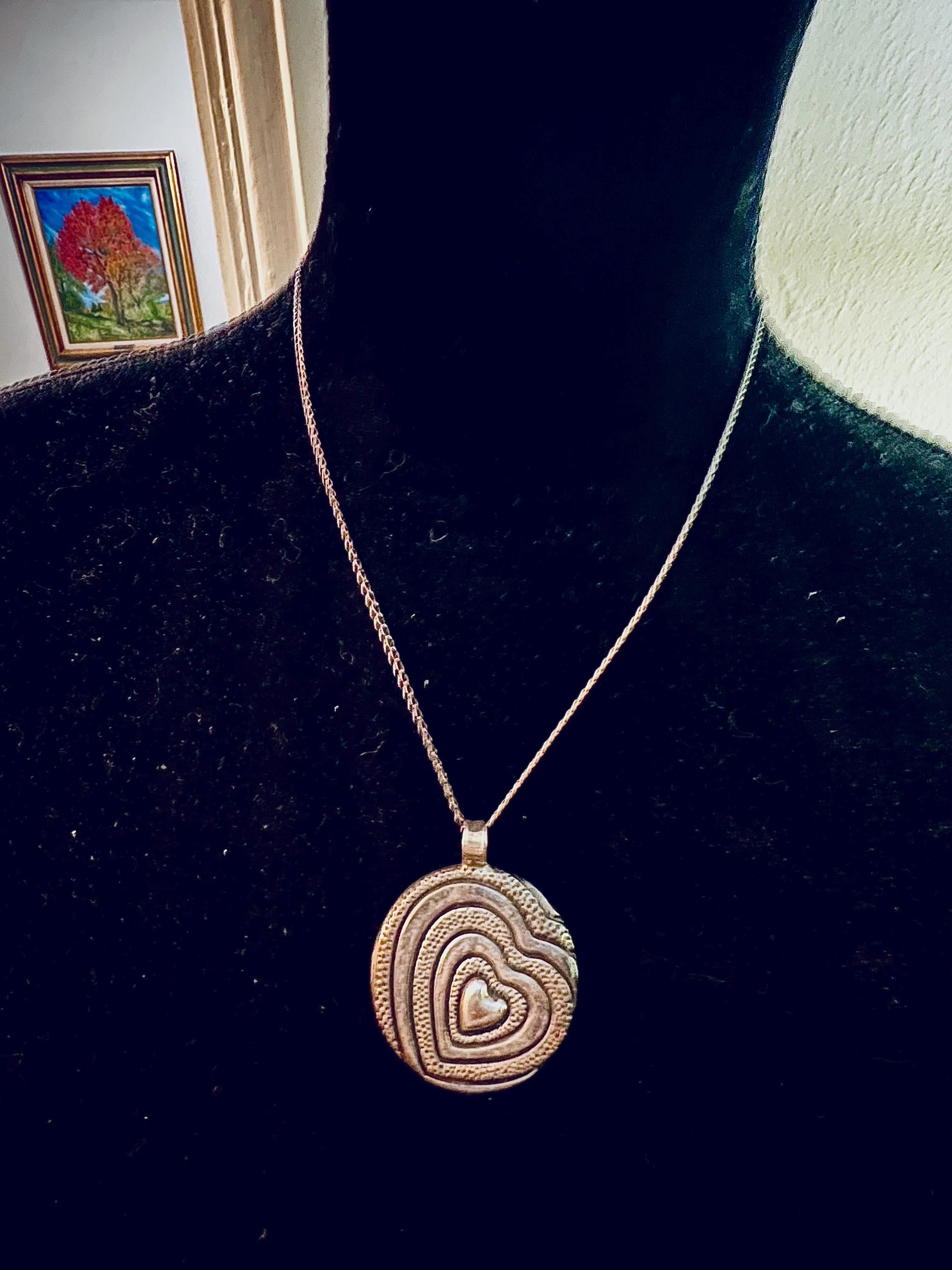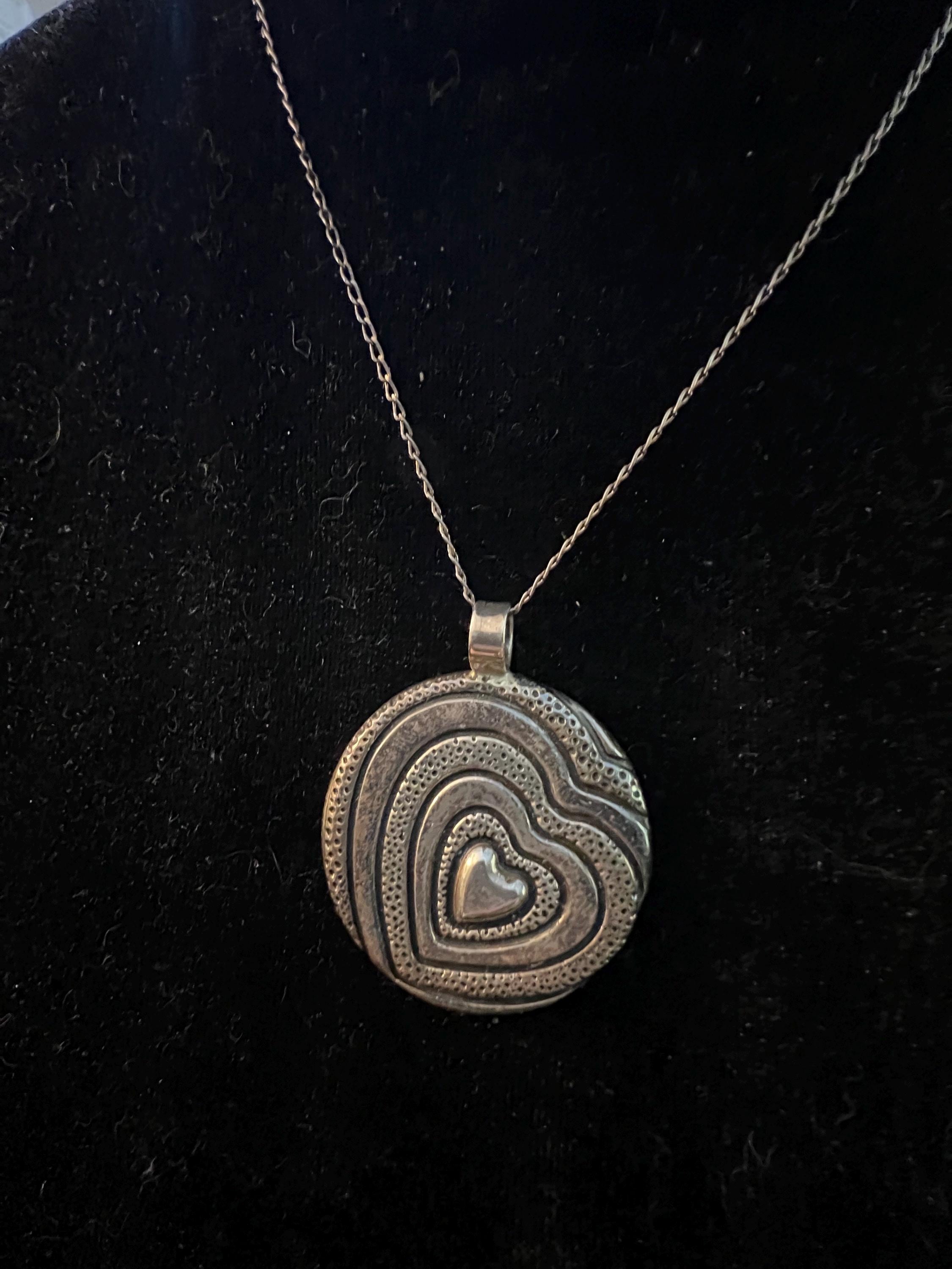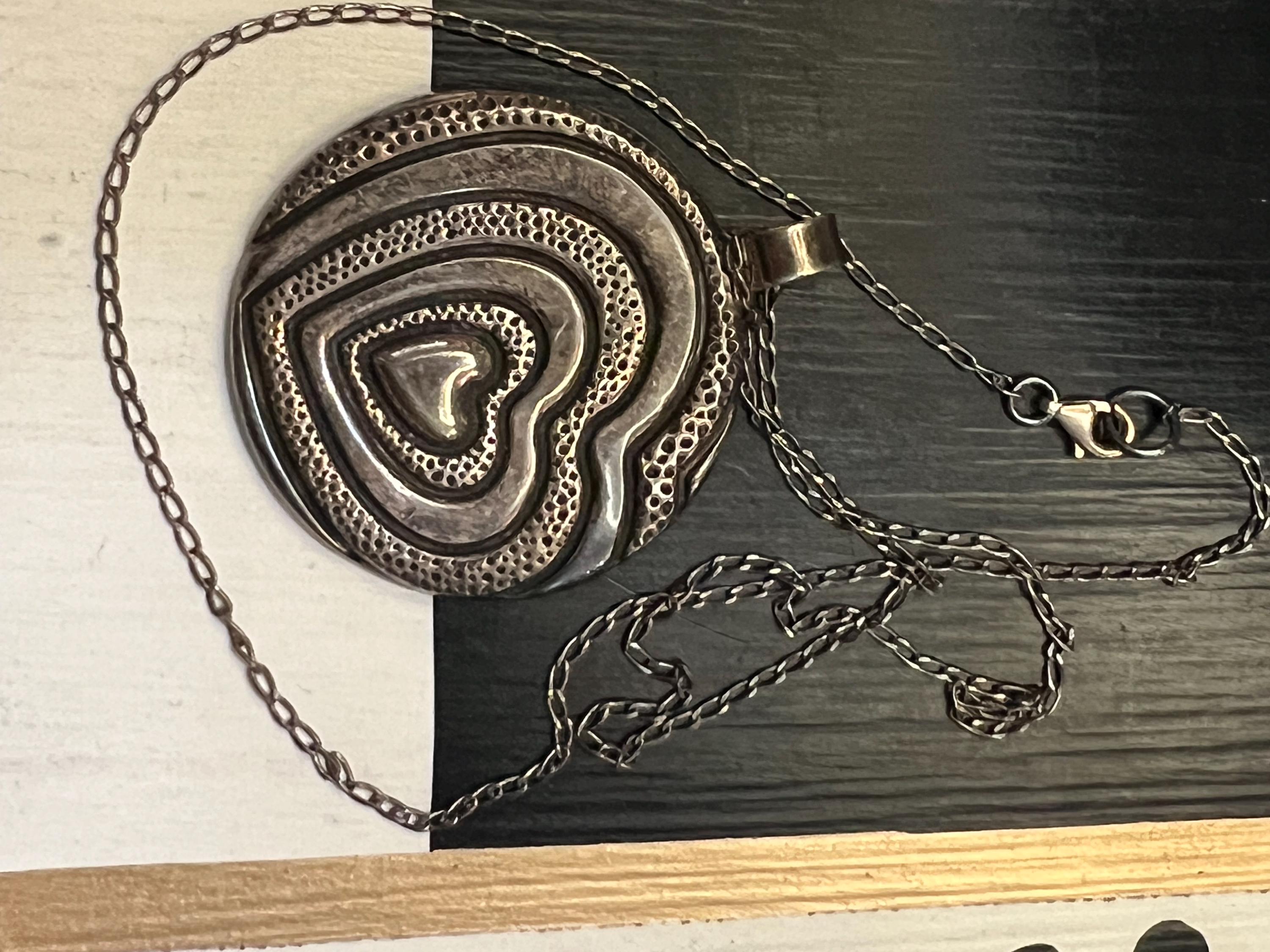 Highly Sought Trending Vintage 925 Mexico Silver Artisan Pressed Metal Groovy Modernist Heart Puffy Disk Necklace
