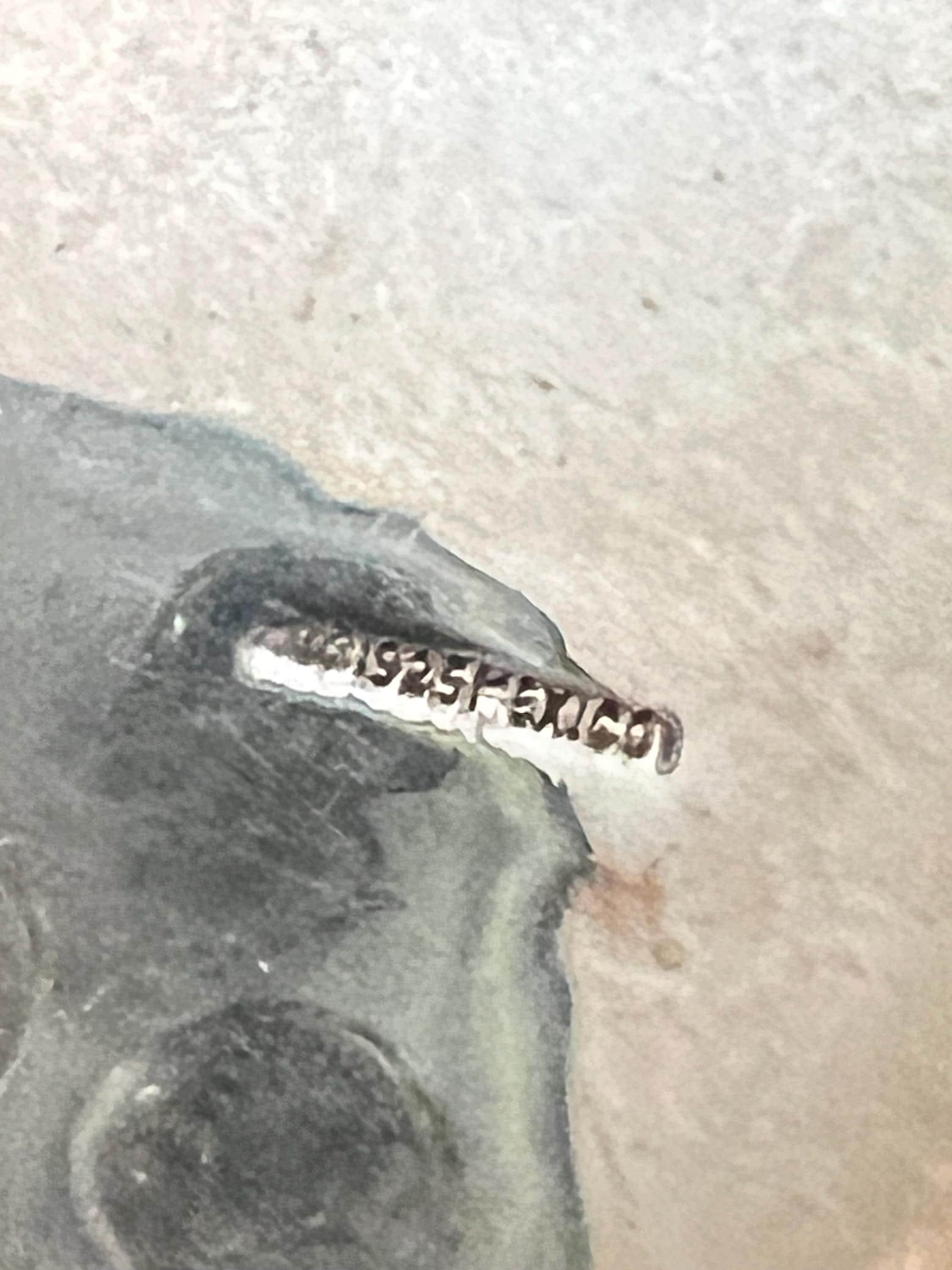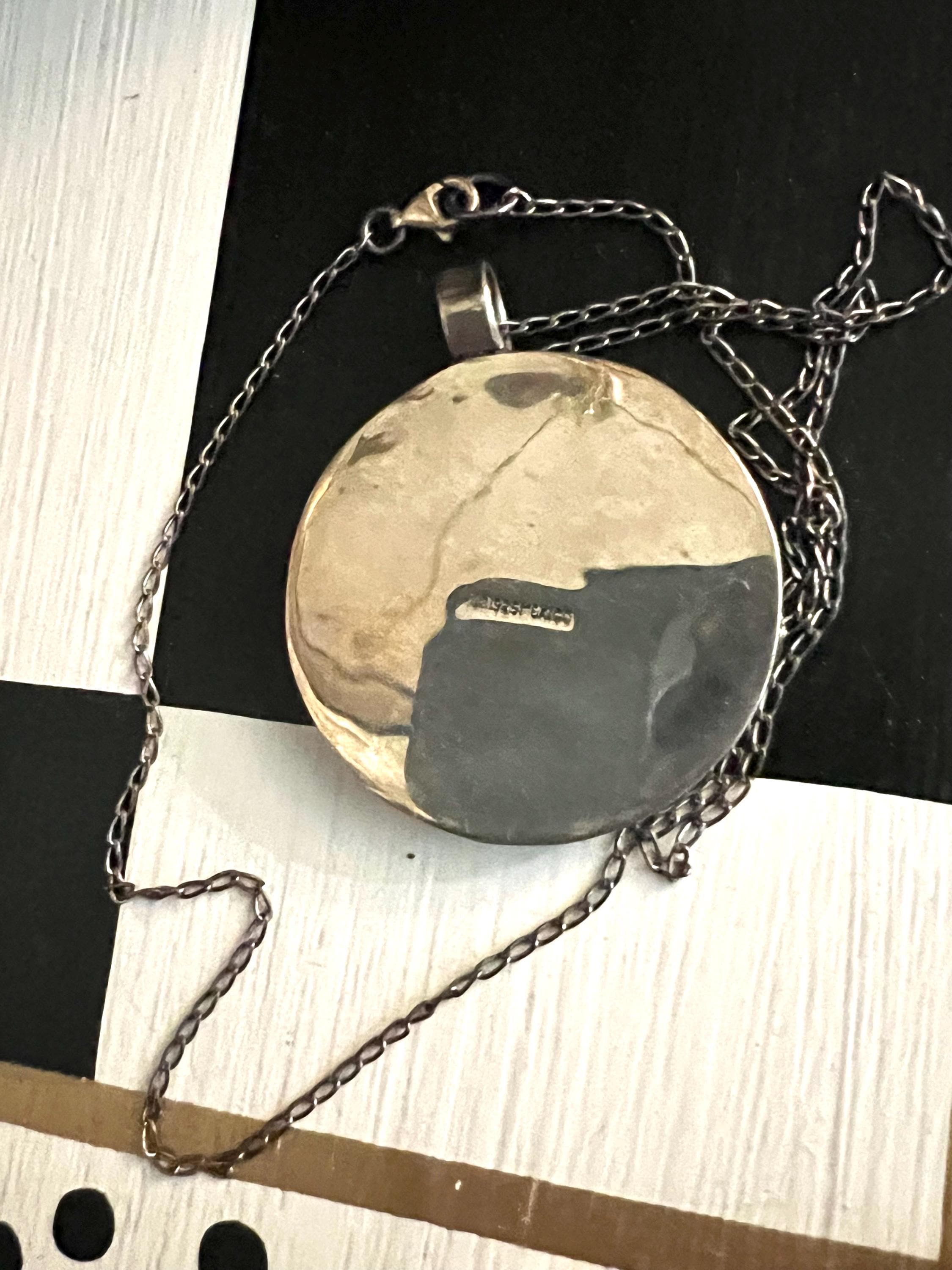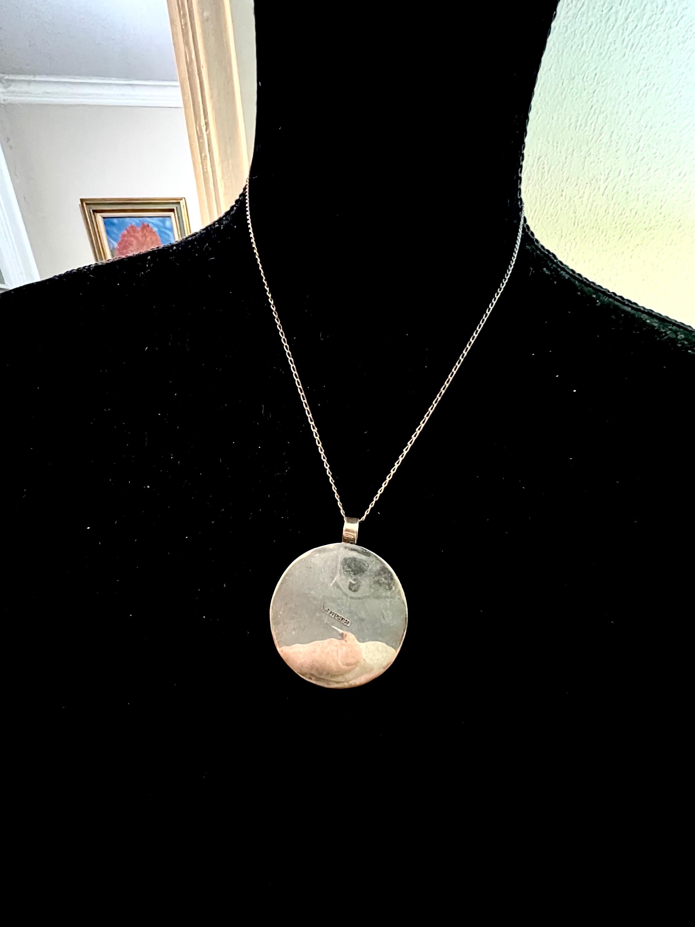 Recently collectors have started collecting Mexico Silver Jewelry more than ever - its popularity has soared and many regions and makers and artists have started to command higher prices and are making for such interesting searching for finds & fun researching and learning about a even the different silver mixes used in some areas…I am having trouble decerning the mark ahead of 925 on this delightful piece’s stamp. I think it is most likely the eagle mark that was used for years to trademark sterling silver - but it could also be a region mark or brand or art house? In any event - this neat neat necklace is so 70s love ❤️ modernist graphic art a bit psychedelic and looks hand pressed or molded. I polished it some but left about half of the patina - as I think it’s part of its beauty. The silver is not pitting- you can decide if you want it patina free: ) The pendant is 1.5 round with a .25 inch bale and a 18 inch, also silver, chain with an early small lobster clasp (which confirmed 70s not 60s ). It’s a great necklace and would make a fantastic addition or start of a collection or a very sweet and meaningful unique gift for a special person ❤️