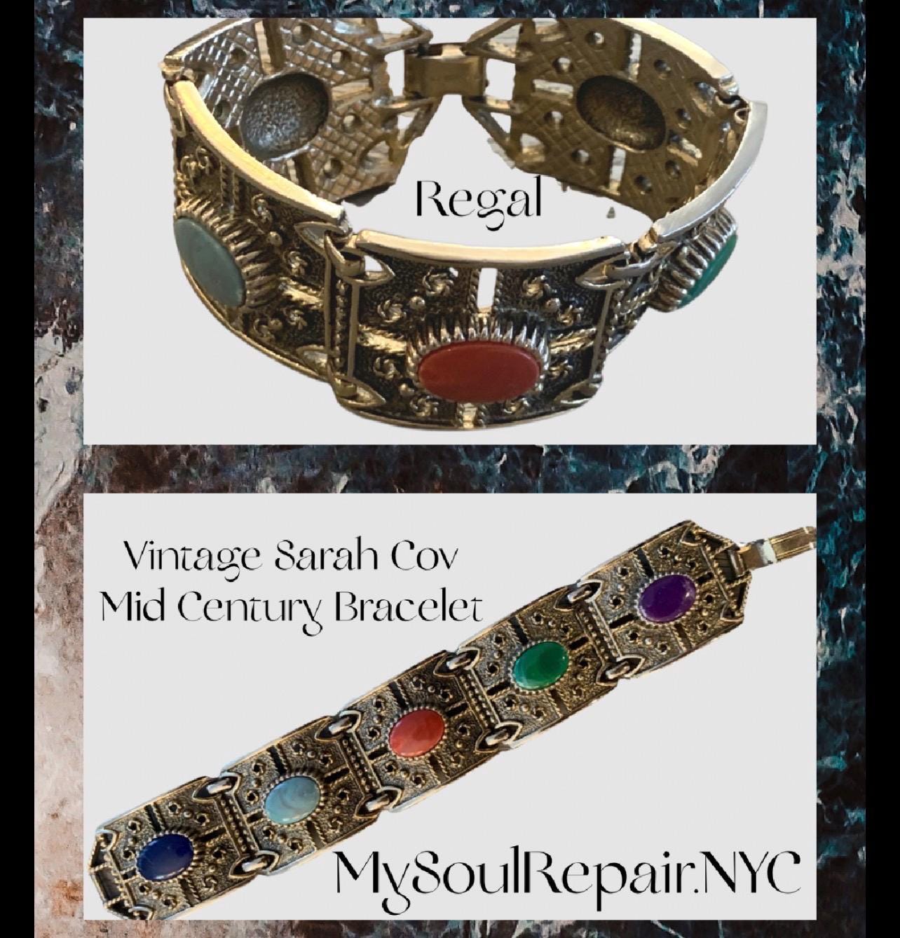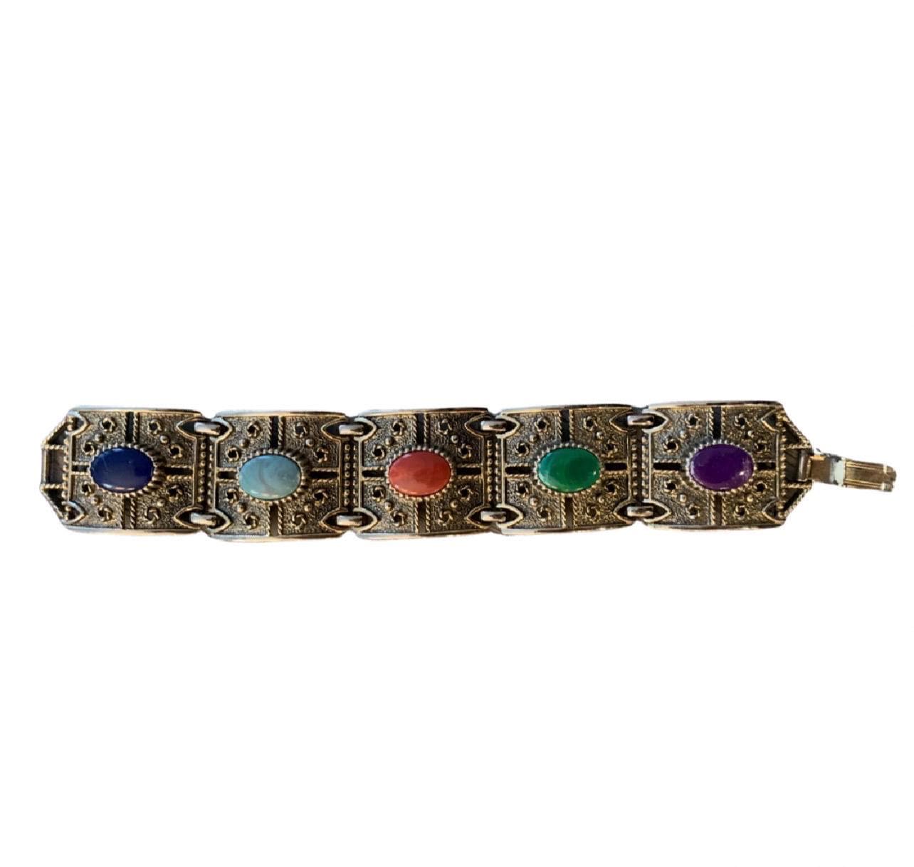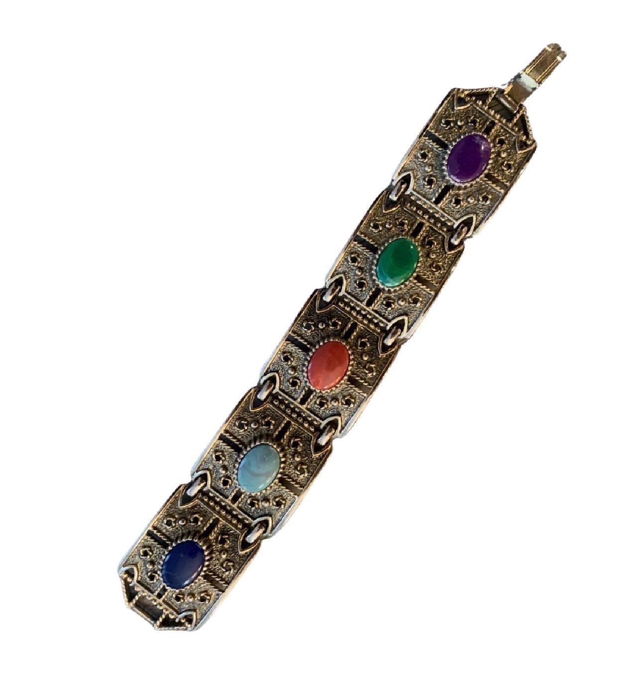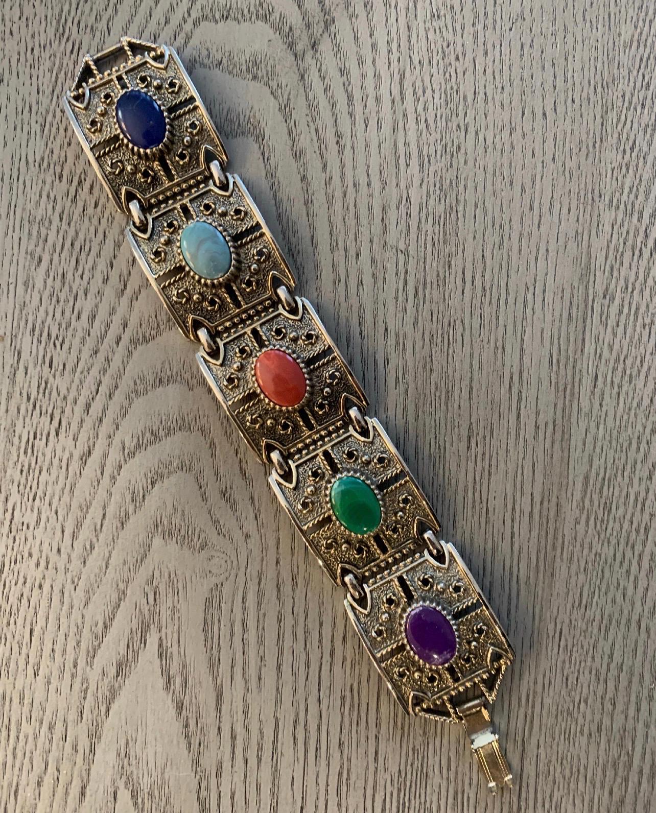 Gothic Regalia, Mid Century Sarah Cov Ornate Bracelet with Jewel tone Cabochons