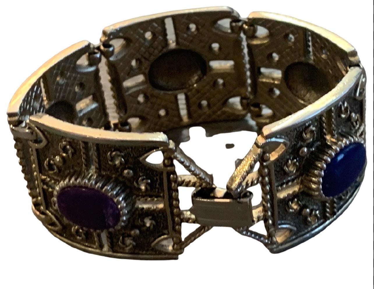 Elegant Antiqued Gold tone Links with Purple, Navy, Sky Blue, Jade and Burnt Orange Faux Gems - Regal Statement Bracelet. 60s-70s better costume jewelry