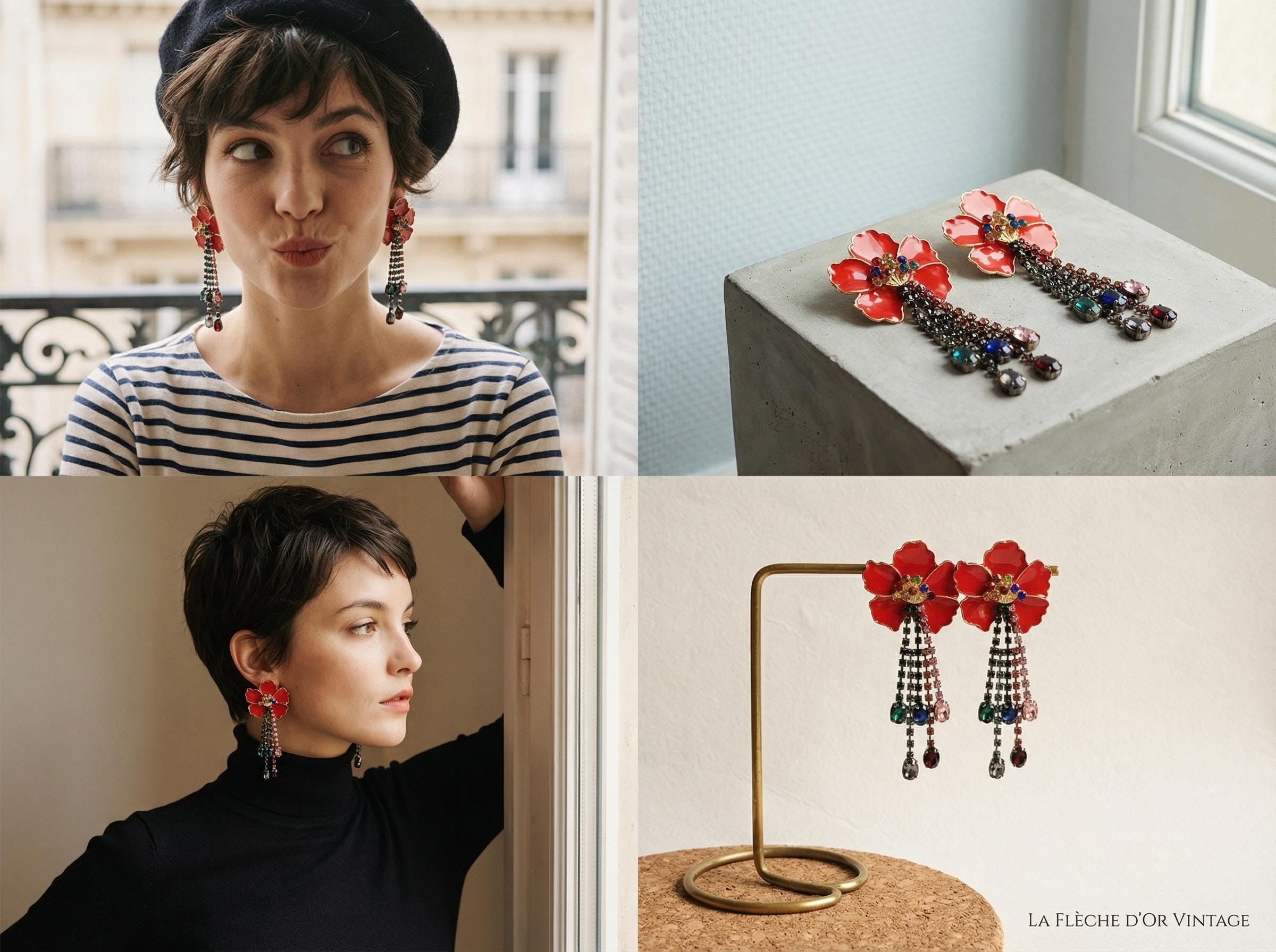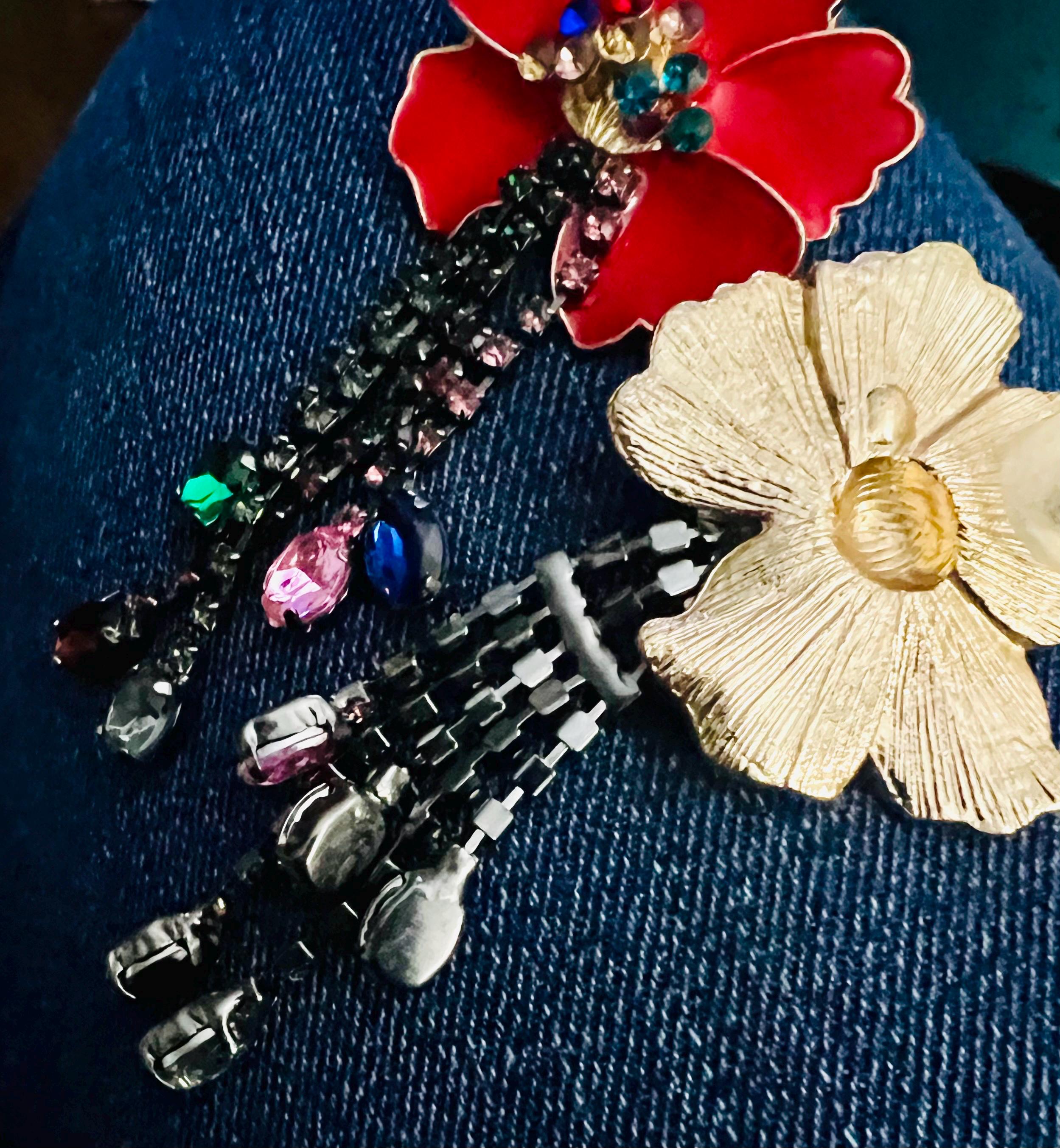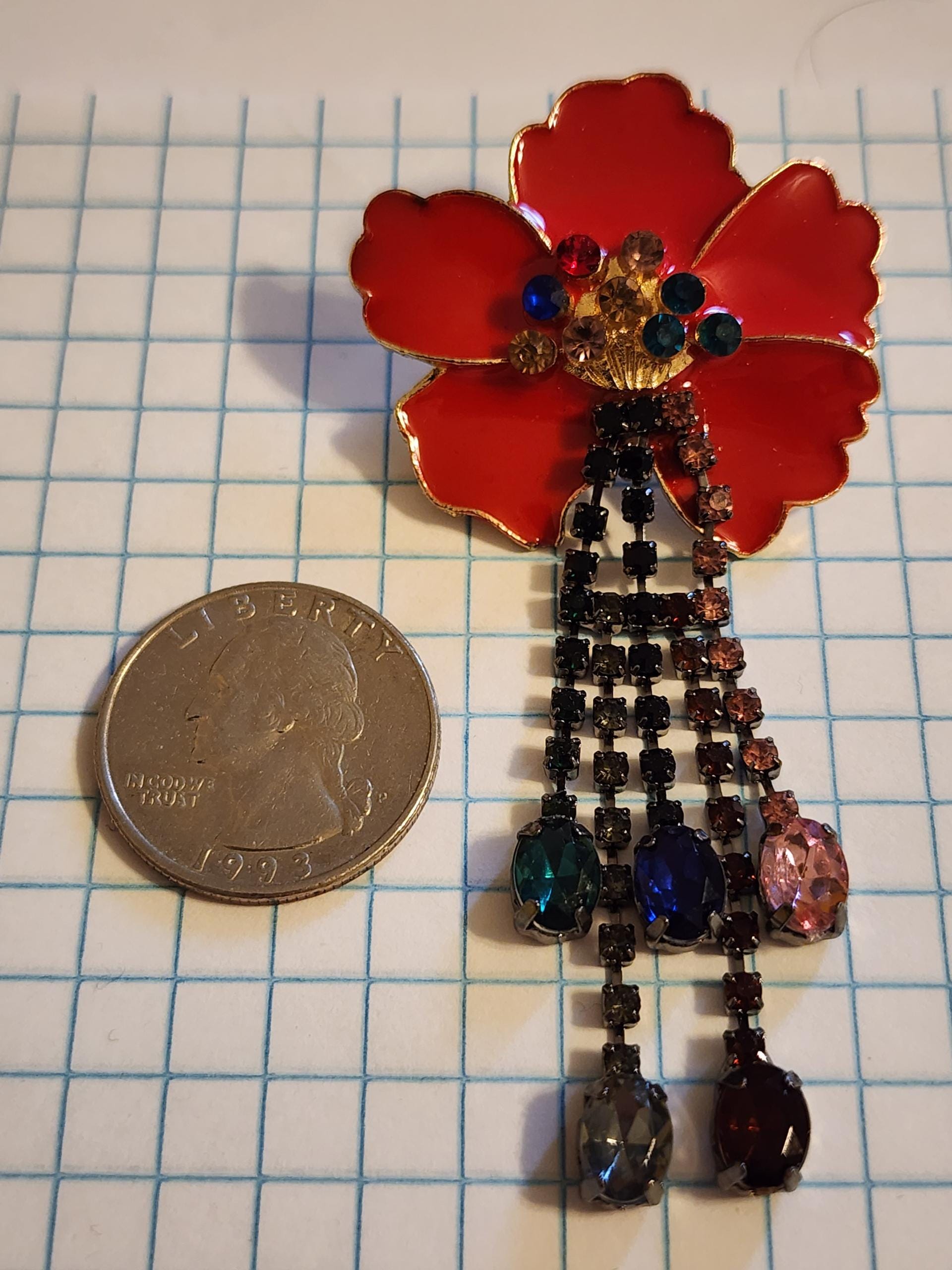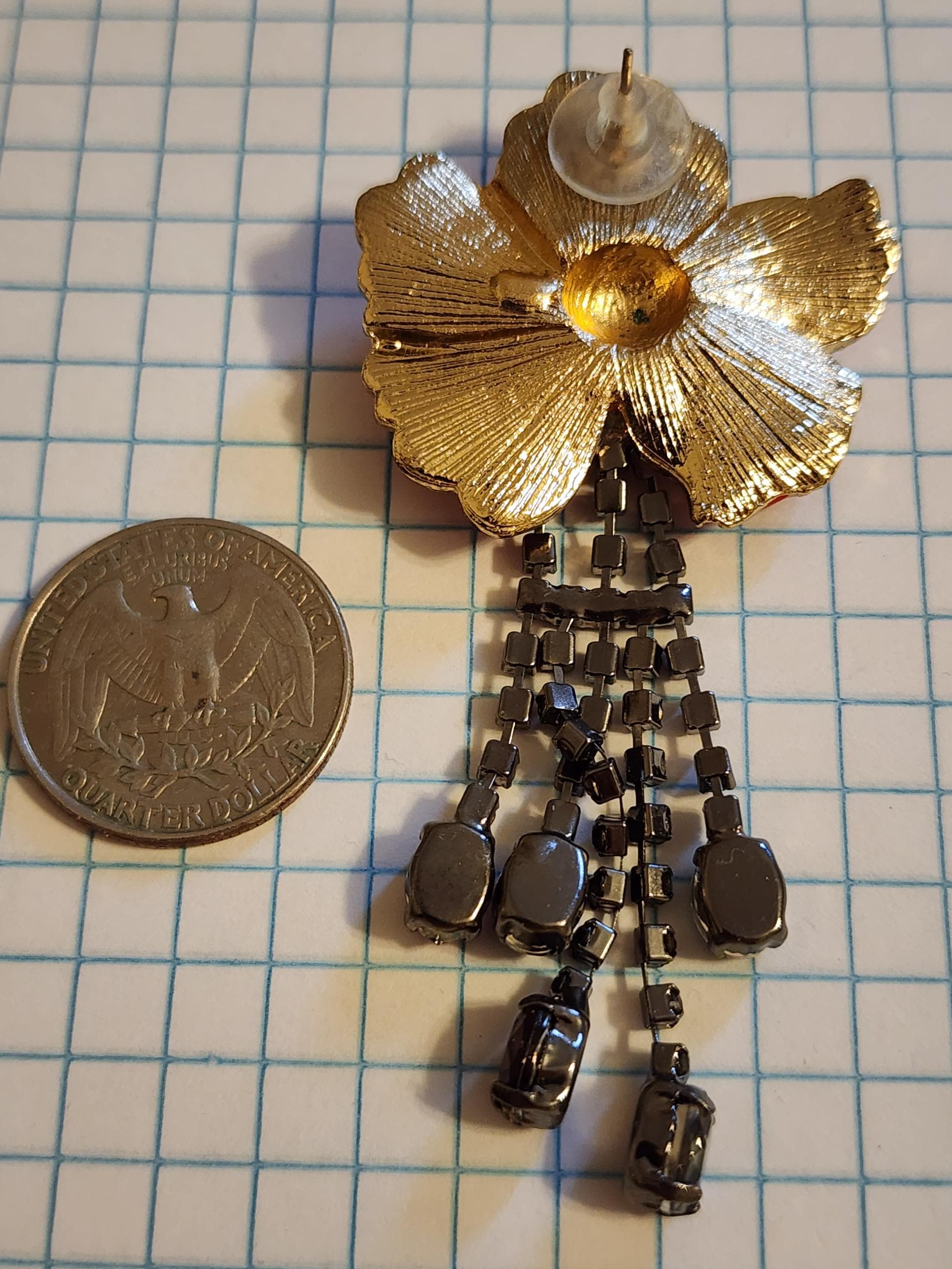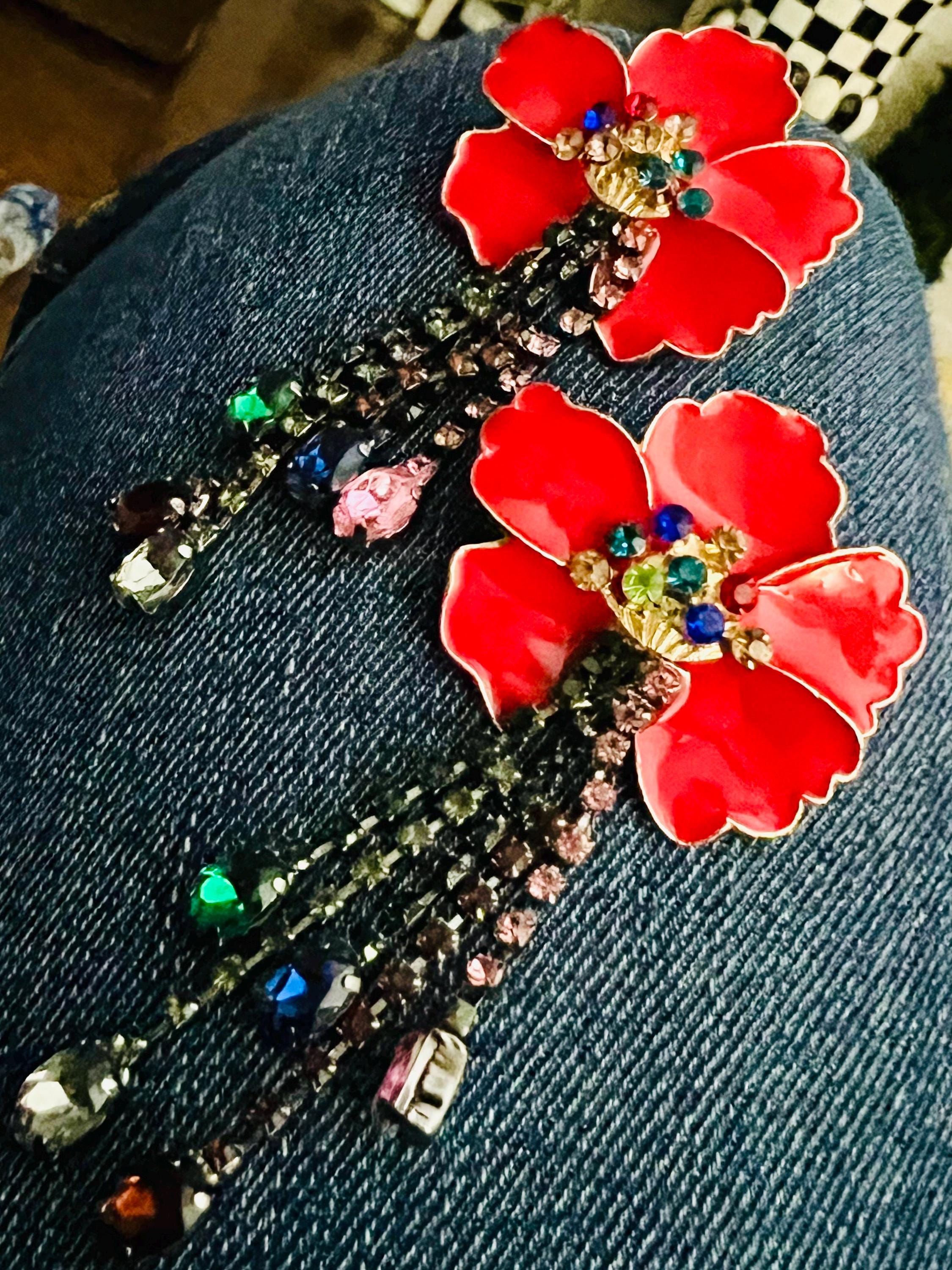 These beautiful pierced earrings are two toned with red enamel and colorful rhinestones. They are 3 1/4". Big strikingly pretty earrings! & Floral is such a Trending look right now!