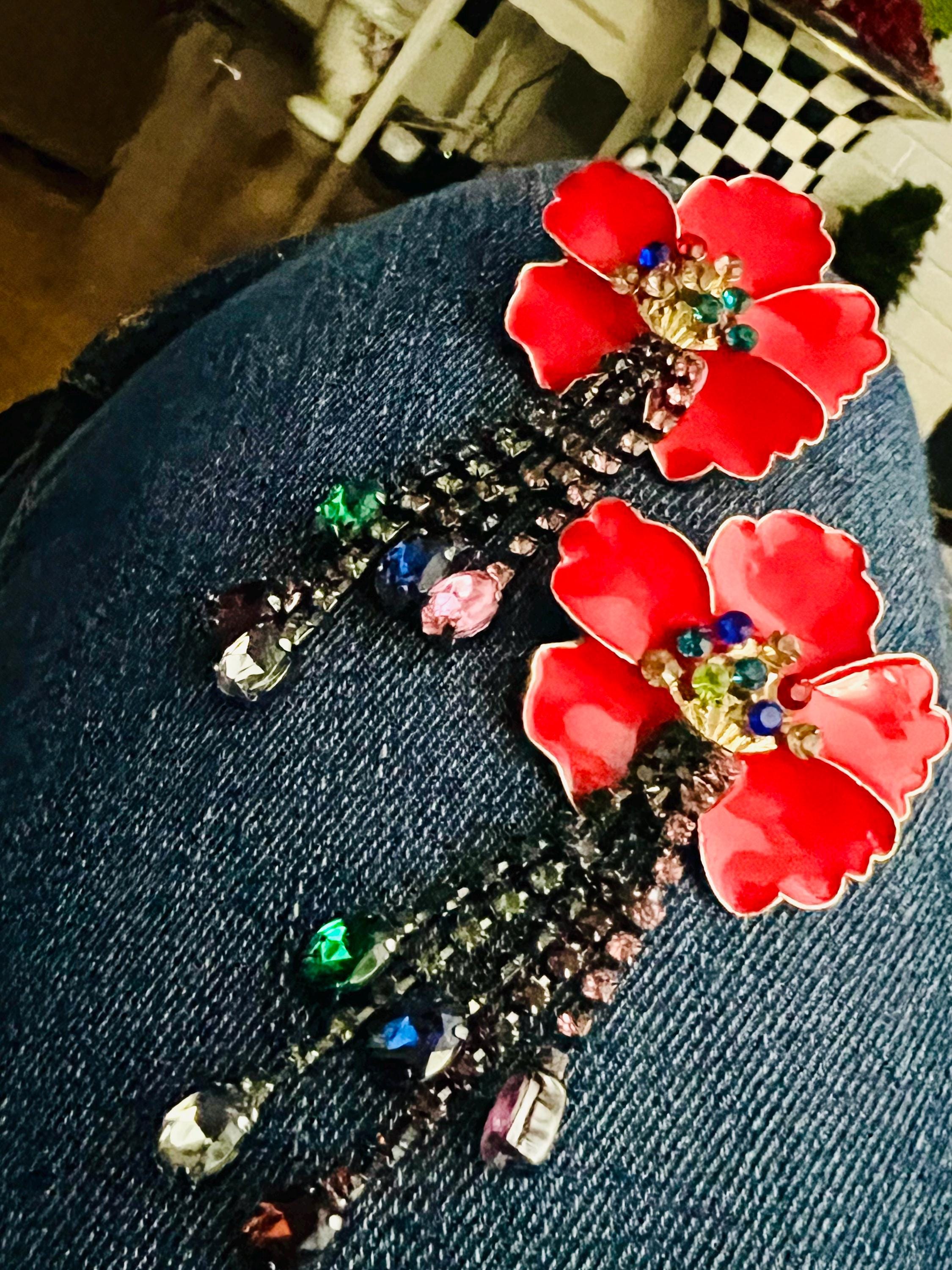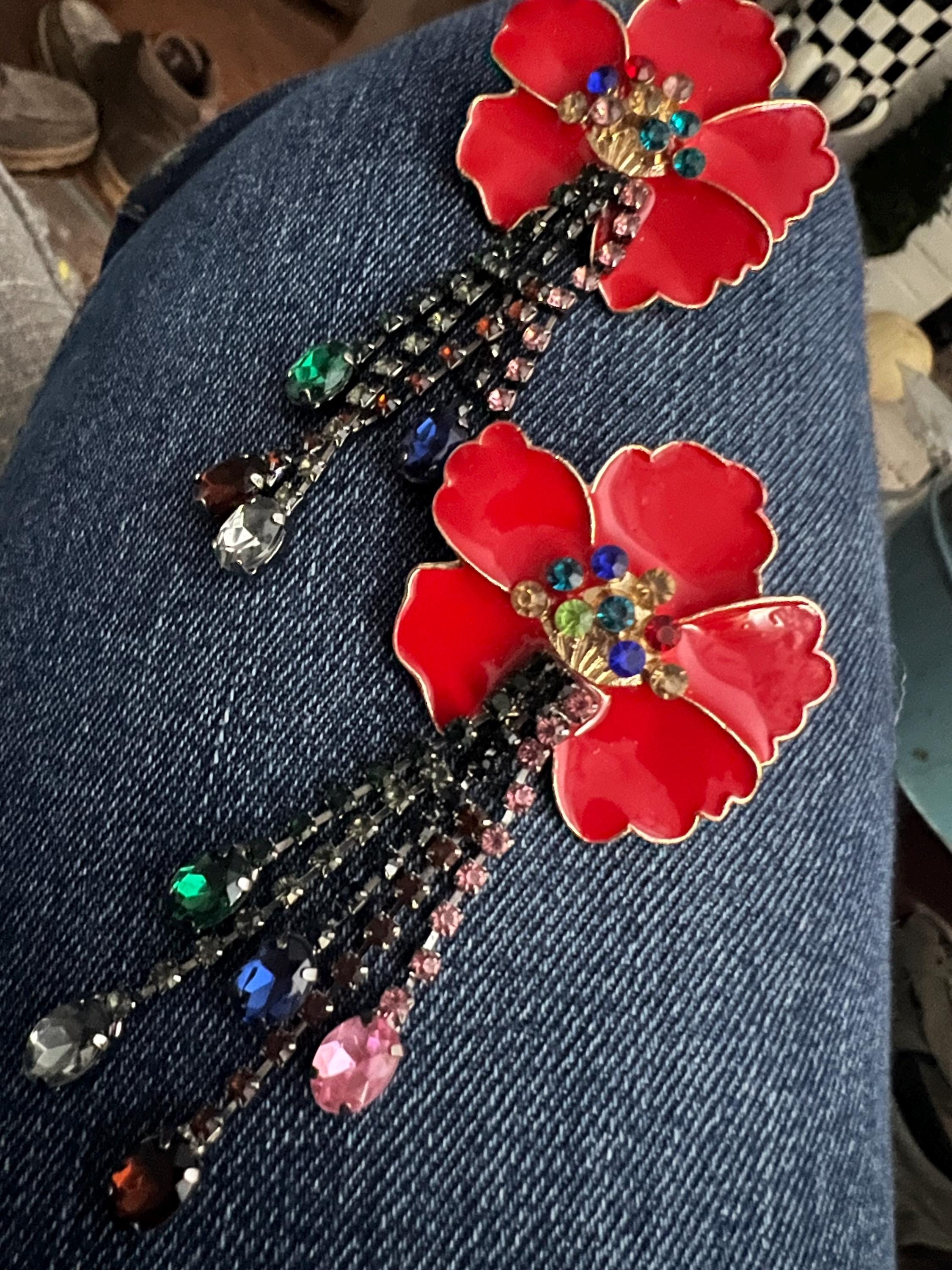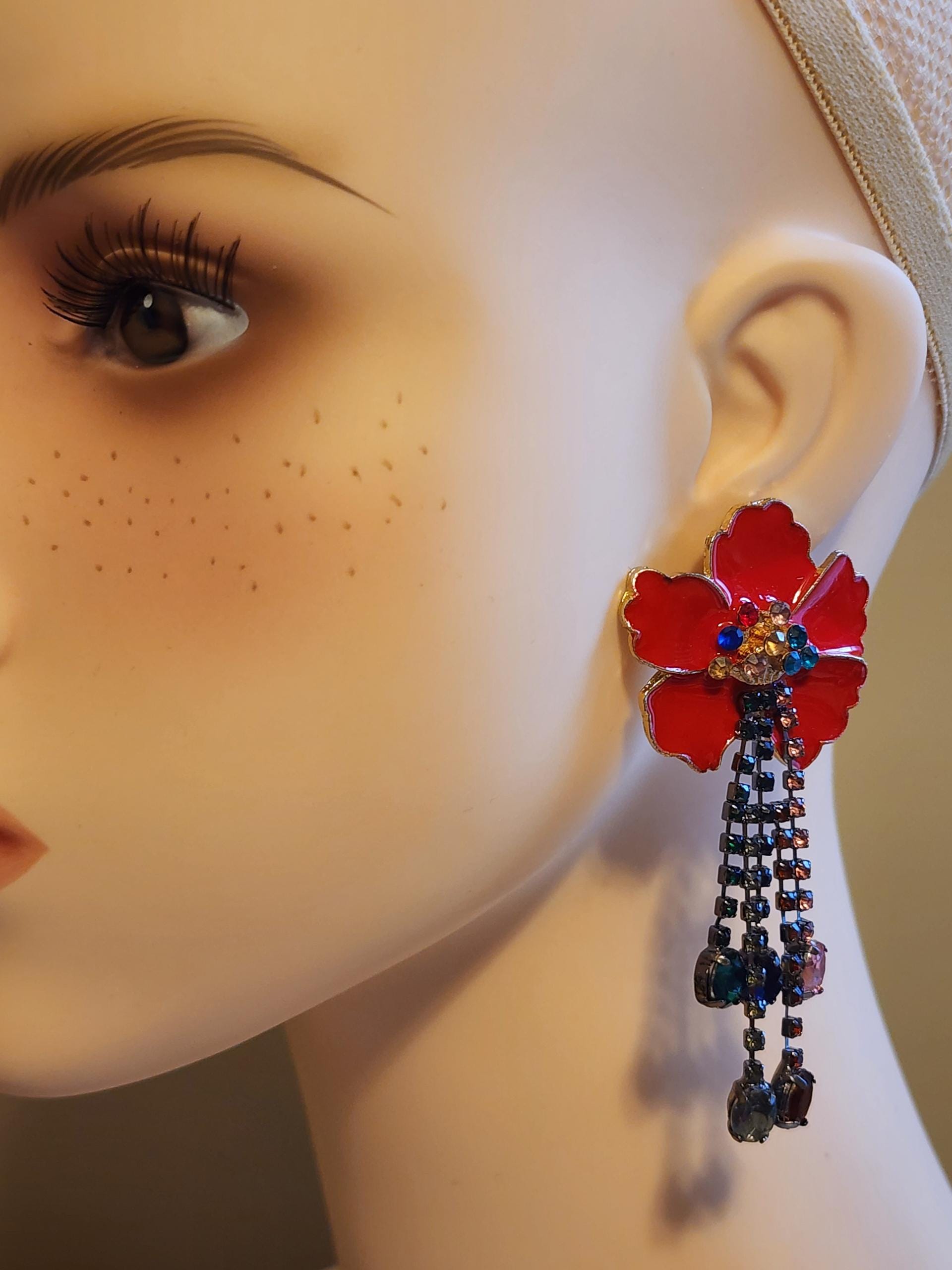 Beautiful Red Enamel Flower Statement Earrings and in True Y2K style they have colorful Rainbow Gem Tassels making them Show stopper Runway Glamour Jewelry for any stand out occasion!