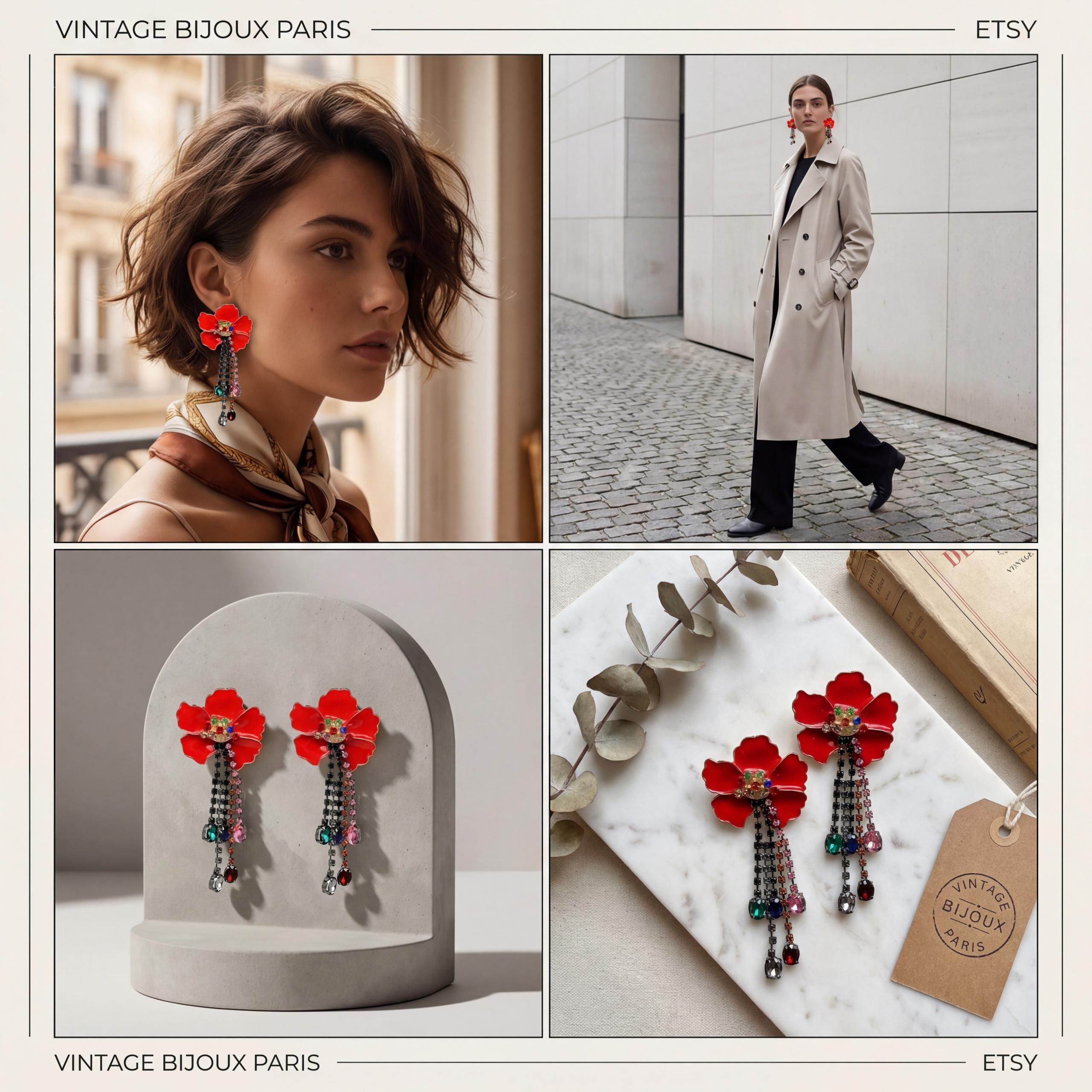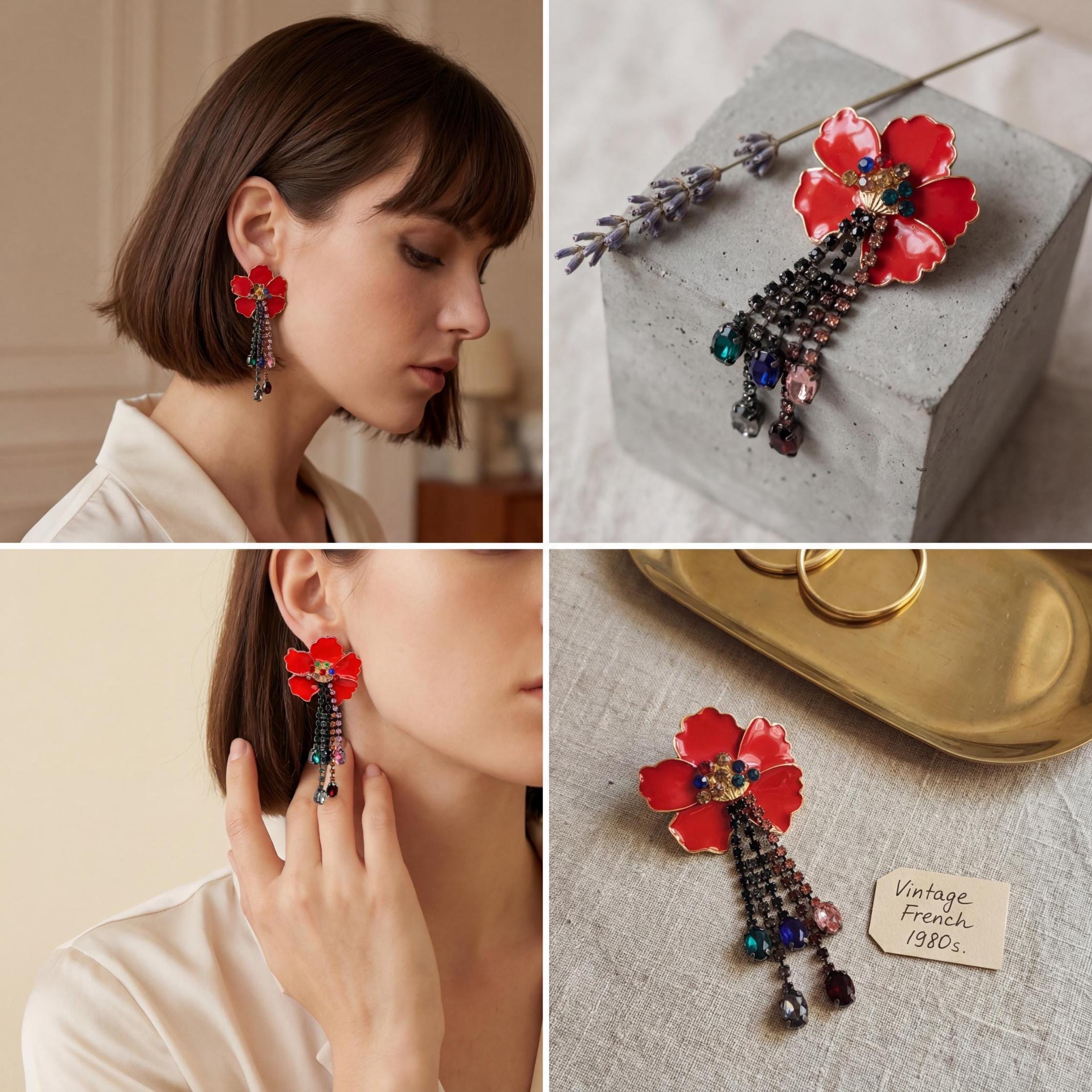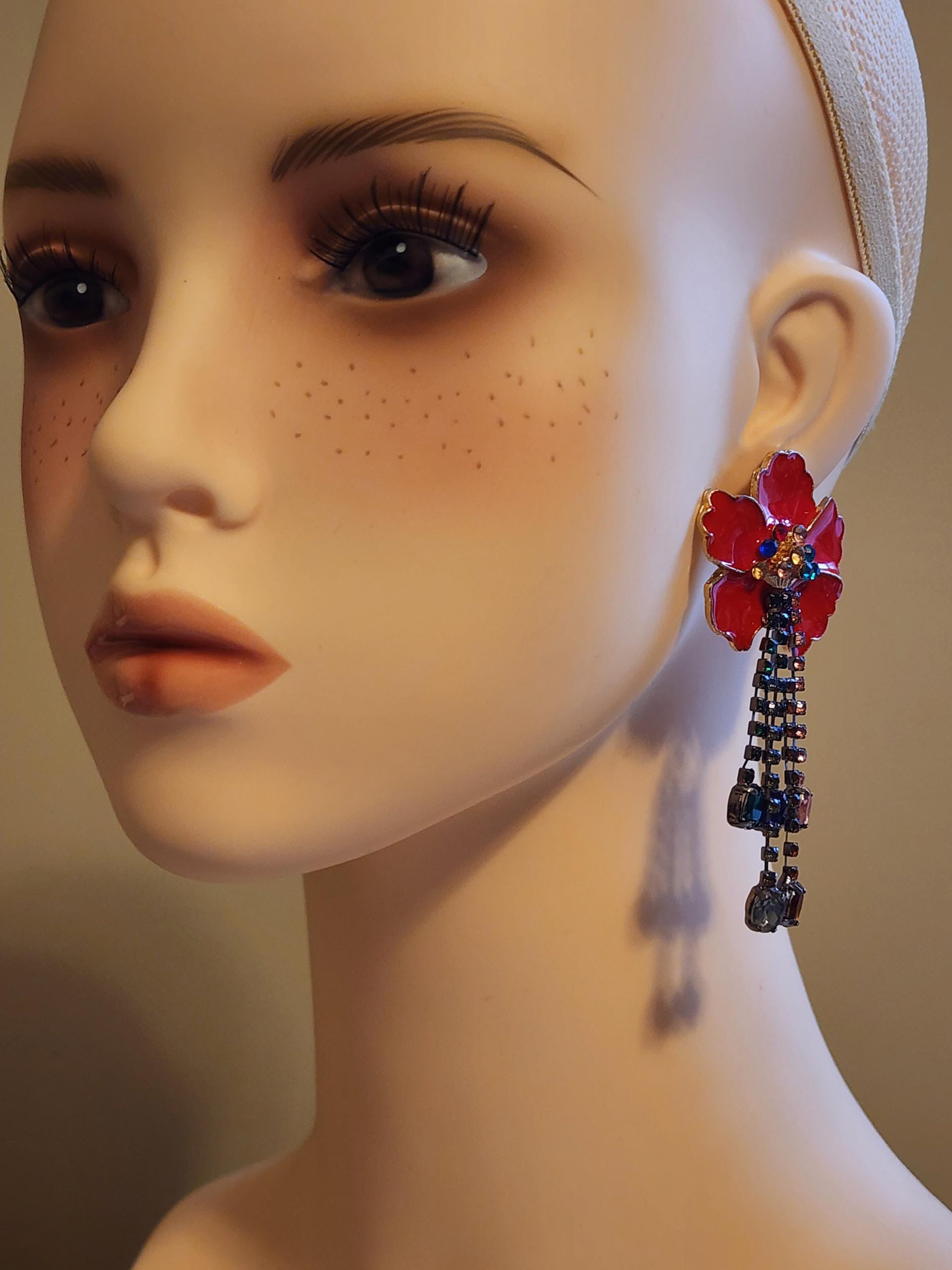 Beautiful Red Enamel Flower Statement Earrings and in True Y2K style they have colorful Rainbow Gem Tassels making them Show stopper Runway Glamour Jewelry for any stand out occasion!