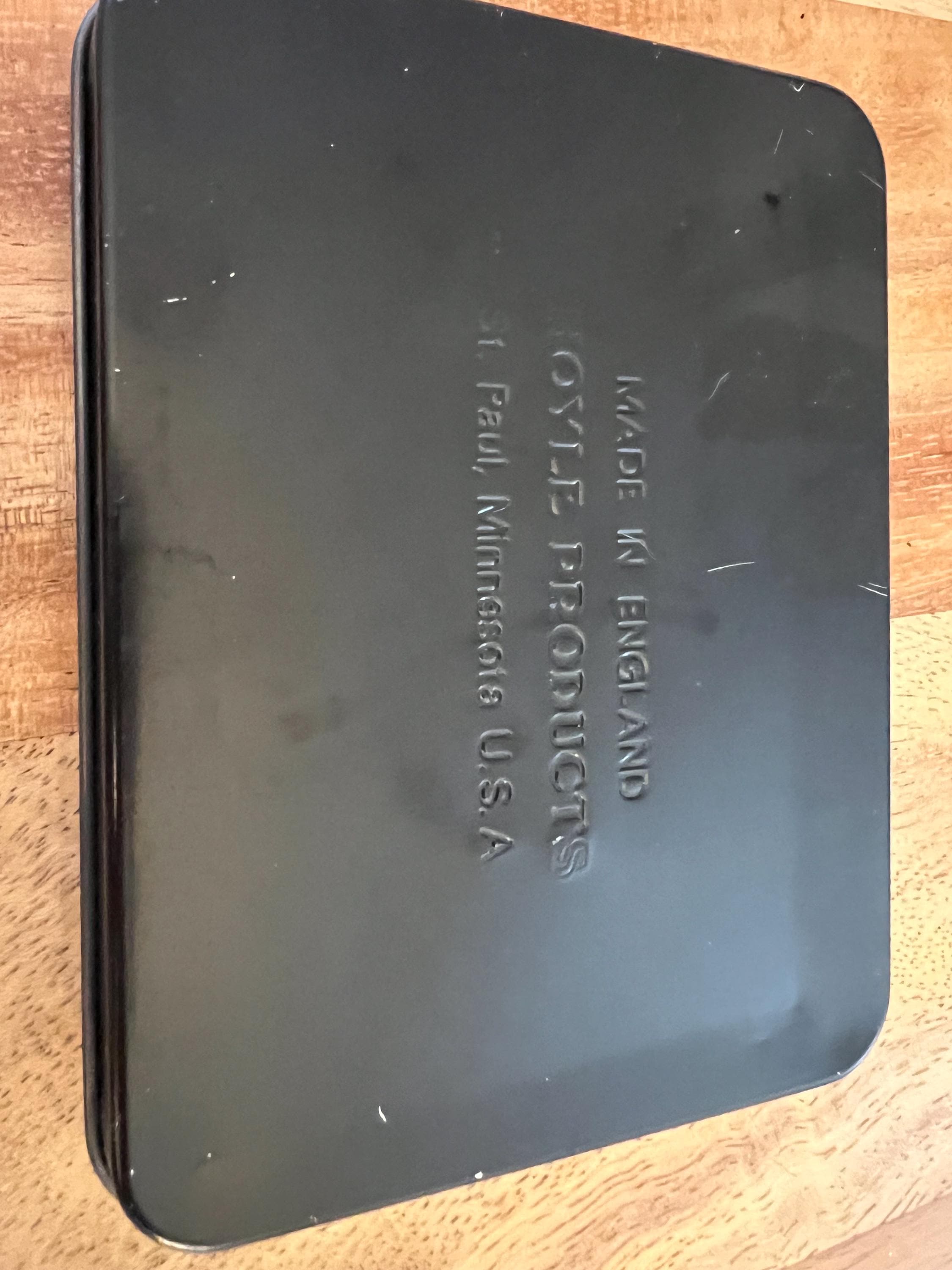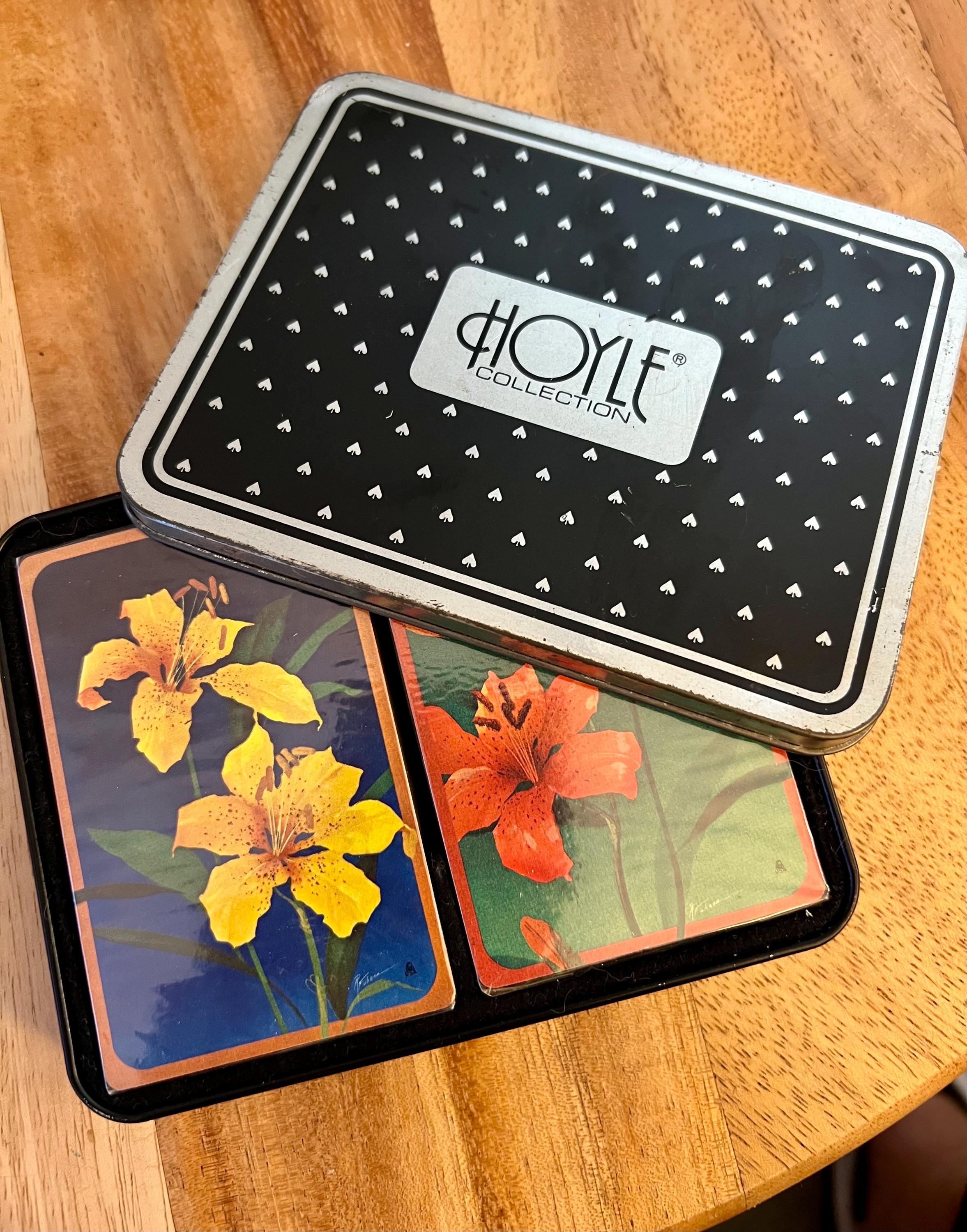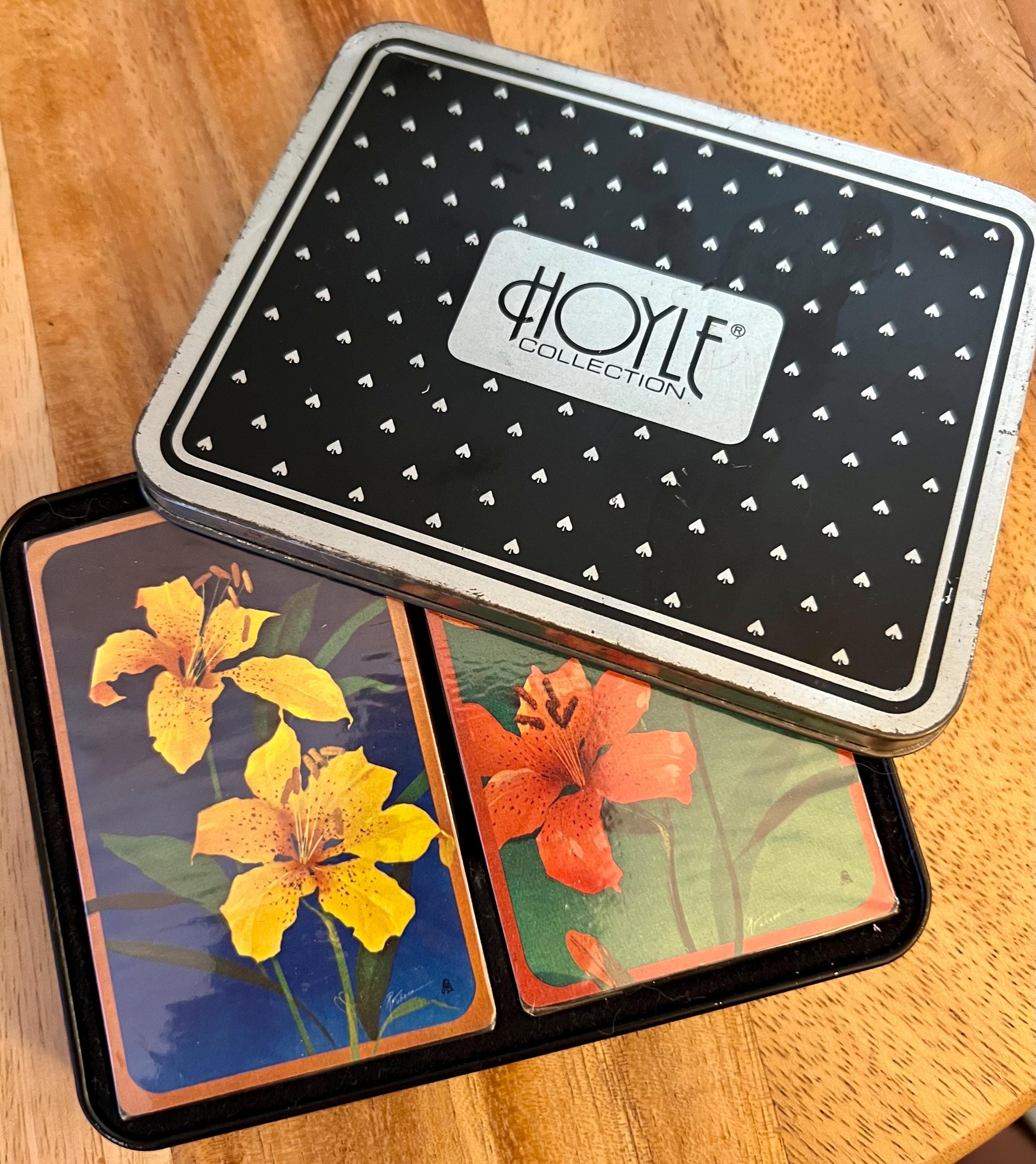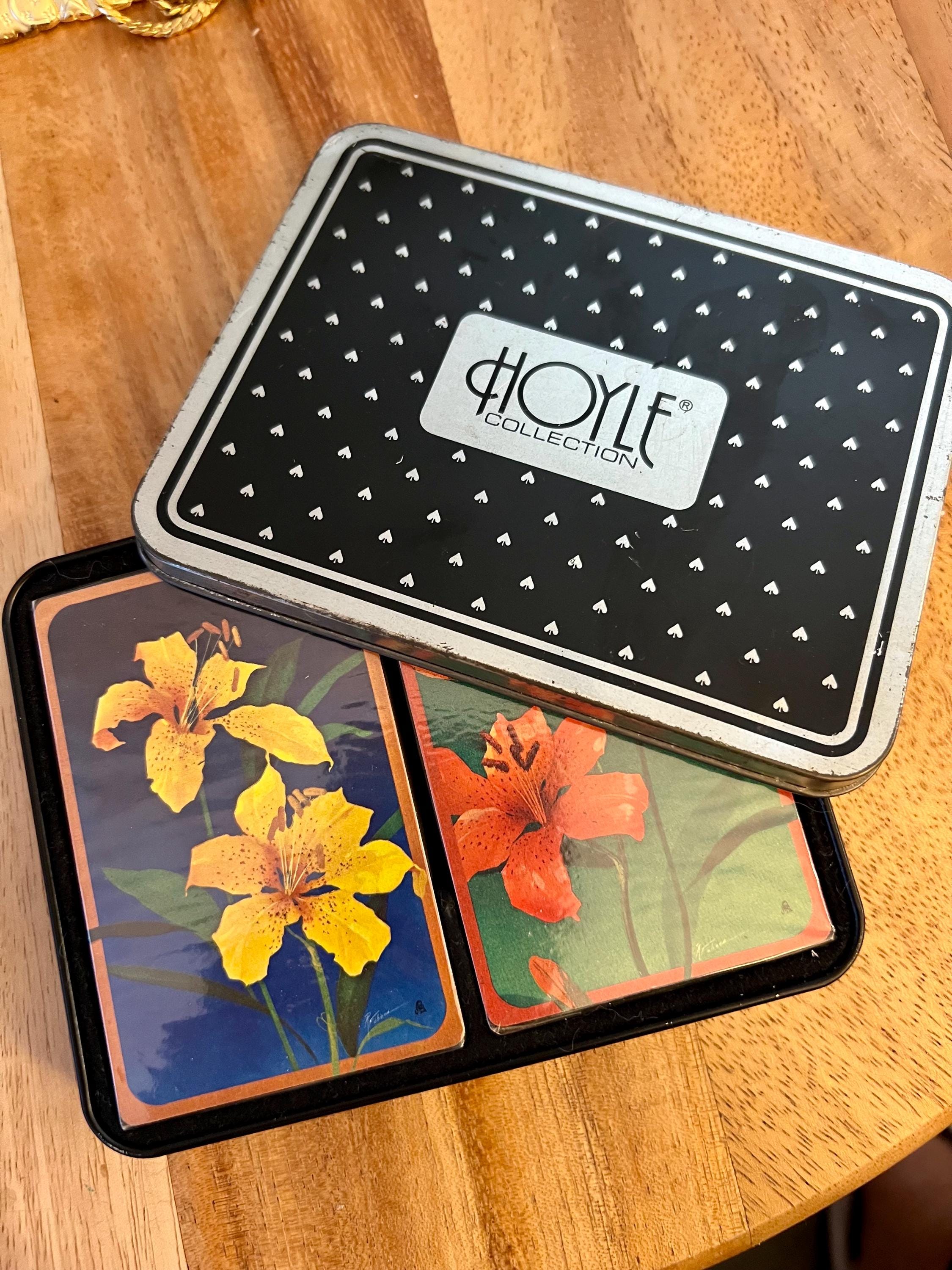 Standard size cards. See photos for minimal wear to tin. I will polish and tissue wrap nicely for gifting ready.