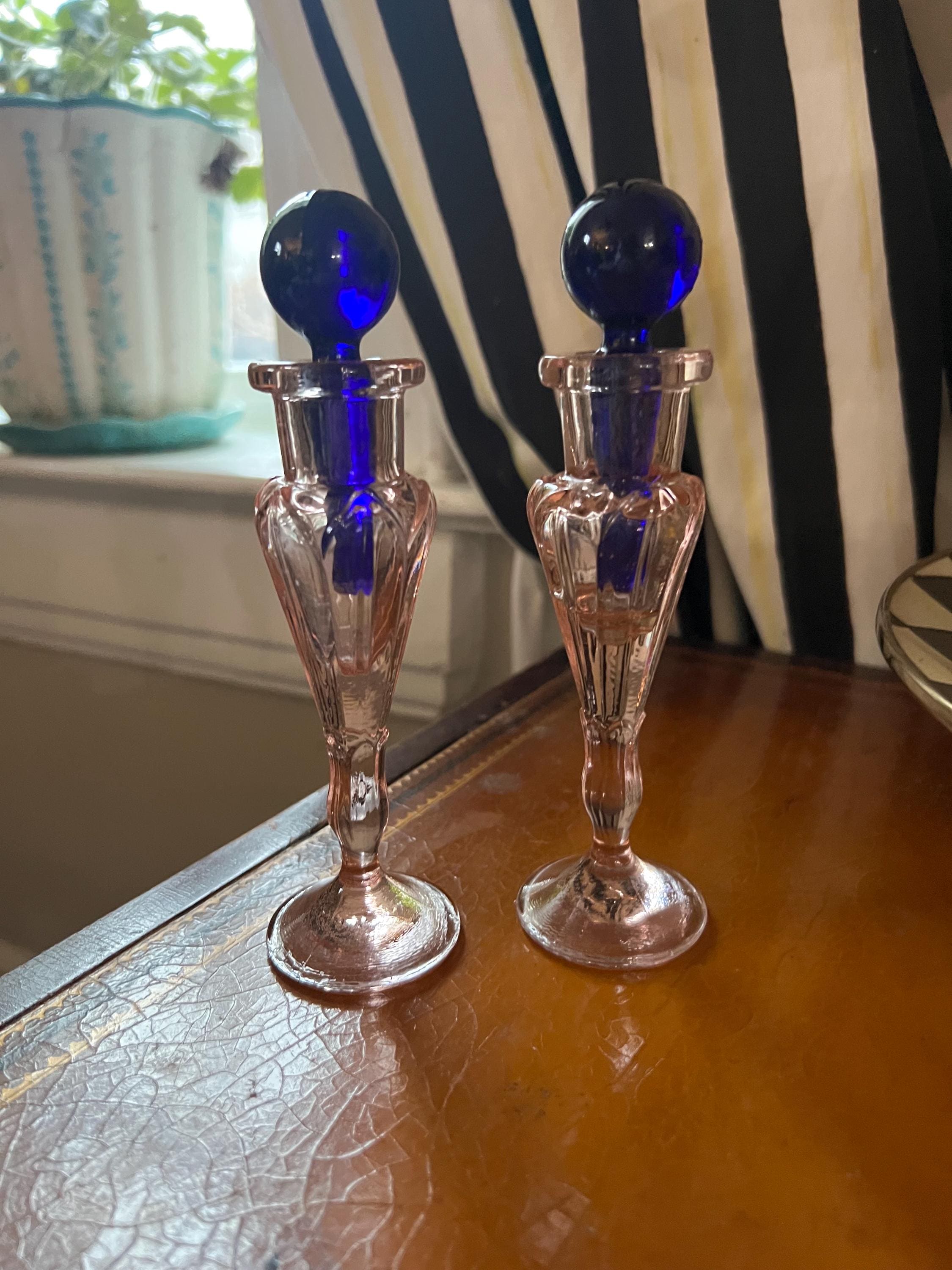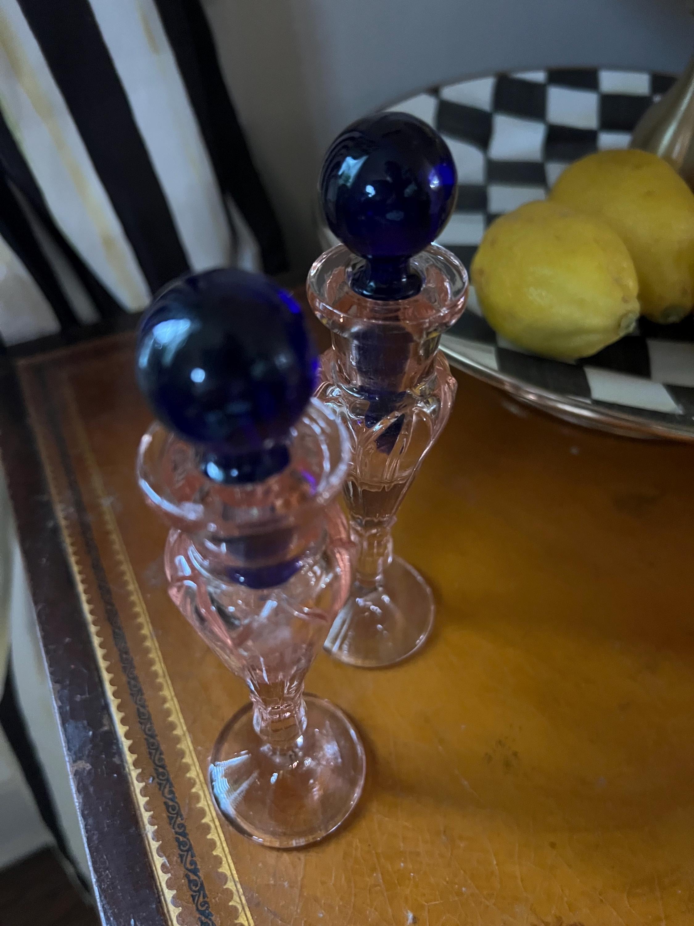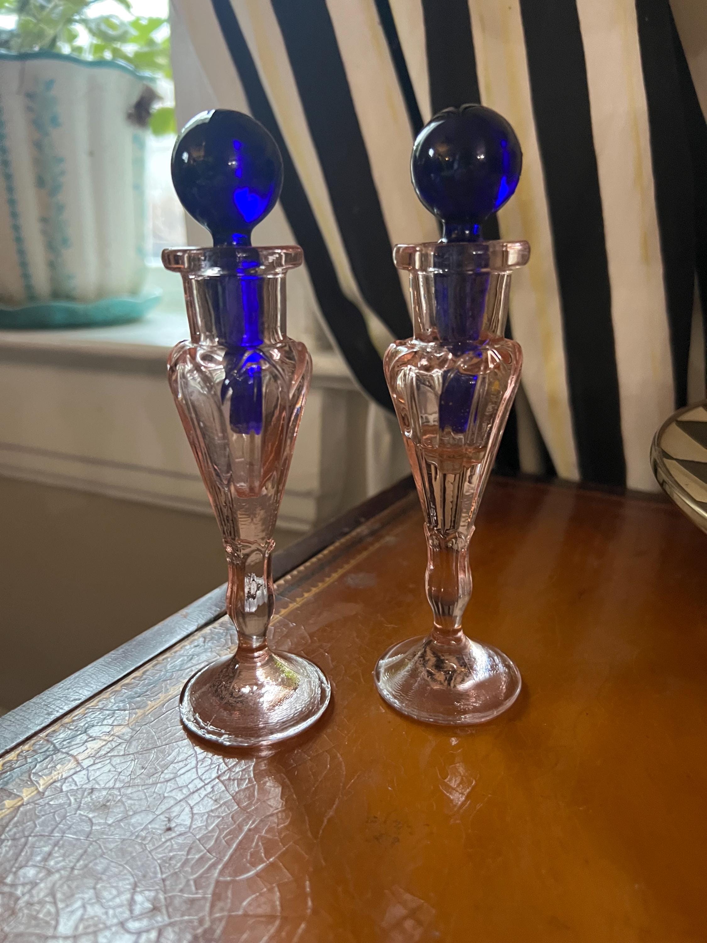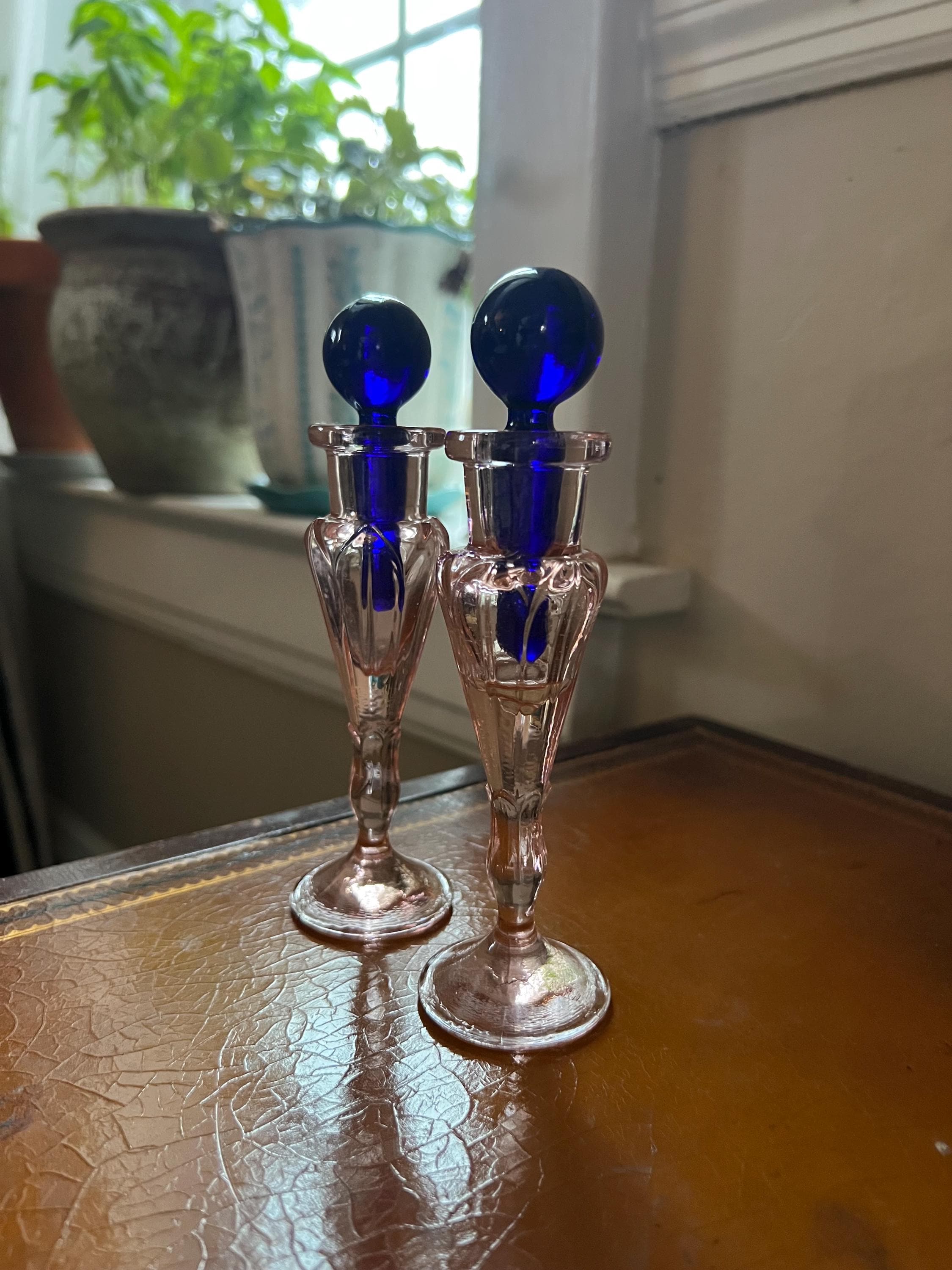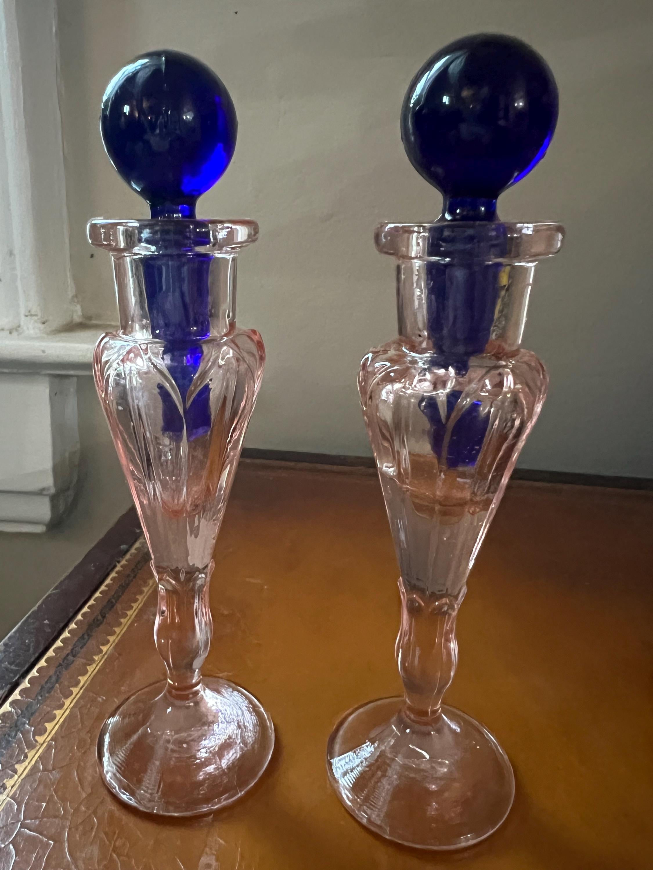 Pair of Vintage Pink Glass Vanity Bottles | Cobalt Blue Ball Stoppers | Depression Era Decor | Elegant Mid-Century Perfume Decanters