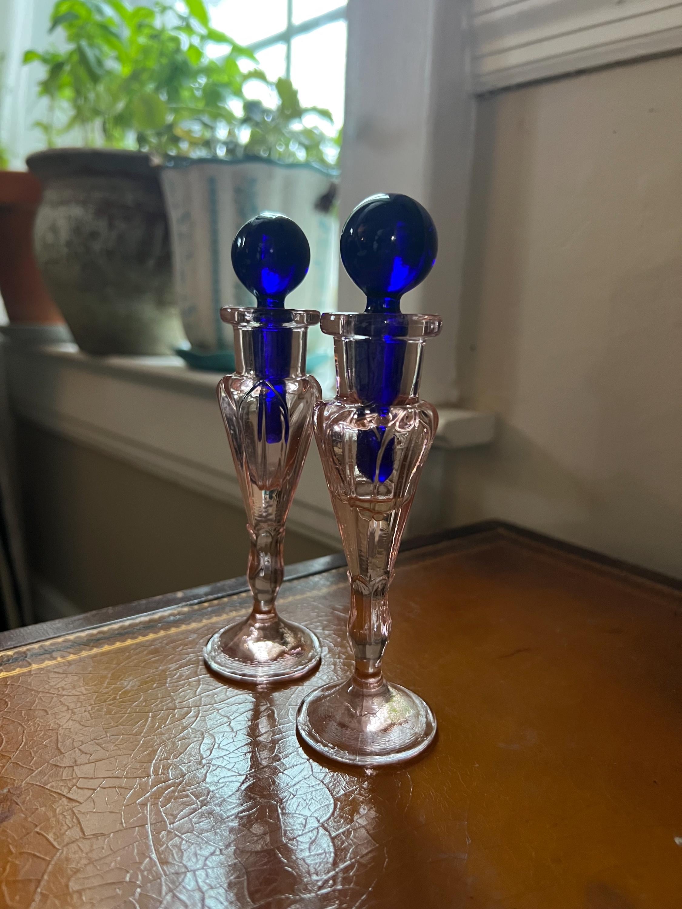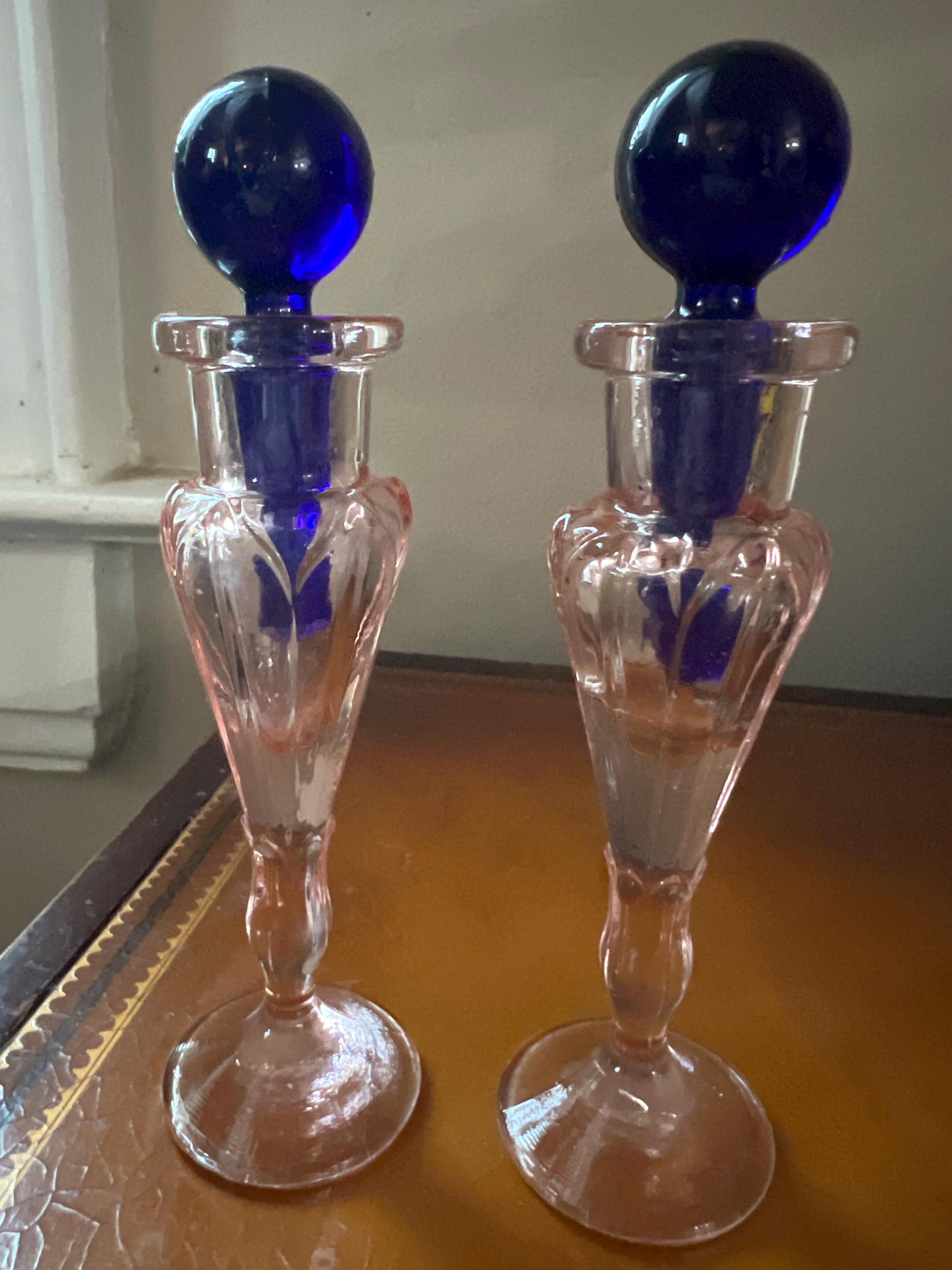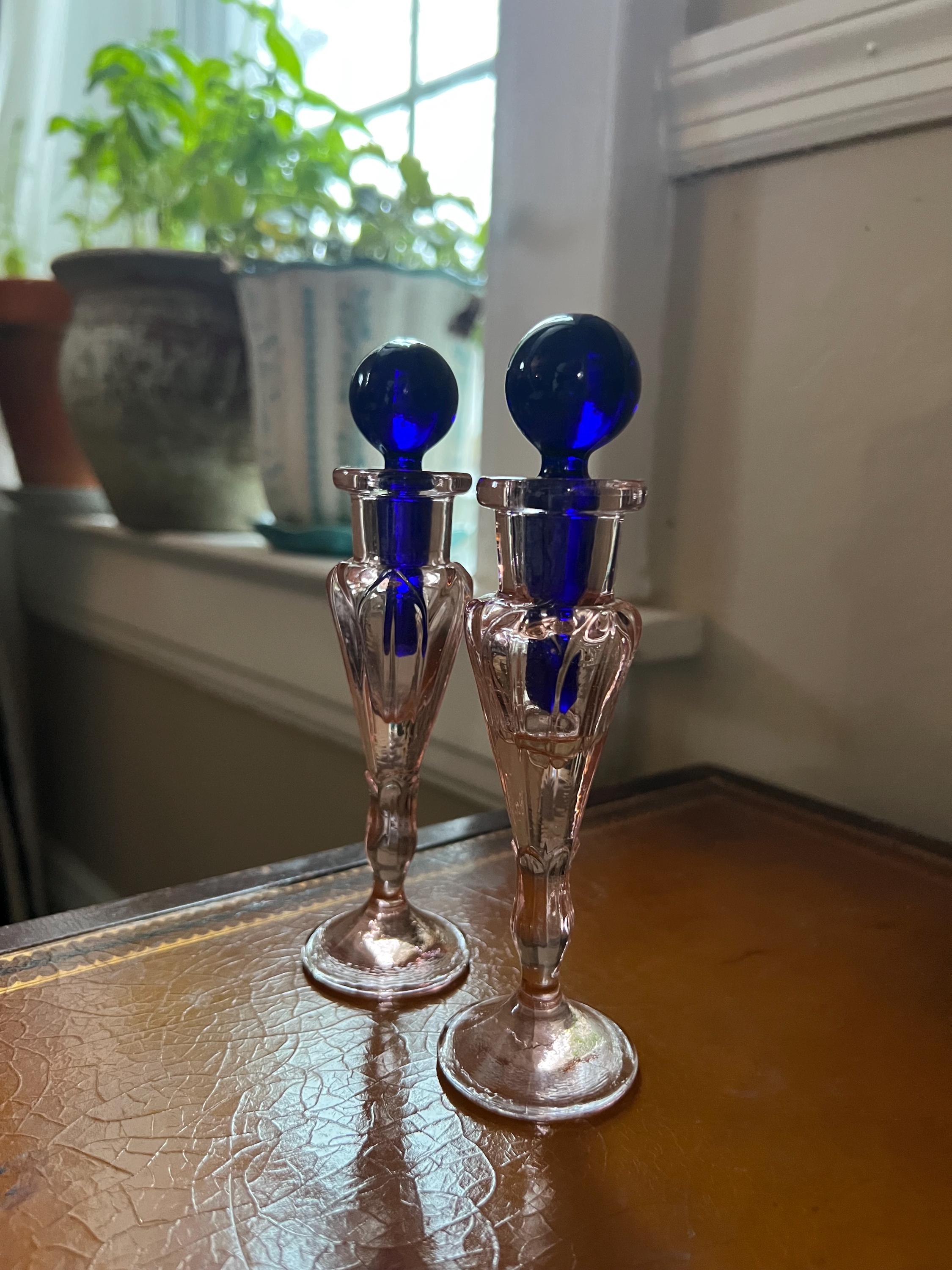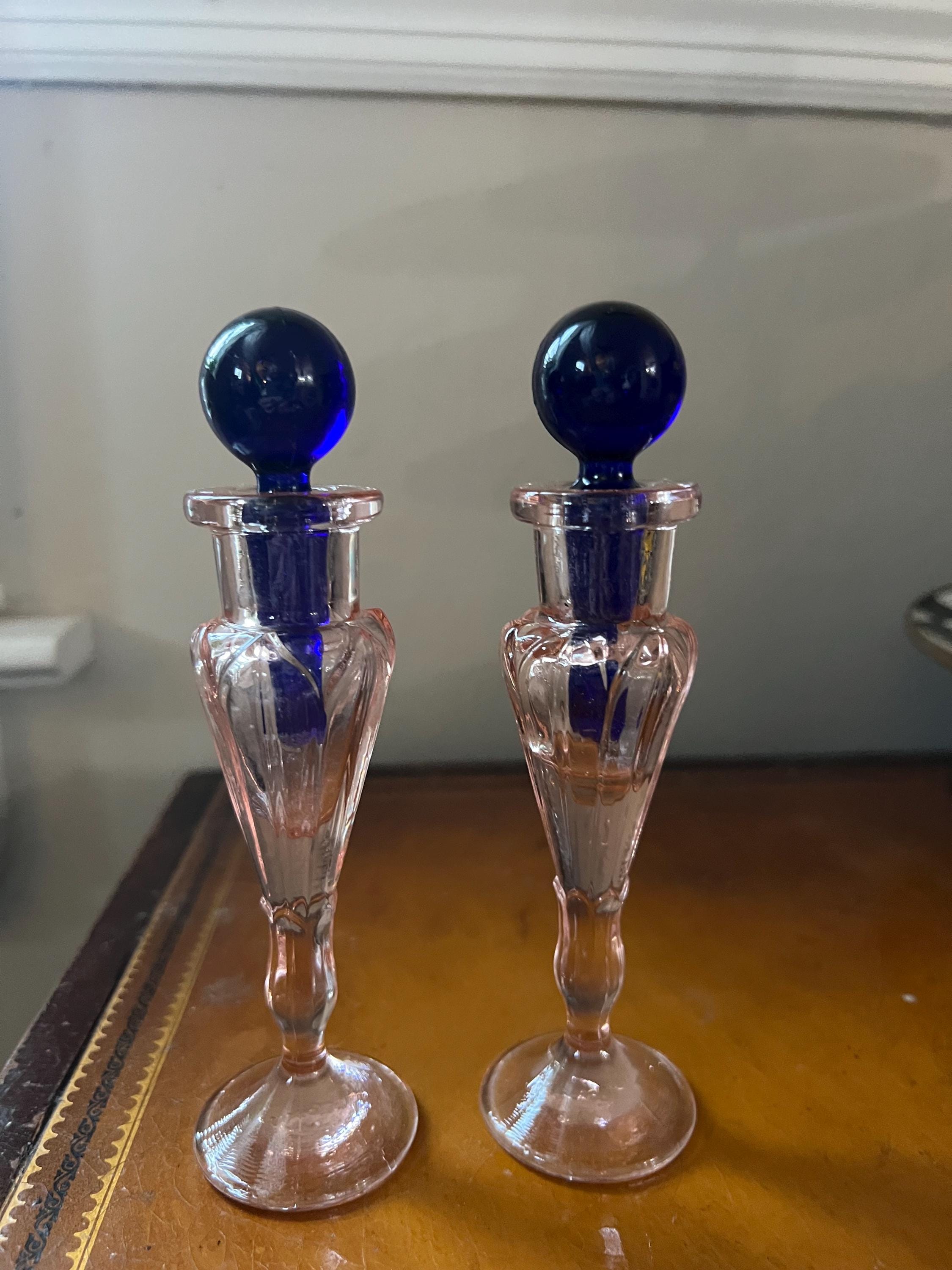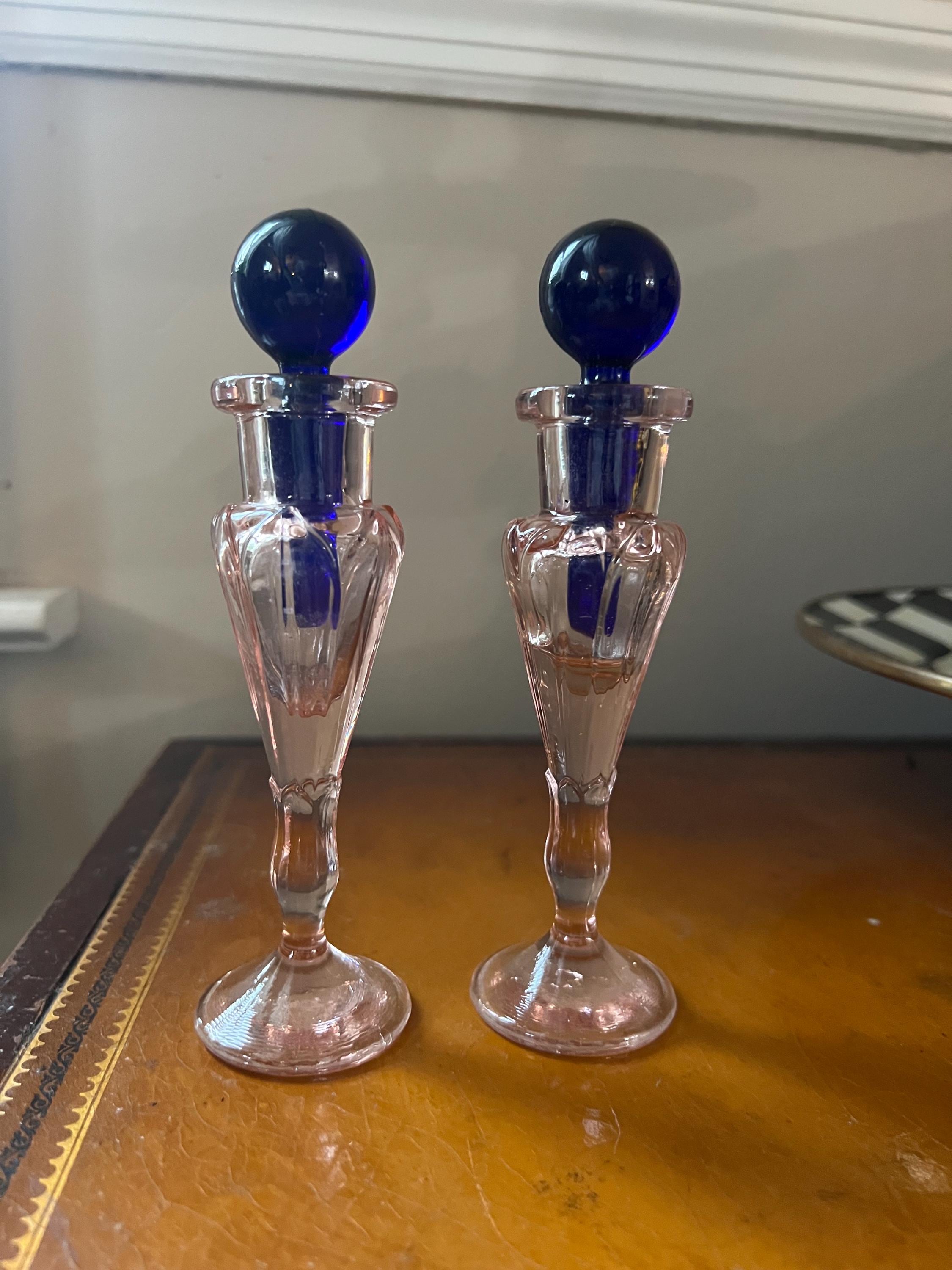 Pair of Vintage Pink Glass Vanity Bottles | Cobalt Blue Ball Stoppers | Depression Era Decor | Elegant Mid-Century Perfume Decanters