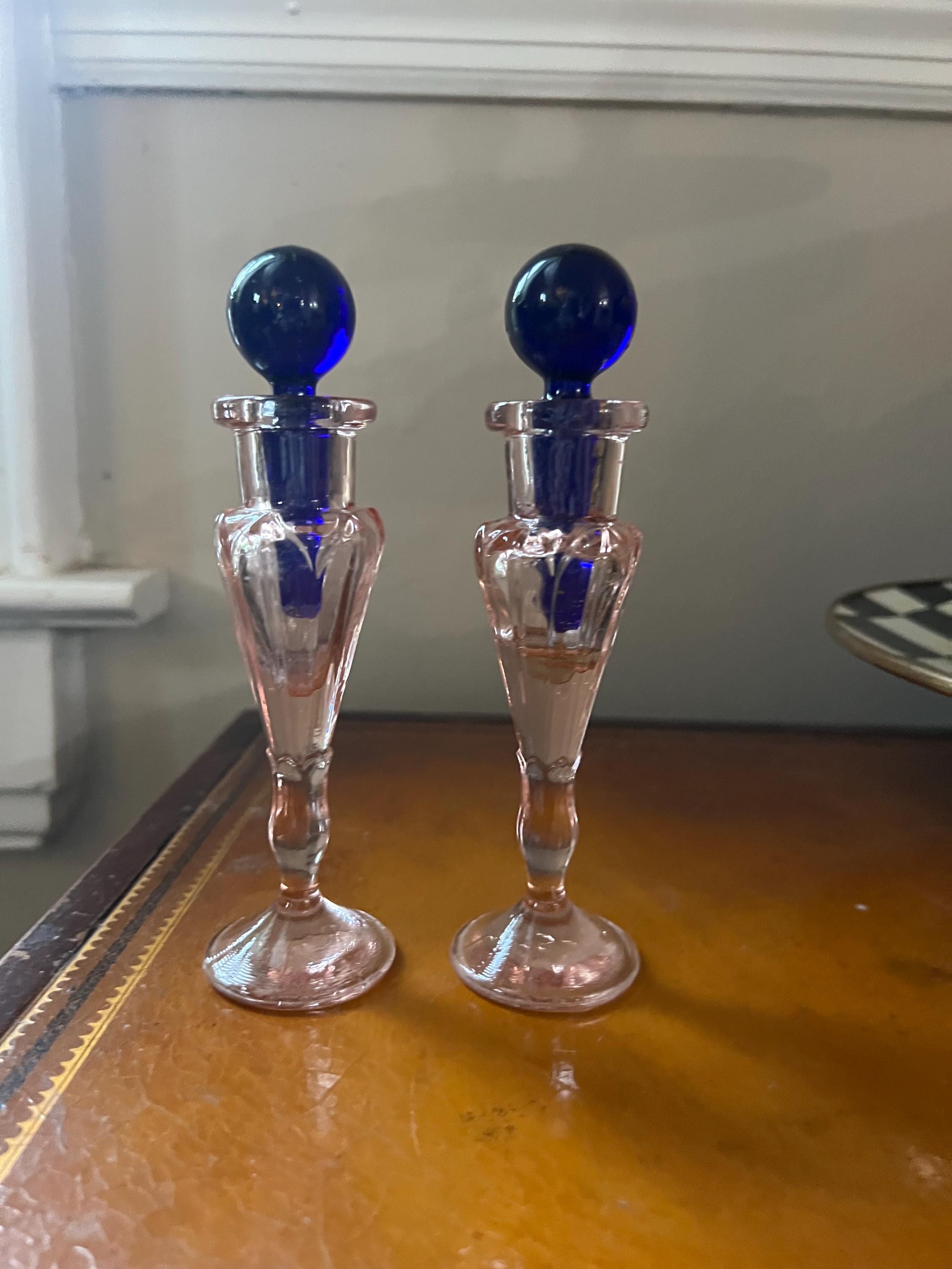 * Color: Soft pink glass with vibrant cobalt blue stoppers.