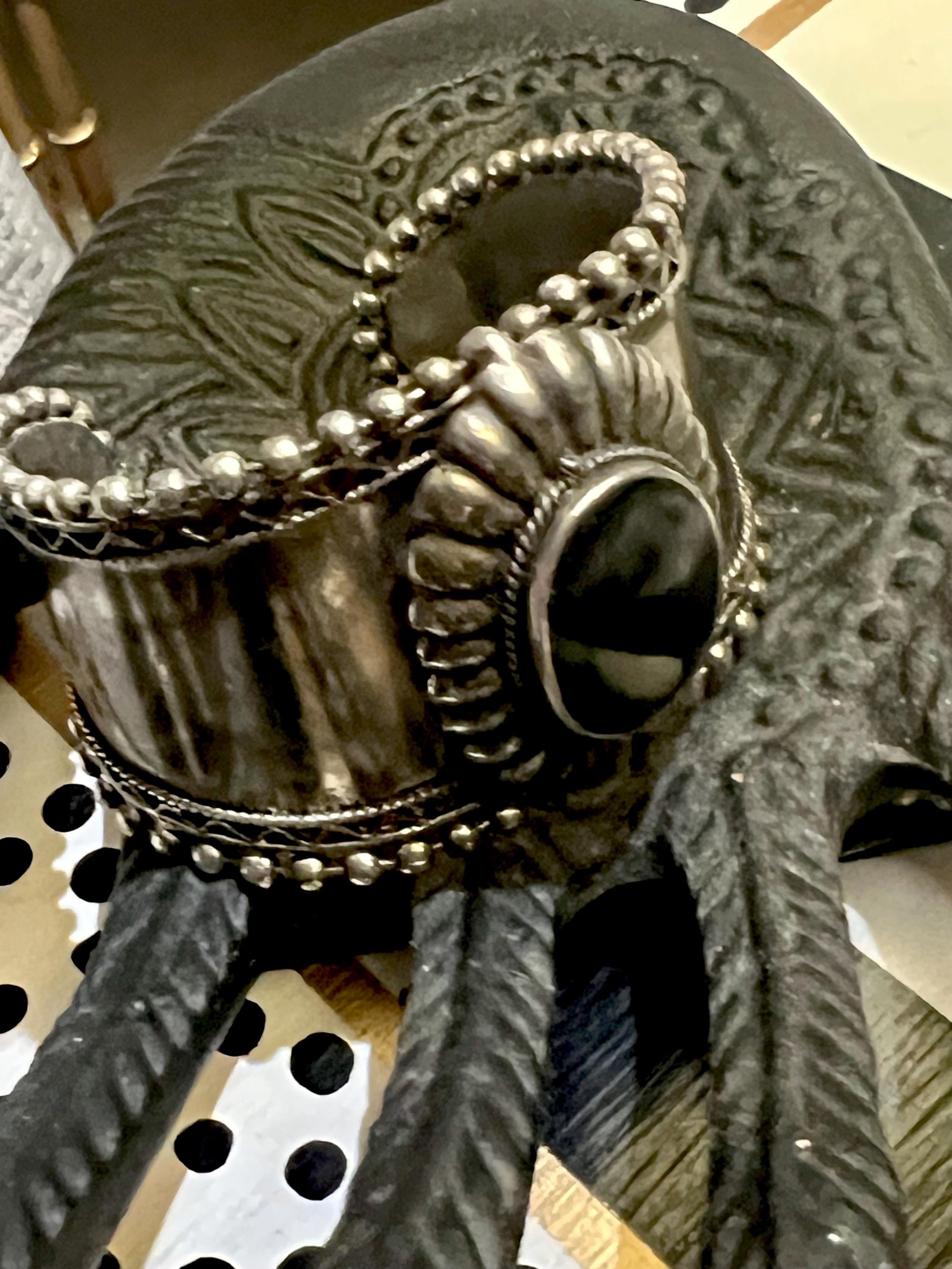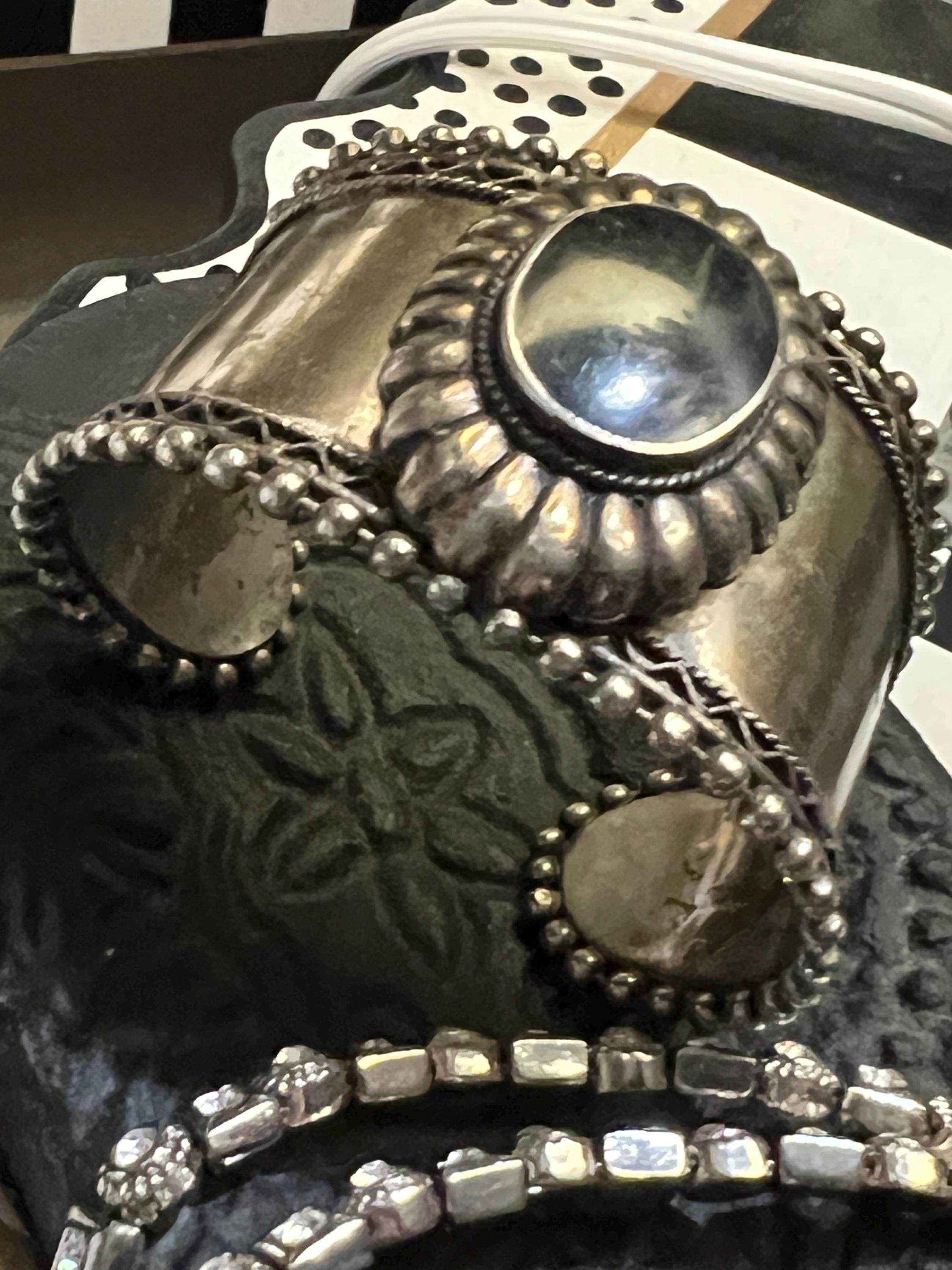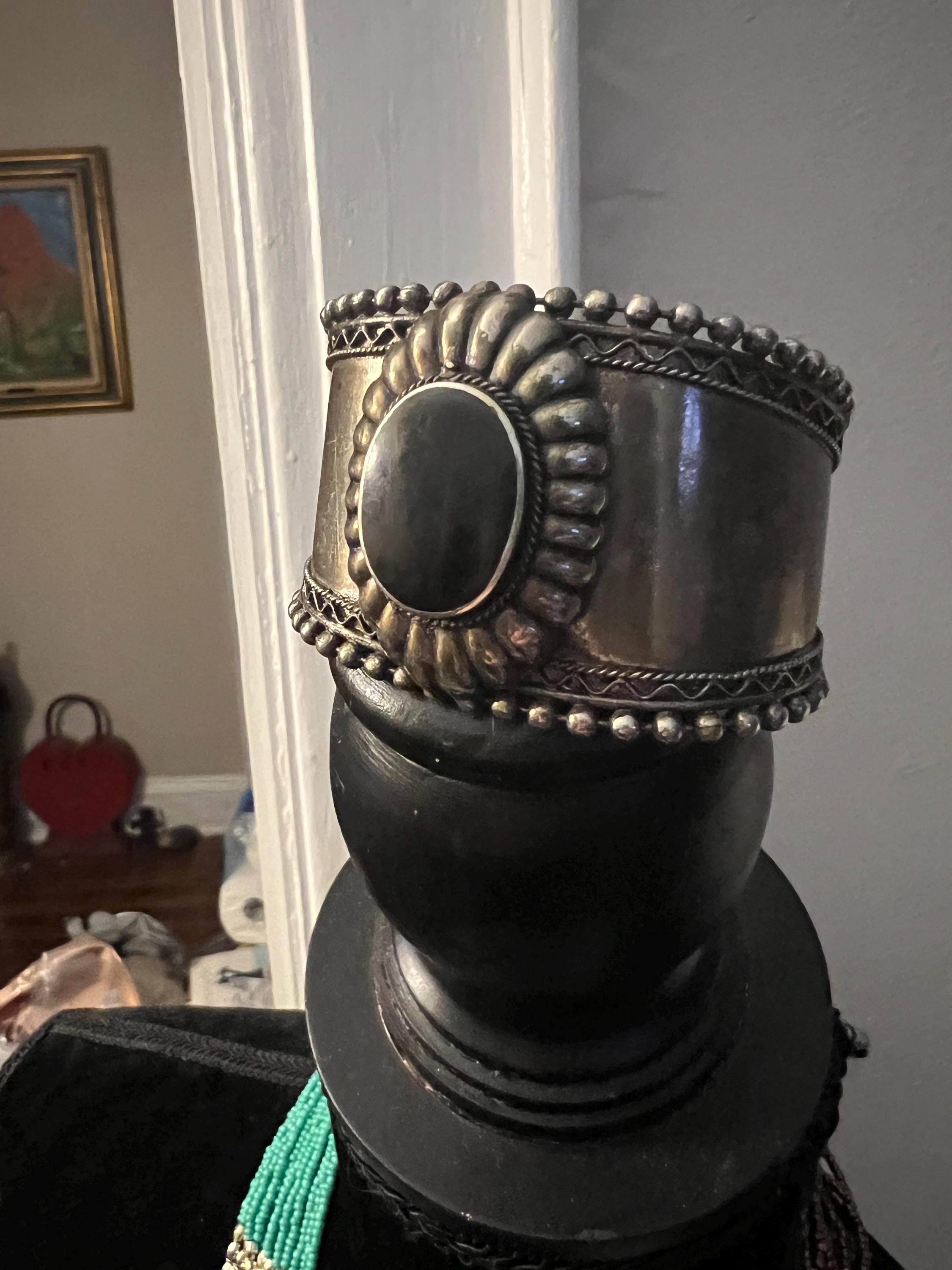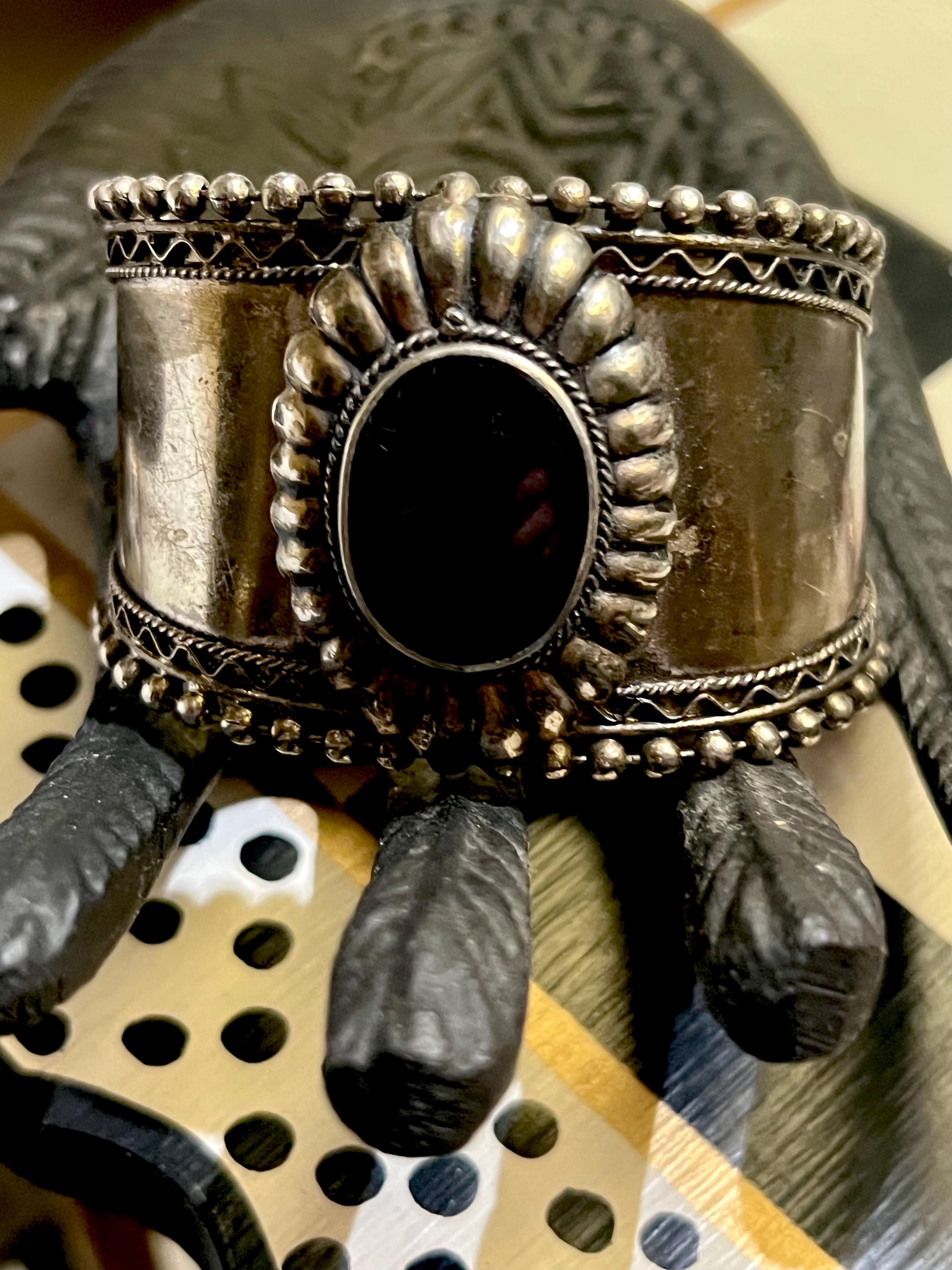 Large Vintage Tribal Western Cuff, Boho Gypsy Cowgirl Ornate Silvertone & Polished Black Stone Statement Bracelet, Hippie Festival Jewelry
