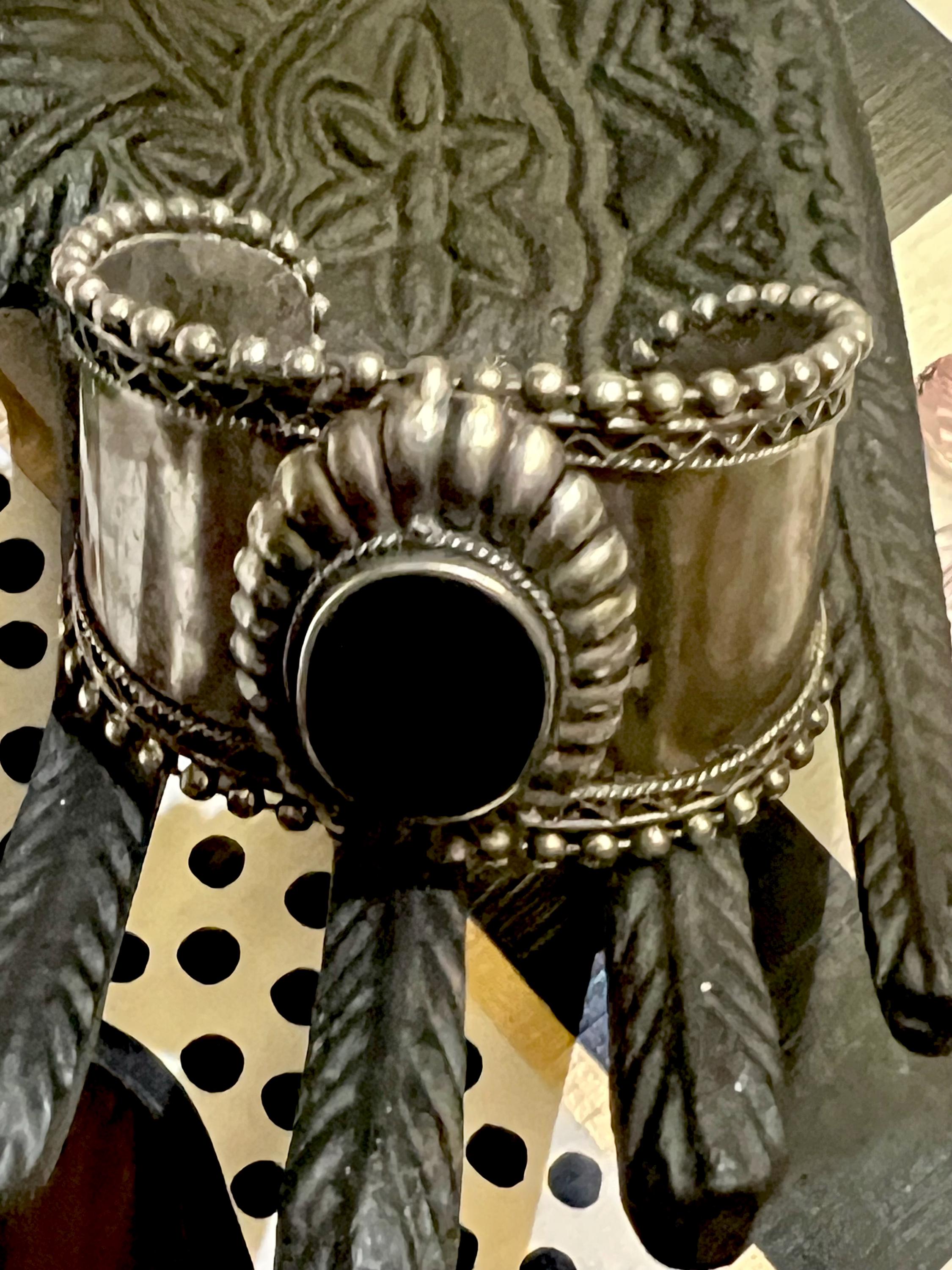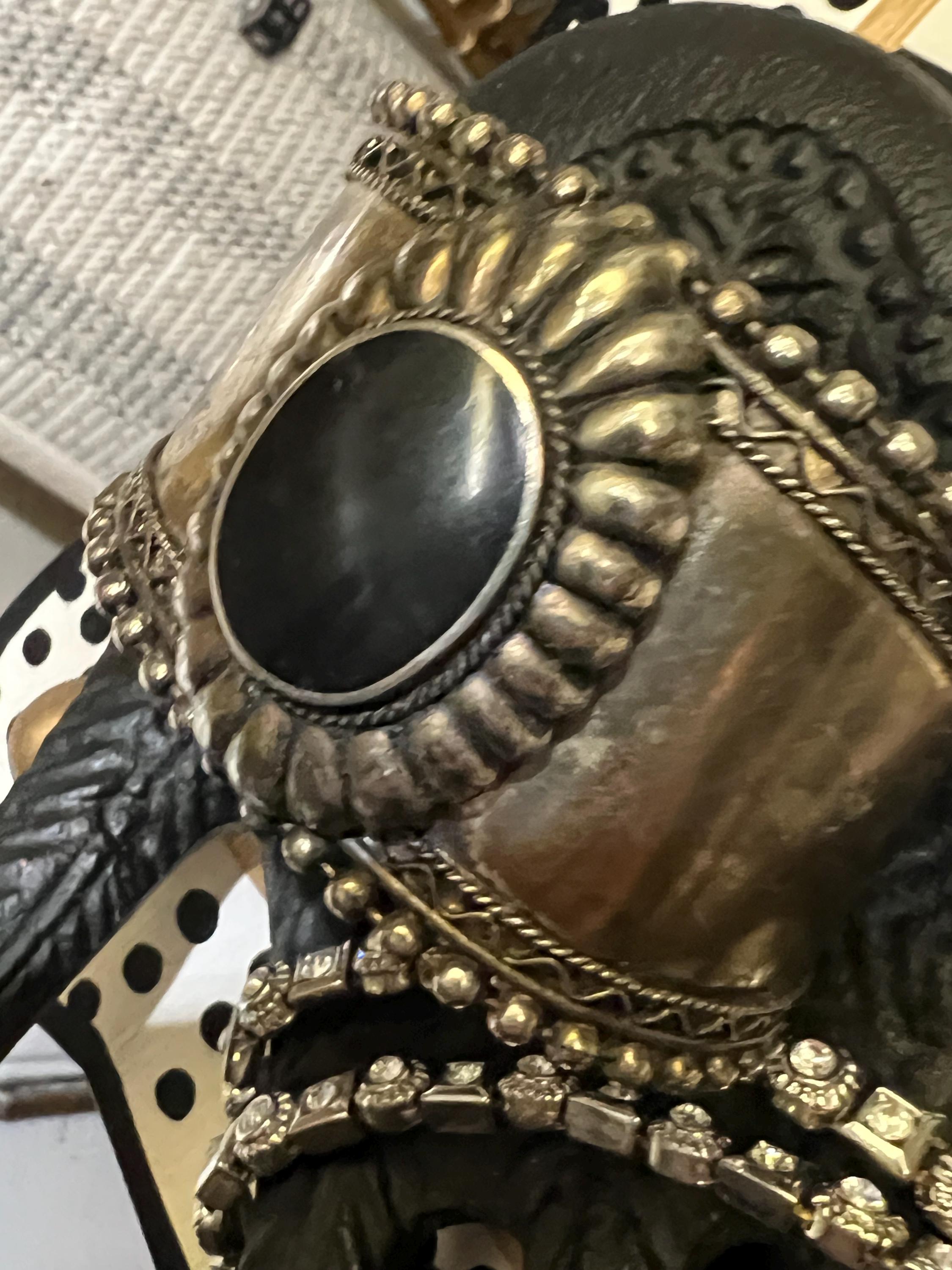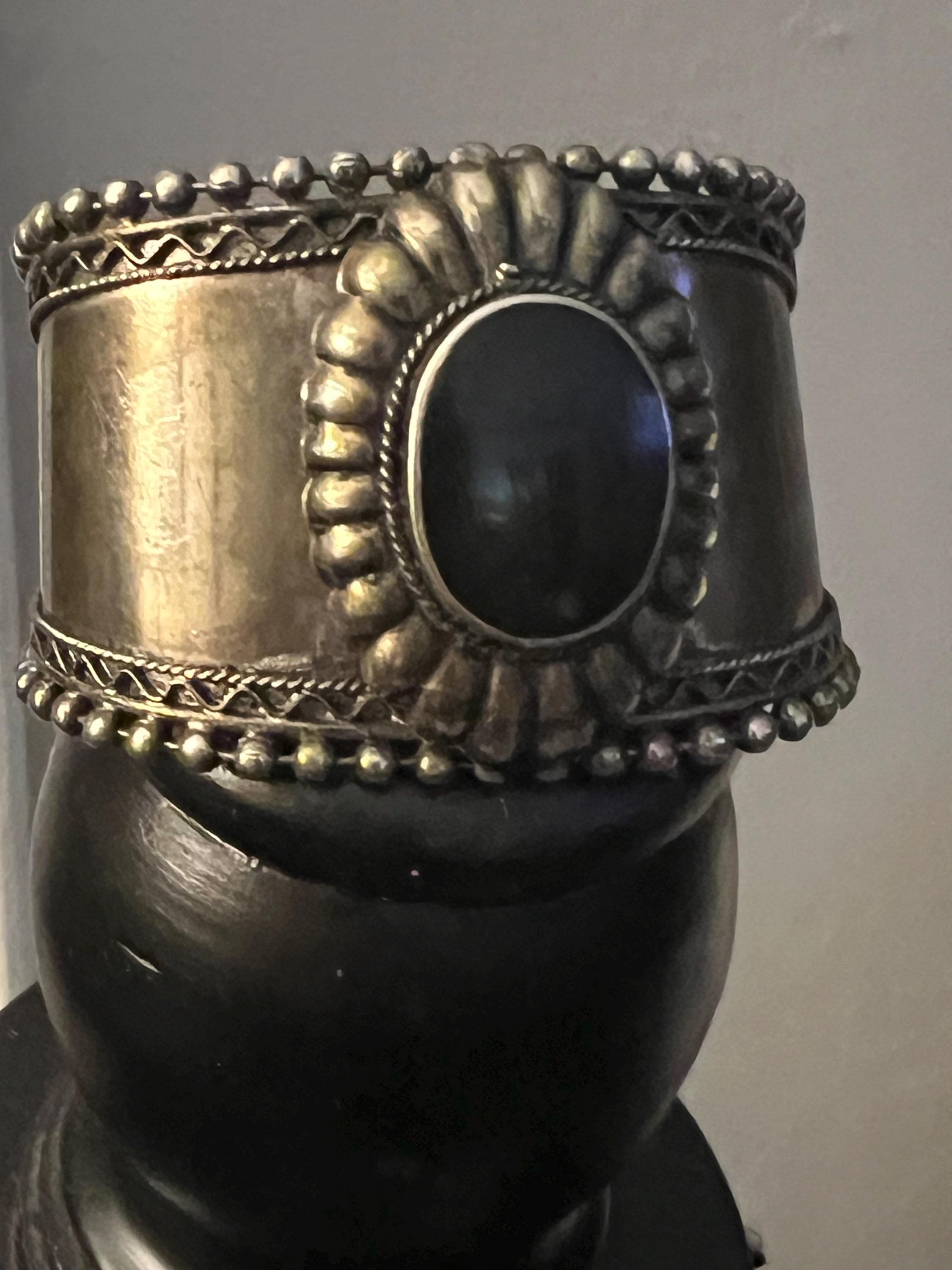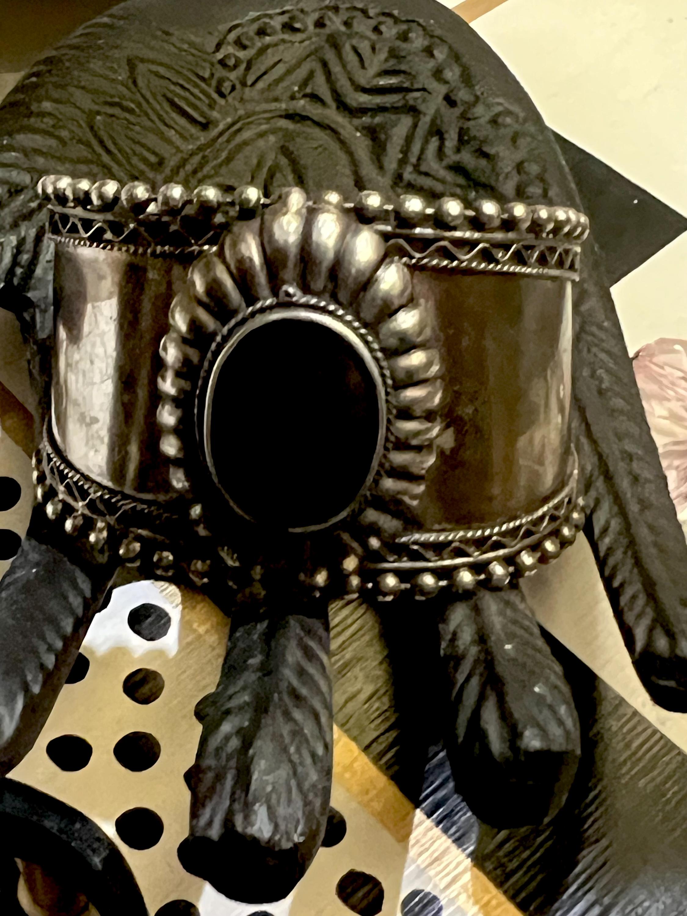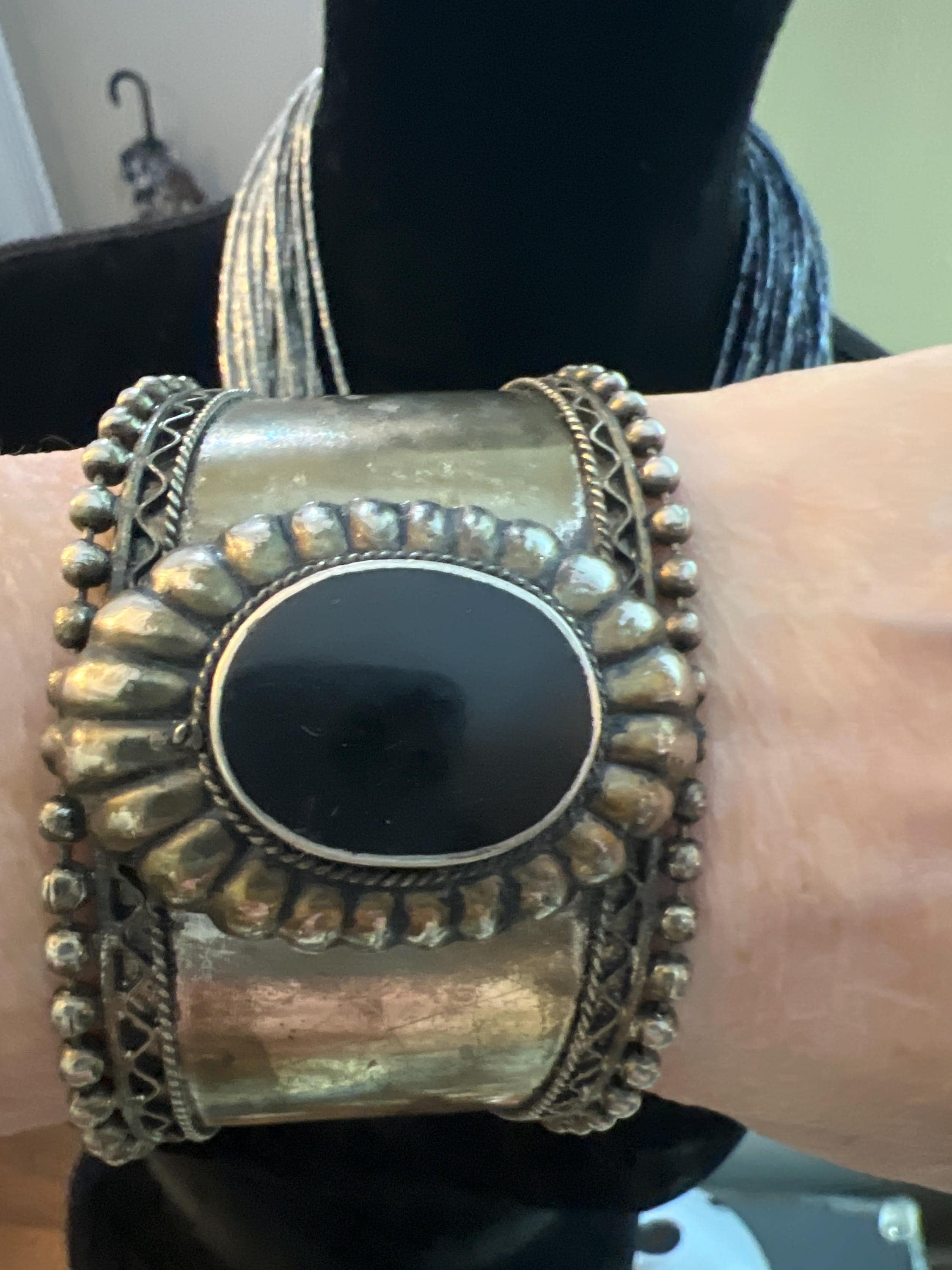 Large Vintage Tribal Western Cuff, Boho Gypsy Cowgirl Ornate Silvertone & Polished Black Stone Statement Bracelet, Hippie Festival Jewelry