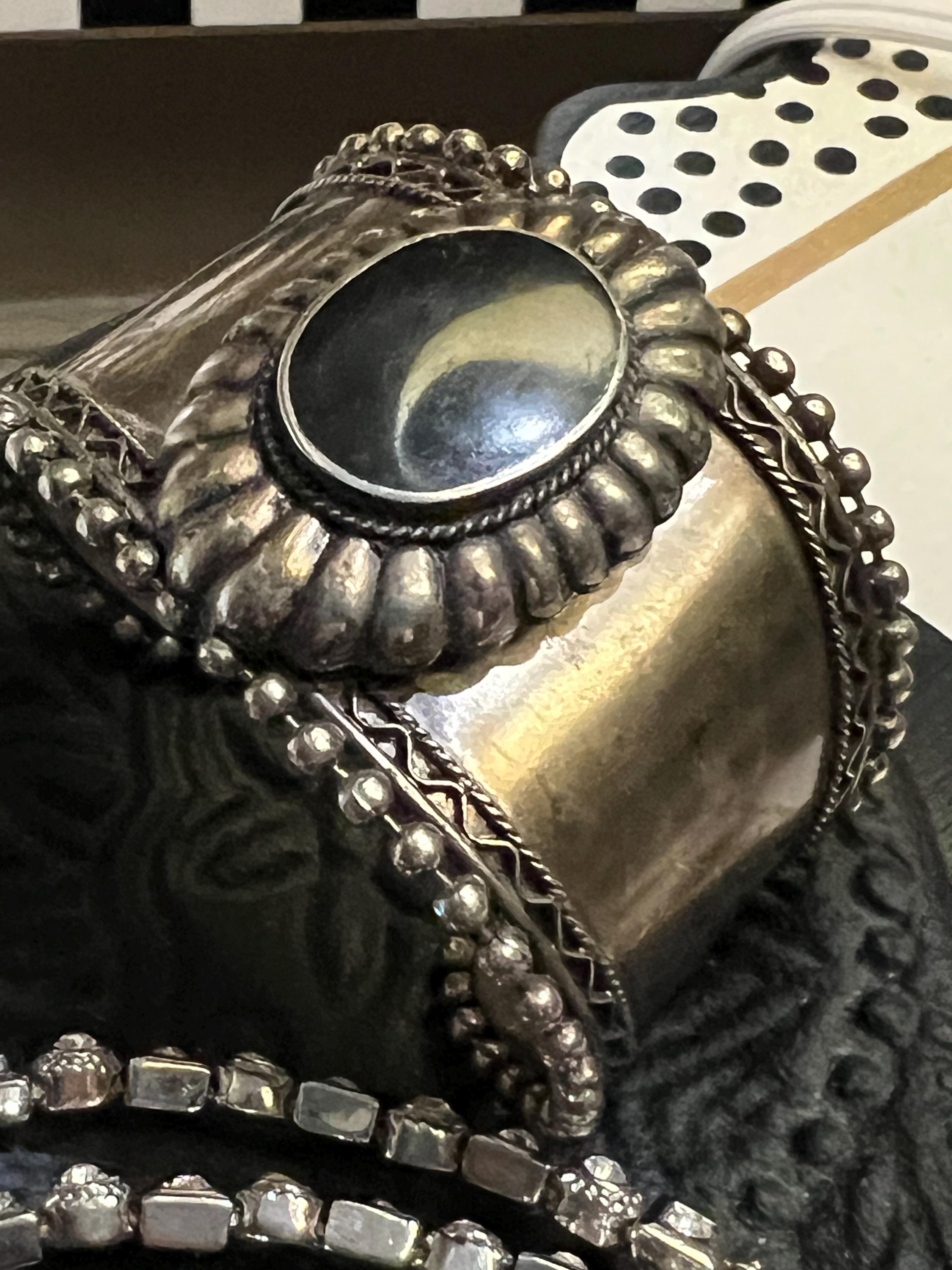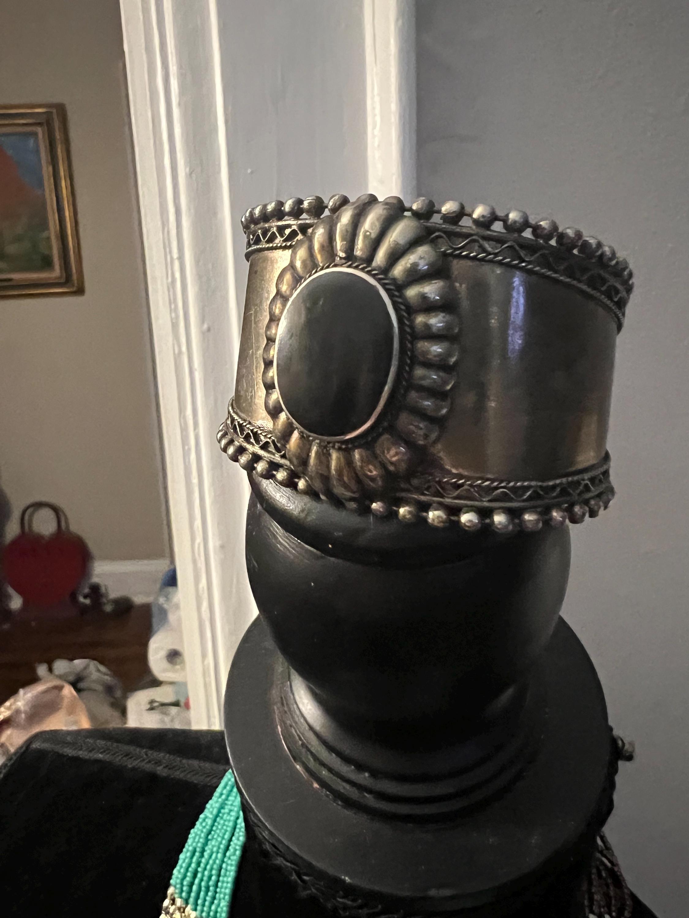 Beautiful Mid Century Bracelet- probably from India- popular tribal jewelry during the 70s and integrated well with western American jewelry. This great piece was purchased out west along with the other one I currently have for sale as well. I love the bead like trim around the edges and the petal like border around the stone- the contrast of rustic, bold and feminine elements and dainty details are extraordinary on this non precious metal jewelry piece.