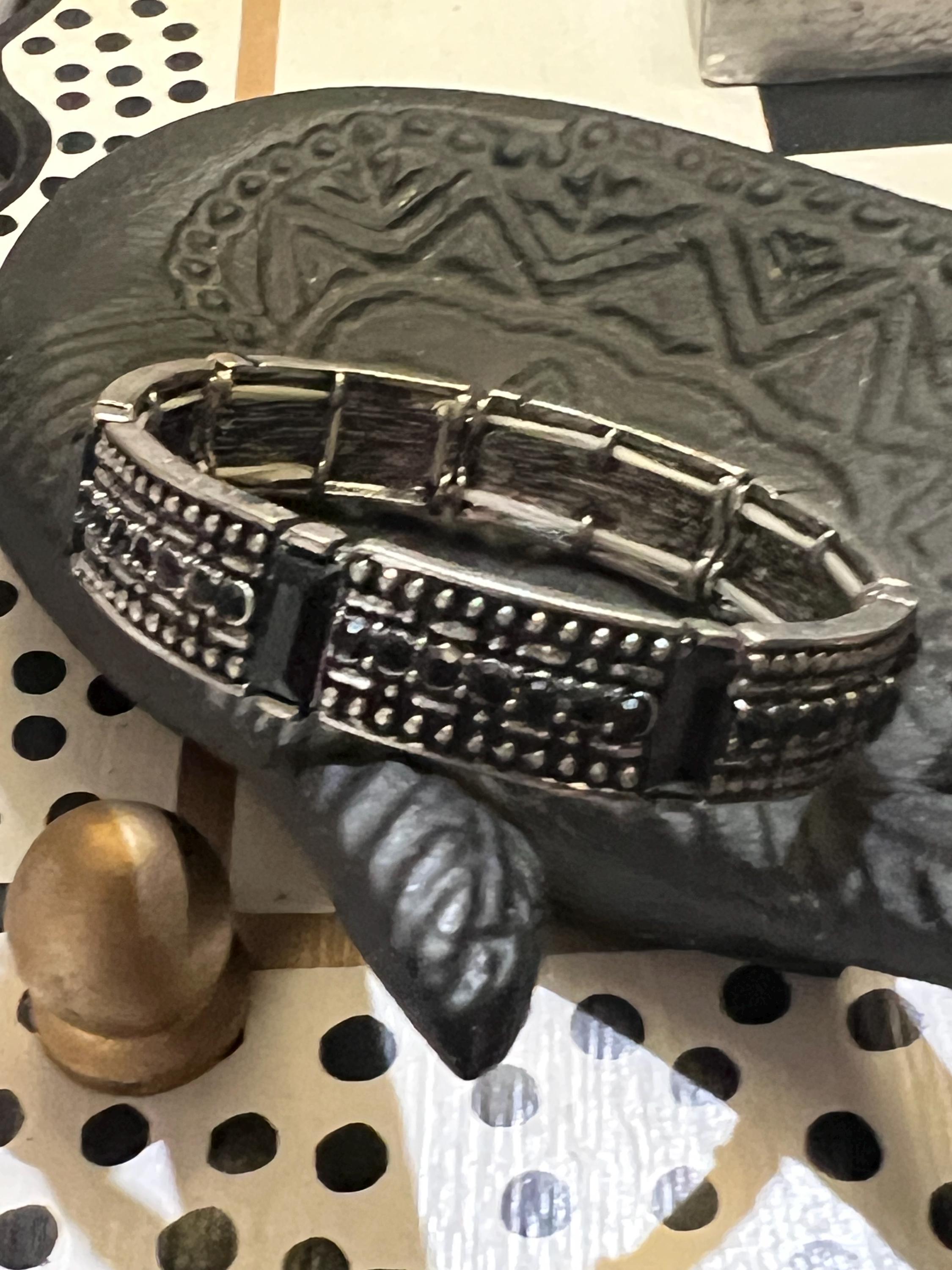 Vintage Silvertone Tribal Cuff, Black Stone Boho Bracelet