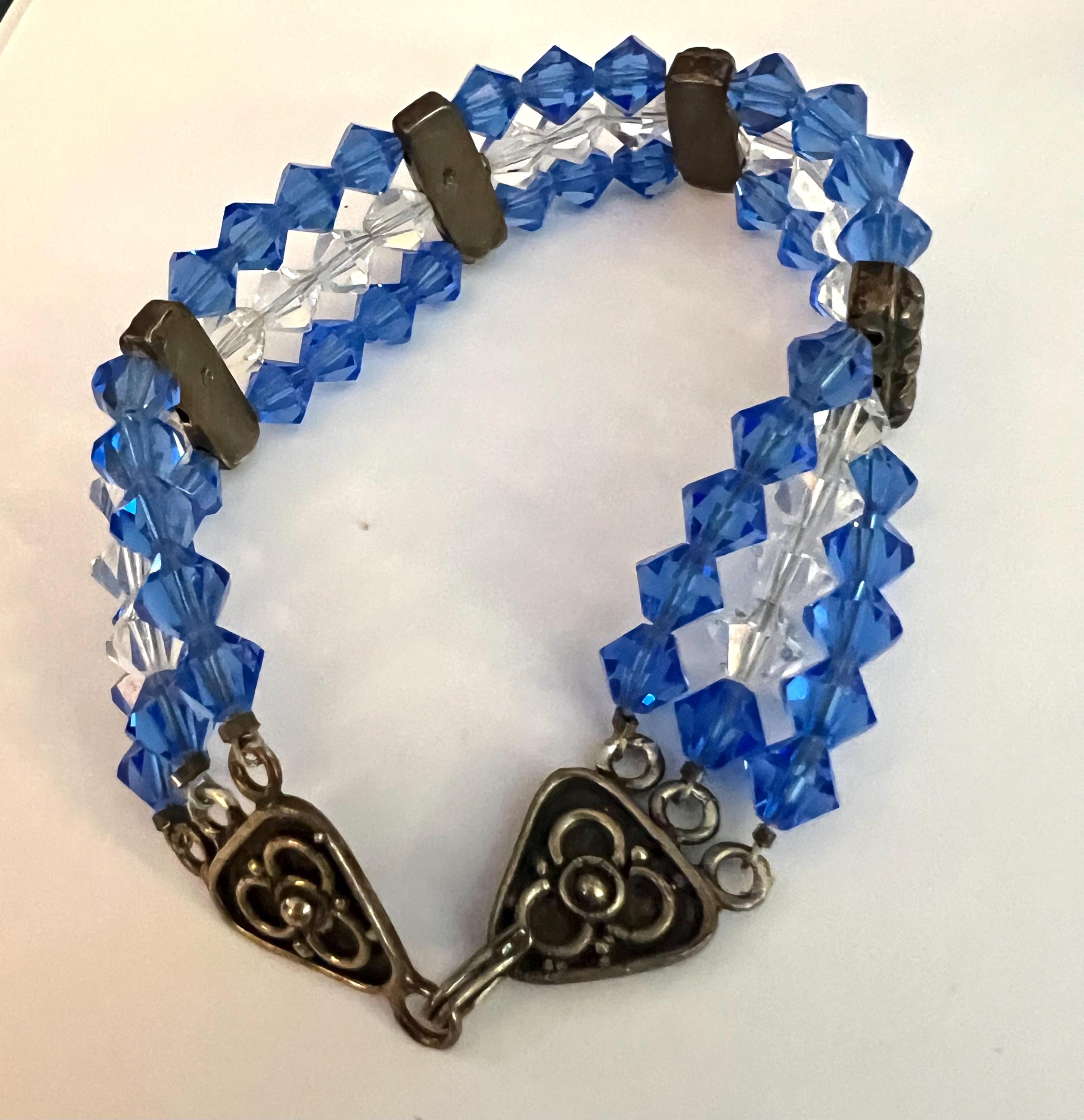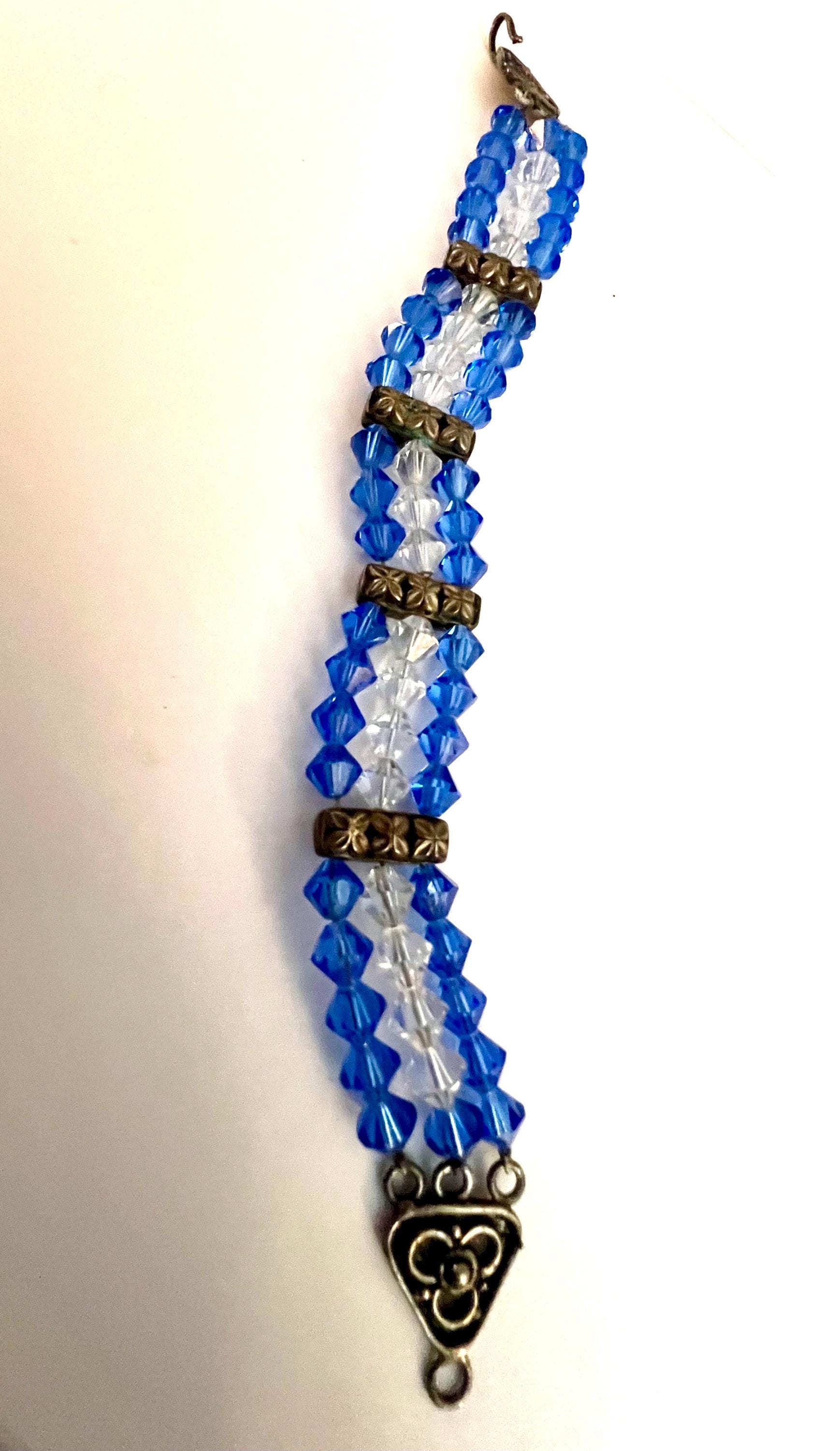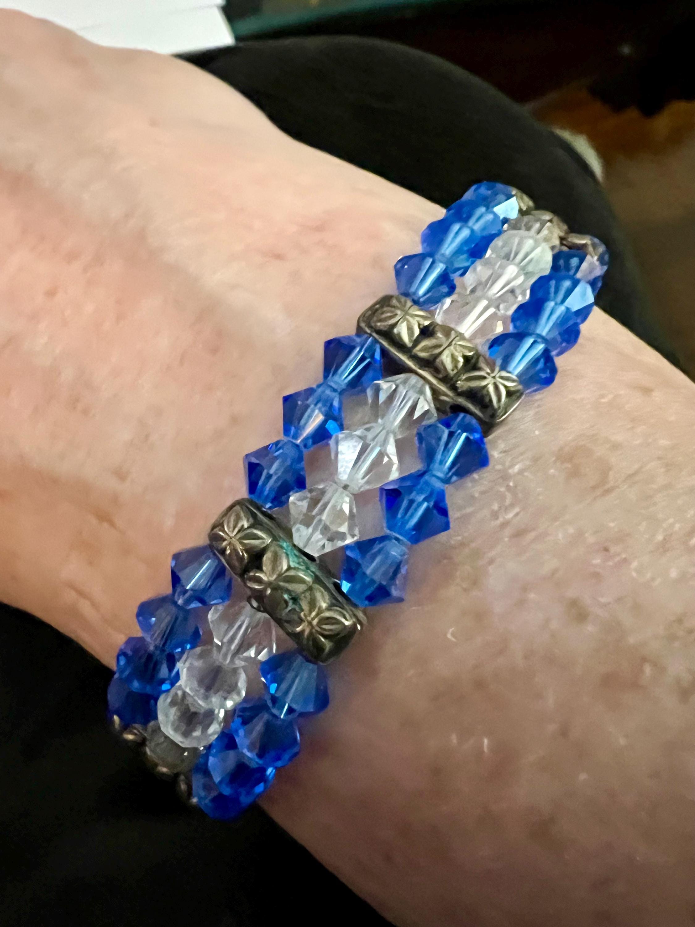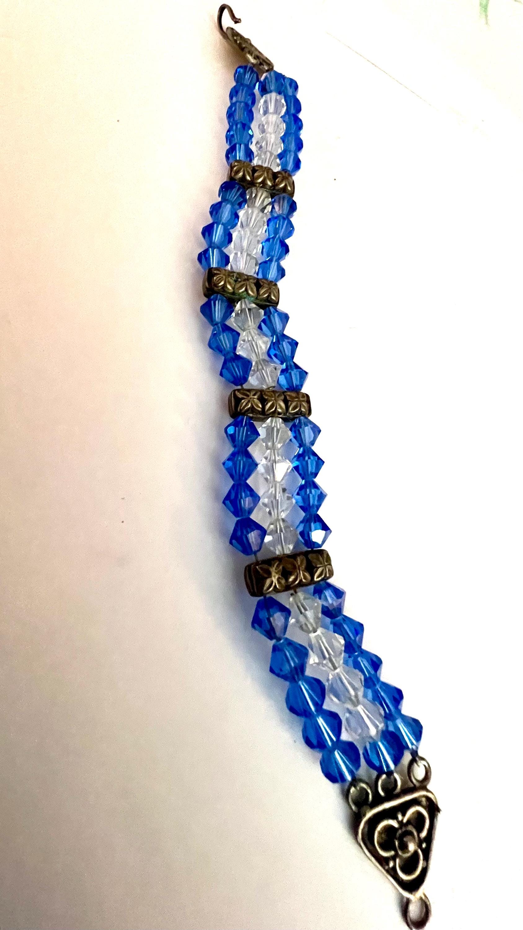 This item appears to be a handmade and stamped, multi-strand crystal bracelet featuring blue and clear bicone beads, possibly made with Swarovski or quality similar faceted glass beads.