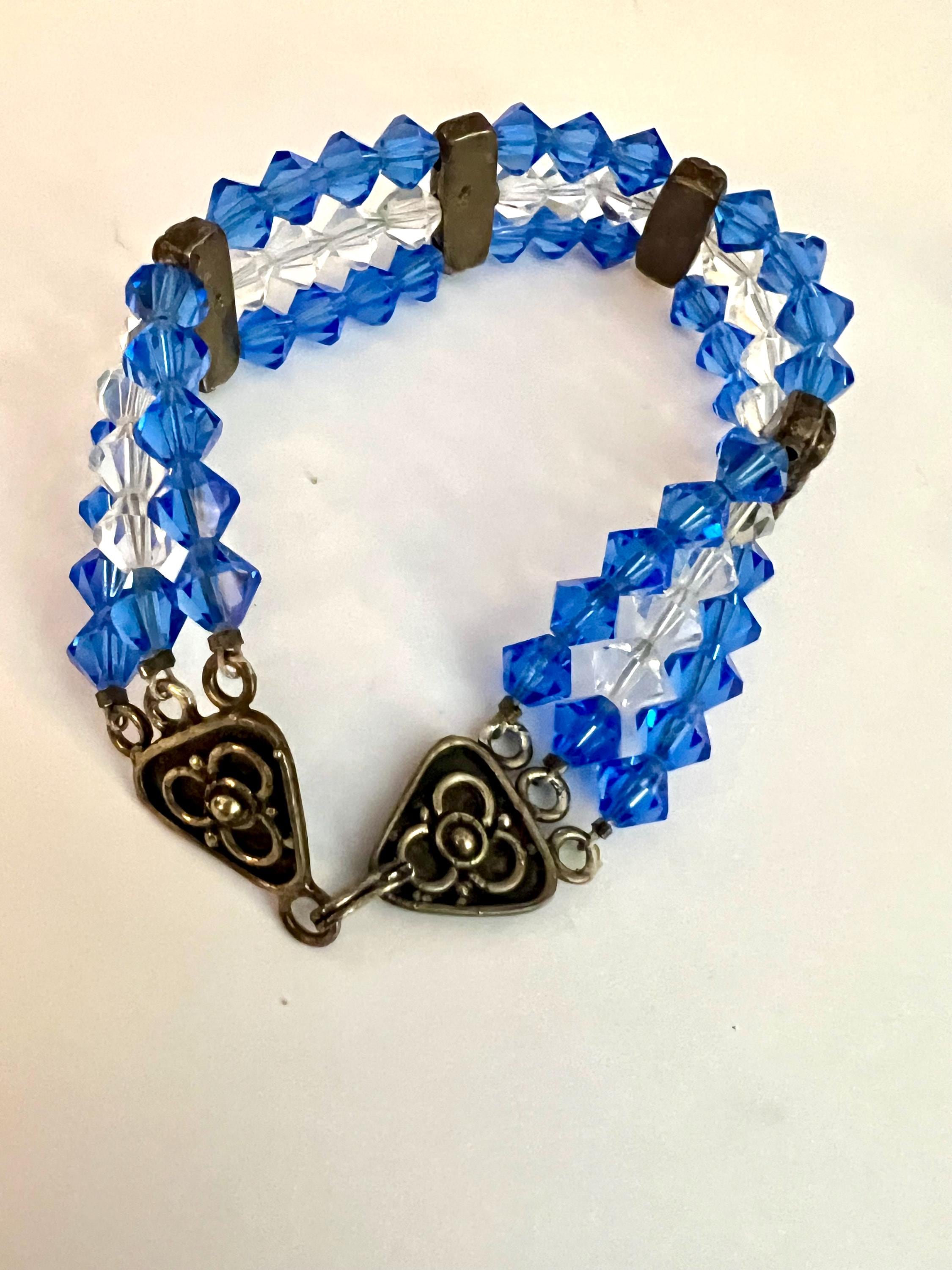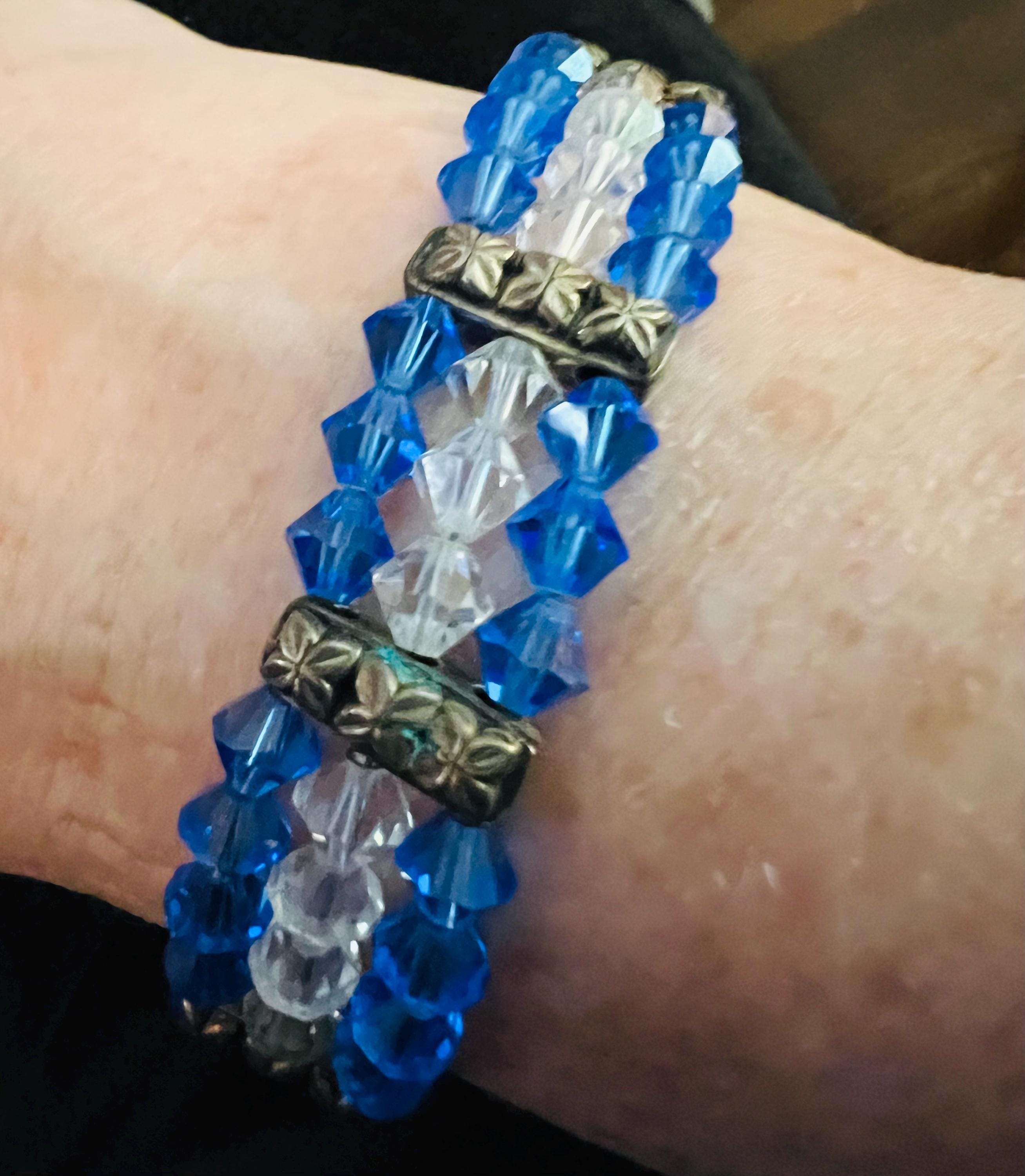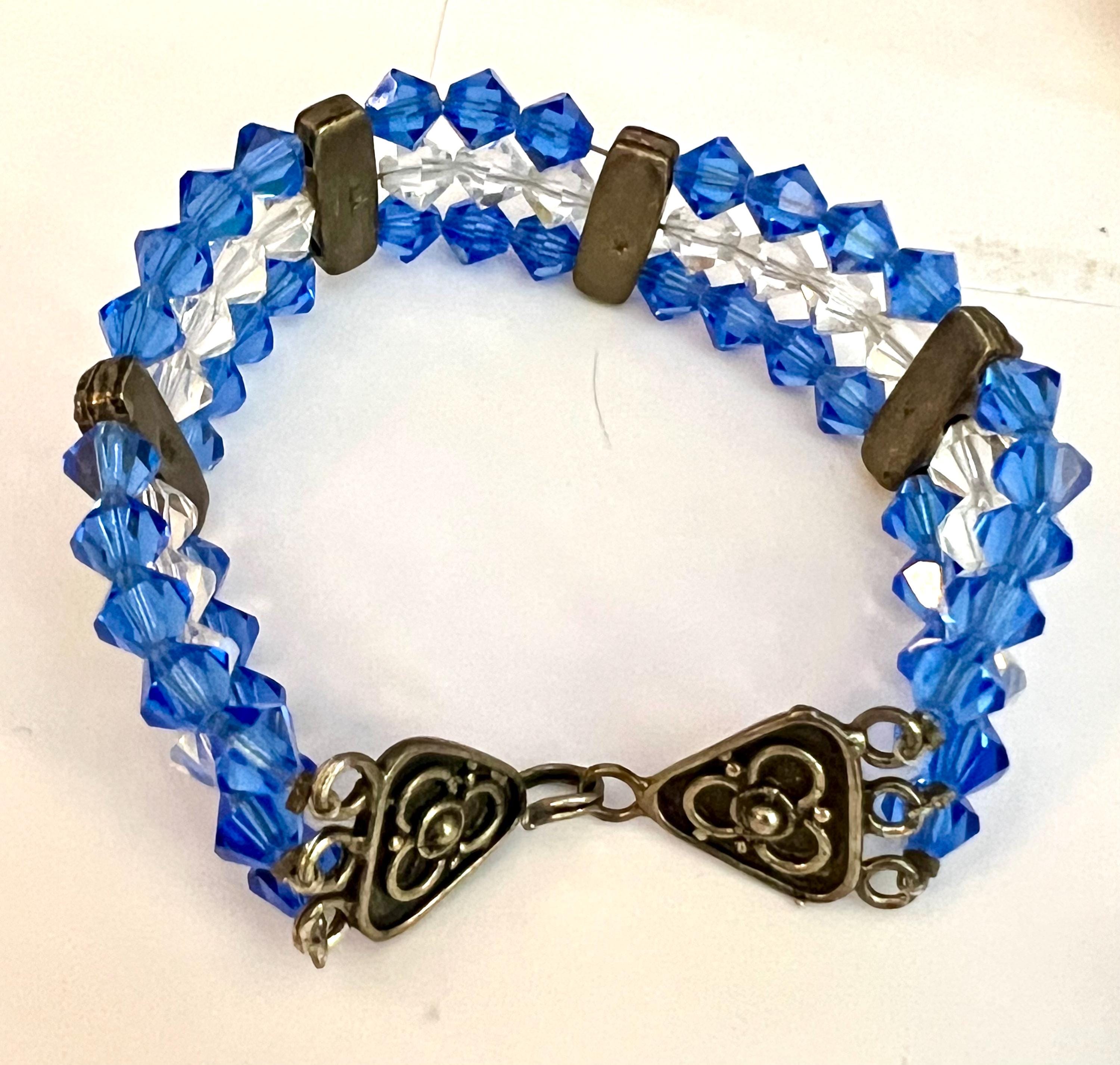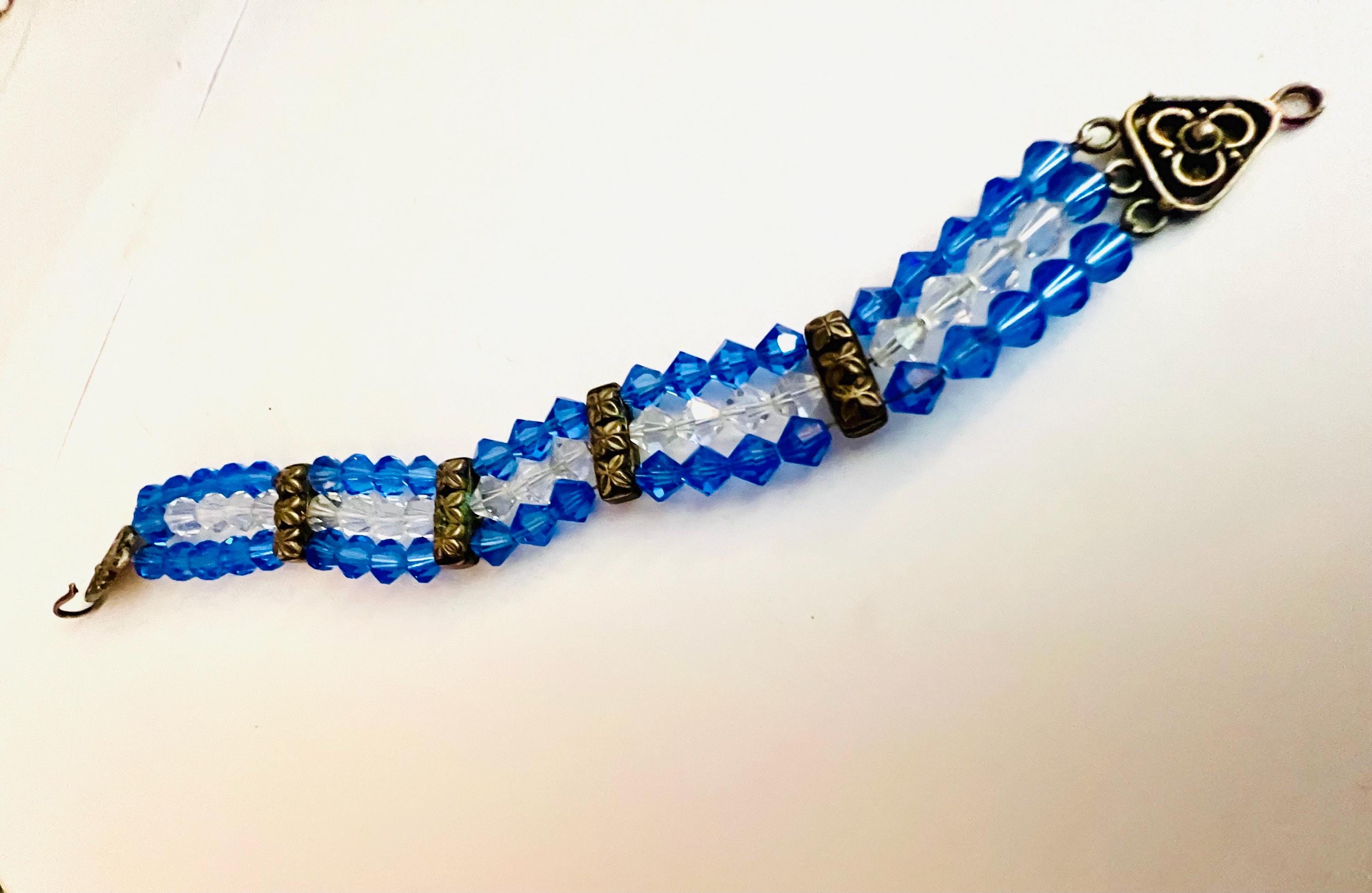 This item appears to be a handmade and stamped, multi-strand crystal bracelet featuring blue and clear bicone beads, possibly made with Swarovski or quality similar faceted glass beads.