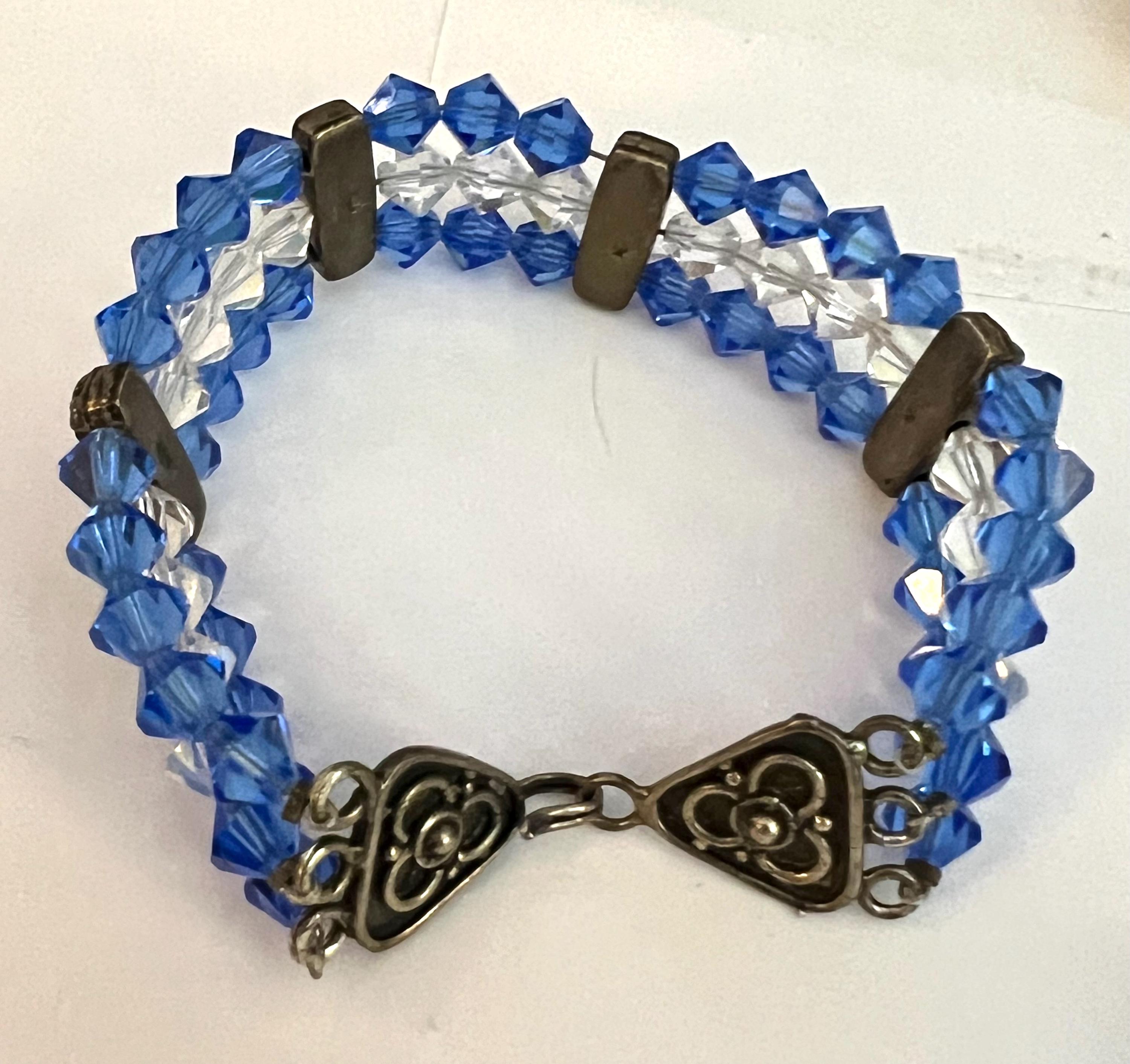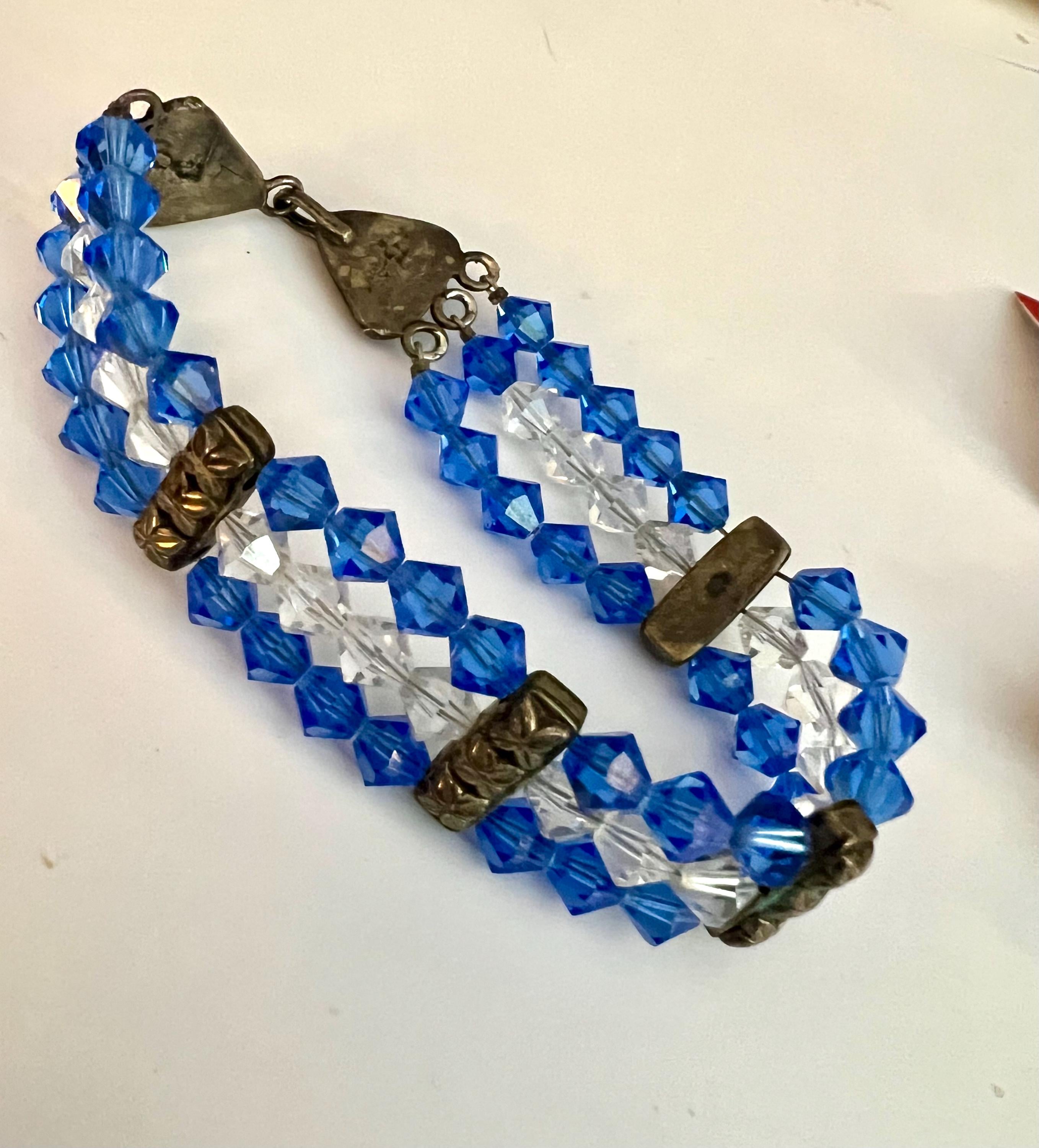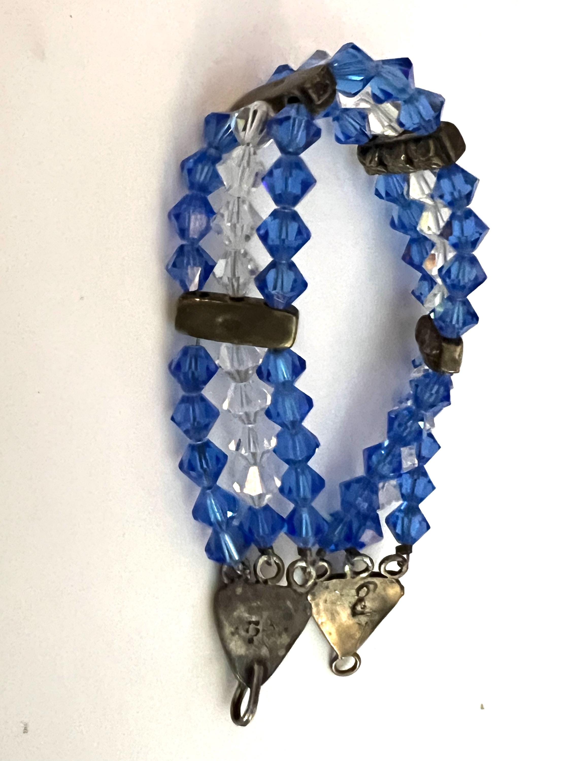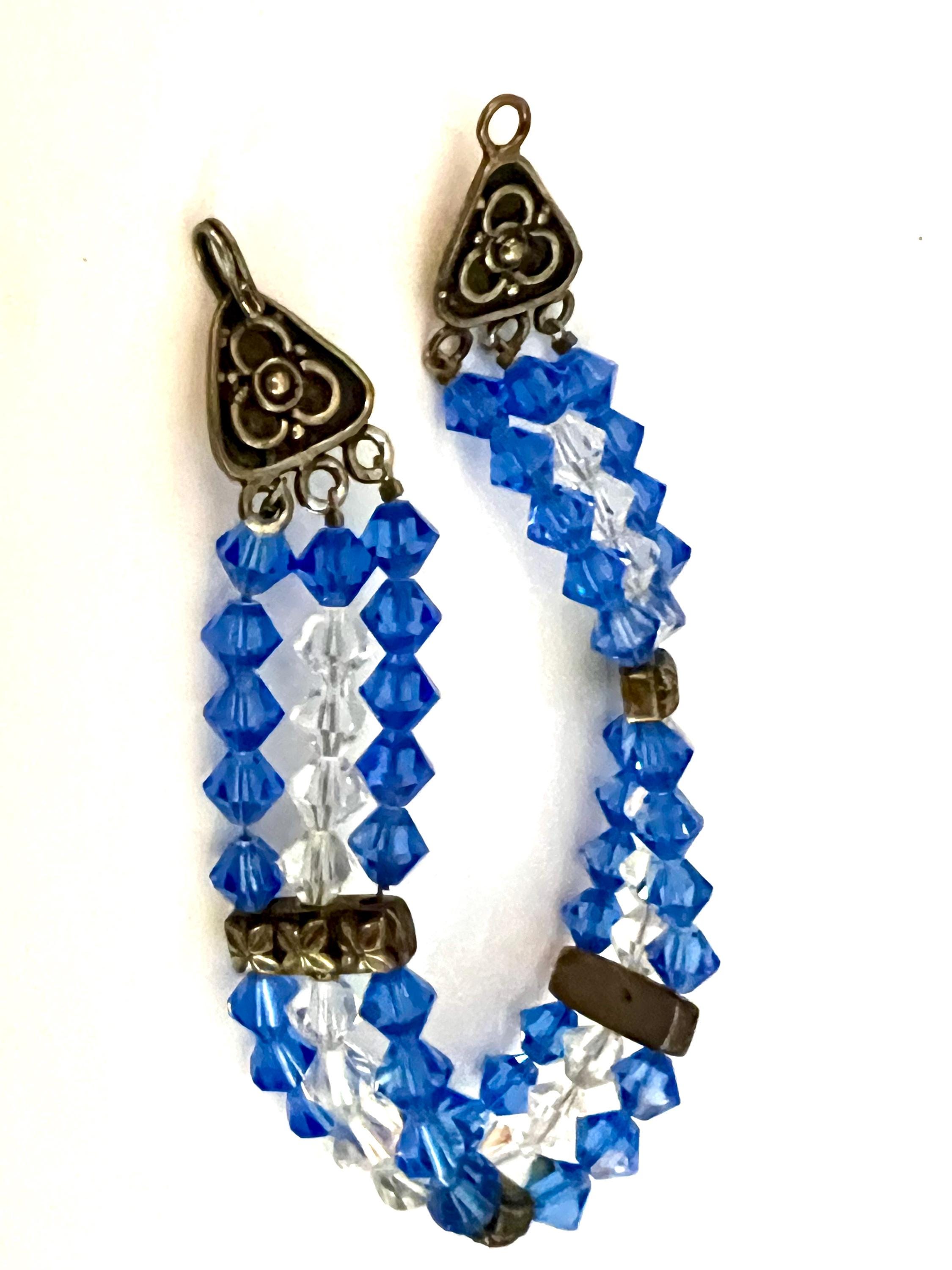 This item appears to be a handmade and stamped, multi-strand crystal bracelet featuring blue and clear bicone beads, possibly made with Swarovski or quality similar faceted glass beads.