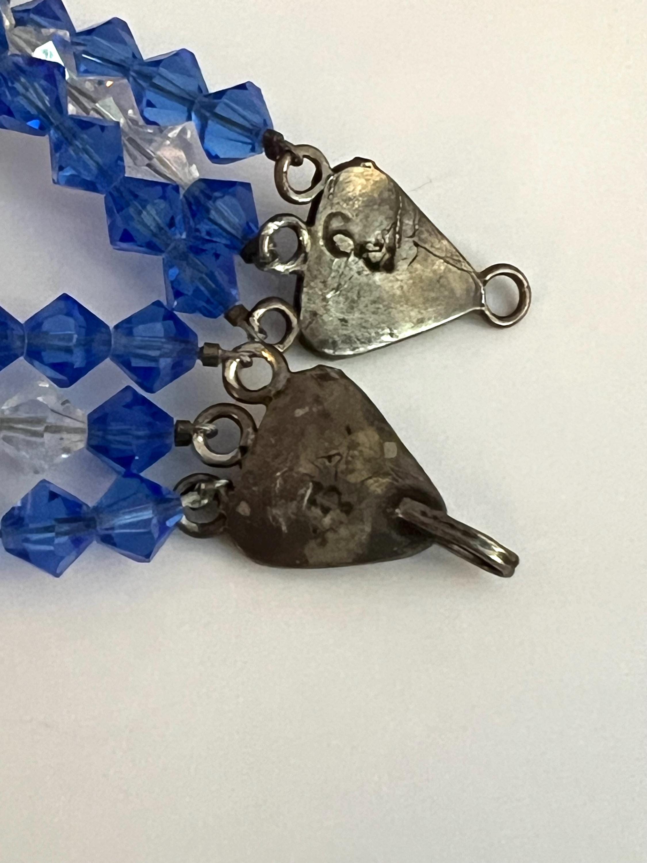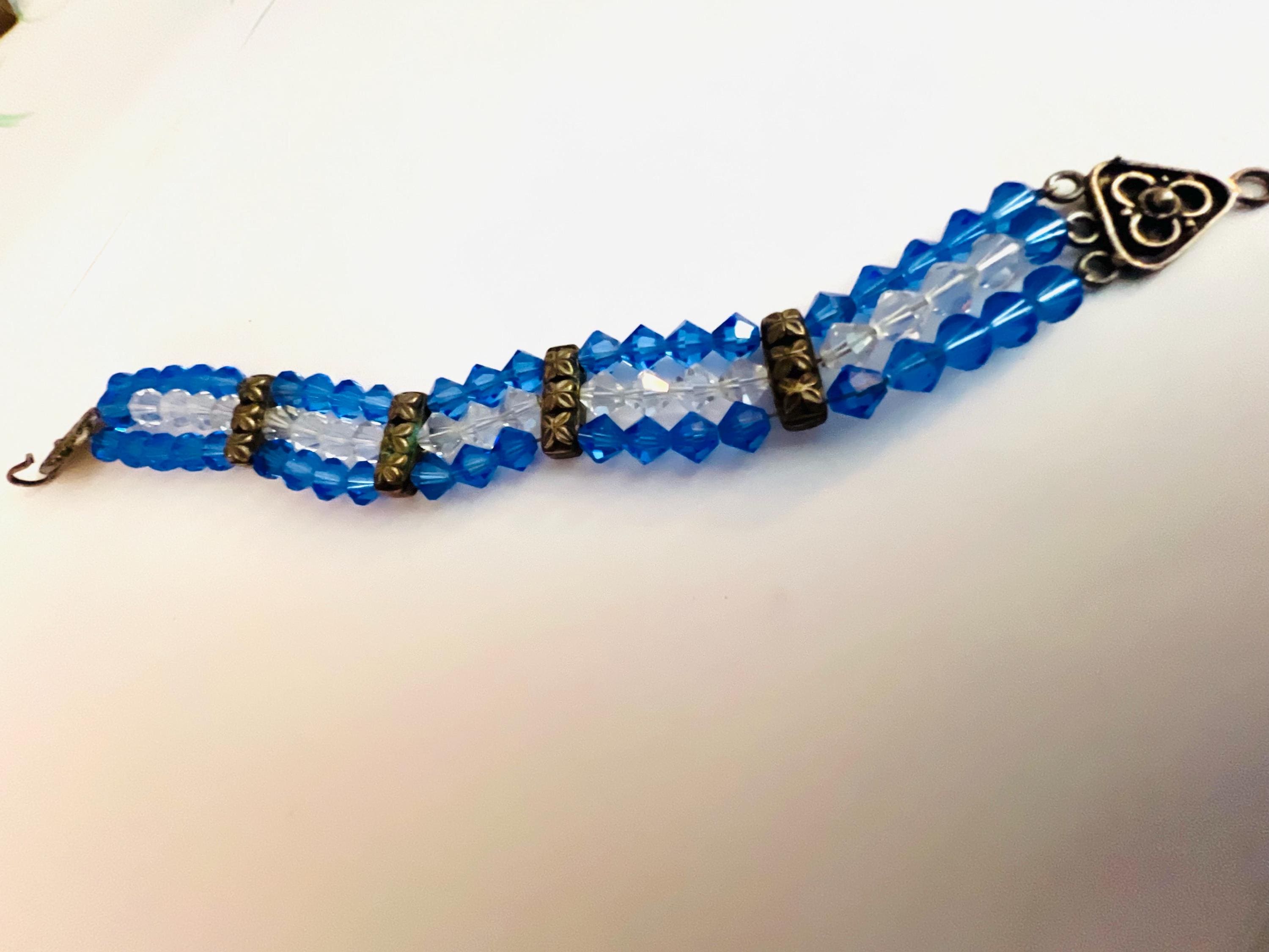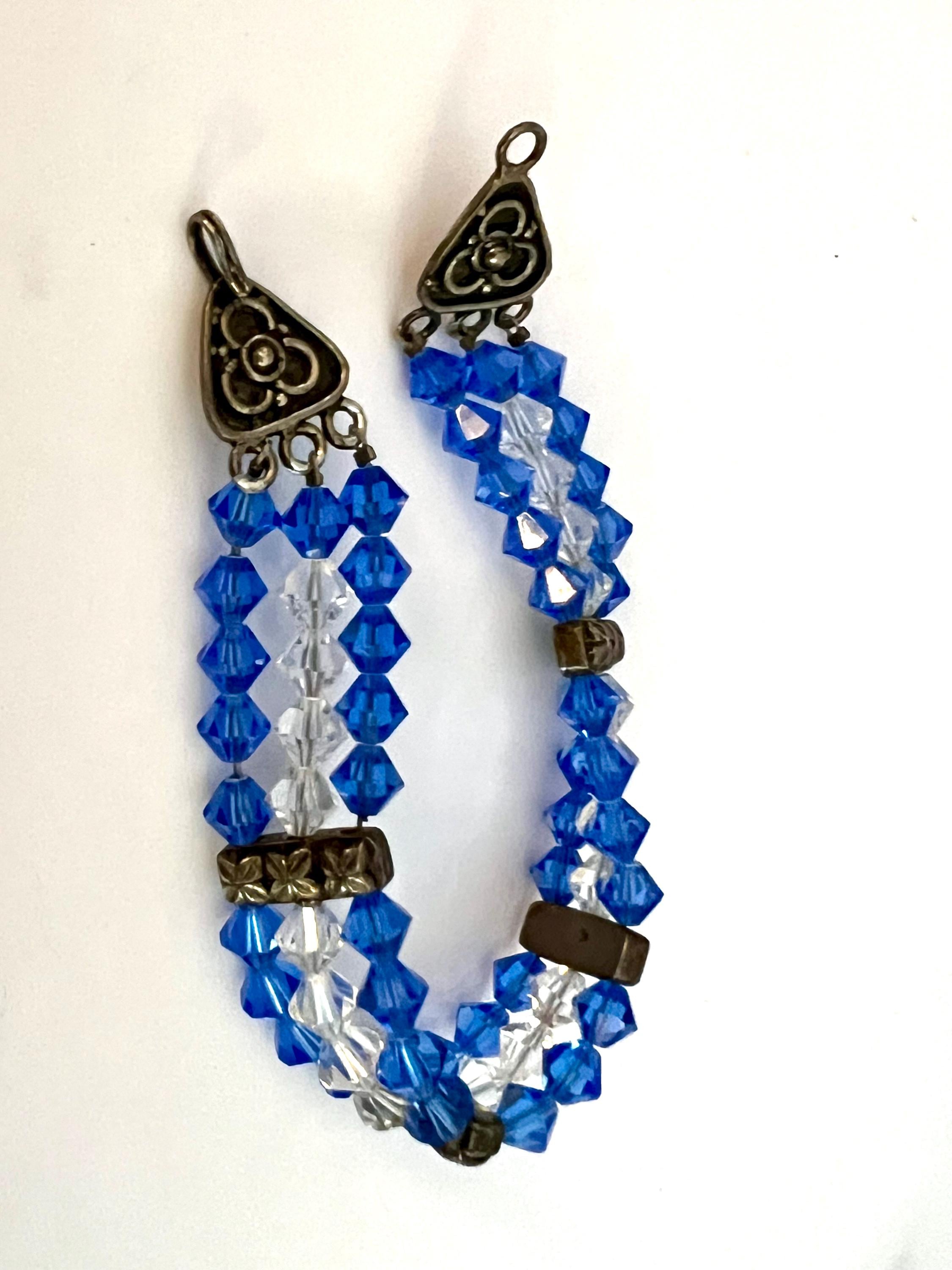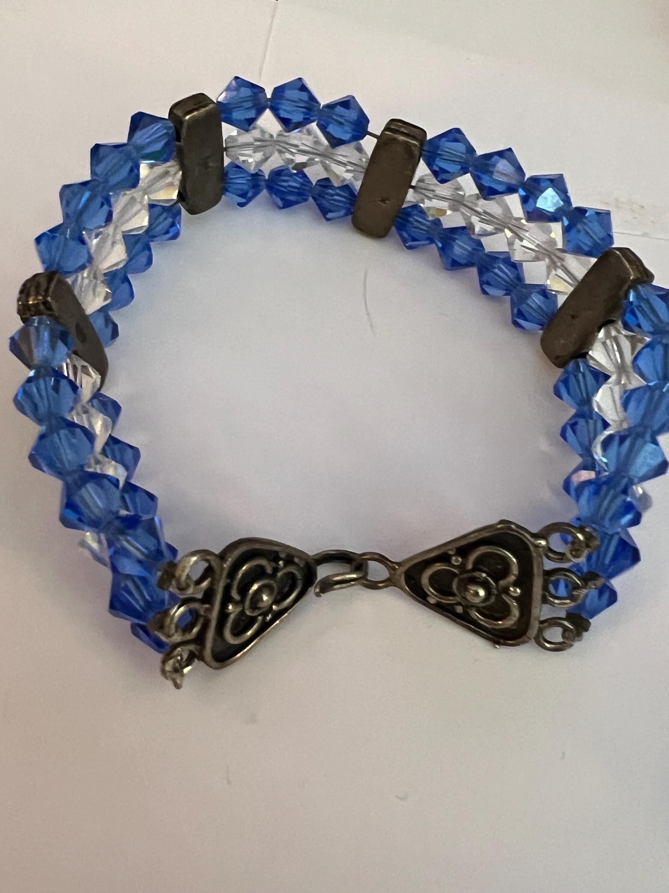 This item appears to be a handmade and stamped, multi-strand crystal bracelet featuring blue and clear bicone beads, possibly made with Swarovski or quality similar faceted glass beads.