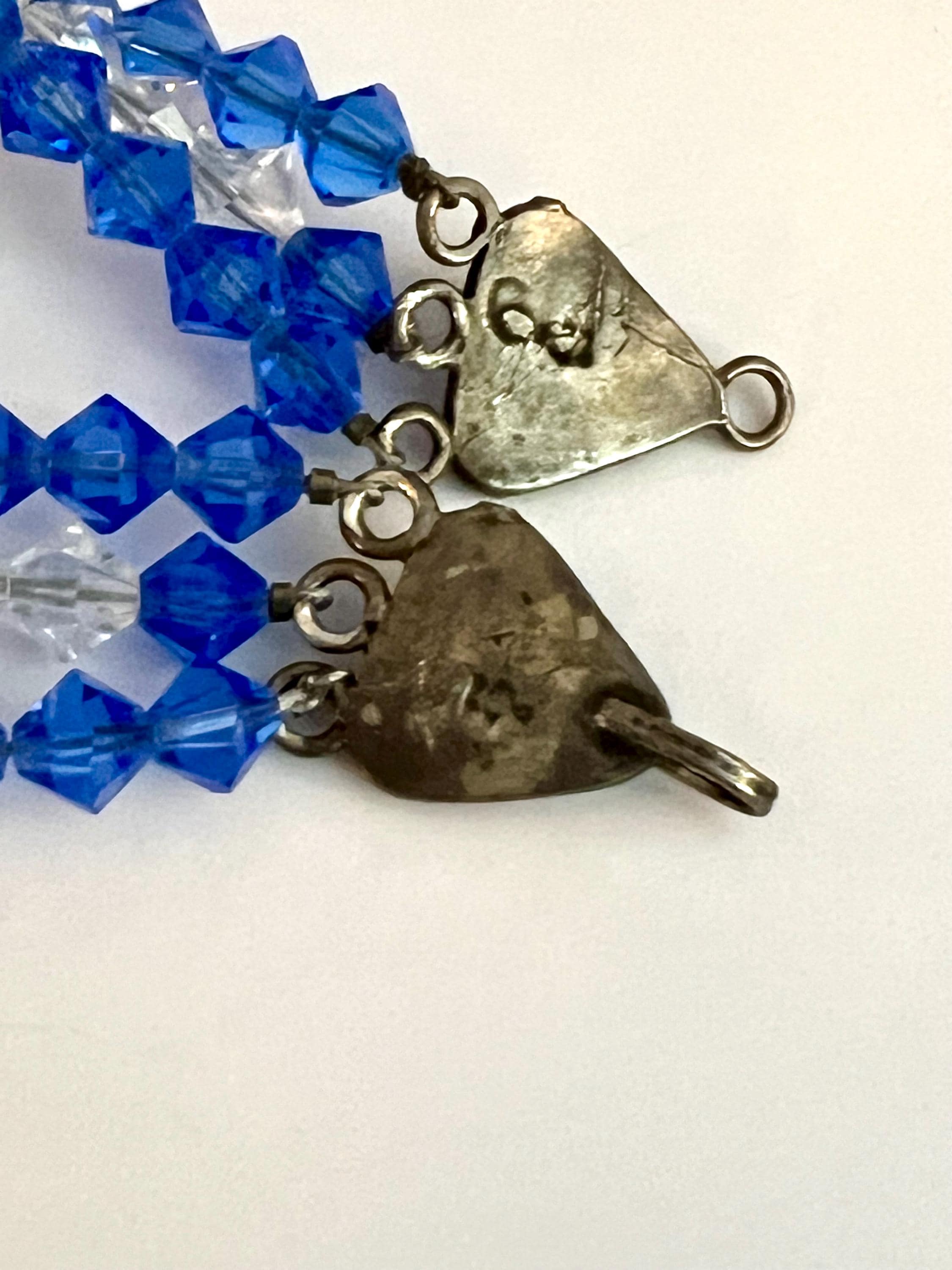 Vintage Romantic Revival Cobalt Blue Beveled Crystal Triple Strand Bracelet with Art Nouveau Styled Spacers and Retro Clasp / artisan stamp