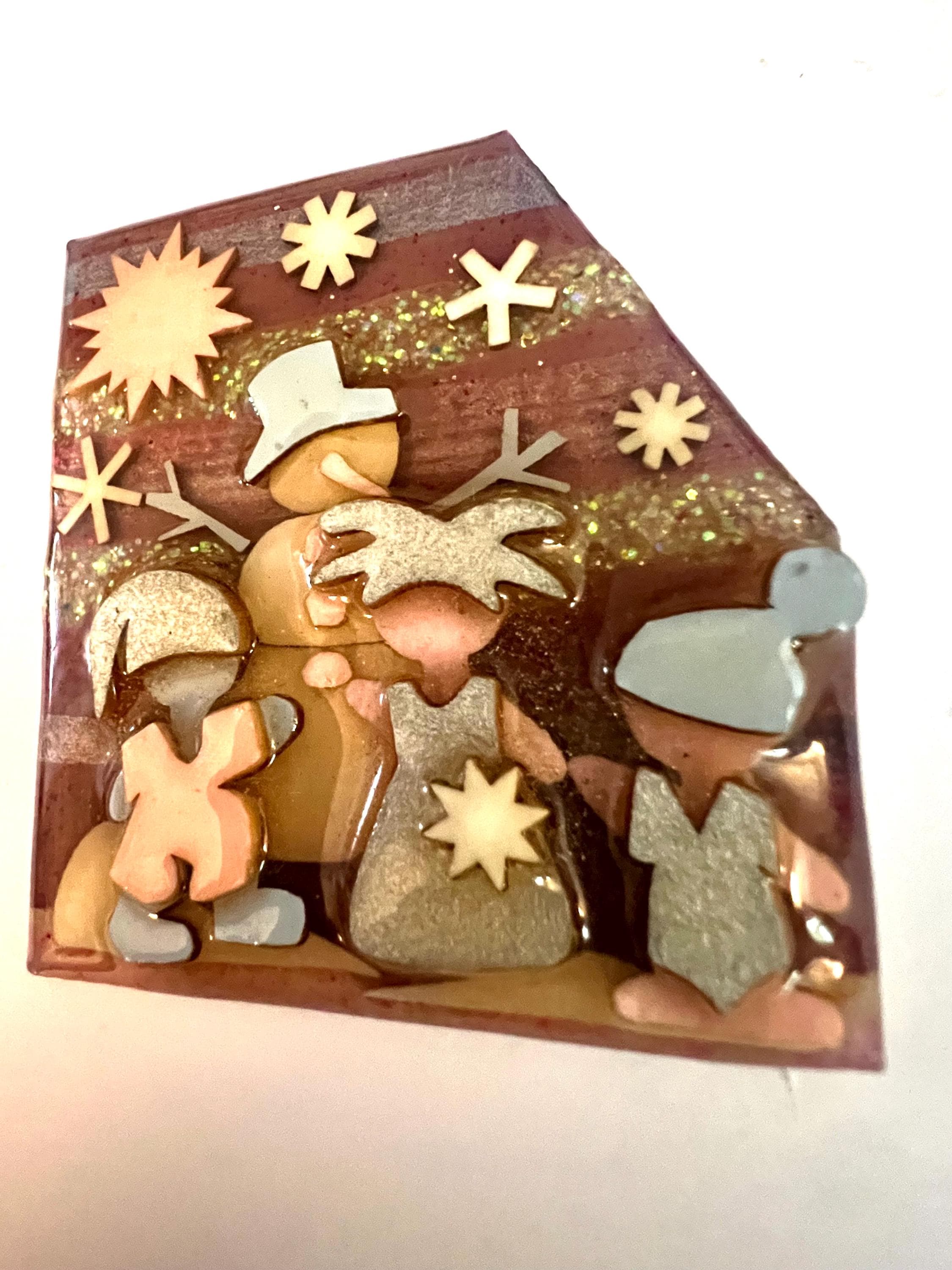 This is the first of the Lucinda “little people” pins that I have personally found - I have collected and sold my share of wonderful “houses” and “ people” by Lucinda since discovering them a number of years ago and have always been fond of their colorful modernist style and especially that they are artisan pins from my homeland of Maine! This pin is a pretty 80s dusty plum color base and other dusty pastels with white snow - it’s really different that most of the brighter Lucinda Pins and will make a terrific addition to any collection- as Lucinda Pins have become quite collectible and fun to collect at that. they display nicely too!