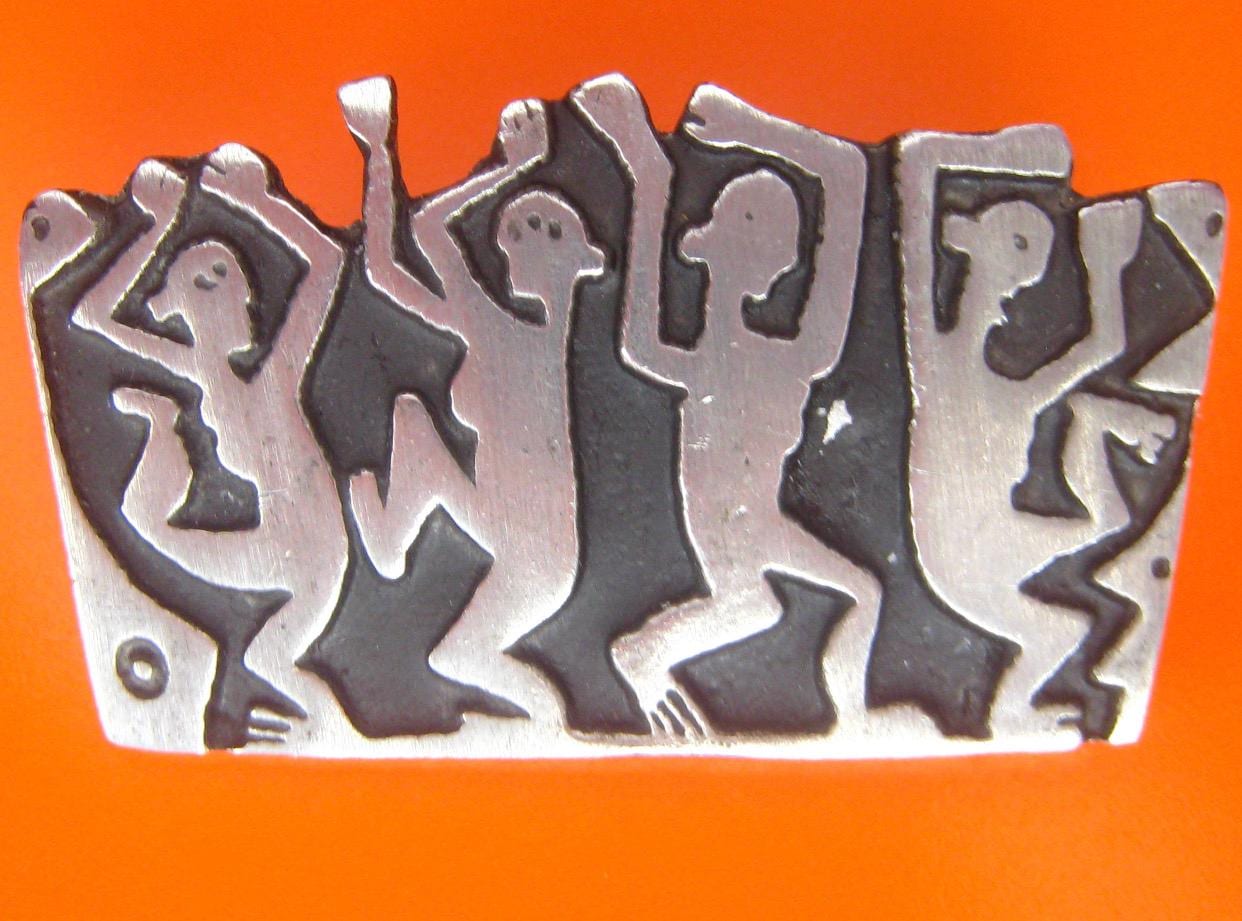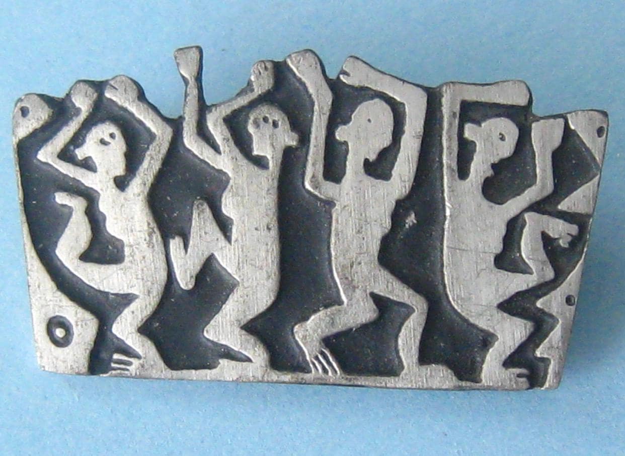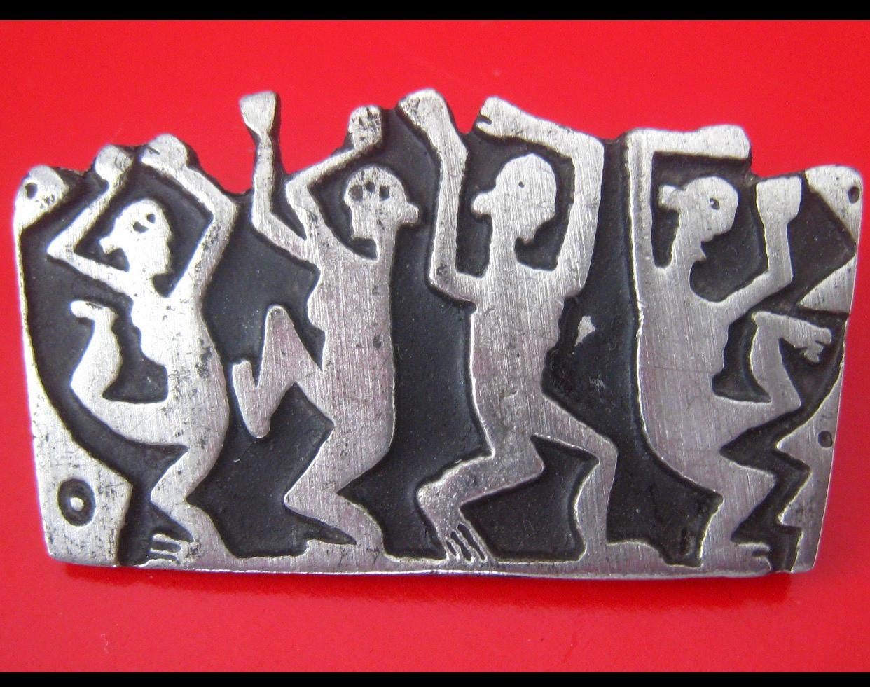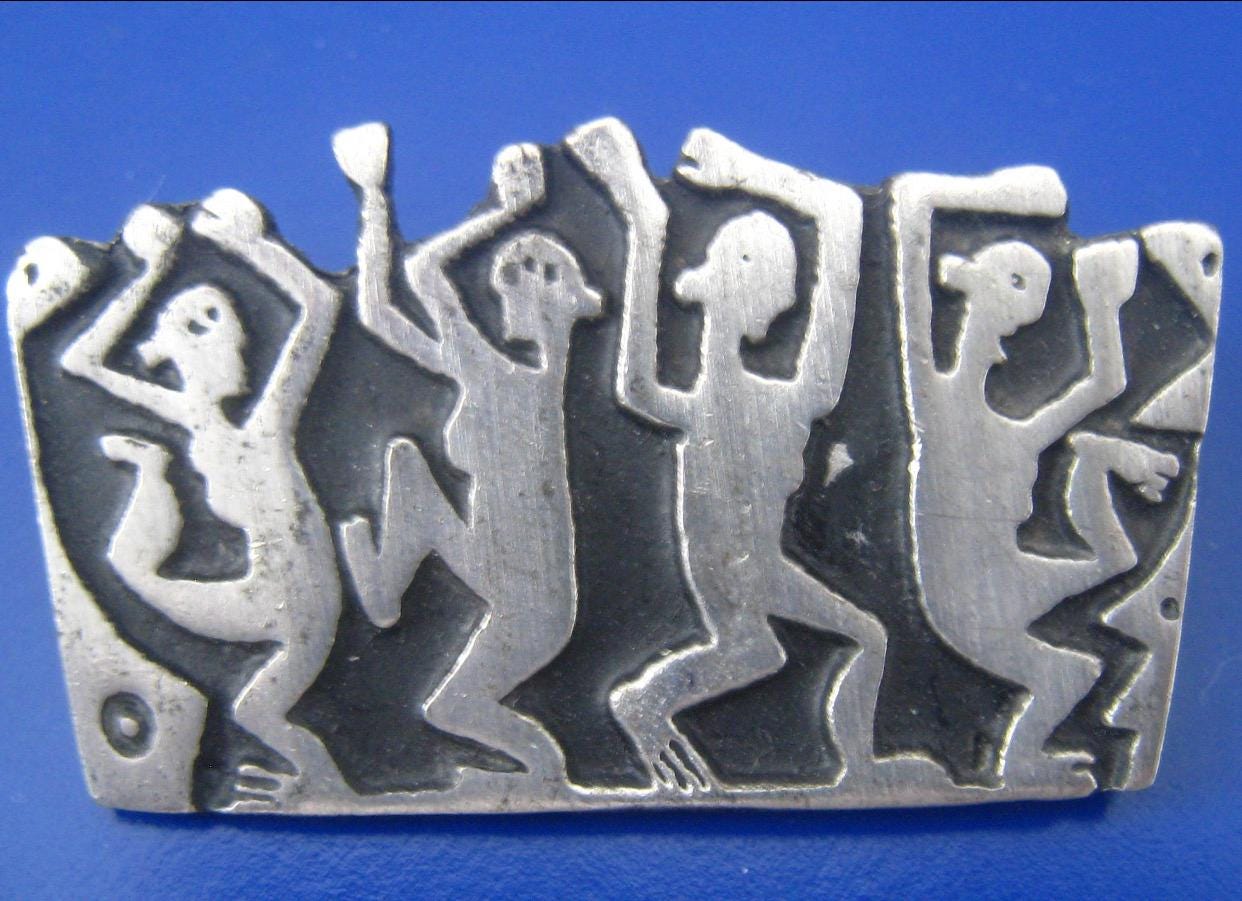Awesome 80s, Urban Fetishes by ALICE SEELY Pewter Brooch, Abstract Modernist SURREALIST Tribal Mayan Dancing Figures unisex Lapel Pin
