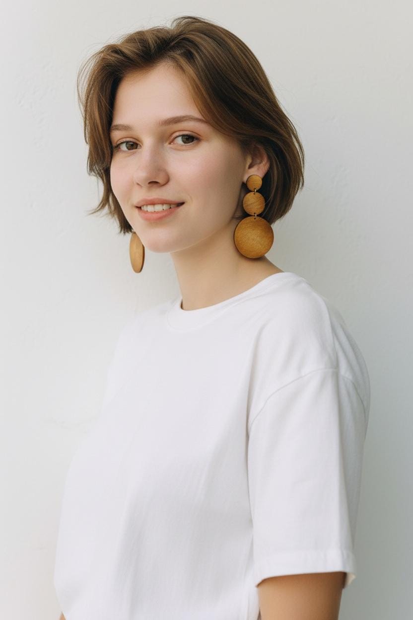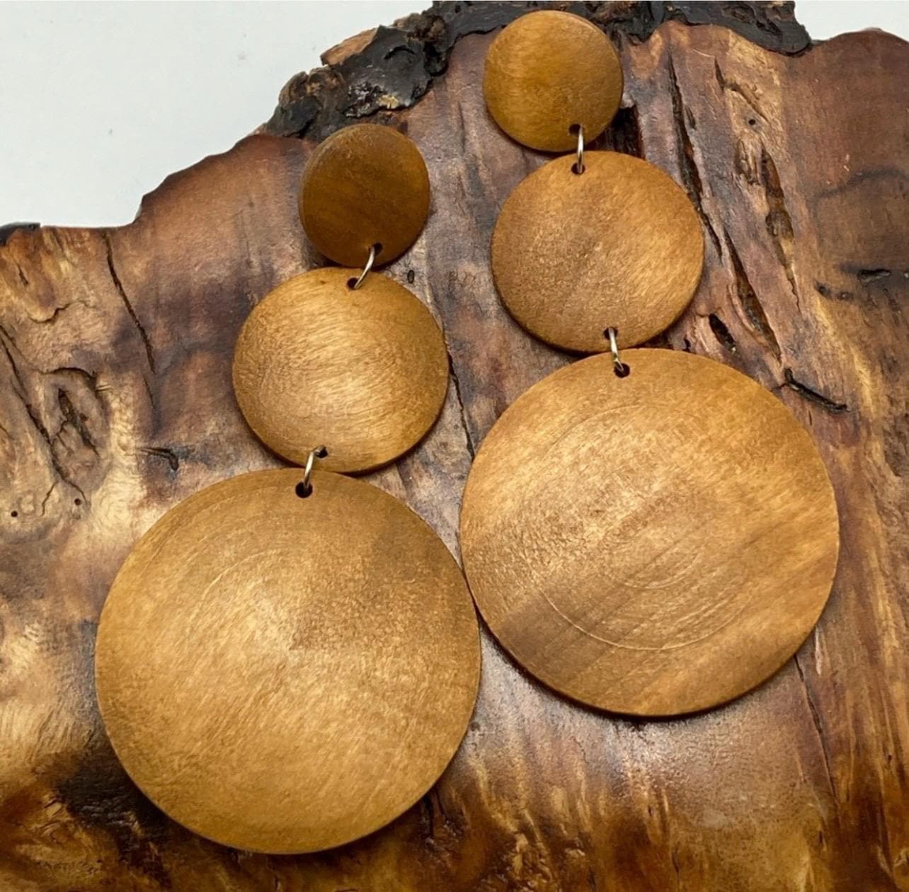 Beautiful fawn honey wooden graduated circle dangles- clean minimal design with a slightly rustic tropical feel- lending to a mischievous wild yet civilized under tone - lots of thundering esthetics - while remaining subtle yet elegant and surprisingly substantial! Measuring 9cm long these are lightweight and collected dead stock and therefore in mint condition- waiting for their first owner to begin their story!