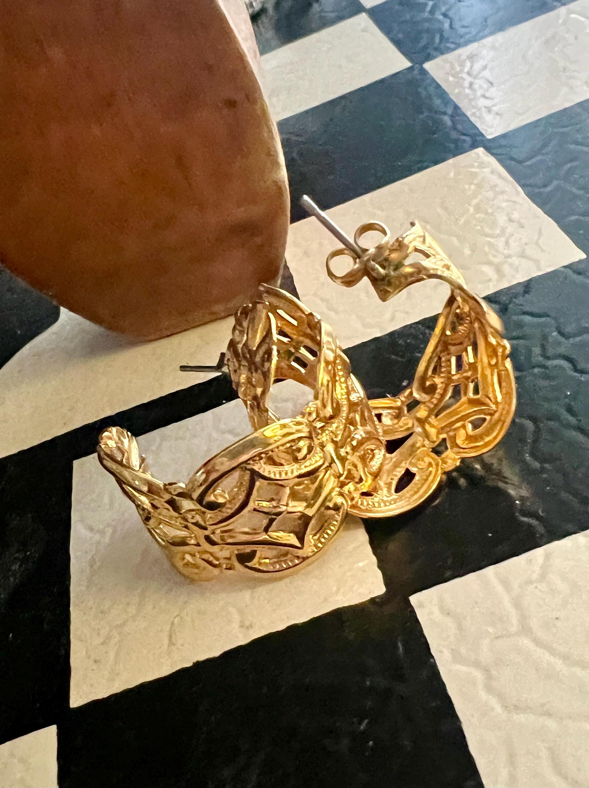 Vintage Golden Ornate Openwork Hoop Earrings, Mid Century Gothic Romantic RevivalStatement earrings, Very nice quality, vintage 60s- 1970s Regency lattice style costume jewelry.