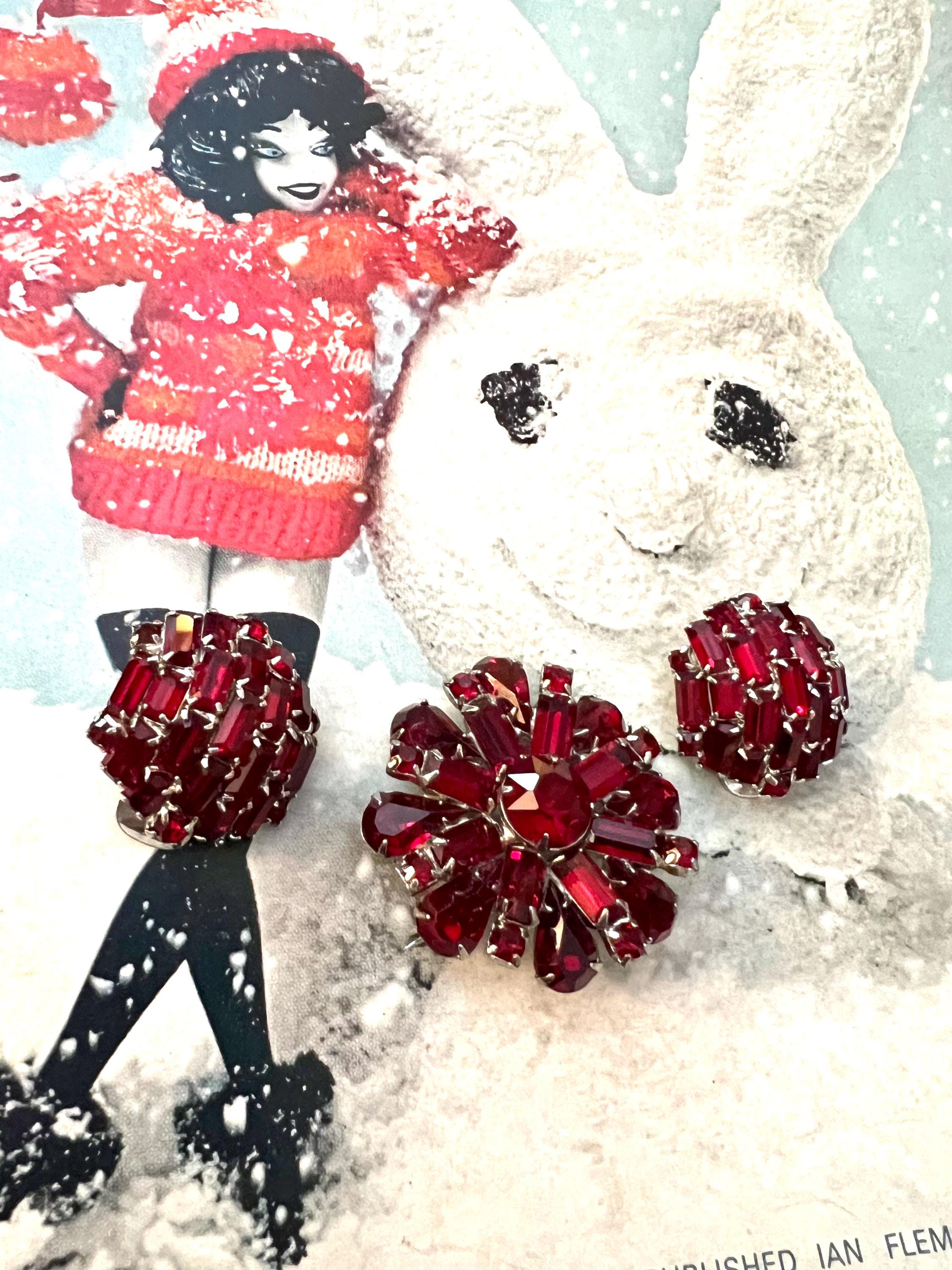 Vintage Weiss Ruby Glass Gem Dome Flower Brooch and Bagette Cluster Earrings Set, Gift for sweetheart, Valentines Day Gift