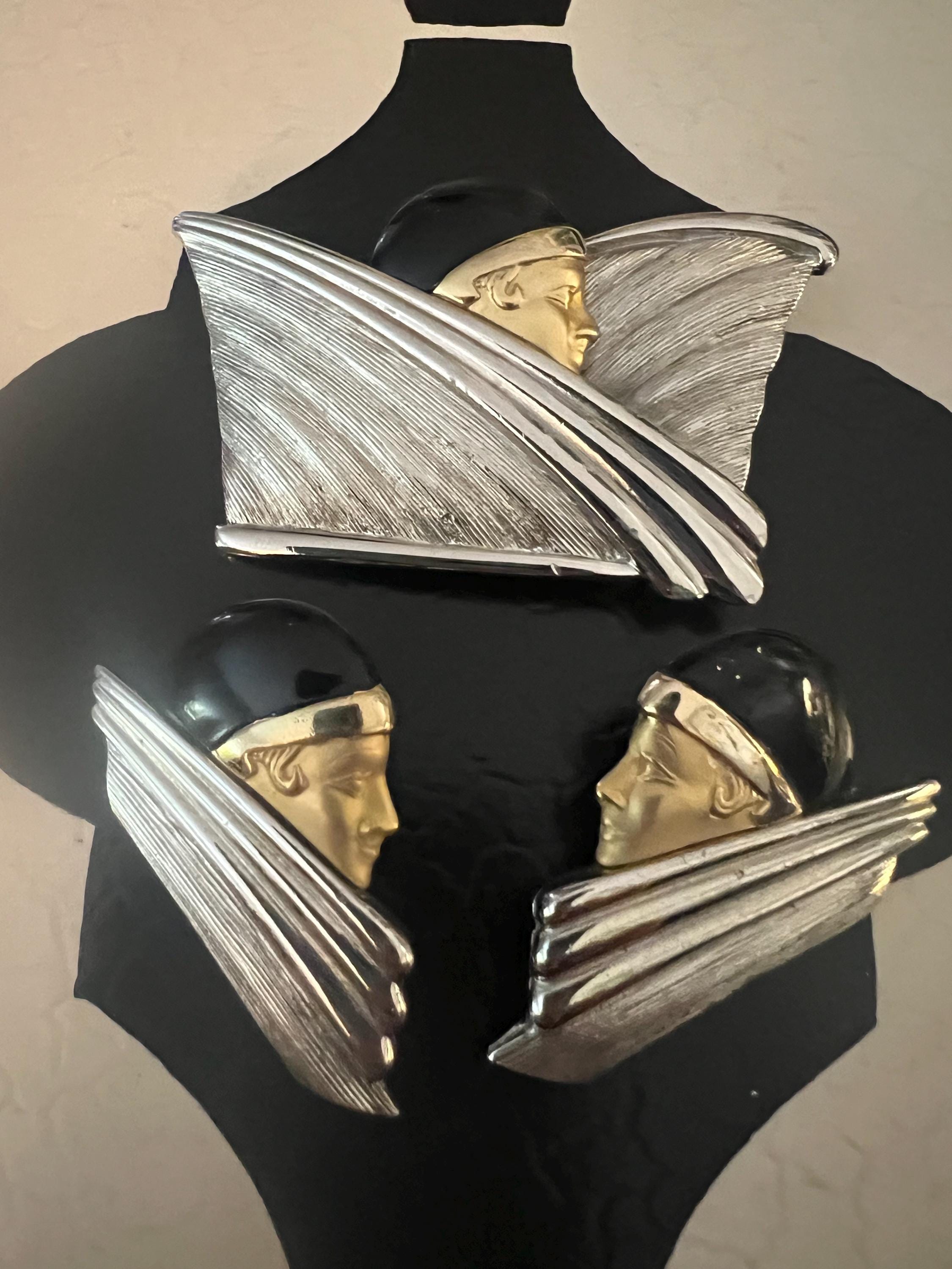 The items shown are vintage Art Deco Revival brooches and matching earrings produced by the American costume jewelry maker JJ Jonette. The pieces feature a gold-toned face of a fashionable woman wearing a black, enameled cloche hat, set against silver-toned, fanned panels.