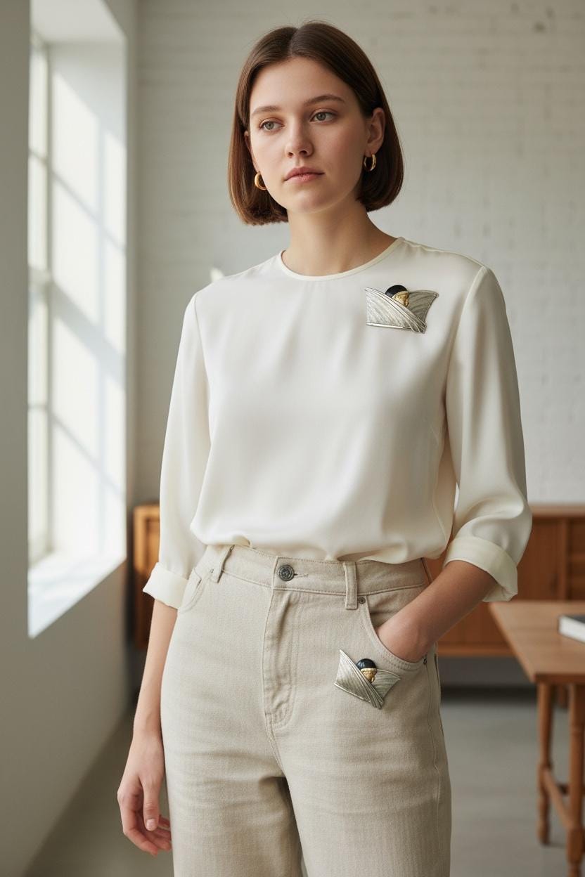 * Set: The collection in the image includes a large brooch and two smaller, matching earrings to complete the set.