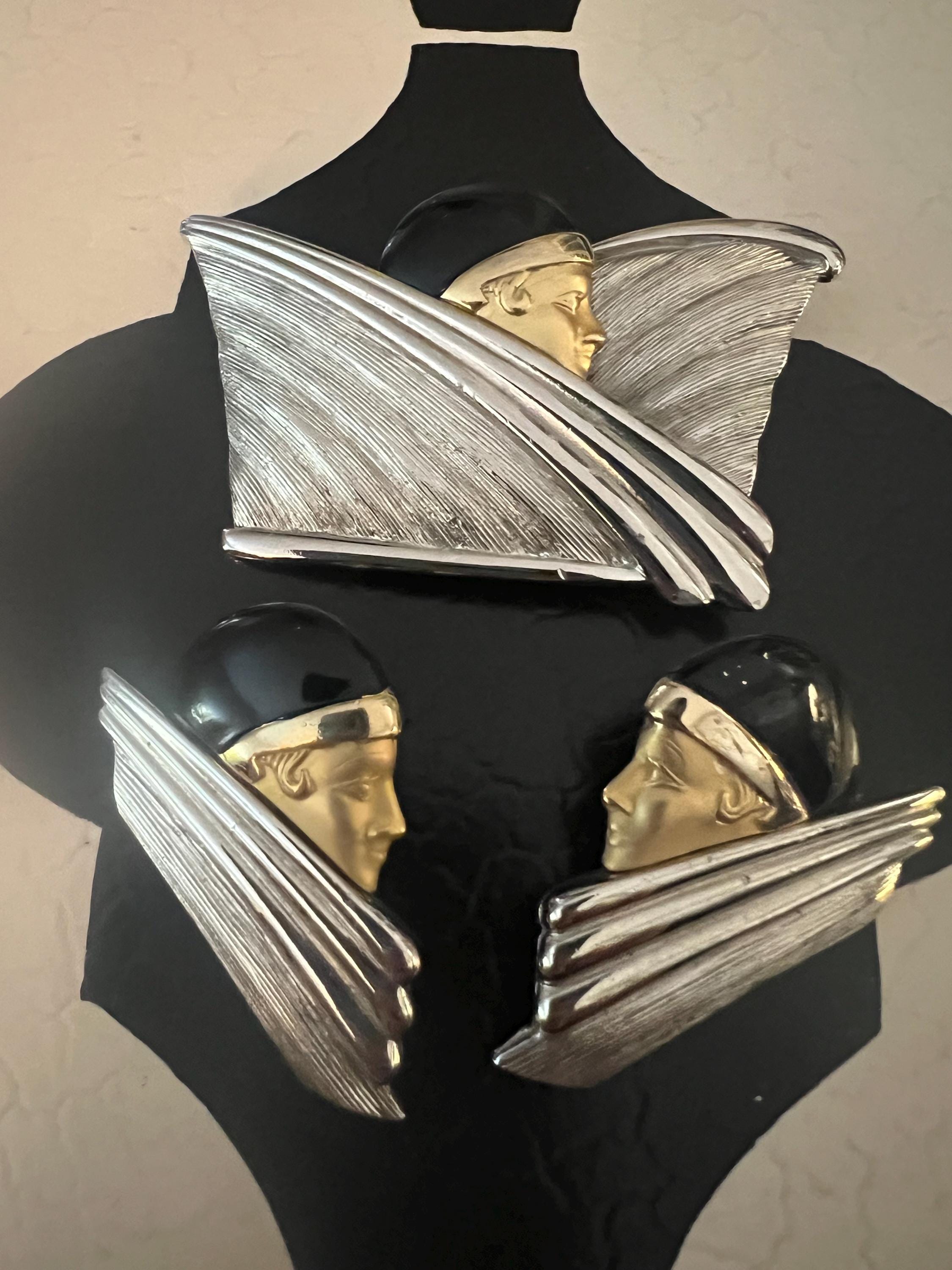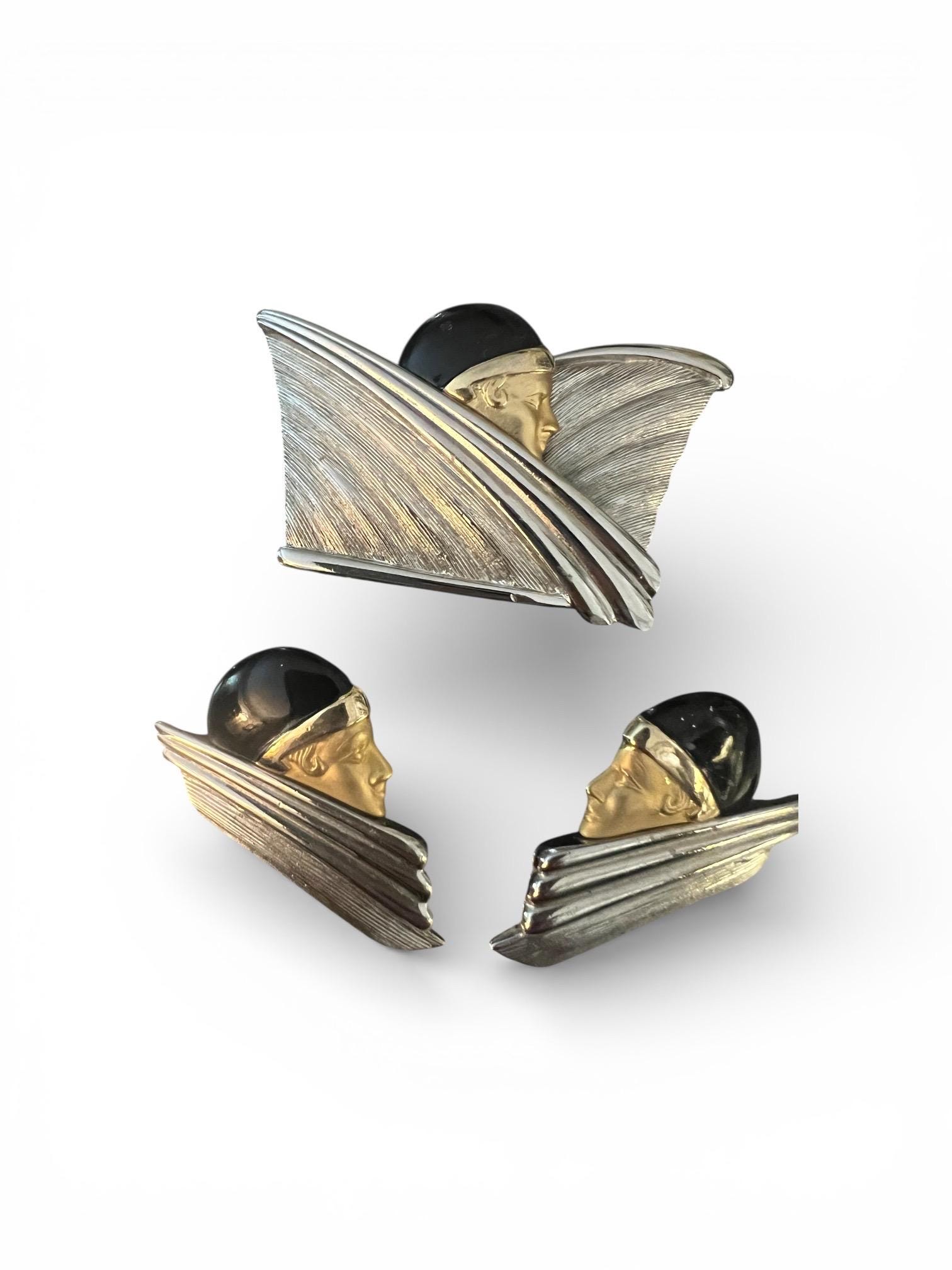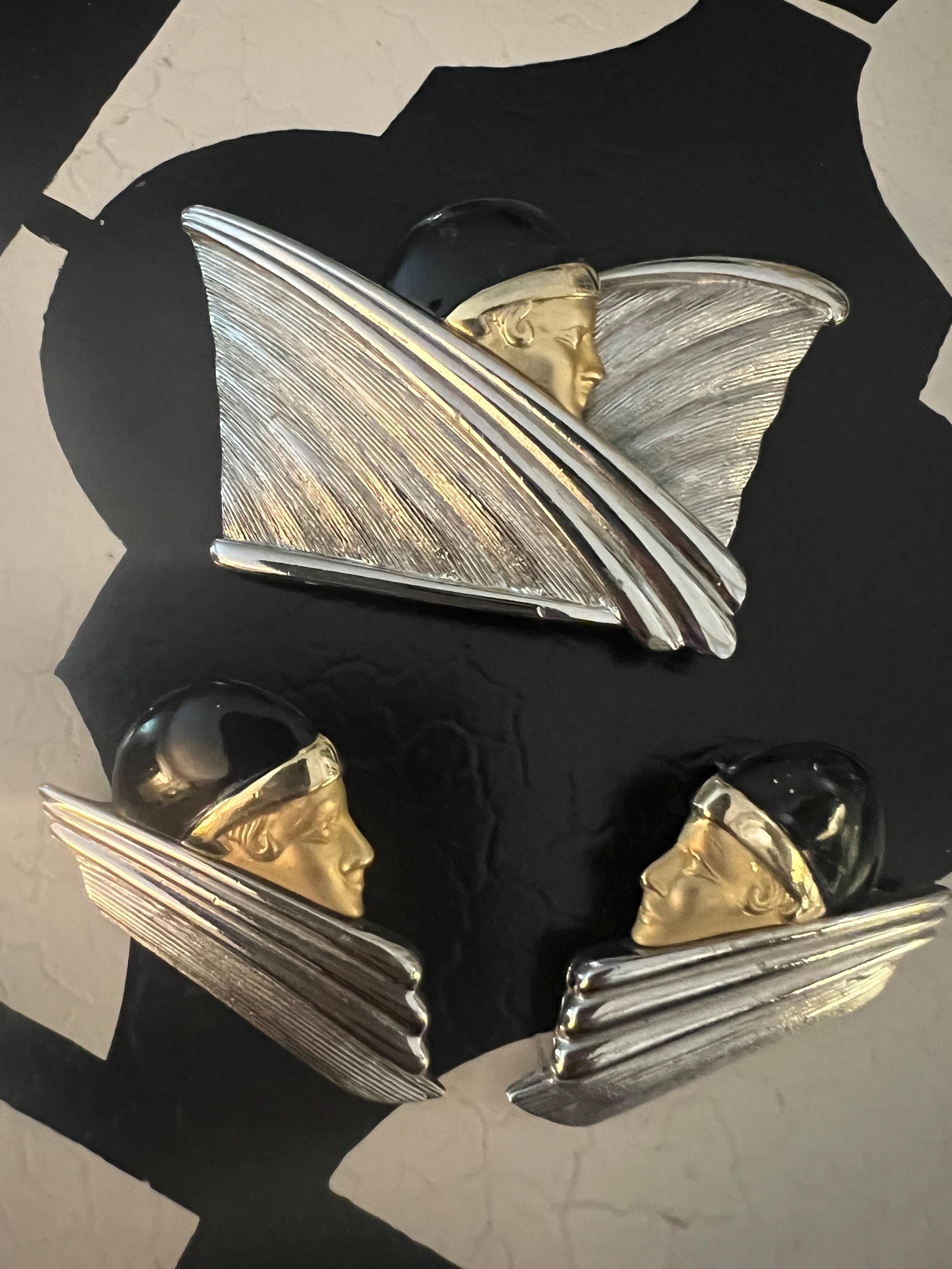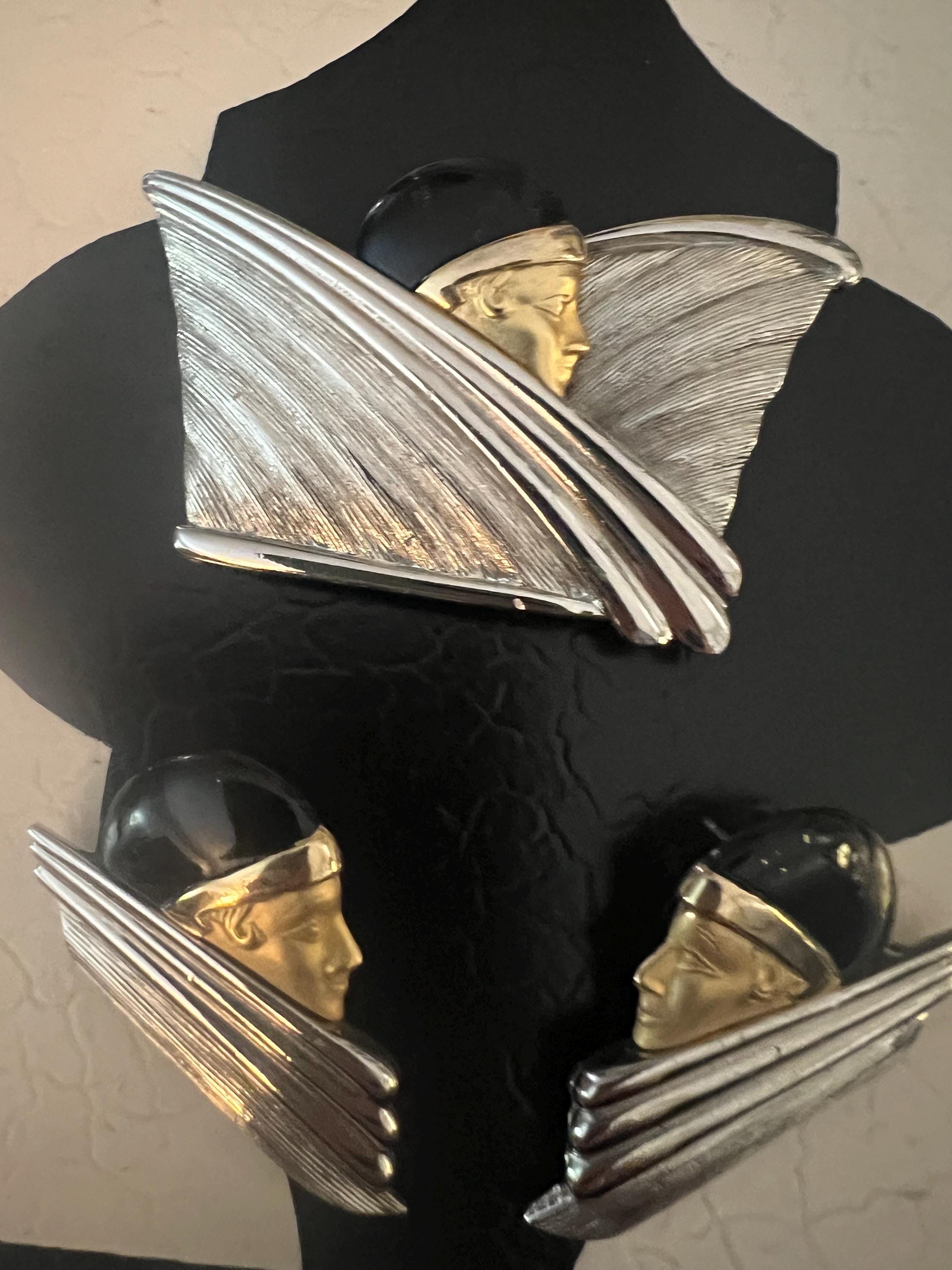 Vintage 1986 JJ Jonette Art Deco Erte Inspired flapper brooch and earring set- featuring a fashionista lady wearing a black enamel cloche