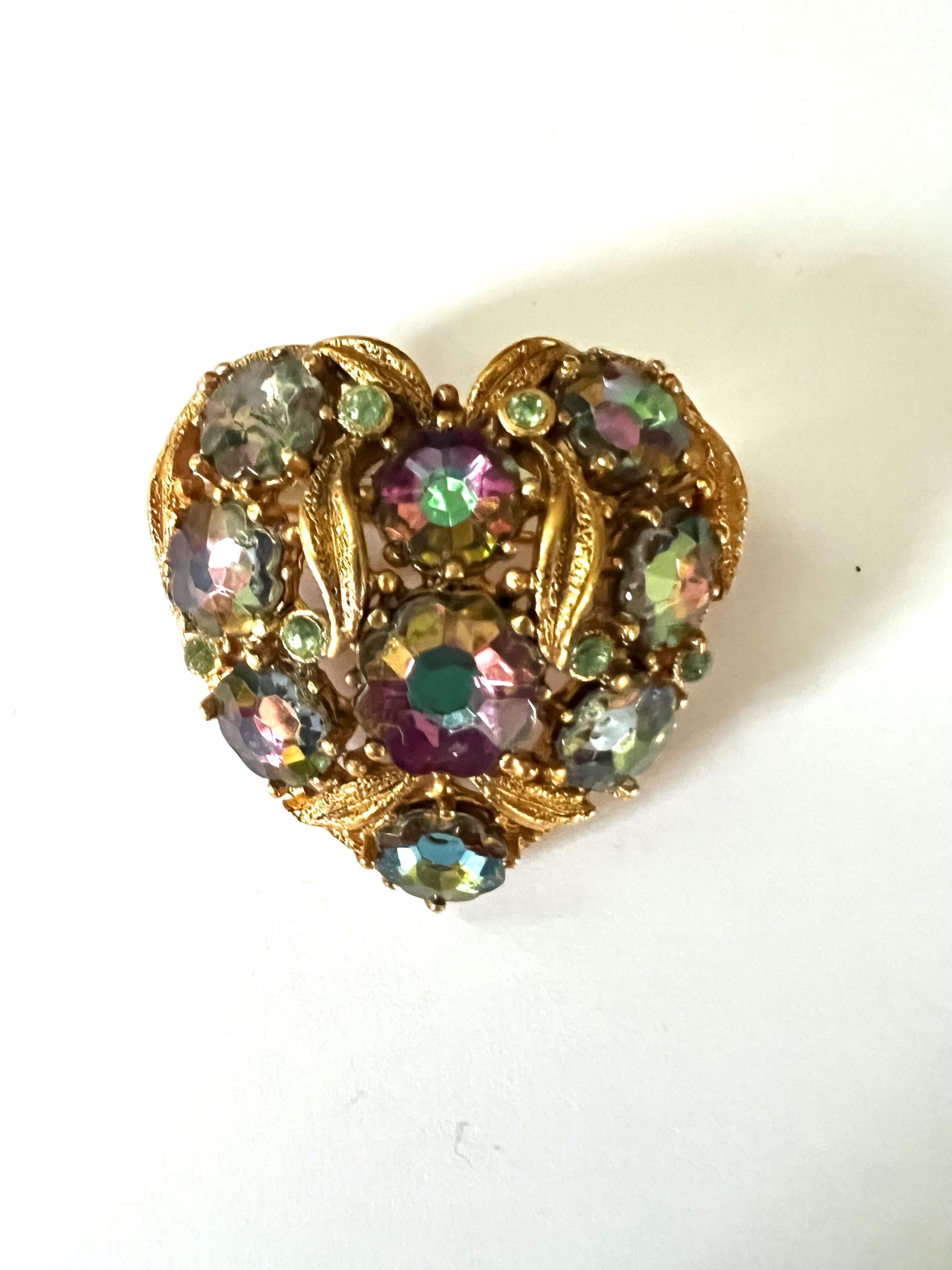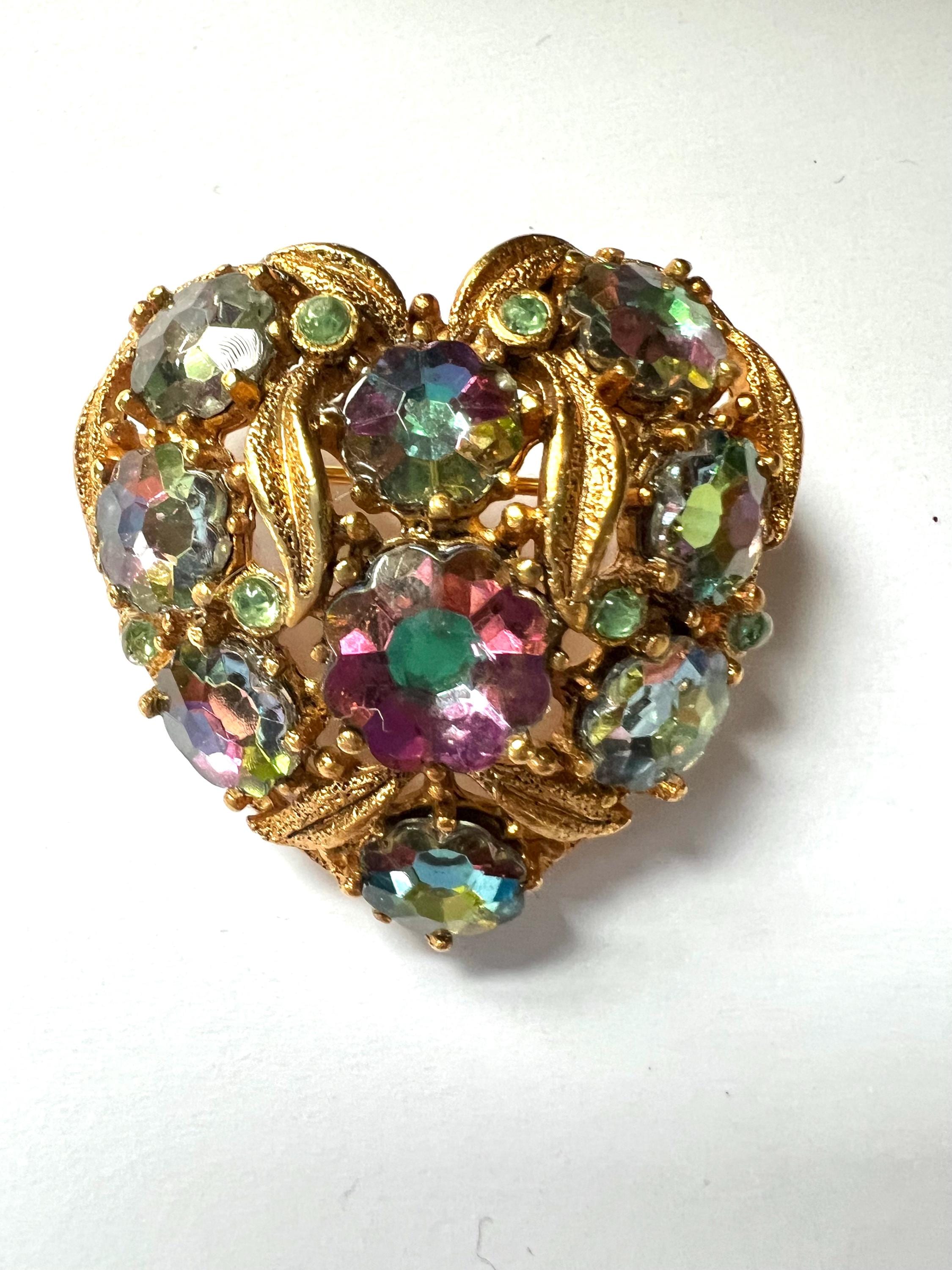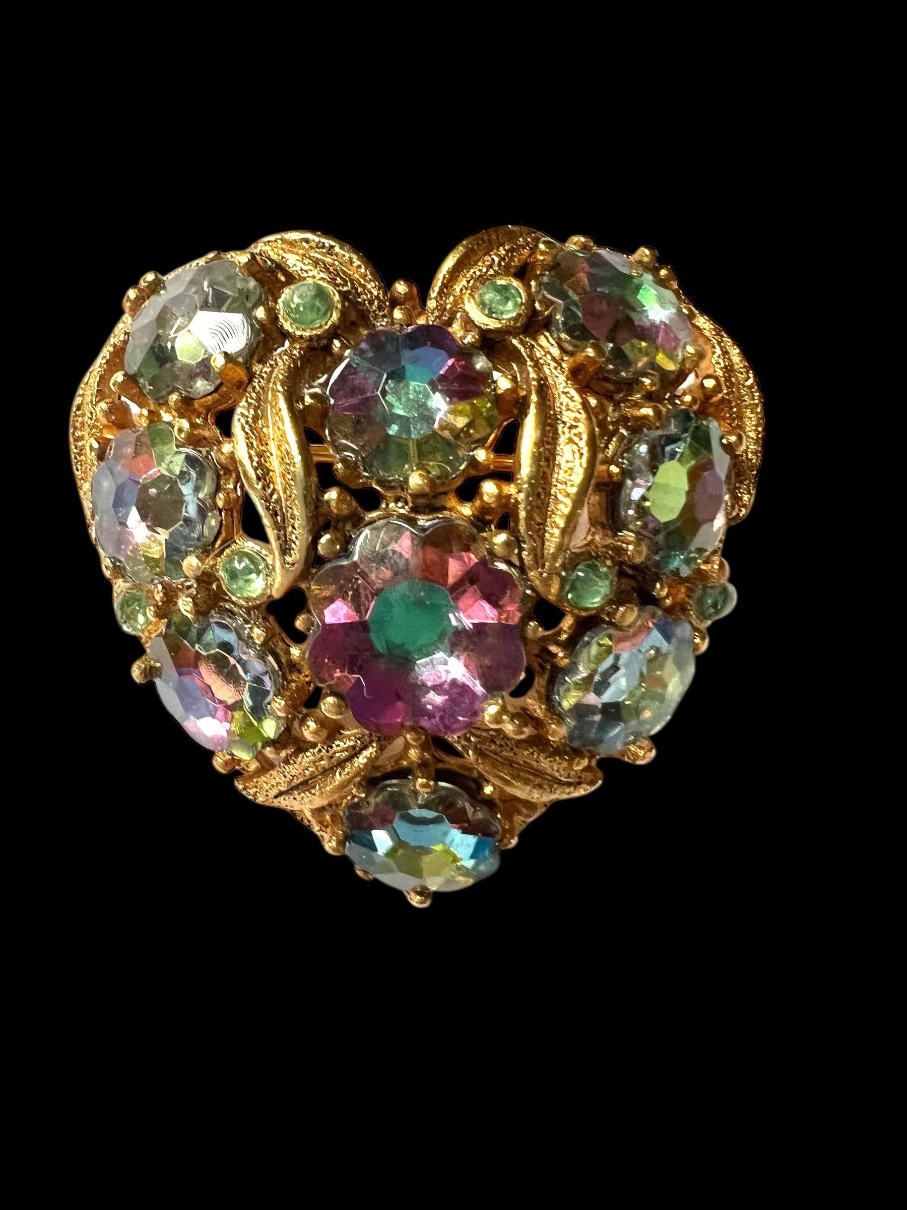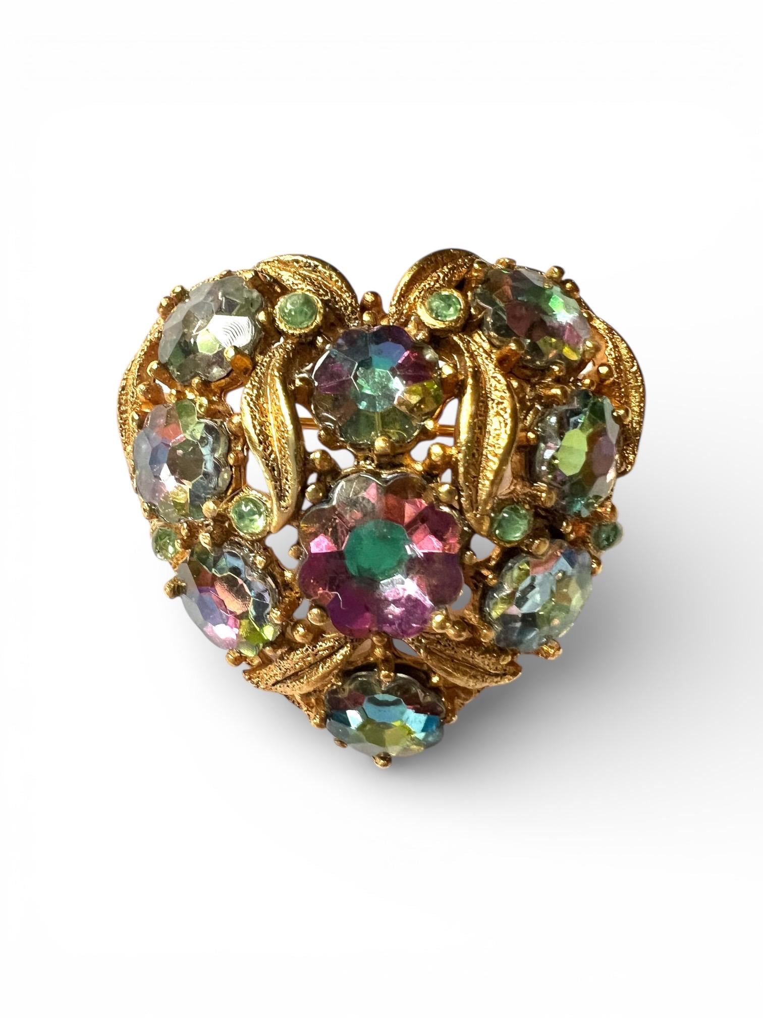 Victorian Revival Heart Brooch: Vintage AB Crystals Gold Vermeil Lapel Pin