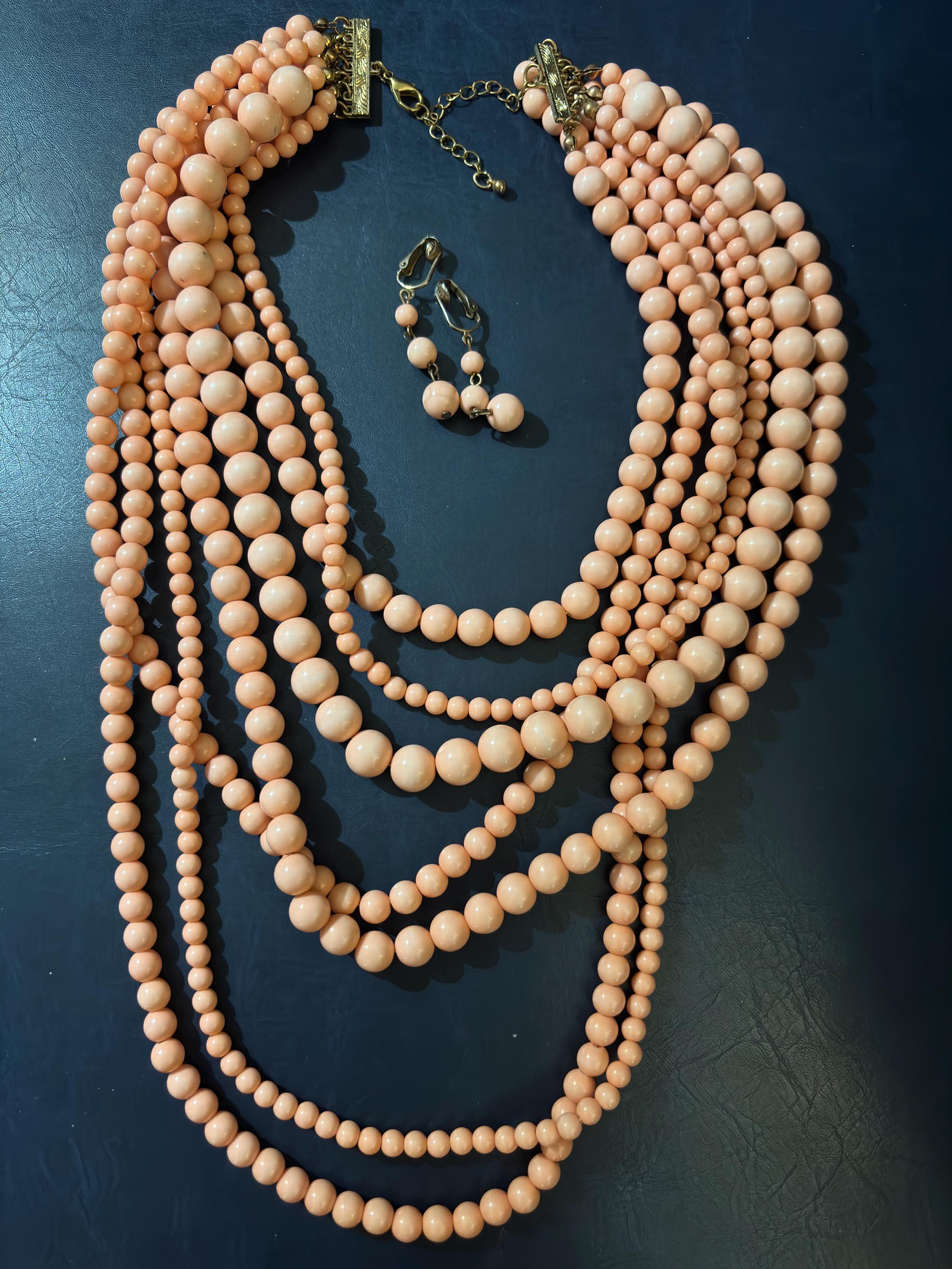 Swanky Coral Pink Multi Strand Beaded Necklace and Clip Dangles, Late Mid Century Tropical Cocktail Jewelry