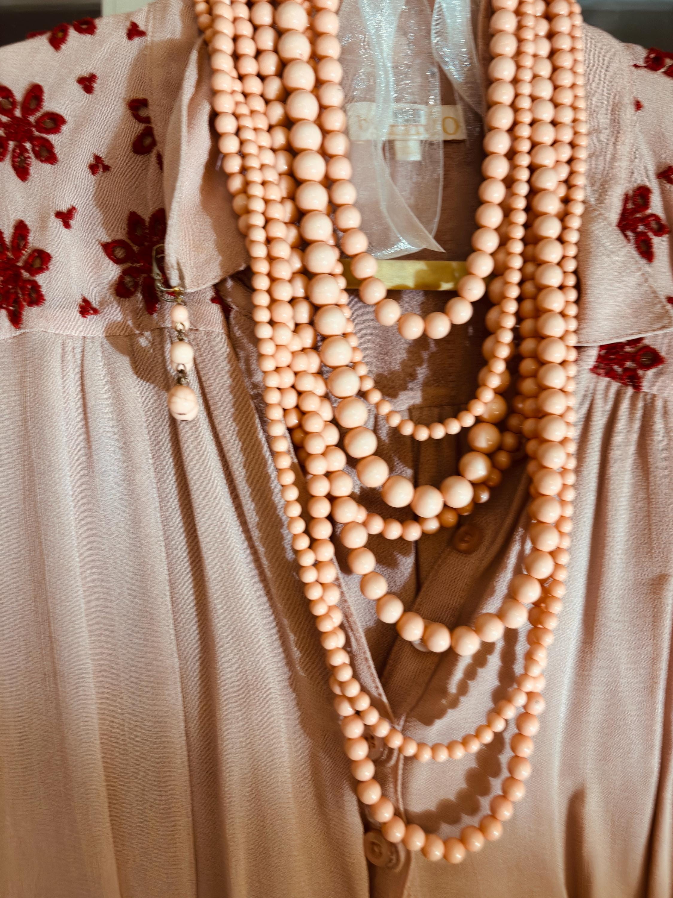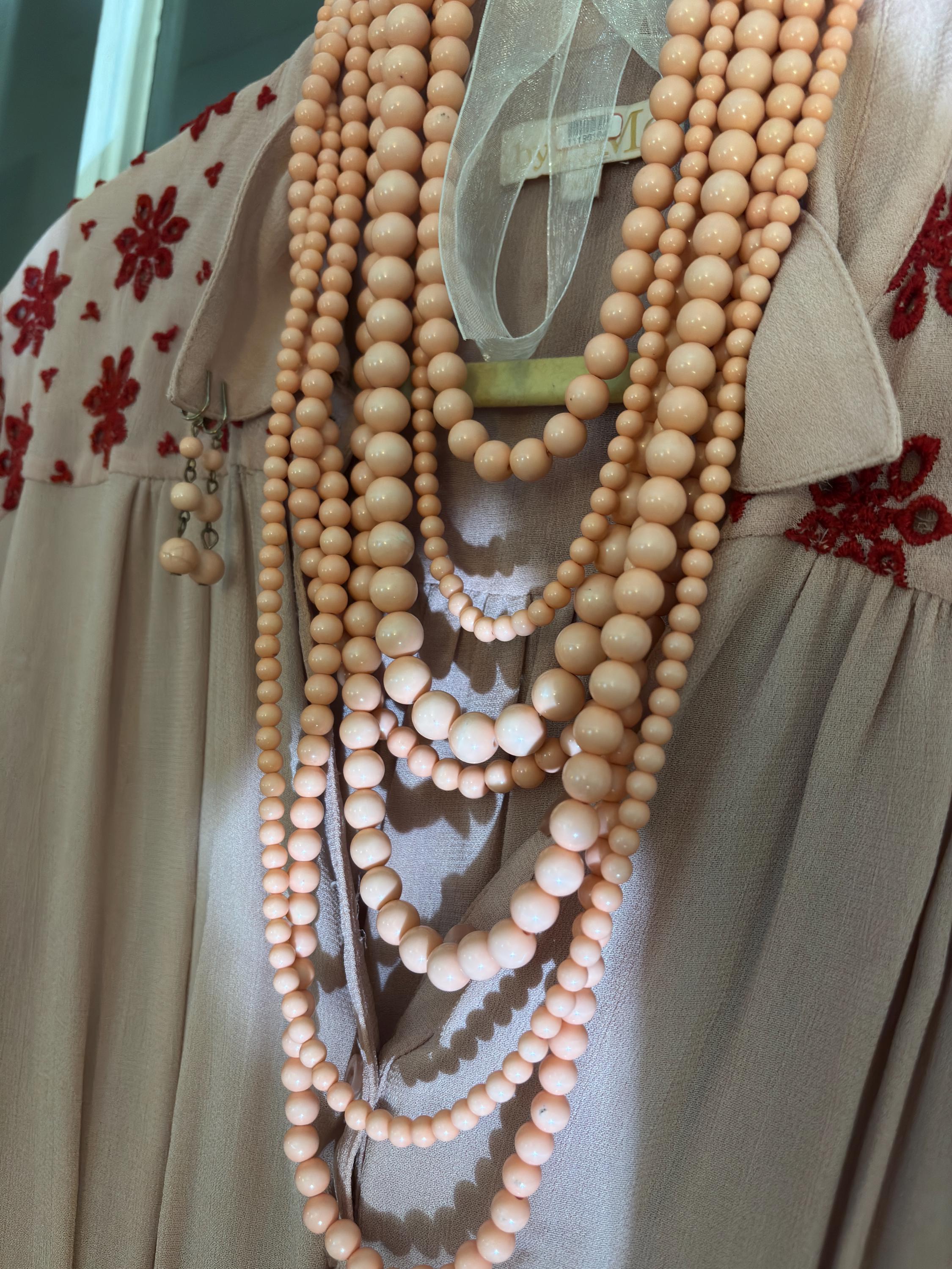 Palm Royale or Virgin Voyages … this Set will make a statement whereever your vacation lounging takes you! 7 strands of sultry pale coral cascading beads with comfortable easy breezy clip ons that are styled to look cleverly like pierced- nice touch and anyone can wear them! Note the color is nice too- more of a pastel coral than an in your face with orange- it’s very pretty!