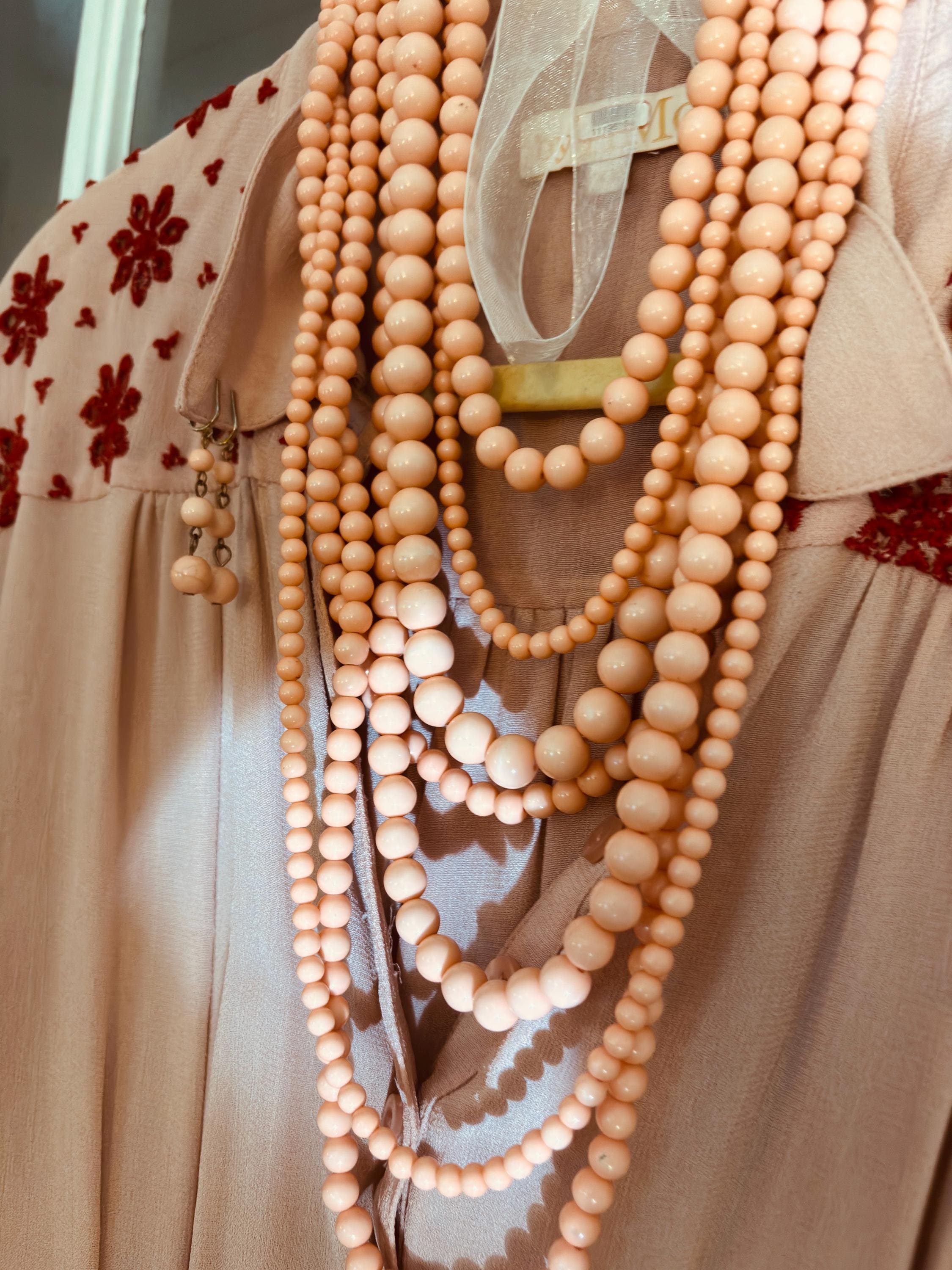 Vintage Coral Pink Beaded Necklace & Clip Earrings, Mid Century Cocktail Jewelry