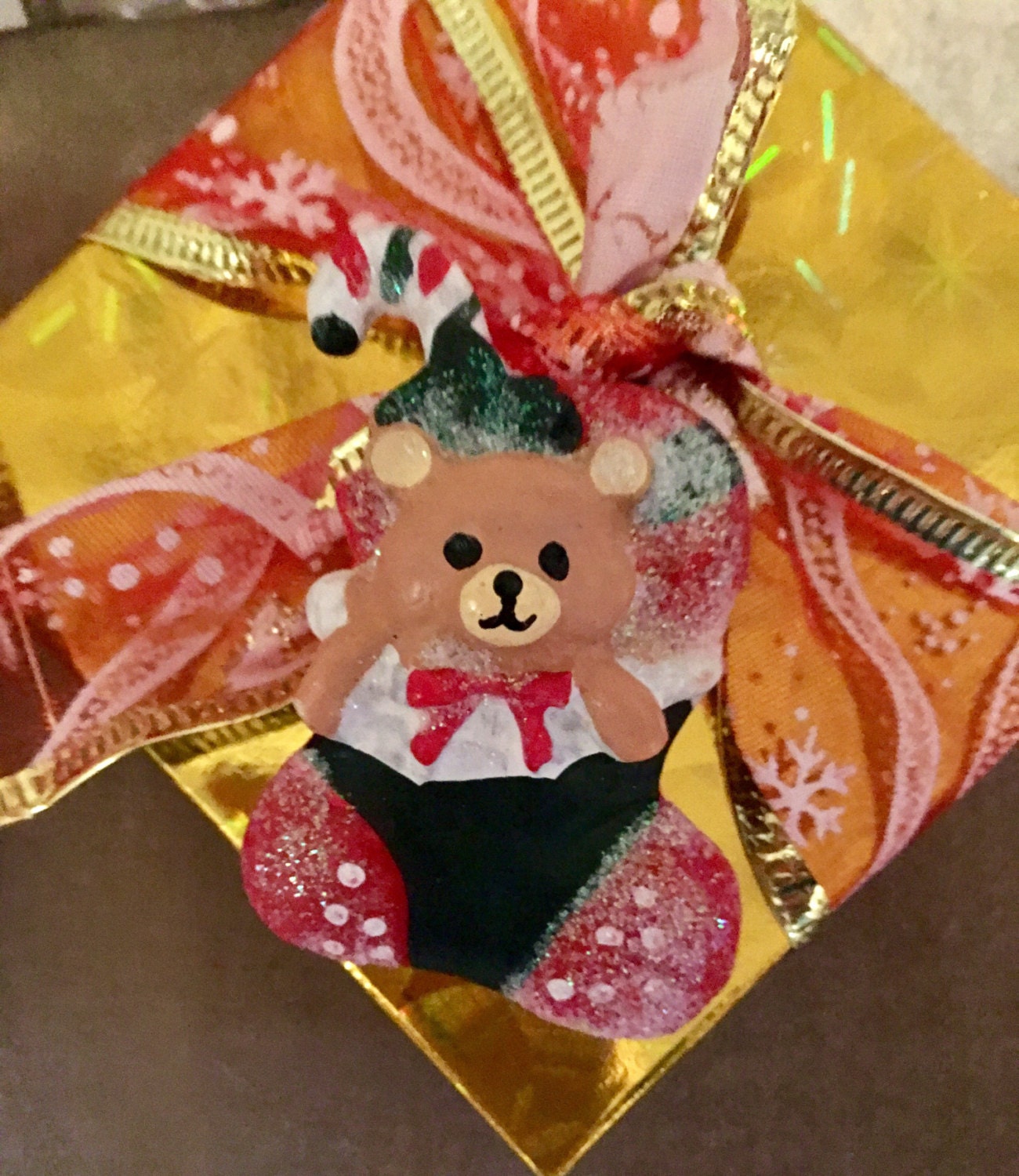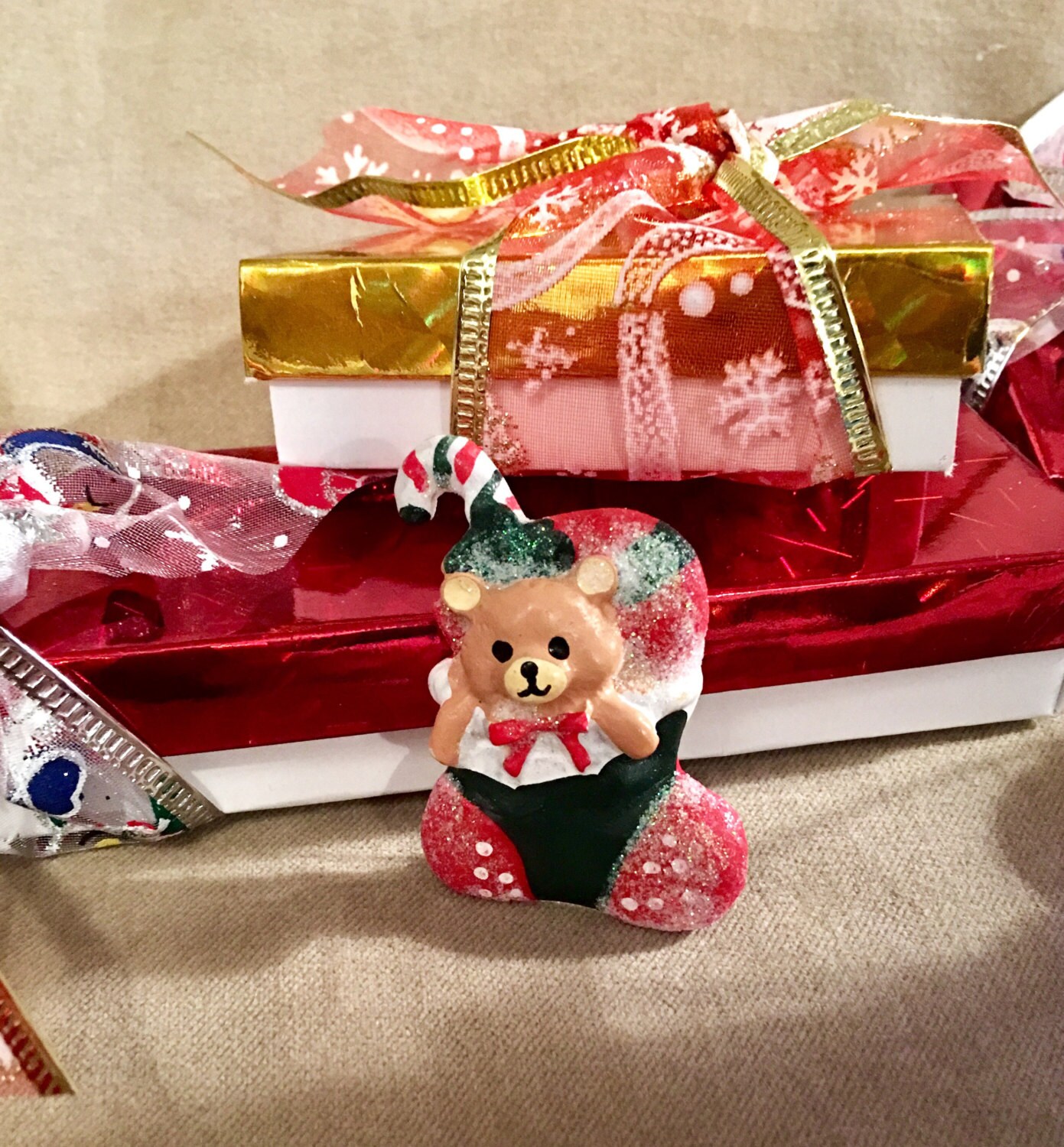 Vintage resin holiday pin. Adorable bear in a stocking Super cute way to say happy holidays to someone you care about! Will ship gift boxes with ribbon. Start the season with some holiday cheer! Affordable & charming! Heartwarming & thoughtful 💝